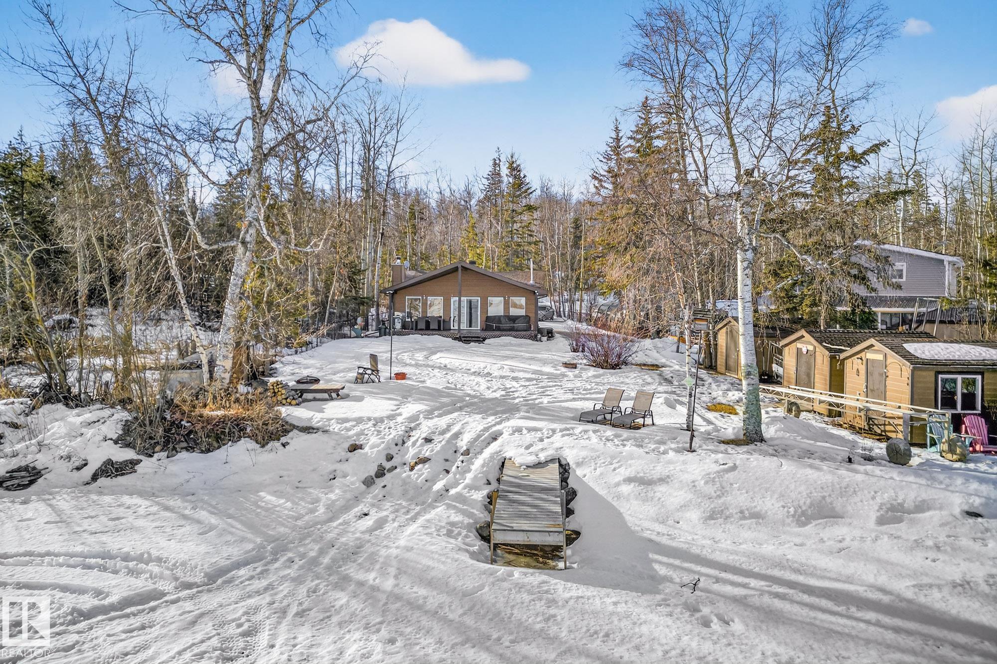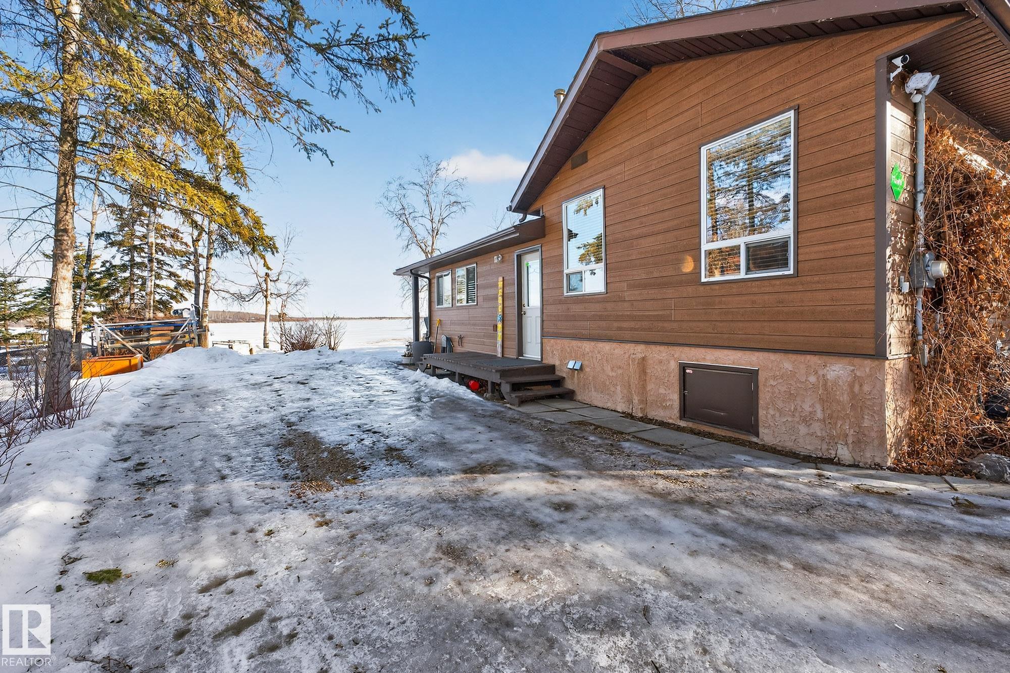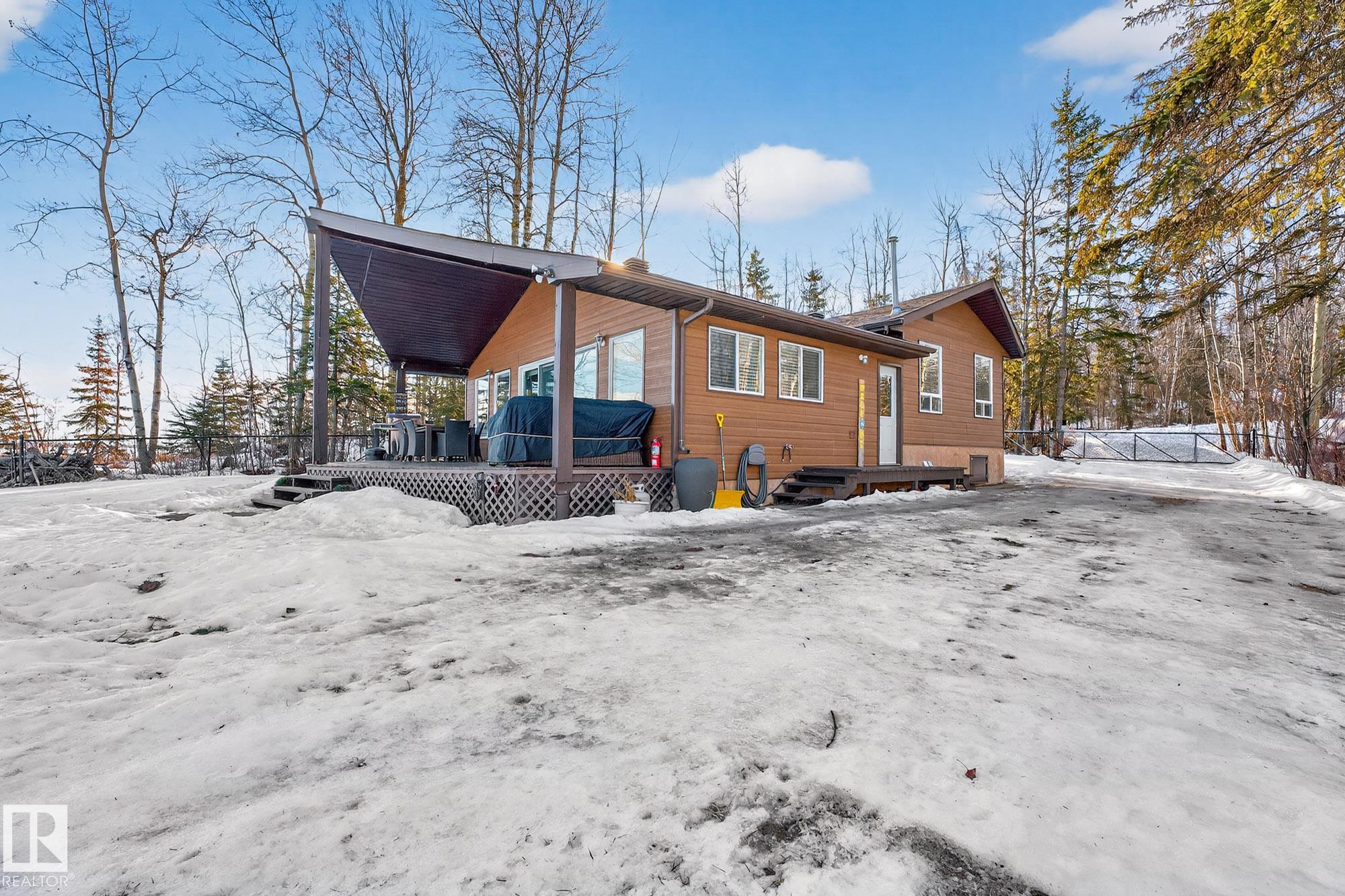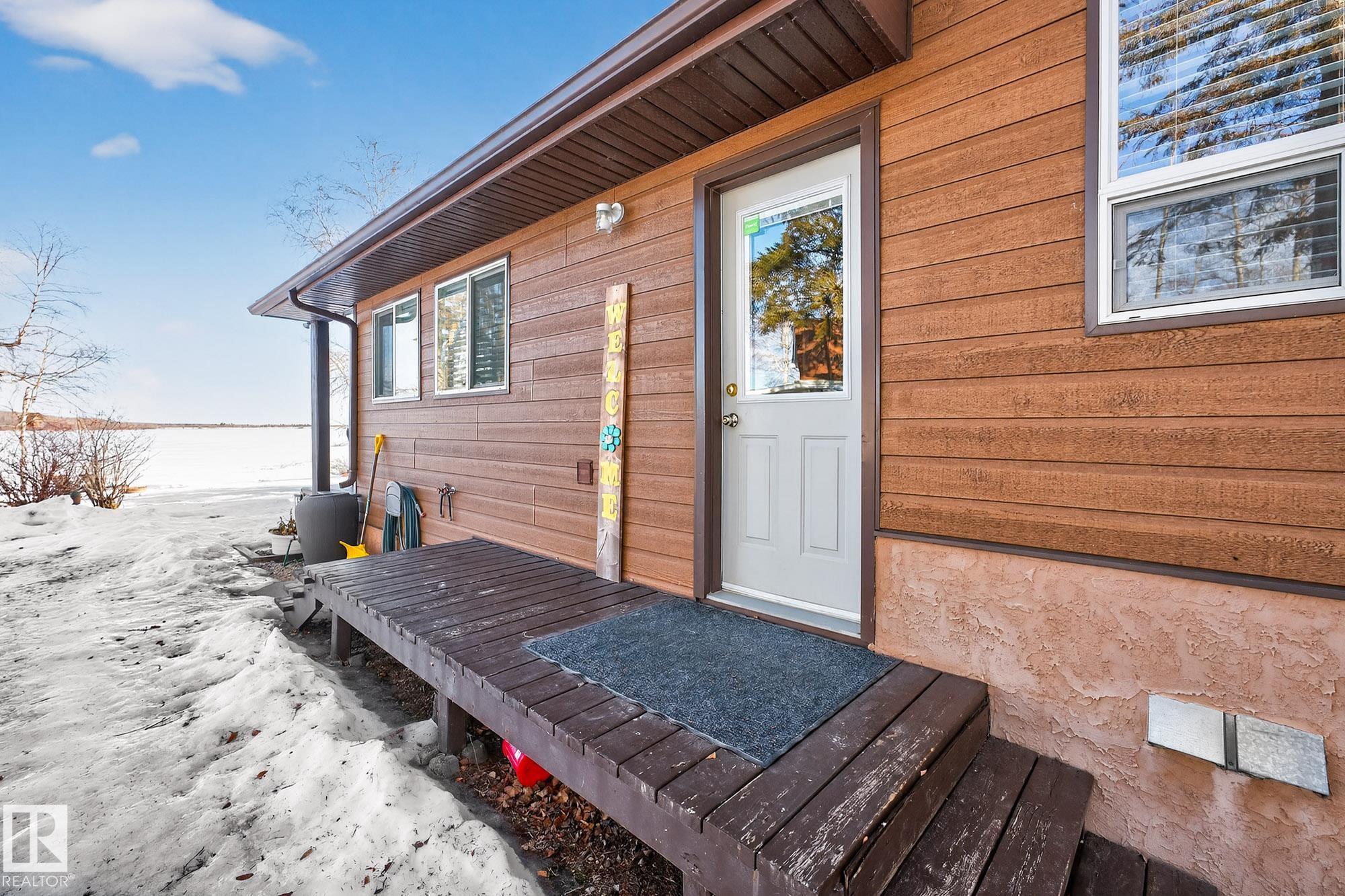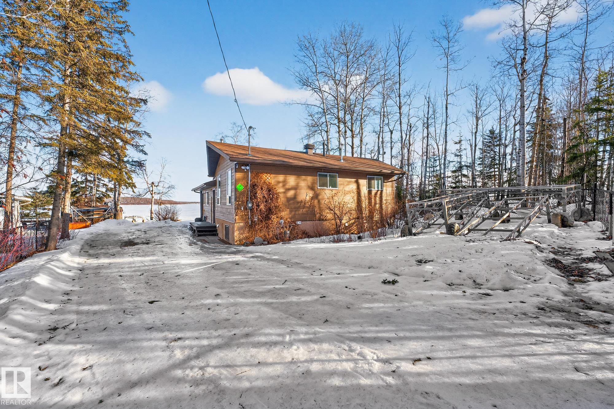 Ideal location an hour west of Edmonton and 20 mins south of Barrhead. Welcome to this immaculate and cozy four-season LAKEFRONT retreat, perfectly set on 0.27 acres and bordering environmental reserve land for added privacy and natural beauty. This thoughtfully updated property offers 3 bedrooms with closets and 2 full baths, with a major renovation completed in 2018 including all flooring, doors, casing, bathrooms, and a stunning kitchen. Natural light pours in through abundant windows, creating a bright and welcoming interior. A cozy woodstove with brick surround adds charm and comfort for year-round enjoyment. Step outside to a huge covered deck overlooking a large, flat front yard with a fire pit area--ideal for entertaining or relaxing lakeside. Gorgeous perennial beds and mature landscaping enhance the setting, all fully fenced with black chain-link. Three large storage sheds are included, one cleverly converted into a sleep shack with window and durable vinyl plank flooring. Priced to sell!