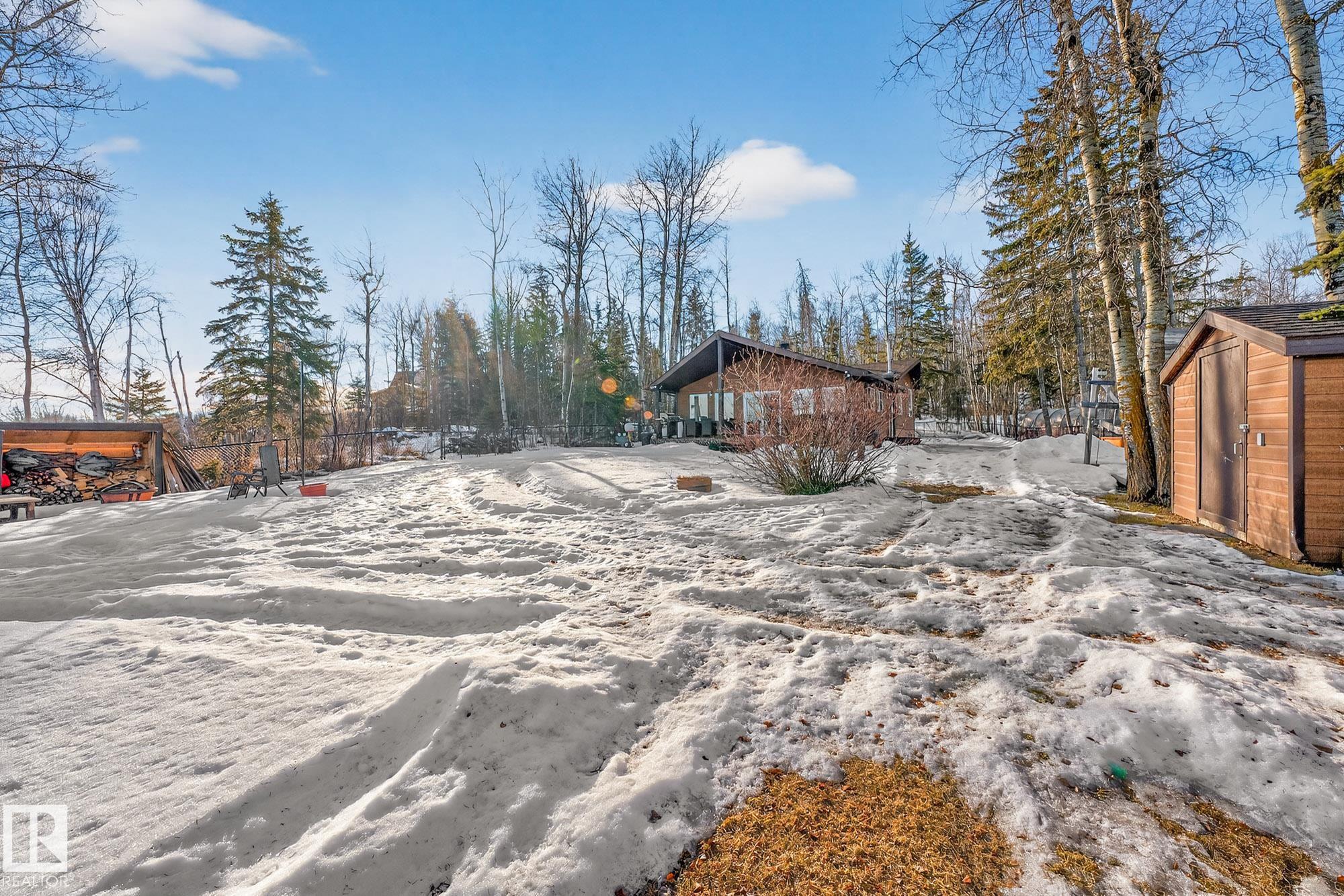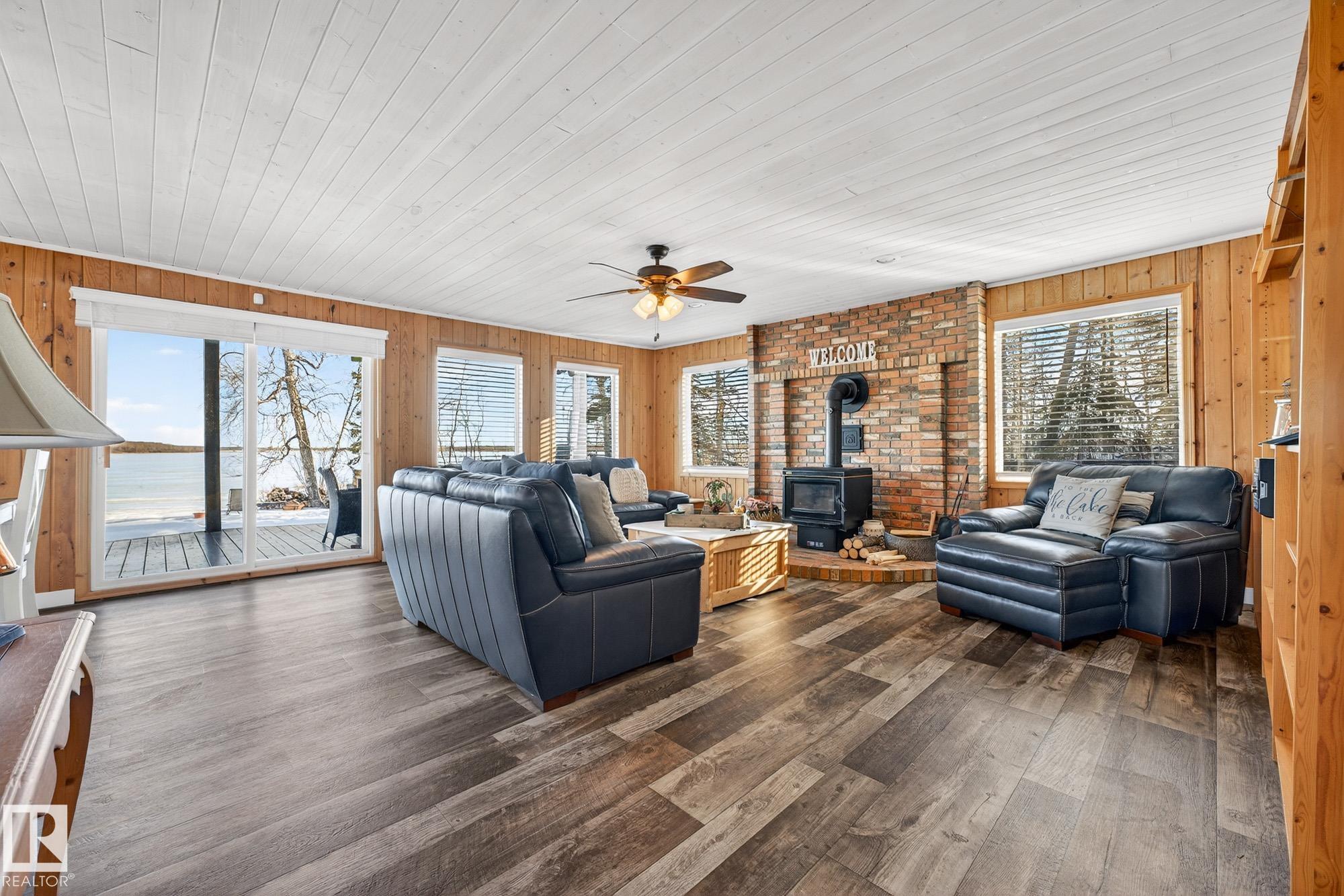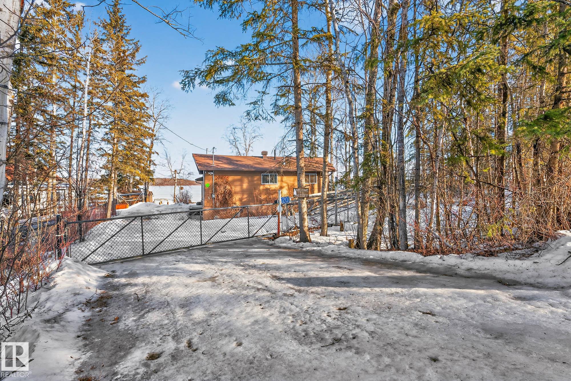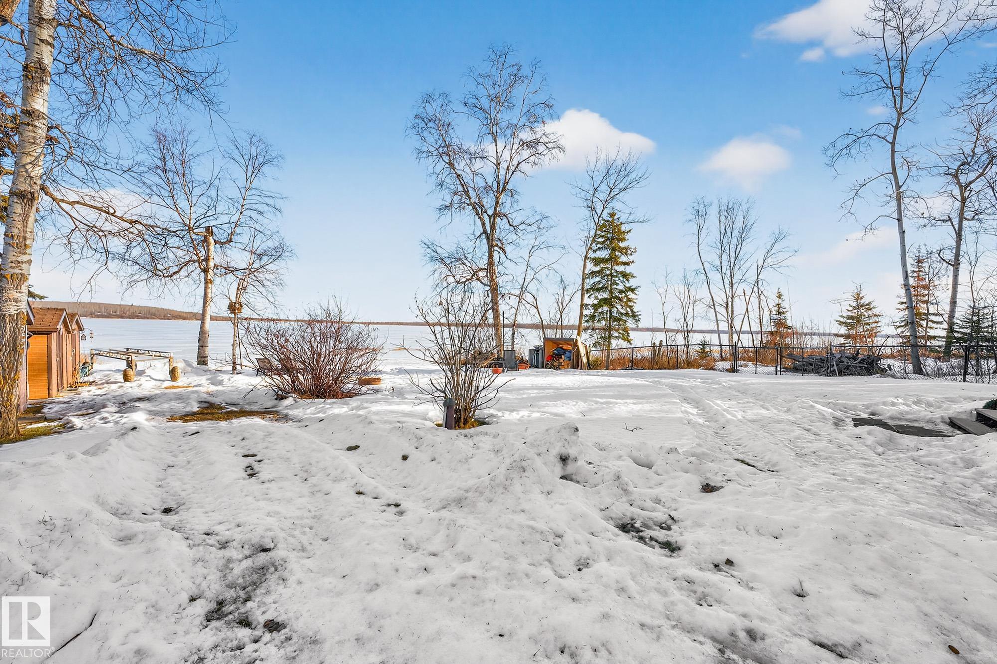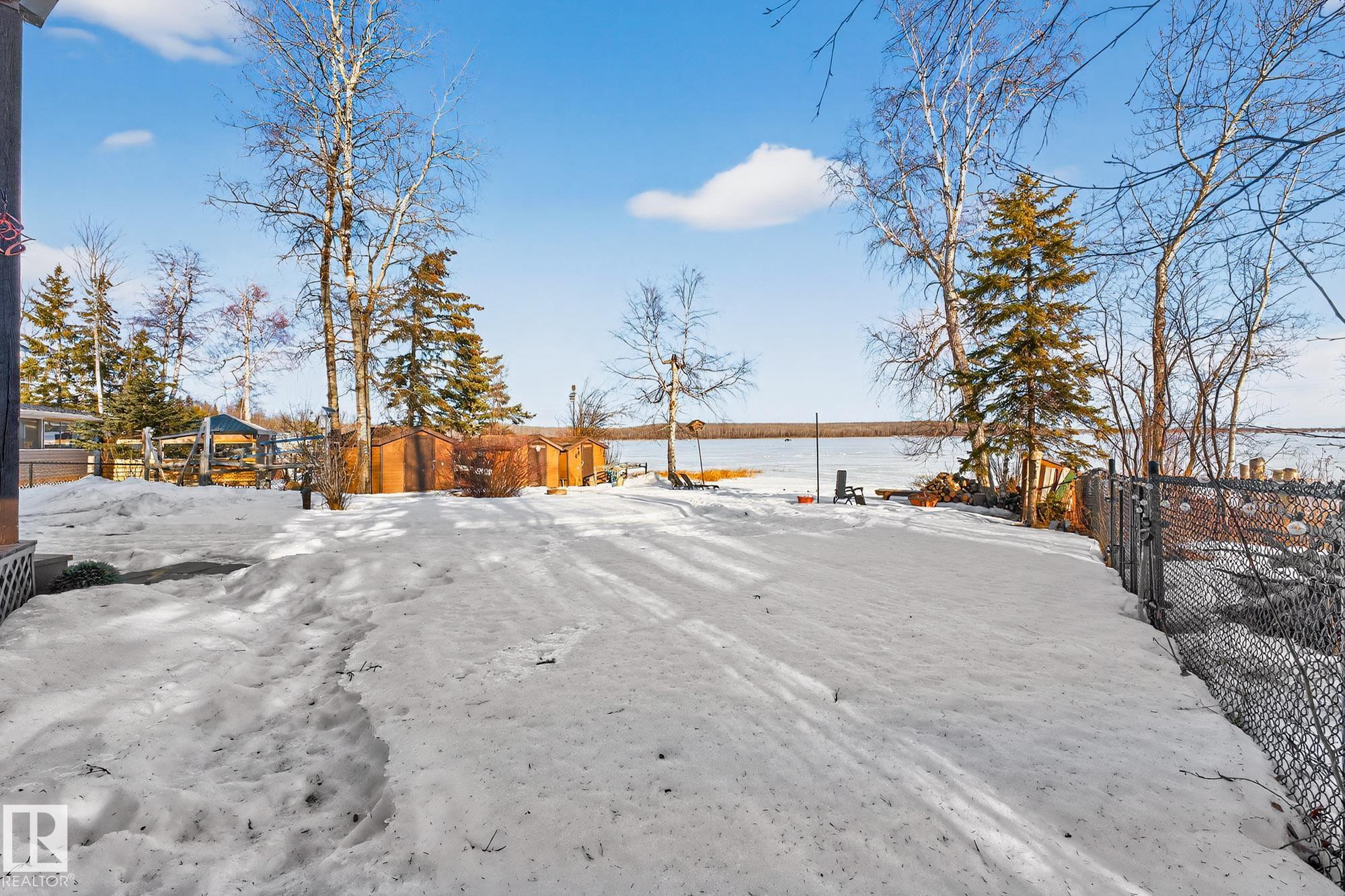 Ideal location an hour west of Edmonton and 20 mins south of Barrhead. Welcome to this immaculate and cozy four-season LAKEFRONT retreat, perfectly set on 0.27 acres and bordering environmental reserve land for added privacy and natural beauty. This thoughtfully updated property offers 3 bedrooms with closets and 2 full baths, with a major renovation completed in 2018 including all flooring, doors, casing, bathrooms, and a stunning kitchen. Natural light pours in through abundant windows, creating a bright and welcoming interior. A cozy woodstove with brick surround adds charm and comfort for year-round enjoyment. Step outside to a huge covered deck overlooking a large, flat front yard with a fire pit area--ideal for entertaining or relaxing lakeside. Gorgeous perennial beds and mature landscaping enhance the setting, all fully fenced with black chain-link. Three large storage sheds are included, one cleverly converted into a sleep shack with window and durable vinyl plank flooring. Priced to sell!