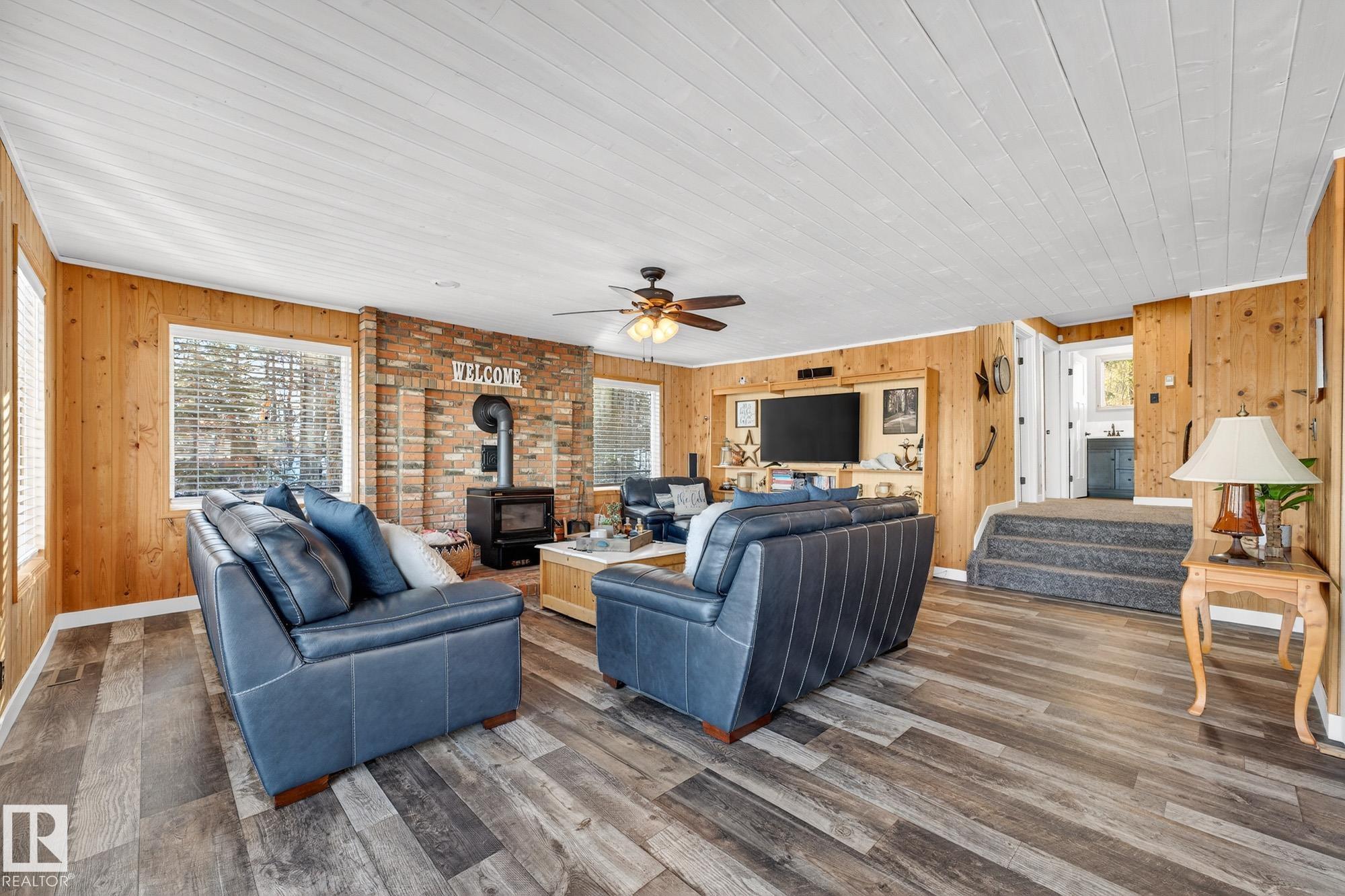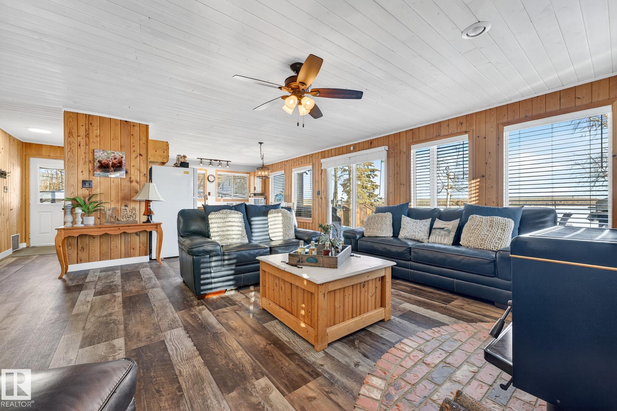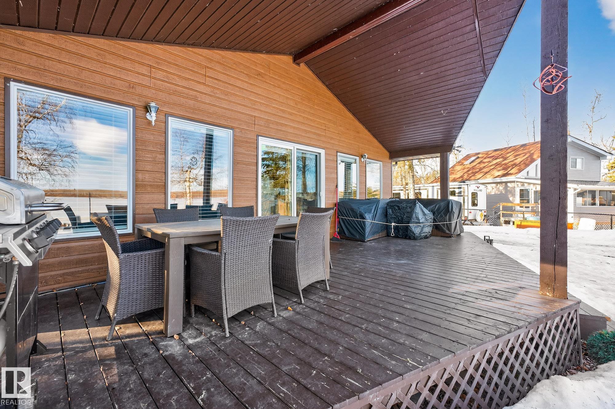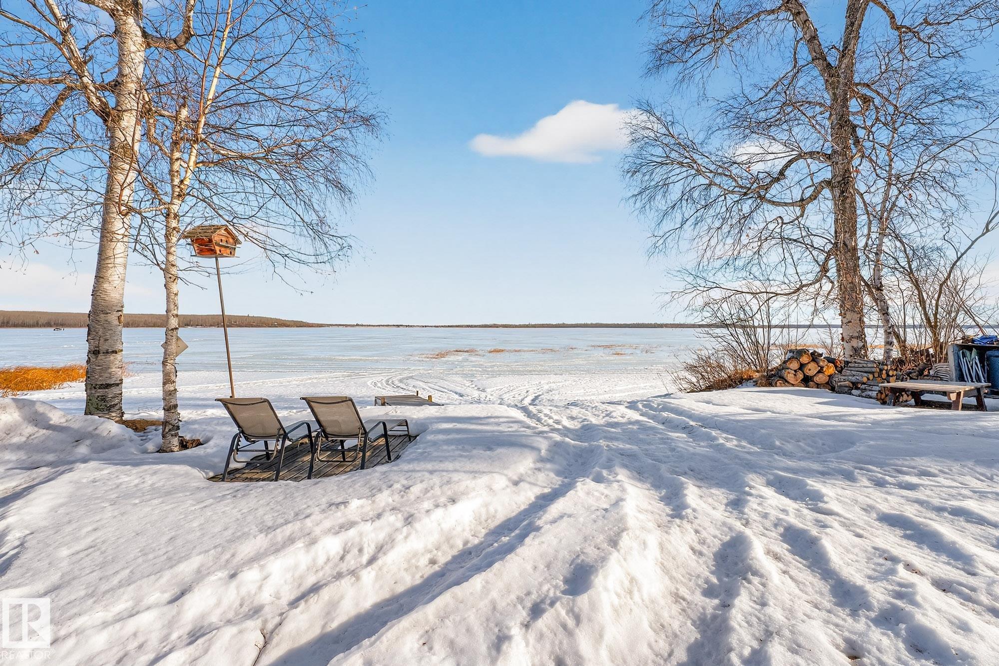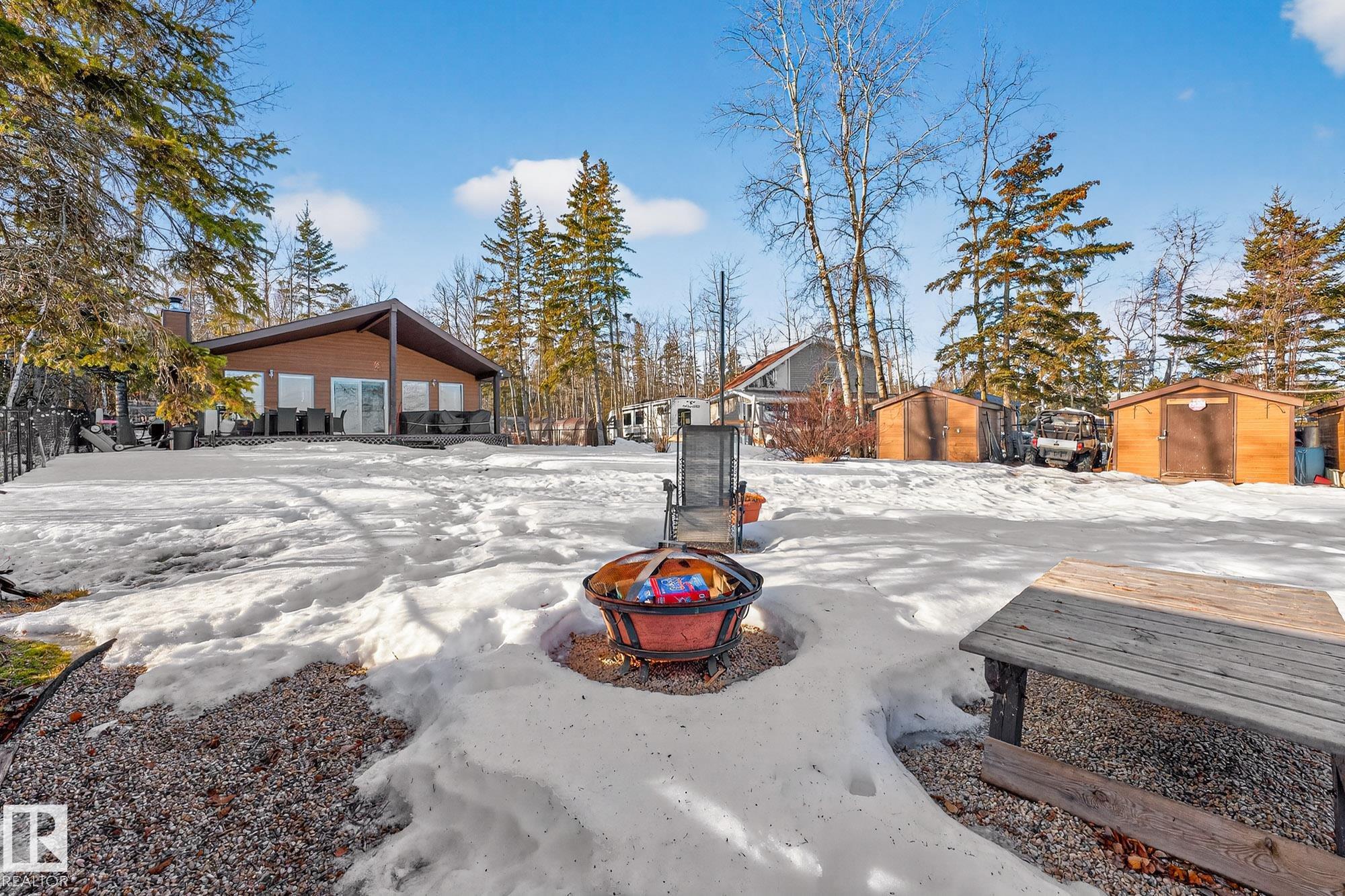Ideal location an hour west of Edmonton and 20 mins south of Barrhead. Welcome to this immaculate and cozy four-season LAKEFRONT retreat, perfectly set on 0.27 acres and bordering environmental reserve land for added privacy and natural beauty. This thoughtfully updated property offers 3 bedrooms with closets and 2 full baths, with a major renovation completed in 2018 including all flooring, doors, casing, bathrooms, and a stunning kitchen. Natural light pours in through abundant windows, creating a bright and welcoming interior. A cozy woodstove with brick surround adds charm and comfort for year-round enjoyment. Step outside to a huge covered deck overlooking a large, flat front yard with a fire pit area--ideal for entertaining or relaxing lakeside. Gorgeous perennial beds and mature landscaping enhance the setting, all fully fenced with black chain-link. Three large storage sheds are included, one cleverly converted into a sleep shack with window and durable vinyl plank flooring. Priced to sell!
