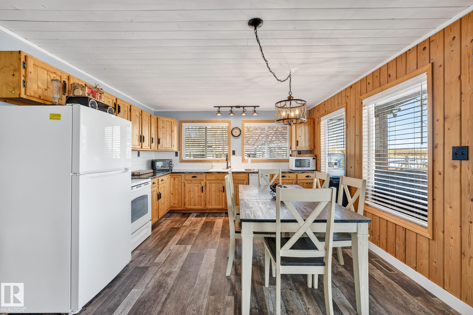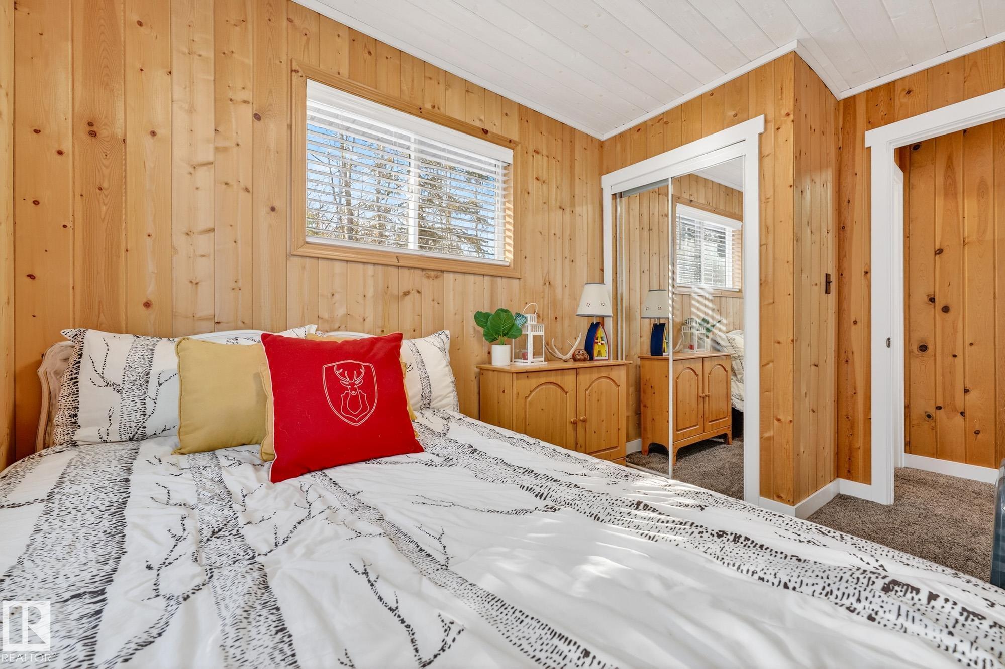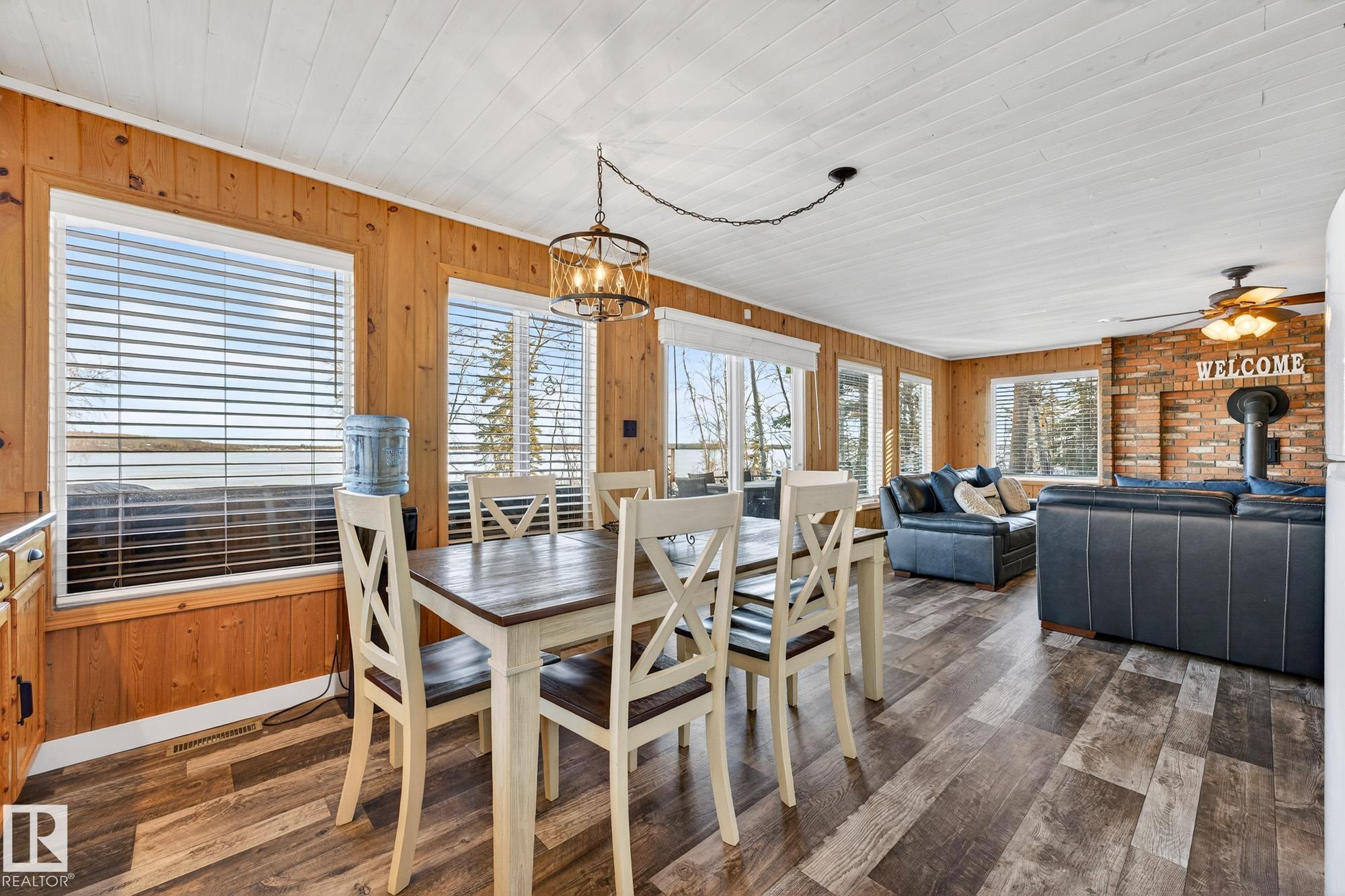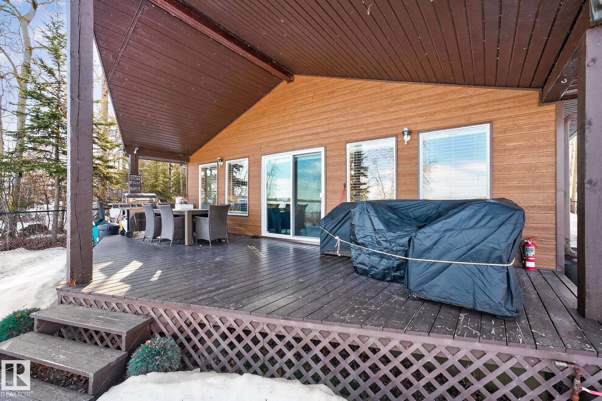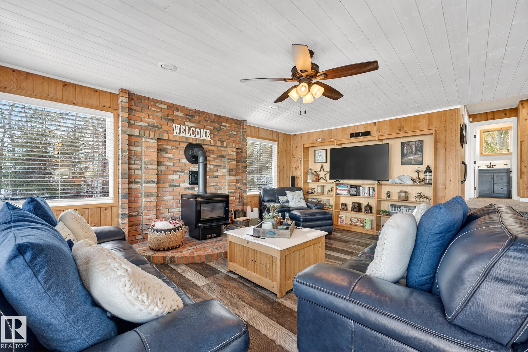 Ideal location an hour west of Edmonton and 20 mins south of Barrhead. Welcome to this immaculate and cozy four-season LAKEFRONT retreat, perfectly set on 0.27 acres and bordering environmental reserve land for added privacy and natural beauty. This thoughtfully updated property offers 3 bedrooms with closets and 2 full baths, with a major renovation completed in 2018 including all flooring, doors, casing, bathrooms, and a stunning kitchen. Natural light pours in through abundant windows, creating a bright and welcoming interior. A cozy woodstove with brick surround adds charm and comfort for year-round enjoyment. Step outside to a huge covered deck overlooking a large, flat front yard with a fire pit area--ideal for entertaining or relaxing lakeside. Gorgeous perennial beds and mature landscaping enhance the setting, all fully fenced with black chain-link. Three large storage sheds are included, one cleverly converted into a sleep shack with window and durable vinyl plank flooring. Priced to sell!