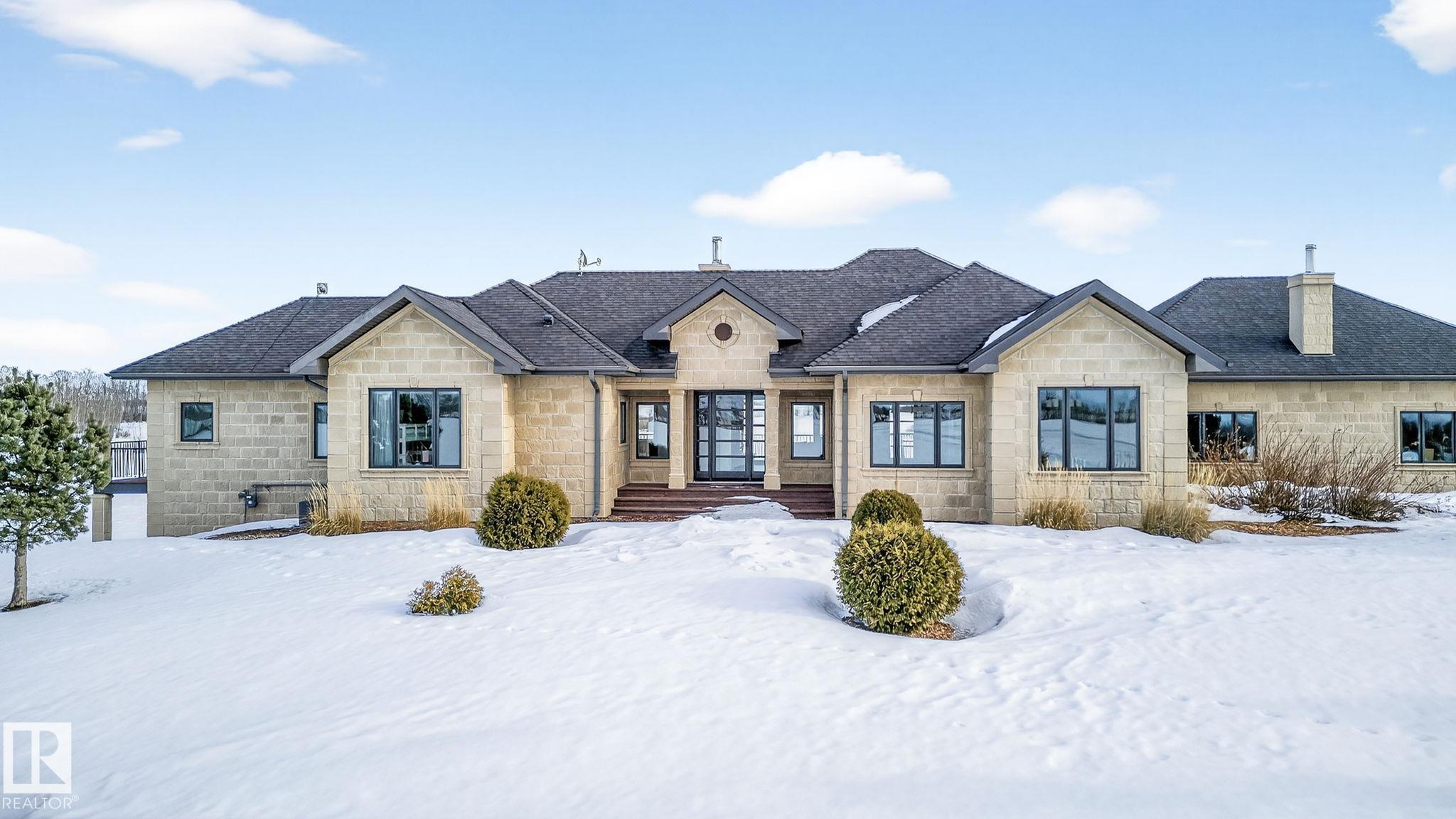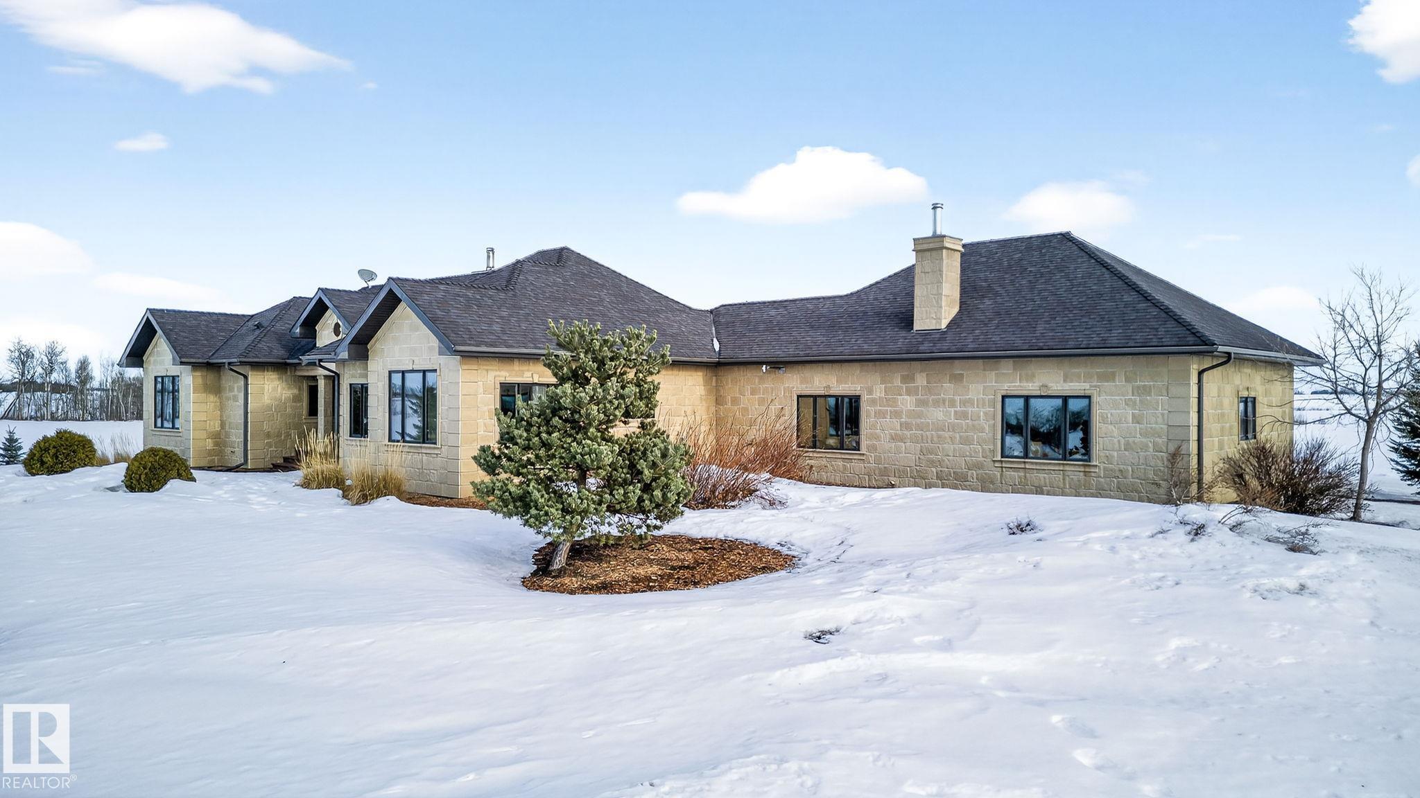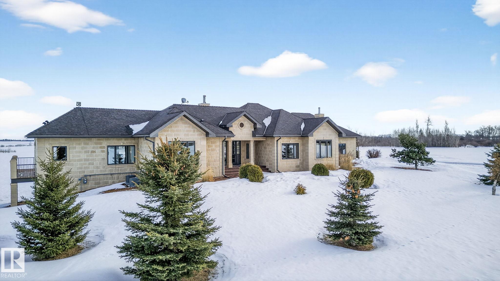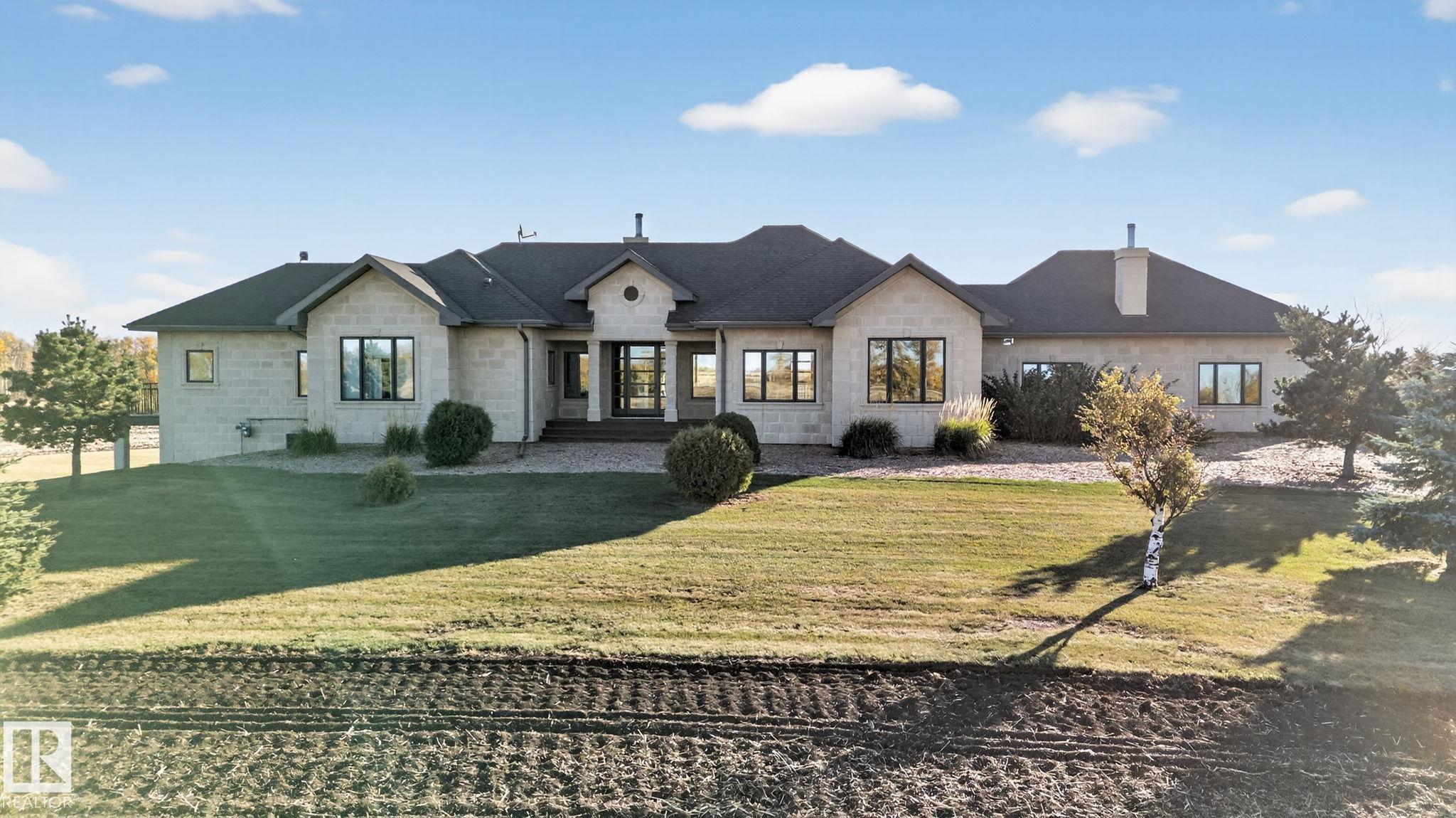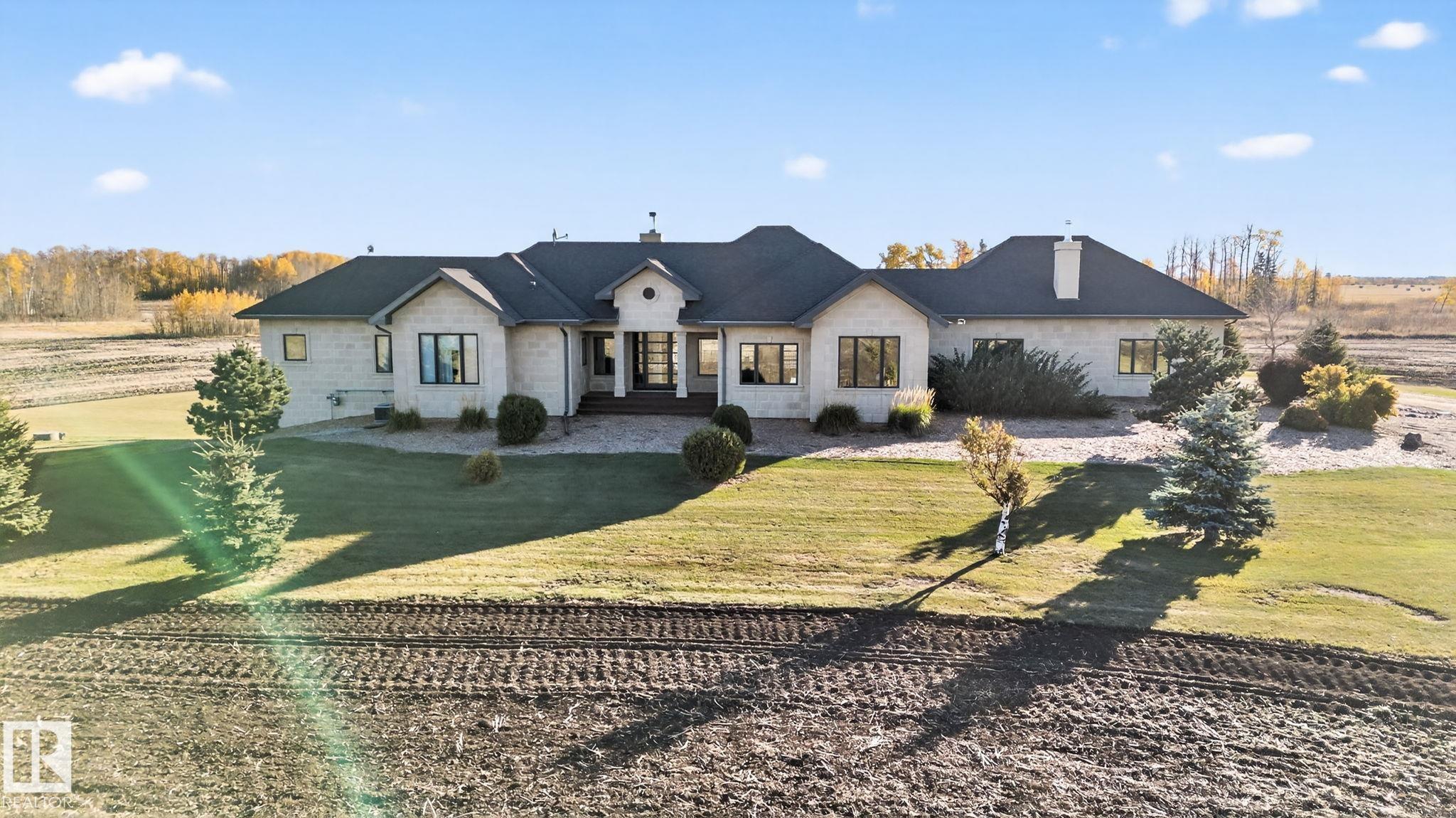 EXECUTIVE ESTATE on a PRIVATE 80-ACRE PARCEL offering TOTAL PRIVACY, surrounded by mature trees and high-producing farmland. Ideally located just 3 MINUTES TO BON ACCORD and LESS THAN 20 MINUTES TO ST. ALBERT, this hidden gem blends luxury and functionality. Showcasing a striking stone tile exterior, professional landscaping, and a FULL WALK-OUT BASEMENT, this custom open-concept bungalow features hand-scraped hardwood floors and a sun-filled great room with WALLS OF WINDOWS. The chef-inspired kitchen offers TOP-OF-THE-LINE INTEGRATED APPLIANCES and overlooks the dining area. The living room is anchored by a FLOOR-TO-CEILING STONE FIREPLACE. The spacious primary retreat includes a SPA-LIKE ENSUITE, alongside two additional bedrooms and main floor laundry. The lower level is designed for ENTERTAINING with a media room, rec room, 4th & 5th bedrooms and full bath. Complete with an OVERSIZED FOUR-BAY FULLY FINISHED GARAGE plus space to BUILD A DREAM SHOP or explore SUBDIVISION POTENTIAL. A MUST SEE IN PERSON!