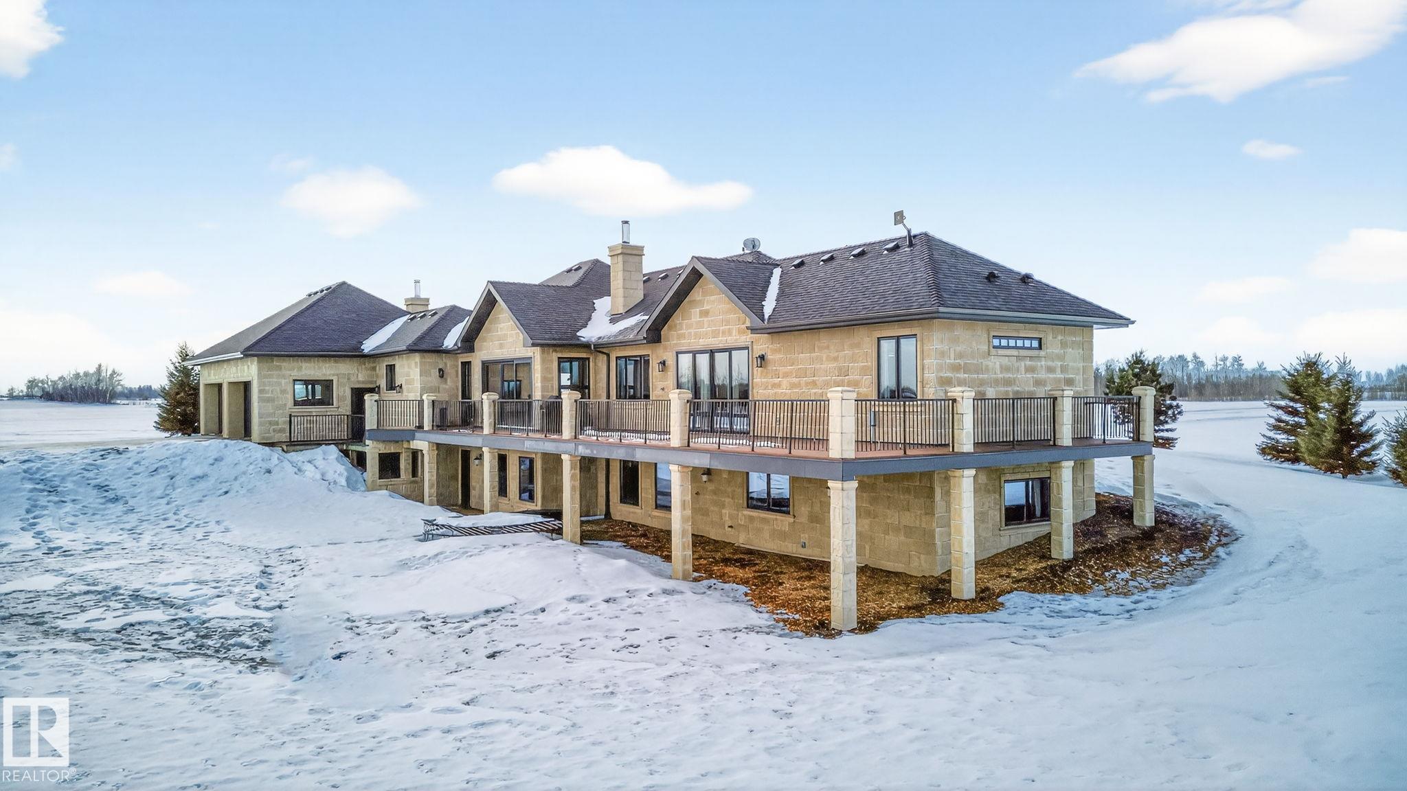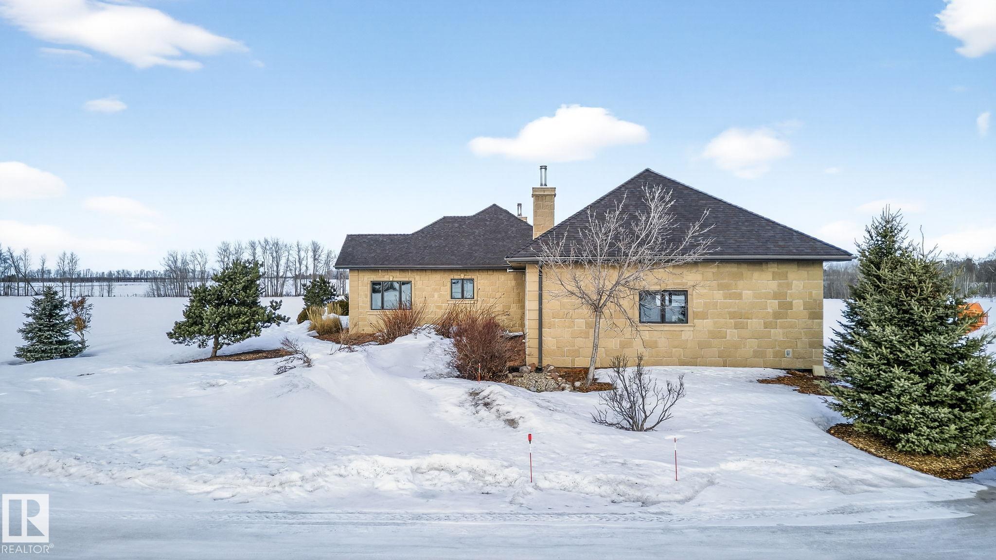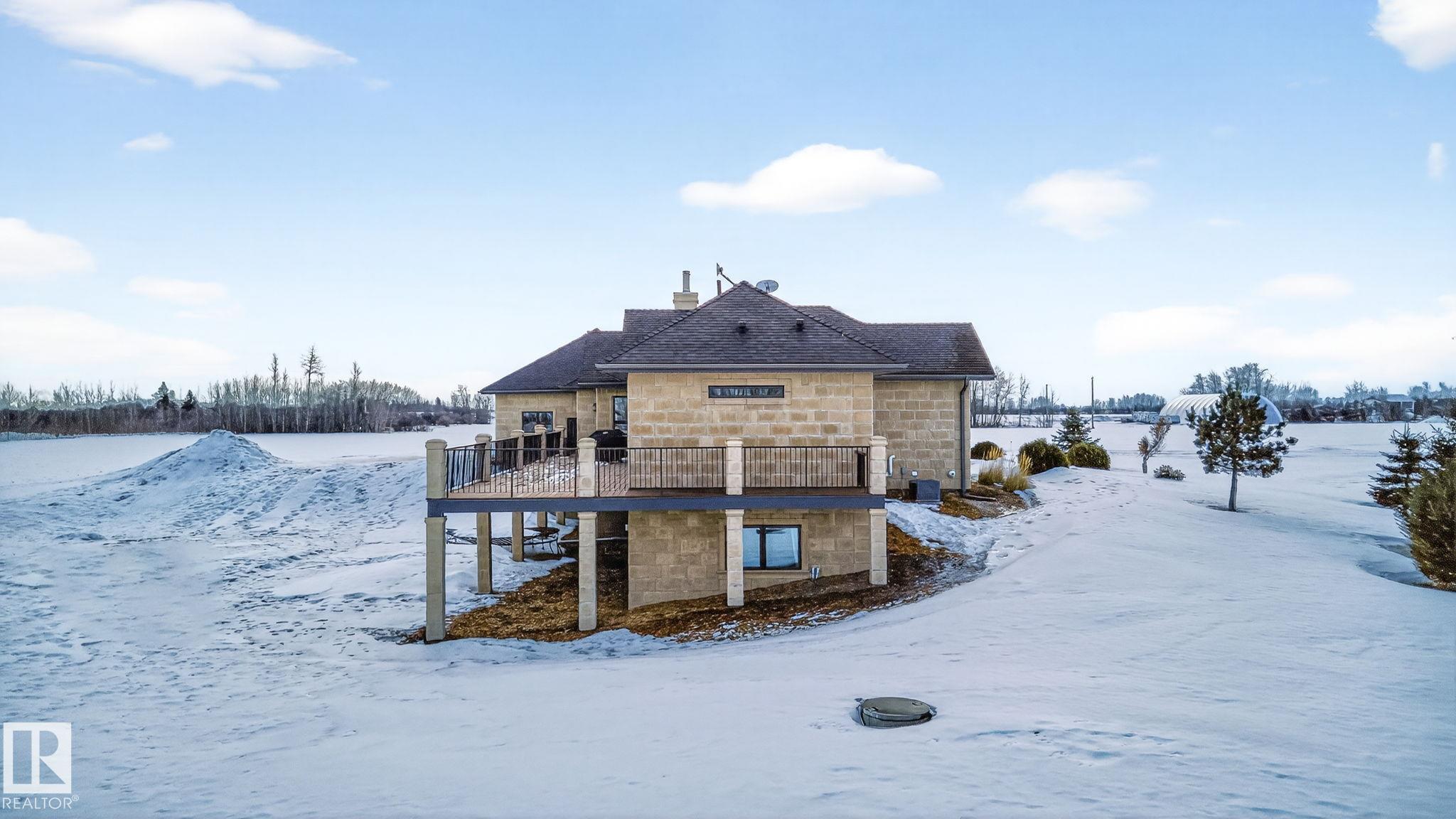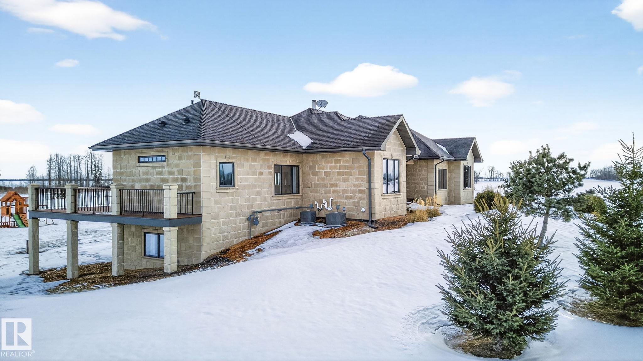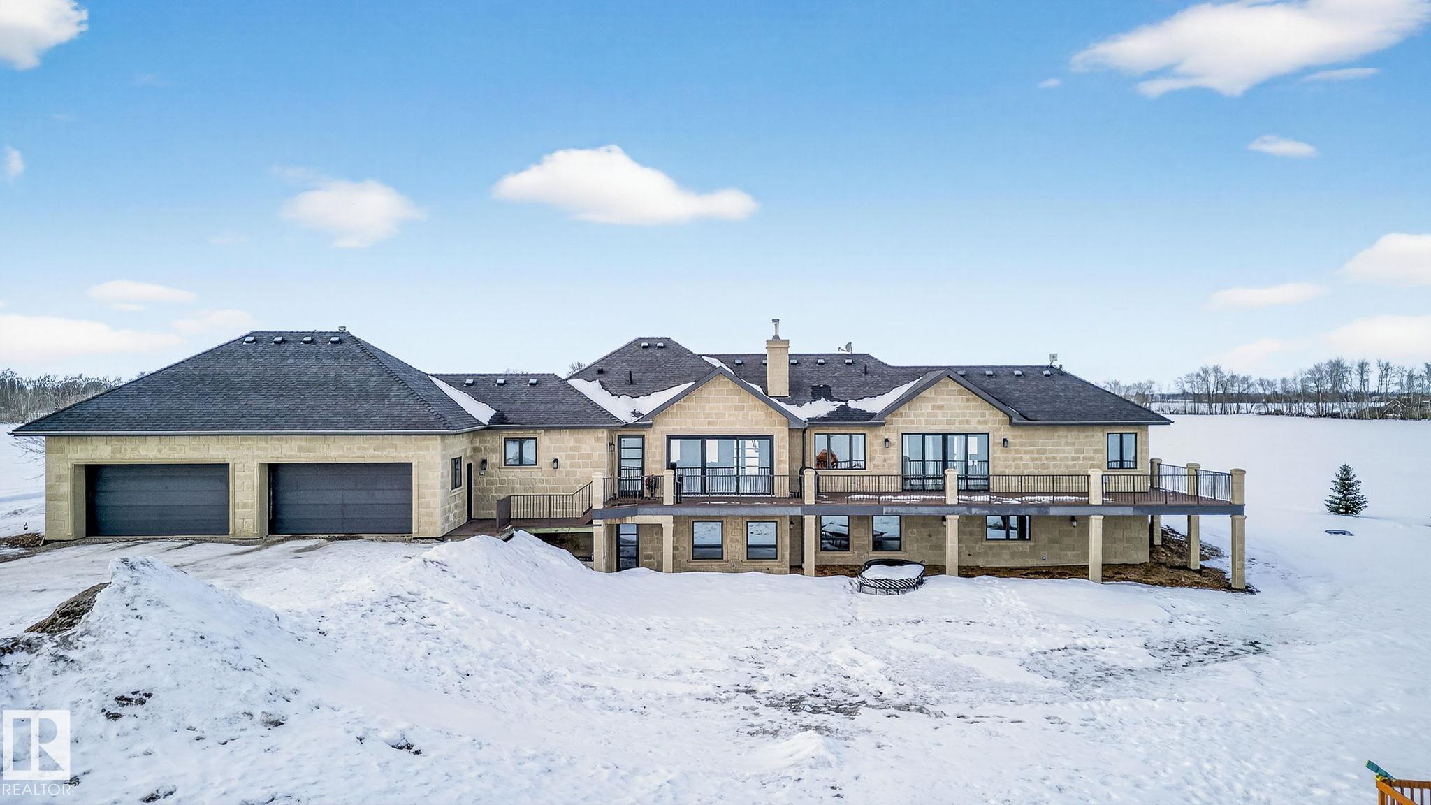 EXECUTIVE ESTATE on a PRIVATE 80-ACRE PARCEL offering TOTAL PRIVACY, surrounded by mature trees and high-producing farmland. Ideally located just 3 MINUTES TO BON ACCORD and LESS THAN 20 MINUTES TO ST. ALBERT, this hidden gem blends luxury and functionality. Showcasing a striking stone tile exterior, professional landscaping, and a FULL WALK-OUT BASEMENT, this custom open-concept bungalow features hand-scraped hardwood floors and a sun-filled great room with WALLS OF WINDOWS. The chef-inspired kitchen offers TOP-OF-THE-LINE INTEGRATED APPLIANCES and overlooks the dining area. The living room is anchored by a FLOOR-TO-CEILING STONE FIREPLACE. The spacious primary retreat includes a SPA-LIKE ENSUITE, alongside two additional bedrooms and main floor laundry. The lower level is designed for ENTERTAINING with a media room, rec room, 4th & 5th bedrooms and full bath. Complete with an OVERSIZED FOUR-BAY FULLY FINISHED GARAGE plus space to BUILD A DREAM SHOP or explore SUBDIVISION POTENTIAL. A MUST SEE IN PERSON!