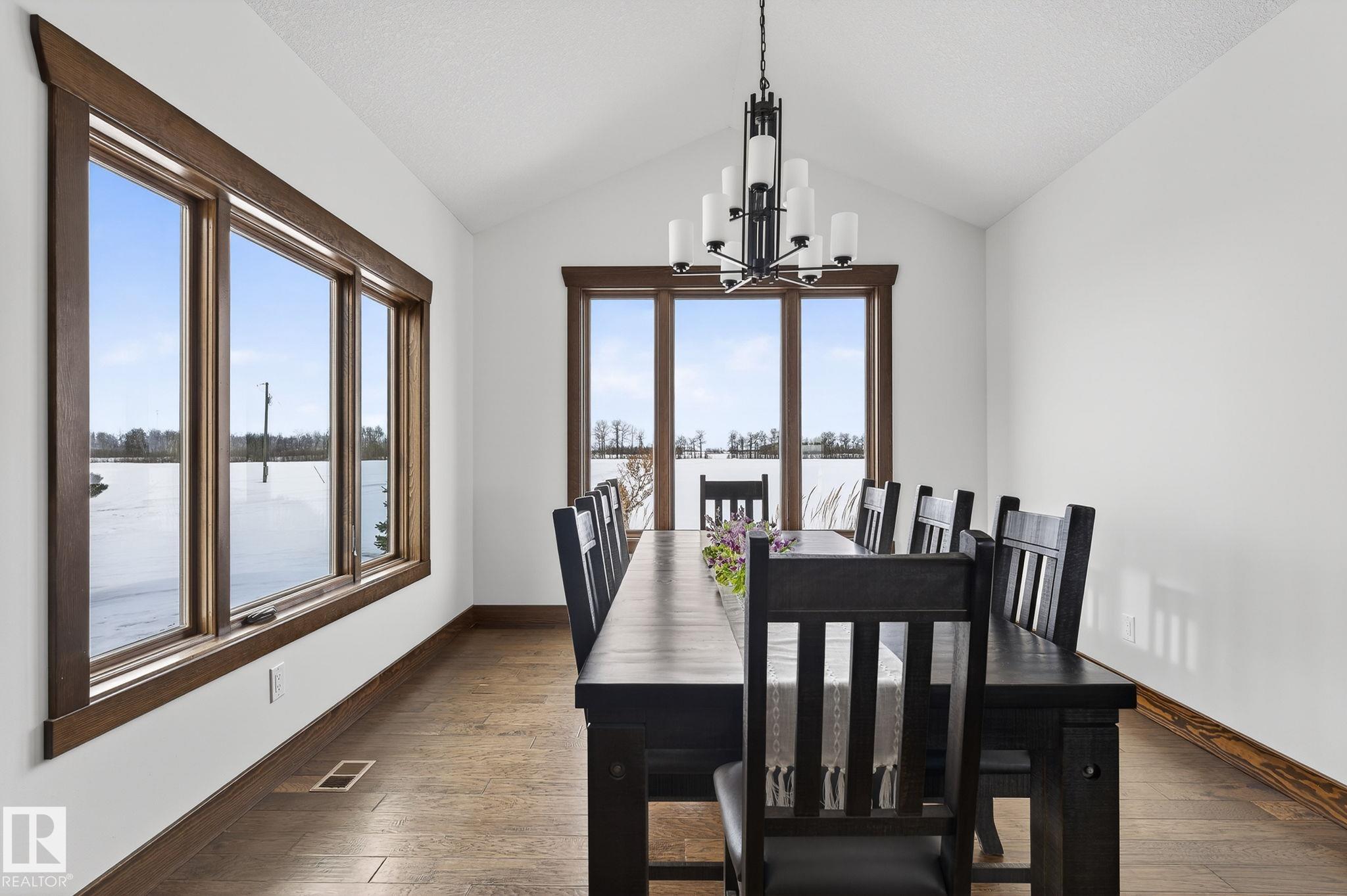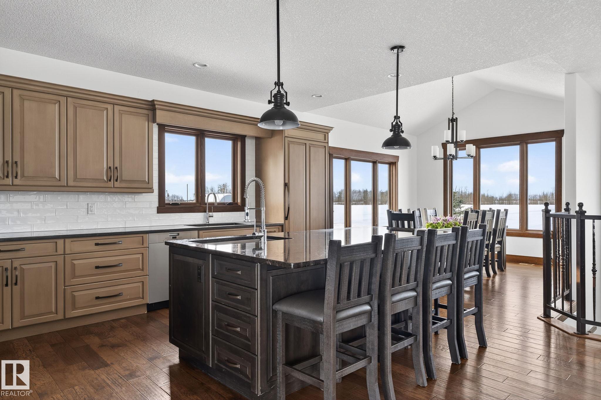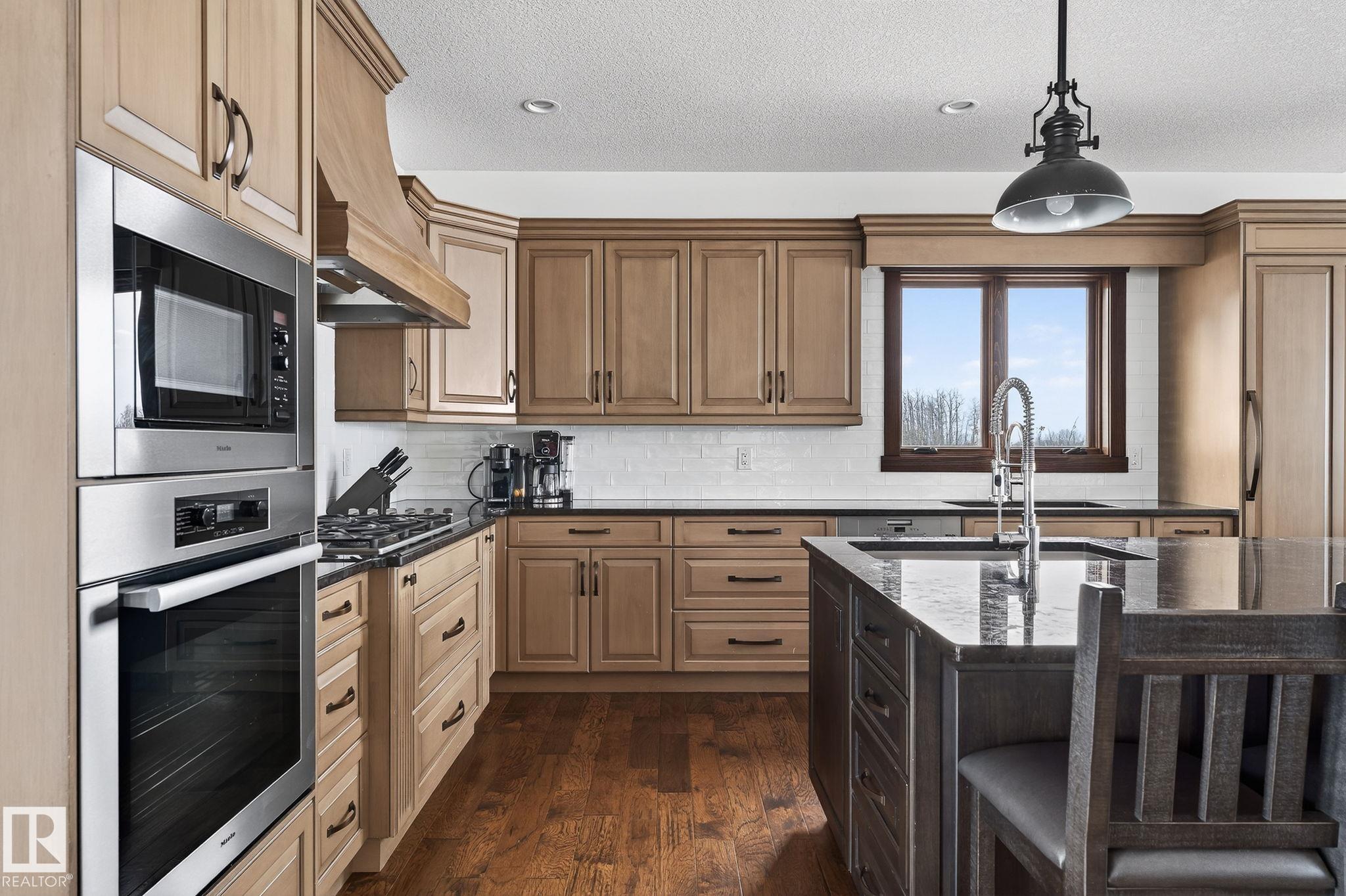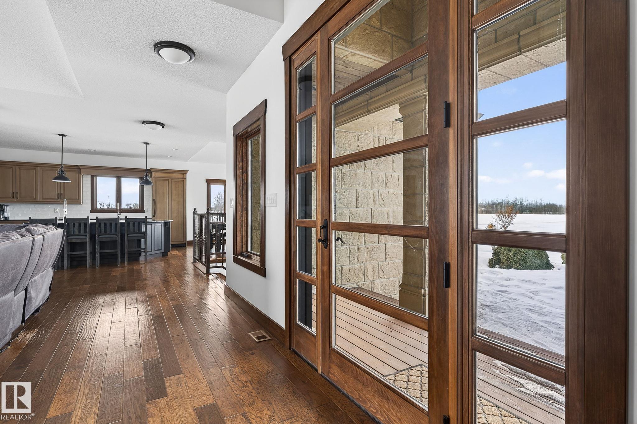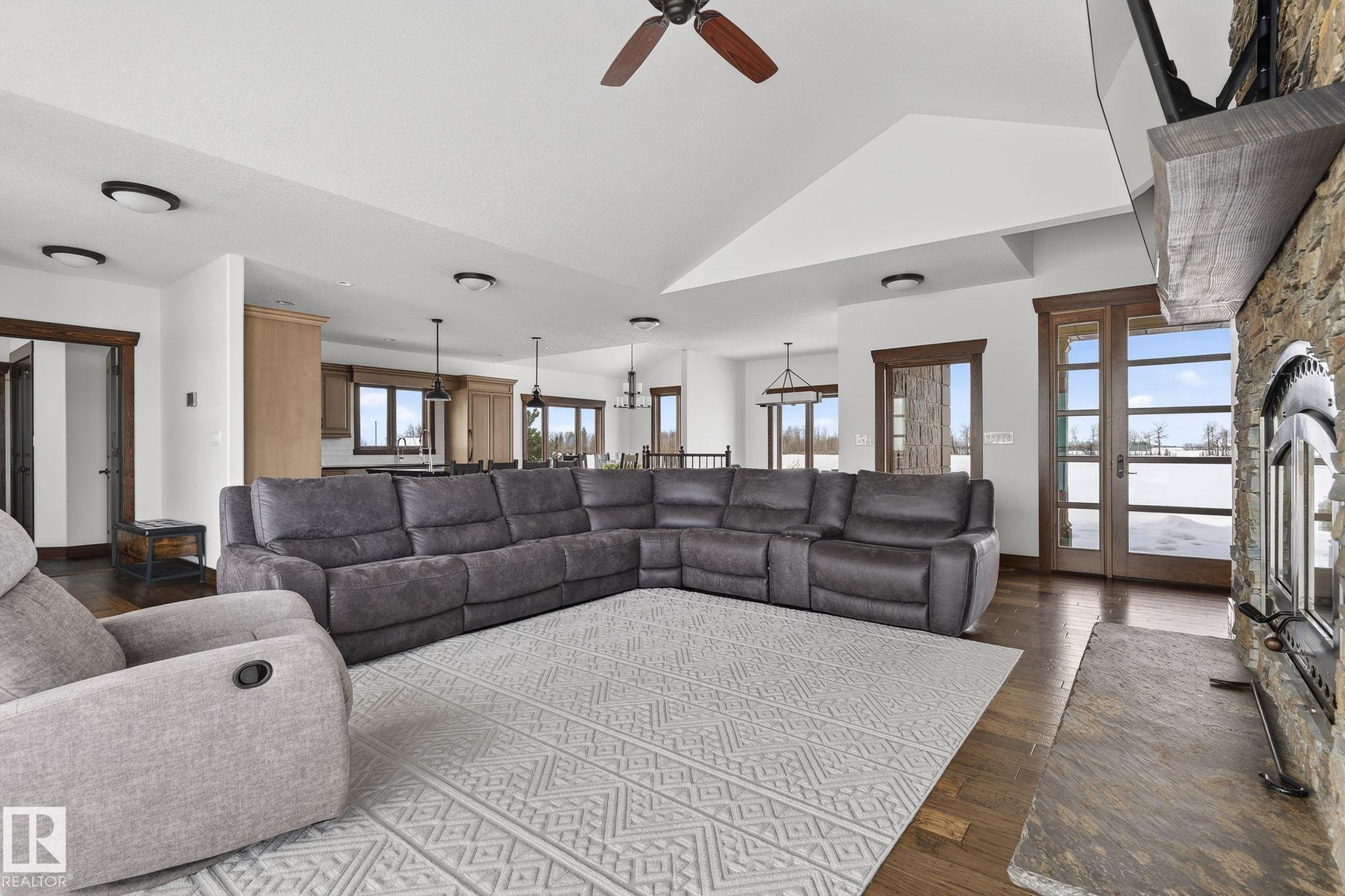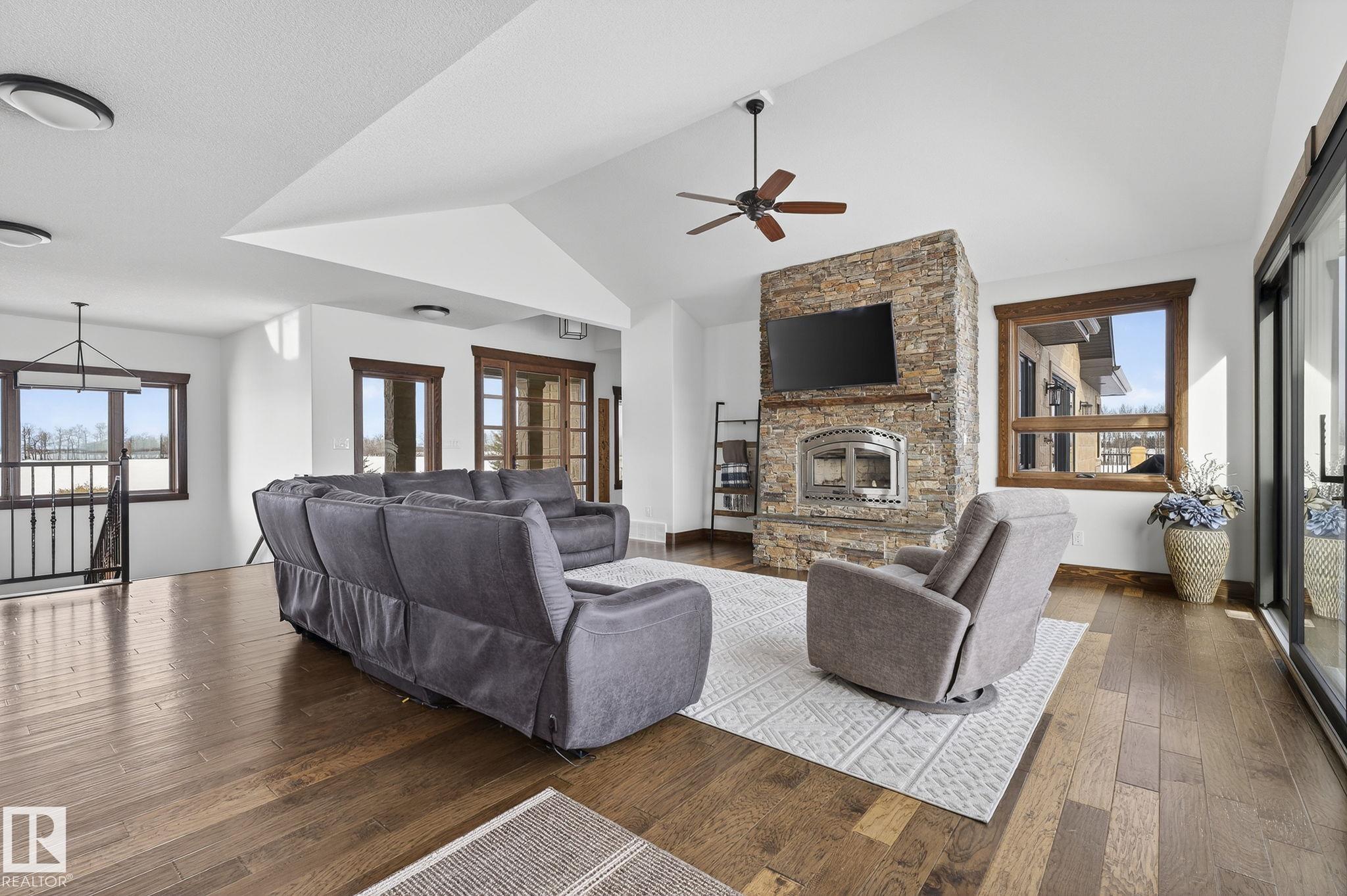 EXECUTIVE ESTATE on a PRIVATE 80-ACRE PARCEL offering TOTAL PRIVACY, surrounded by mature trees and high-producing farmland. Ideally located just 3 MINUTES TO BON ACCORD and LESS THAN 20 MINUTES TO ST. ALBERT, this hidden gem blends luxury and functionality. Showcasing a striking stone tile exterior, professional landscaping, and a FULL WALK-OUT BASEMENT, this custom open-concept bungalow features hand-scraped hardwood floors and a sun-filled great room with WALLS OF WINDOWS. The chef-inspired kitchen offers TOP-OF-THE-LINE INTEGRATED APPLIANCES and overlooks the dining area. The living room is anchored by a FLOOR-TO-CEILING STONE FIREPLACE. The spacious primary retreat includes a SPA-LIKE ENSUITE, alongside two additional bedrooms and main floor laundry. The lower level is designed for ENTERTAINING with a media room, rec room, 4th & 5th bedrooms and full bath. Complete with an OVERSIZED FOUR-BAY FULLY FINISHED GARAGE plus space to BUILD A DREAM SHOP or explore SUBDIVISION POTENTIAL. A MUST SEE IN PERSON!