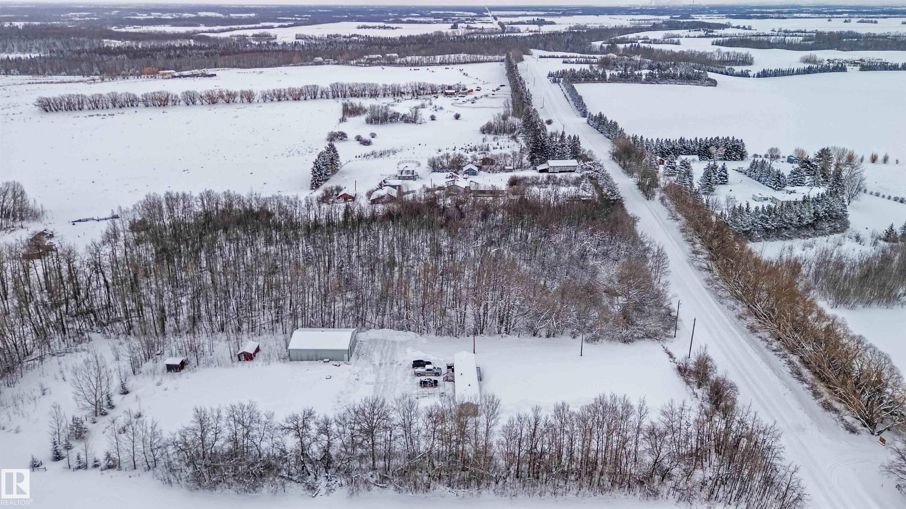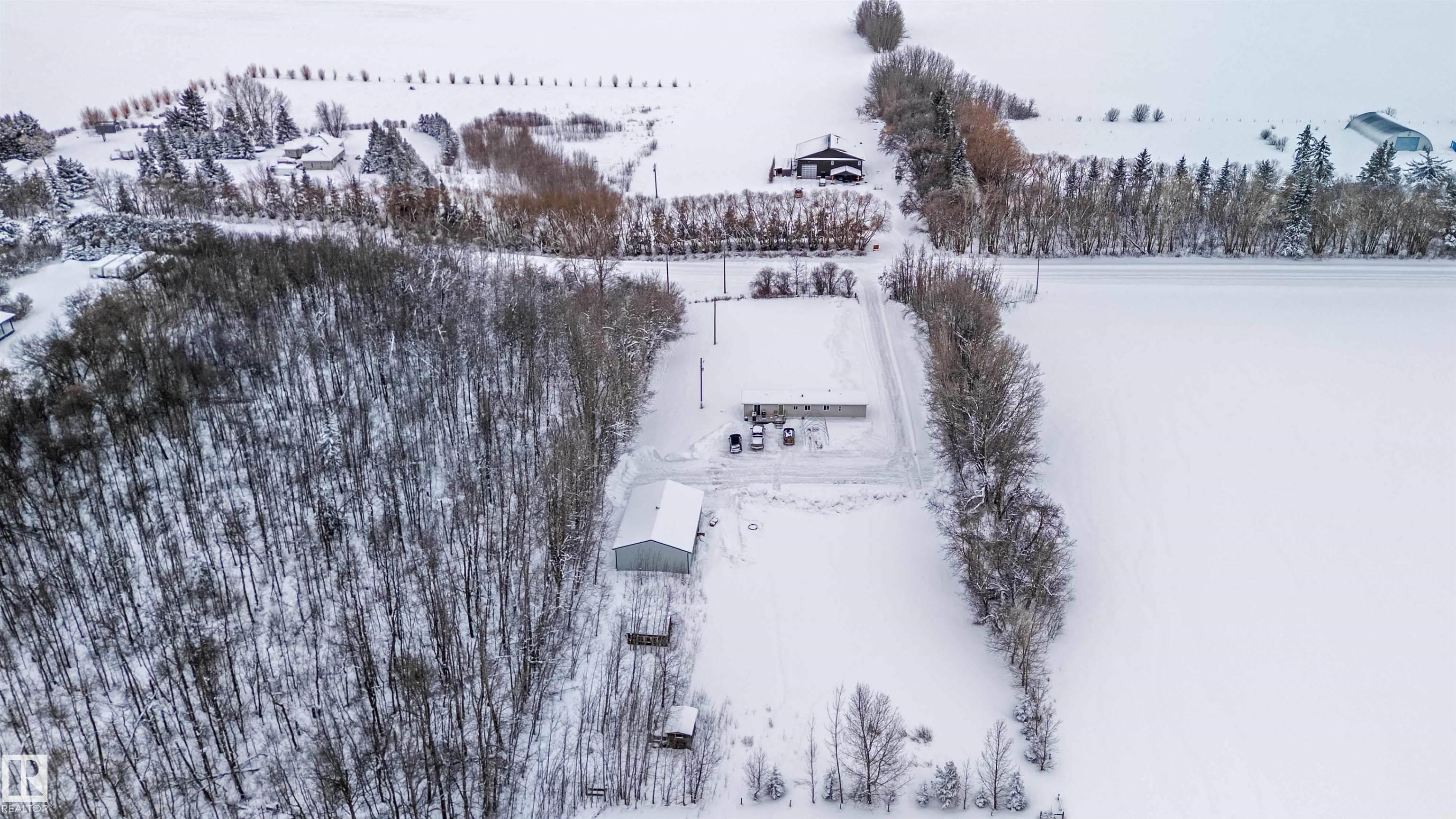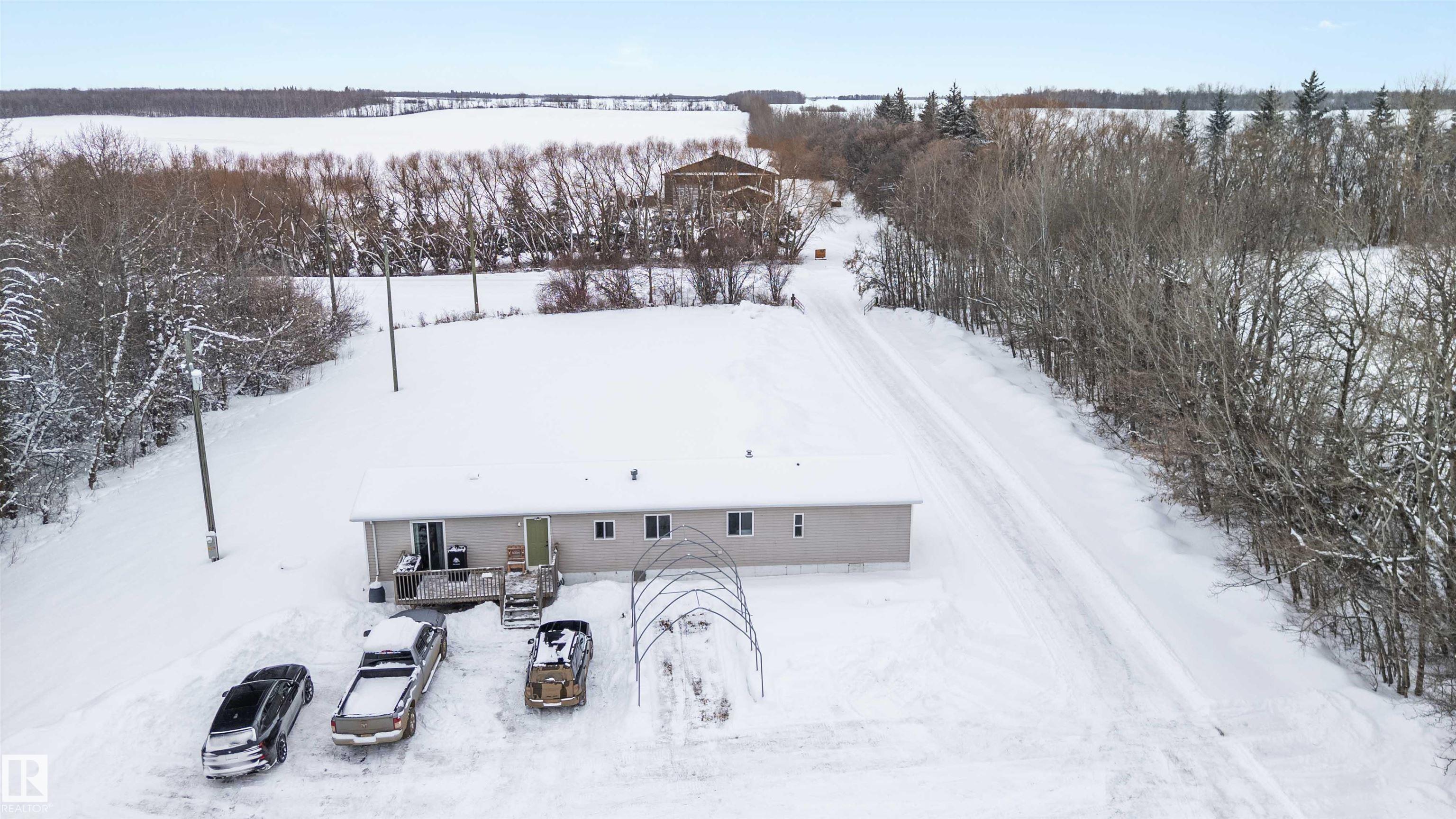 Find your peace and tranquility at this lovely acreage out of a subdivision just a few miles north of Bon Accord. Set on 2 acres with mature trees surrounding the perimeter is this completely upgraded south facing 2 bedroom modular home with a front and back landing/decks for morning coffee! Vinyl siding & windows have been replaced and the interior is nicely upgraded. Extra closet space has been added in the primary bedroom & a newer hot water tank (2013). Mature raspberry bushes & a garden area on the property and the highlight is the 30'x45' shop with lots of power & with framing around the interior walls for concrete footings. Gravel floor at present & built-in shelving will stay. Great spot for all your toys or RV storage. Enjoy country living in a great location and affordable price!