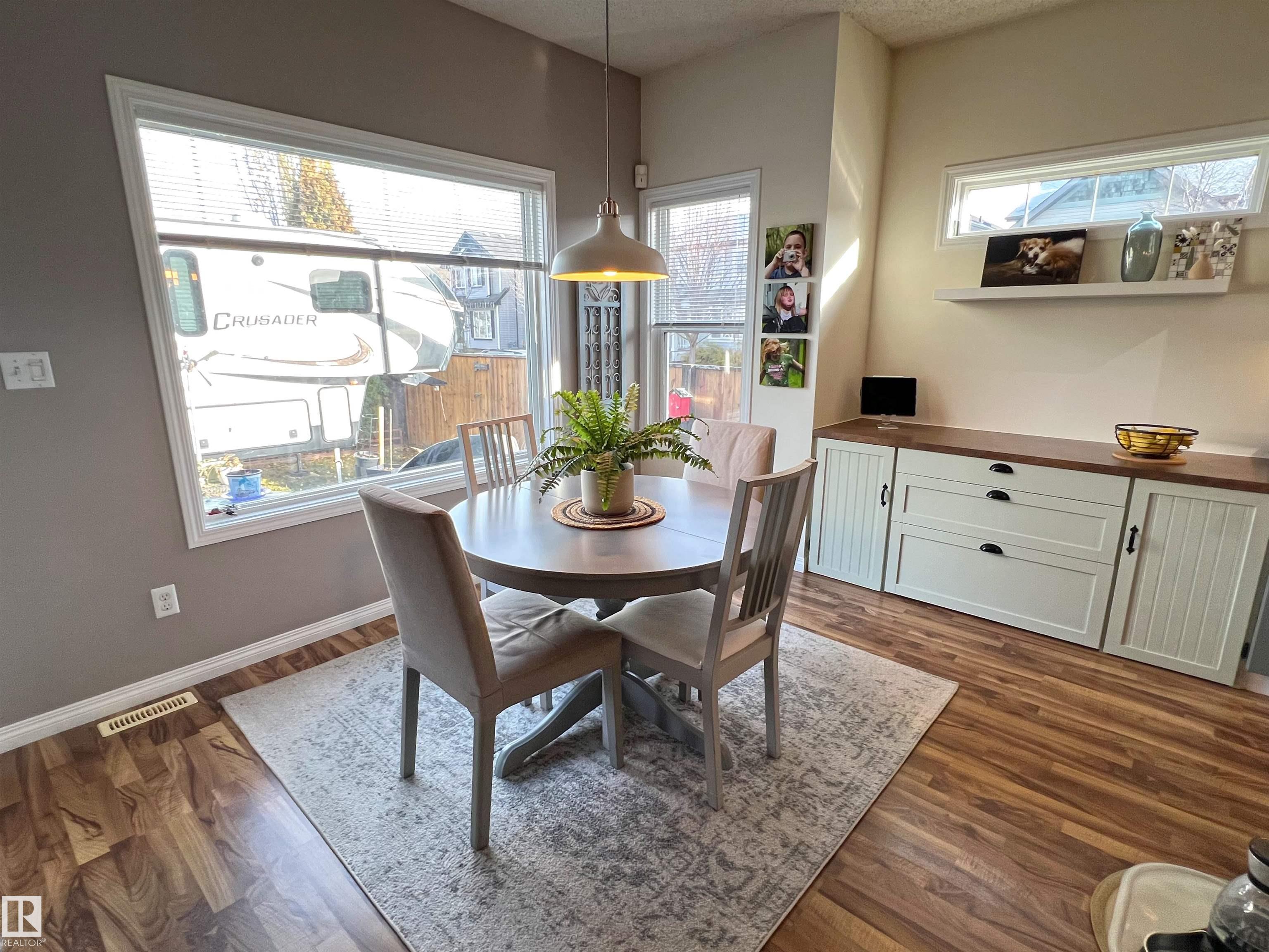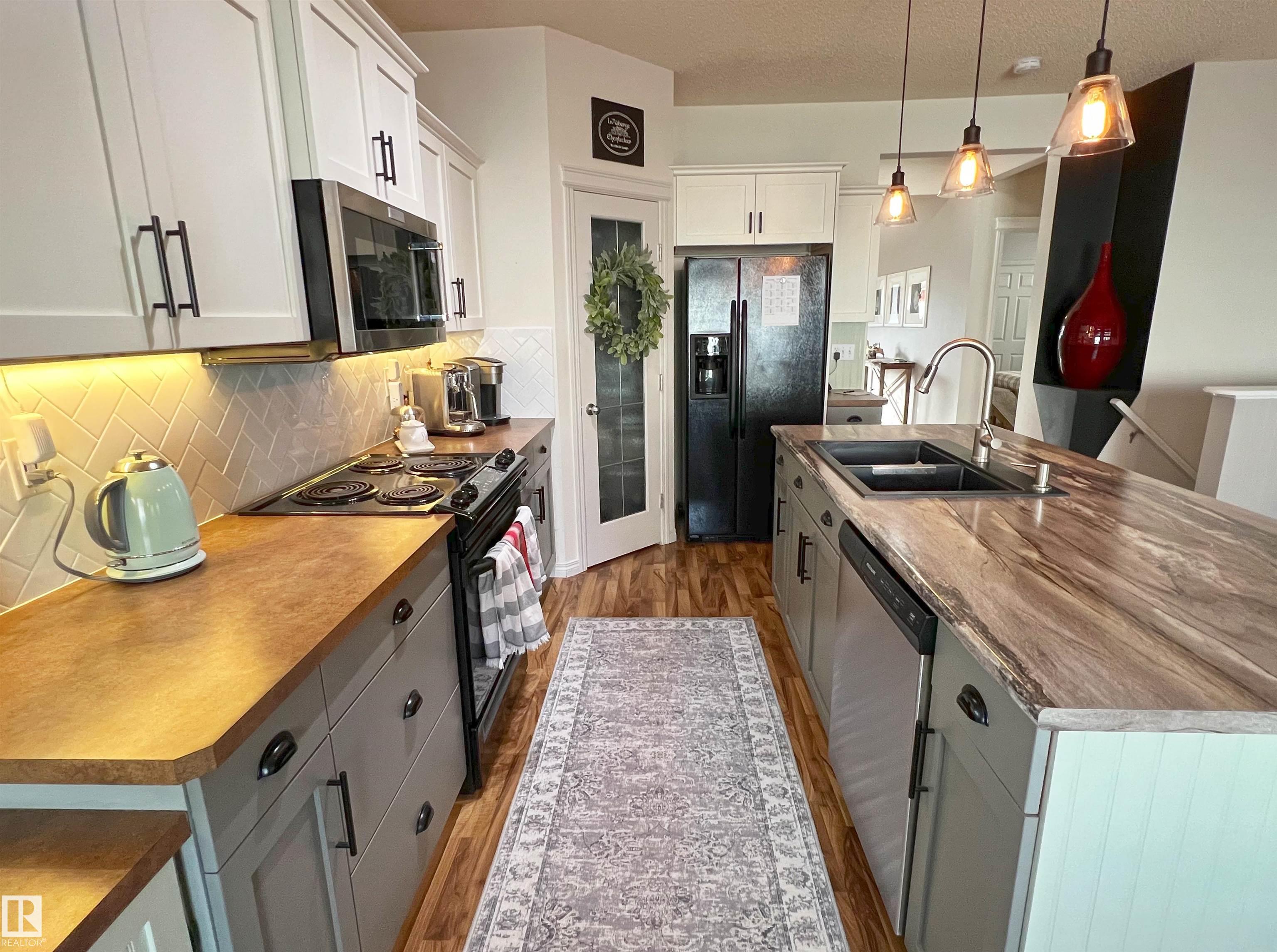 ORIGINAL OWNER executive bungalow with over 2,000 sq ft of living space on a CORNER LOT! This 1+2 bedroom, 2 bath home is AIR CONDITIONED. Step inside to a bright entryway and flex space with beautiful south-facing windows. The spacious primary bedroom offers a walk in closet and four-piece bath, while the MAIN FLOOR LAUNDRY is great for accessibility. The open-concept kitchen features an UPDATED ISLAND, expanded countertops, and pantry, flowing into a cozy living room with gas fireplace and a breakfast nook. Outside the backyard has a large deck and enough room to park your RV! Downstairs includes a family room, two additional bedrooms, storage, and a two-piece bath with future potential for a shower. A DOUBLE ATTACHED GARAGE completes the property. Pride of ownership shows with updates throughout the years including three-year-old shingles and a high-efficiency furnace. Easy access to 127 St and the Henday while still maintaining that friendly neighborhood feeling.