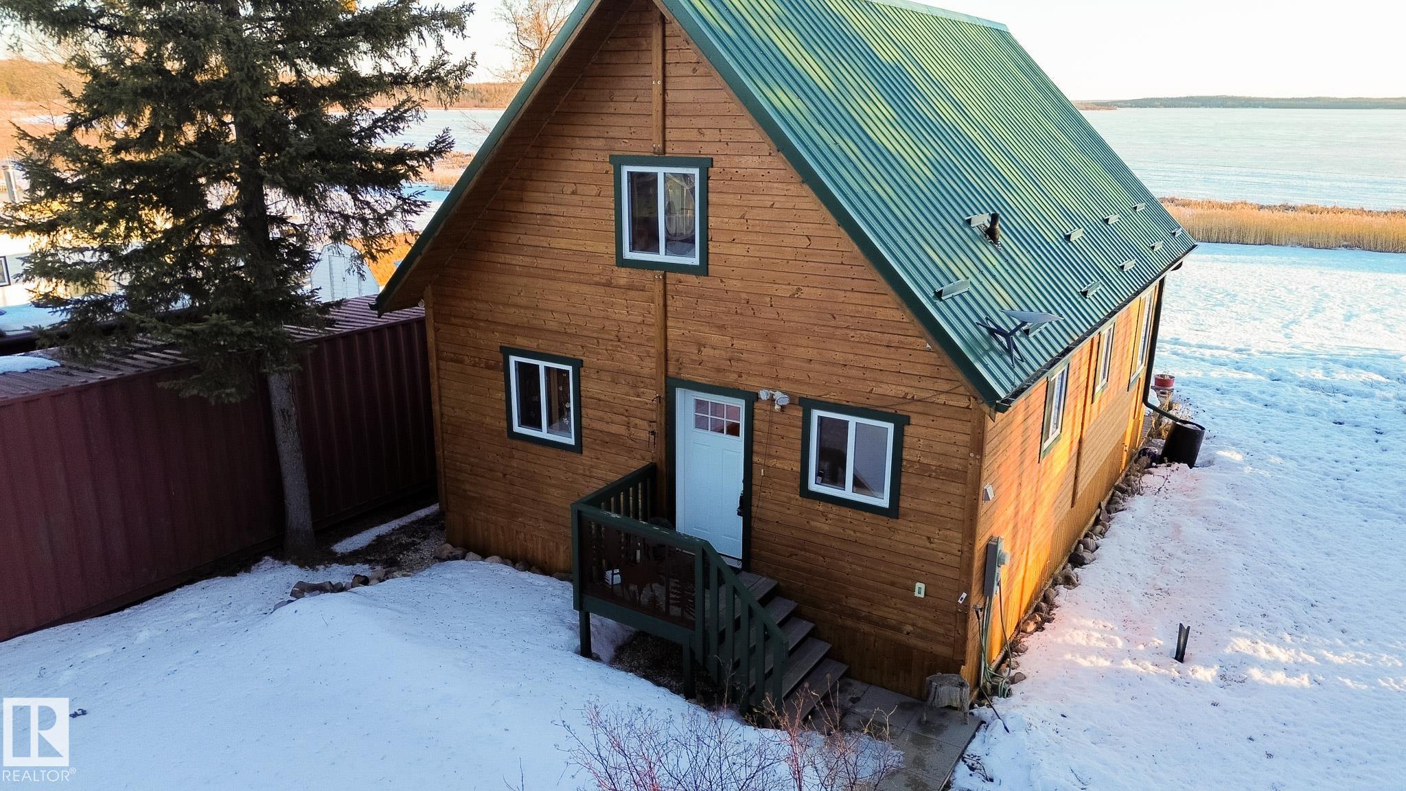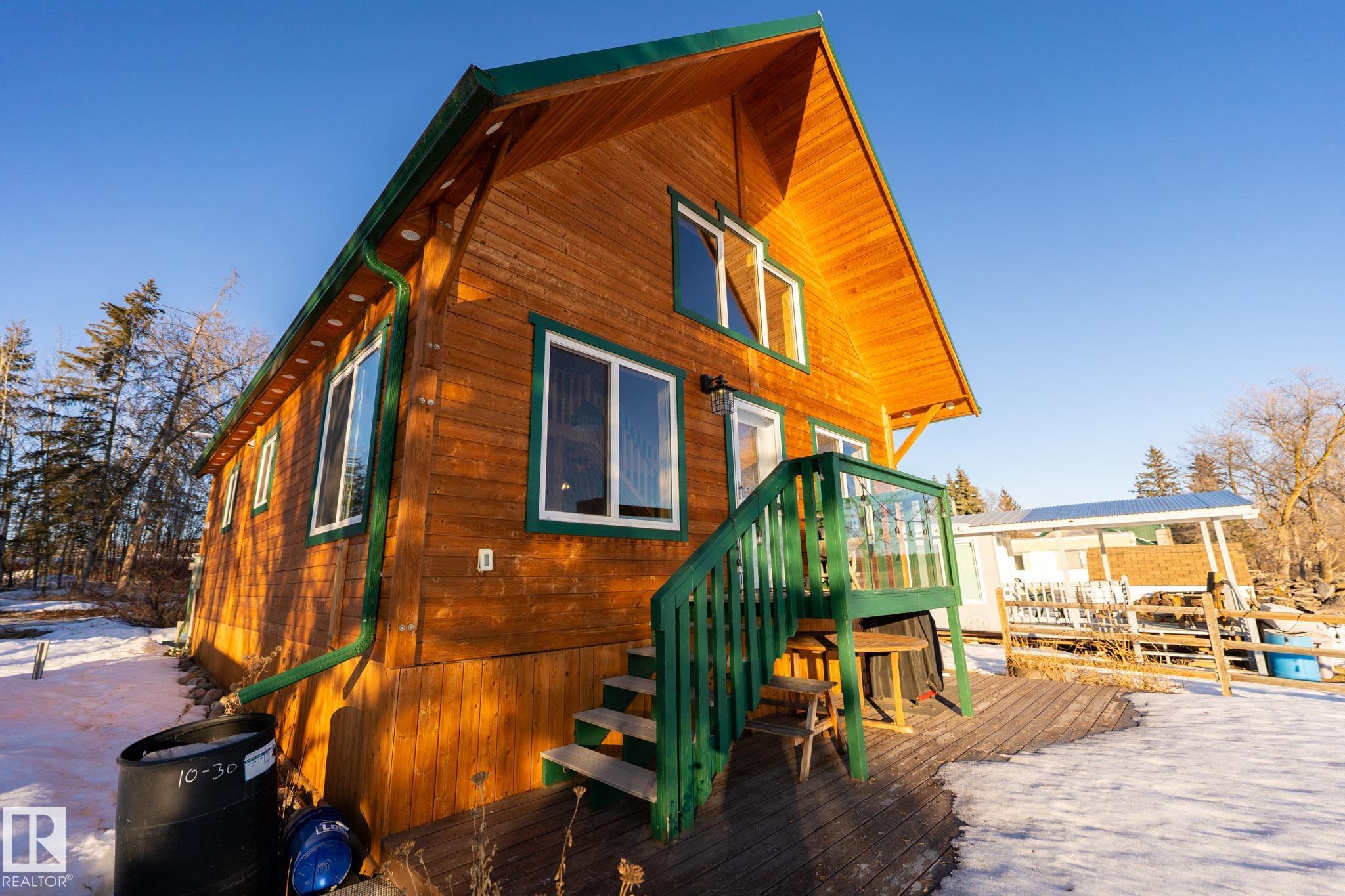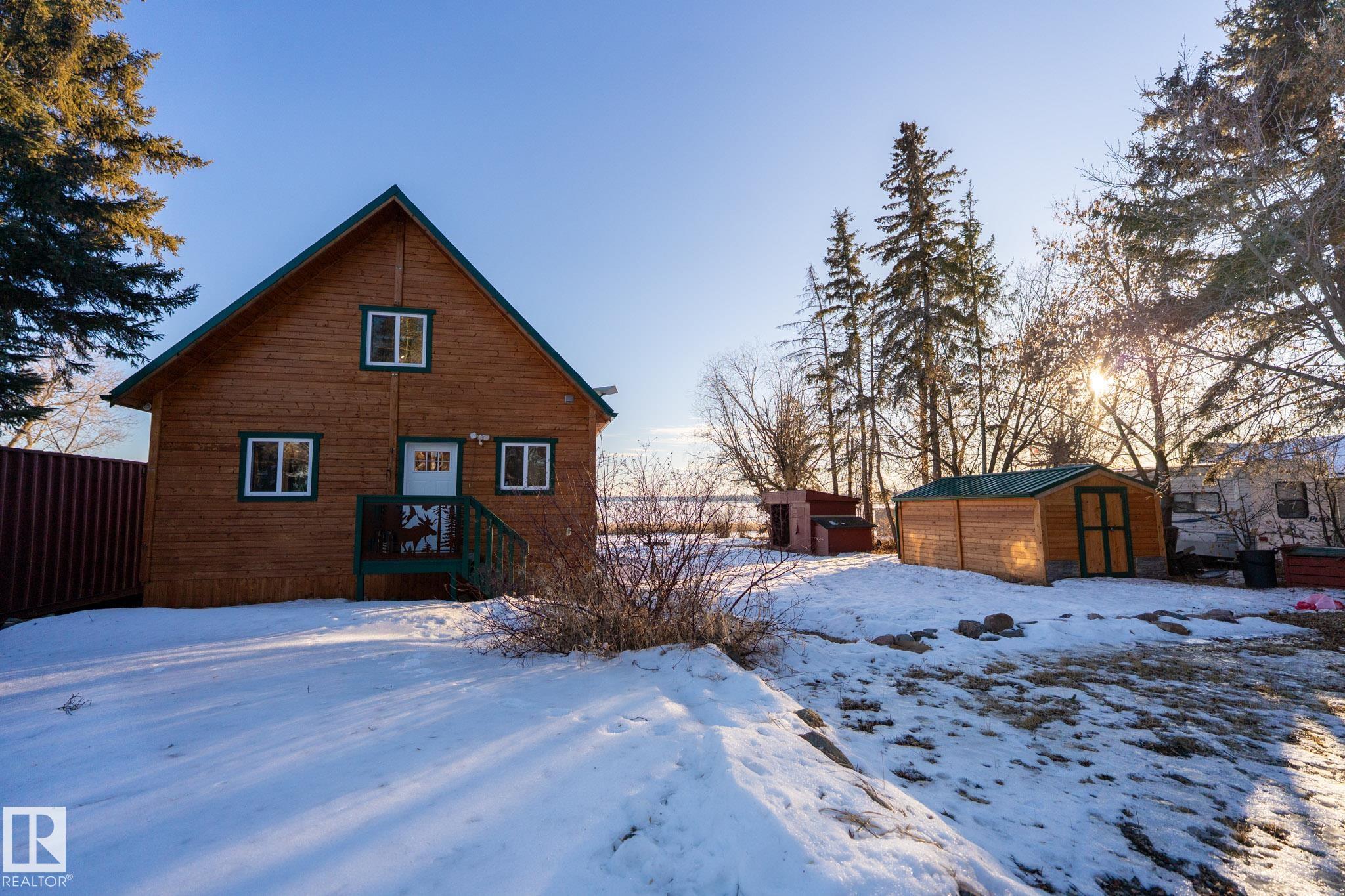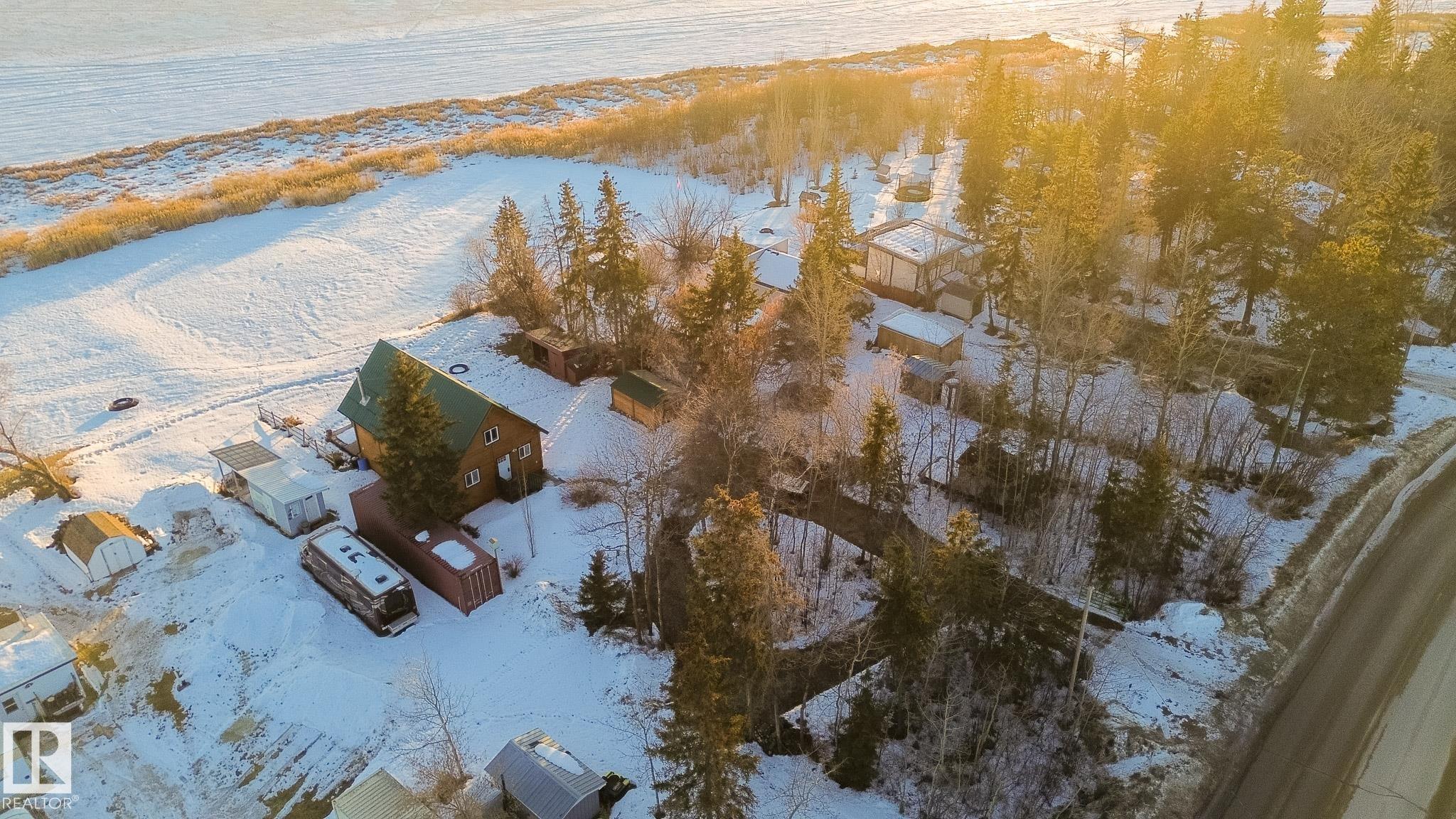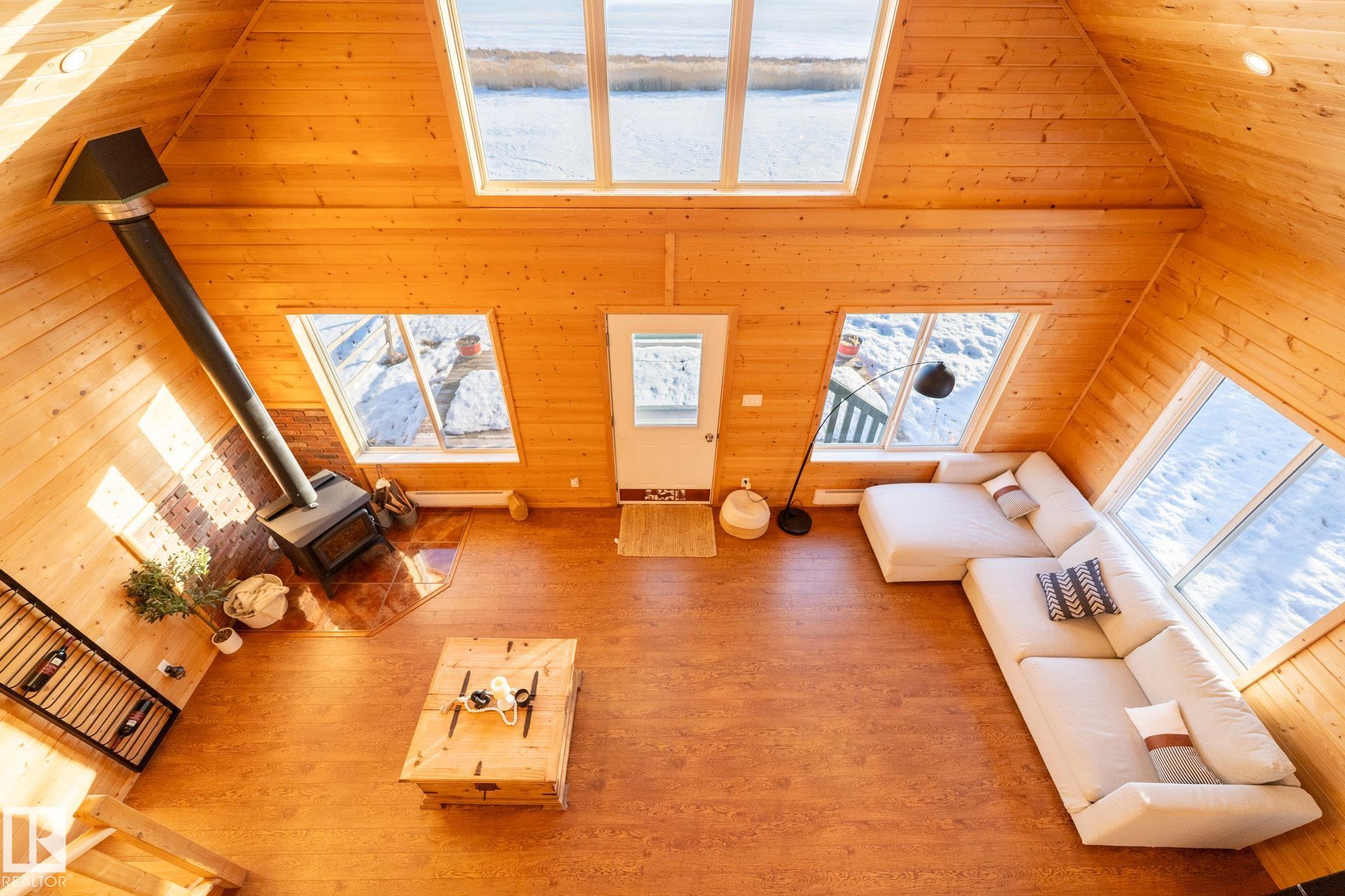 Neverending memories will be created here at this Lakefront home on Sandy Beach, locateded on the south shore of Lac Ste. Anne. This custom chalet-style home sits on 2 Lots and offers direct lake access. With stunning west-facing views, and a peaceful setting just steps from the water. Built in 2016, the home features an 18-foot vaulted ceiling with an open-concept kitchen, dining, and living area designed to capture natural light and lake views. The main floor includes a bedroom, 1.5 bathrooms, and quality wood finishes throughout. A loft overlooks the living space and provides additional sleeping or lounge area. Enjoy a wood-burning stove, expansive windows, and a south-facing lakeside deck ideal for relaxing or entertaining. The treed lot balances privacy with open space, complete with firepit area and room for gatherings. Fully serviced with power, heat cistern, and a holding tank. A rare opportunity to own a turnkey waterfront retreat ideal for year-round use, recreation, or quiet escape.