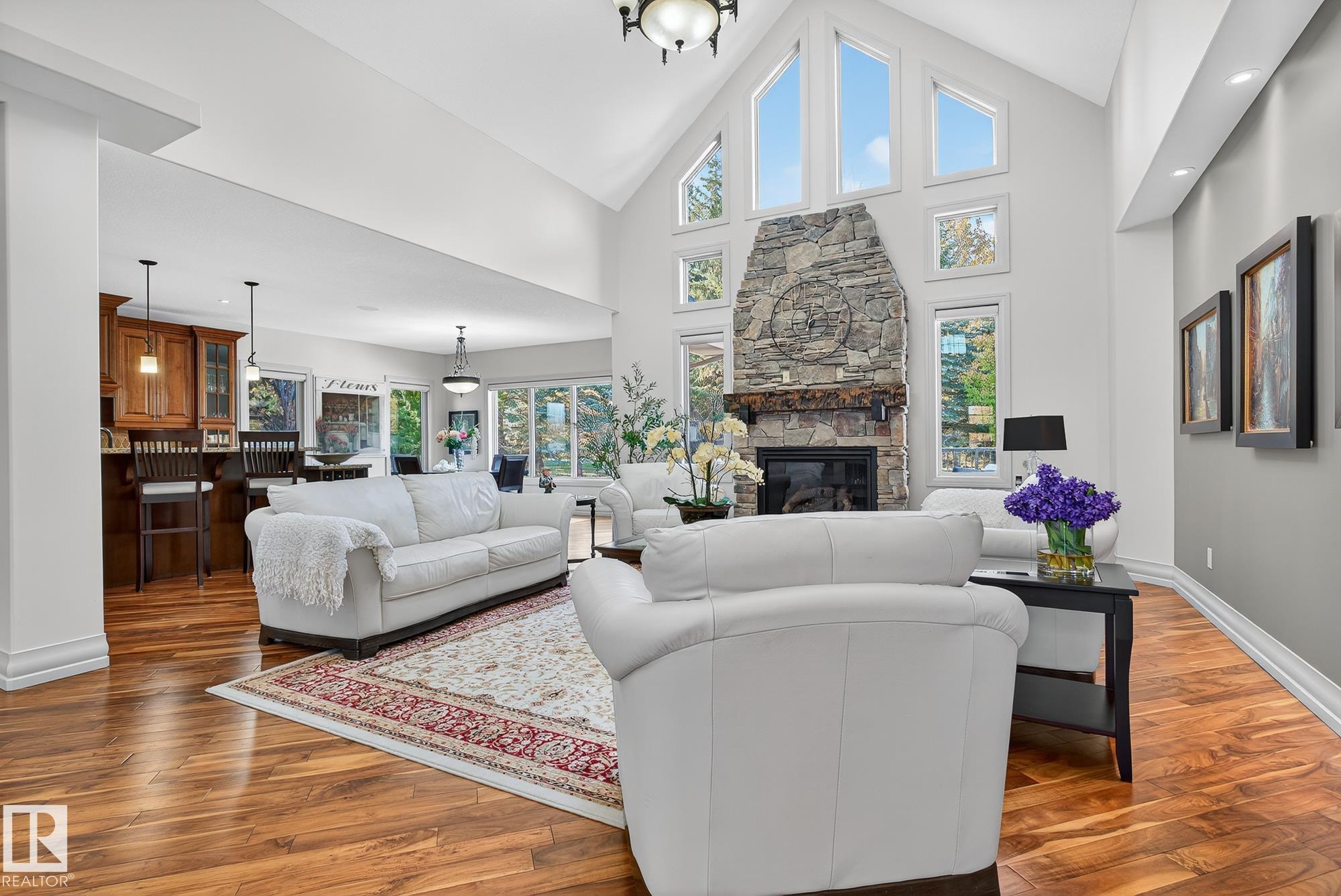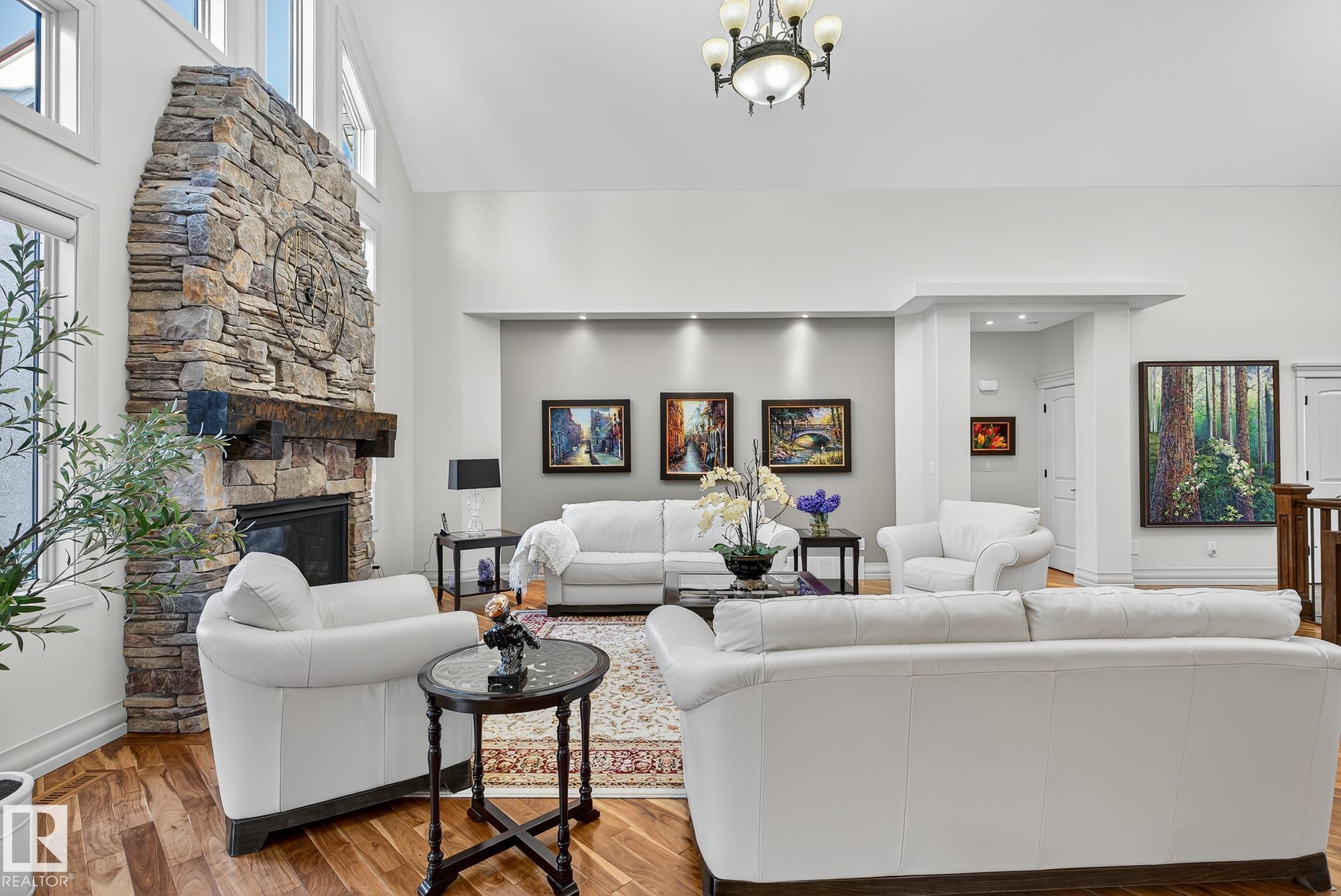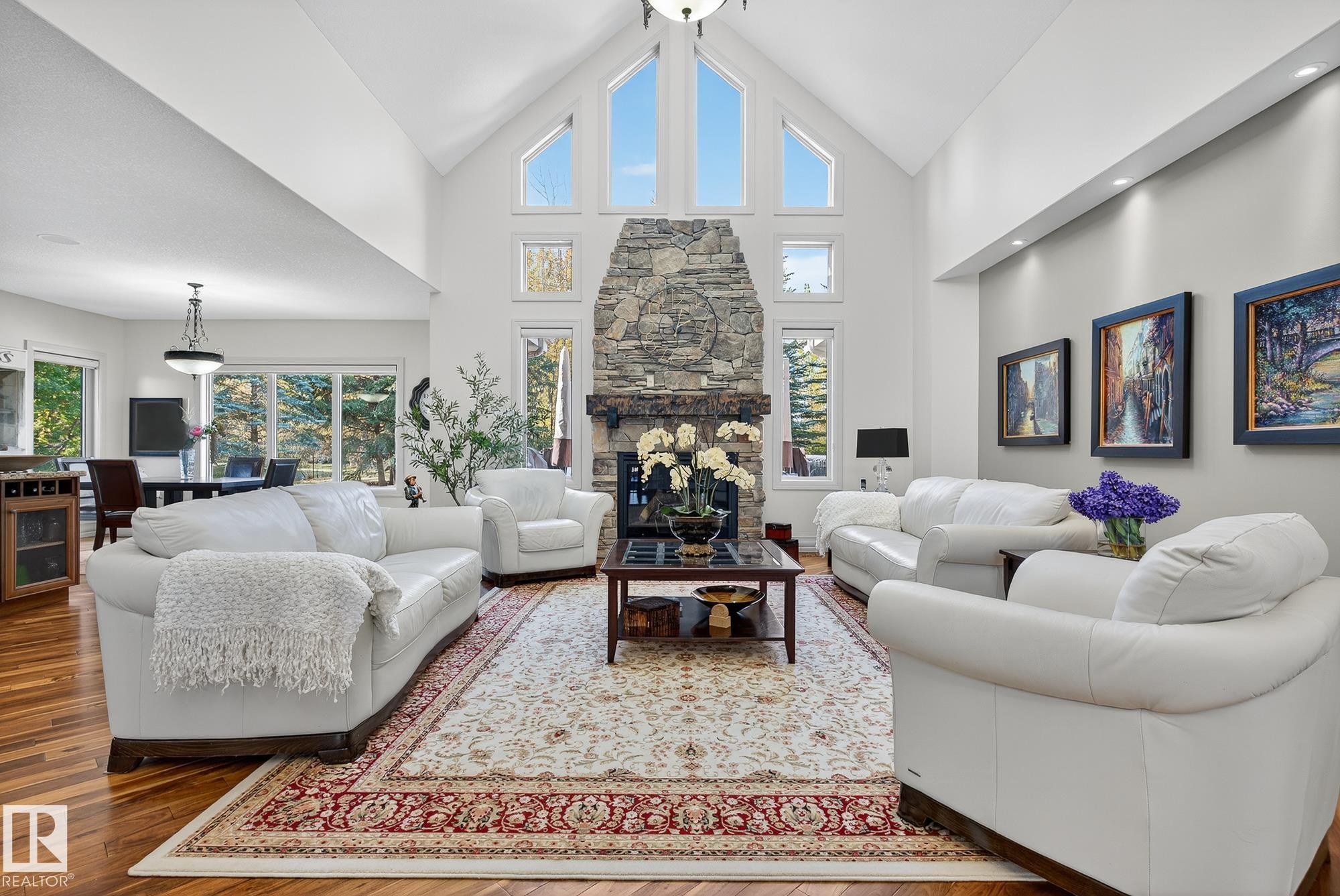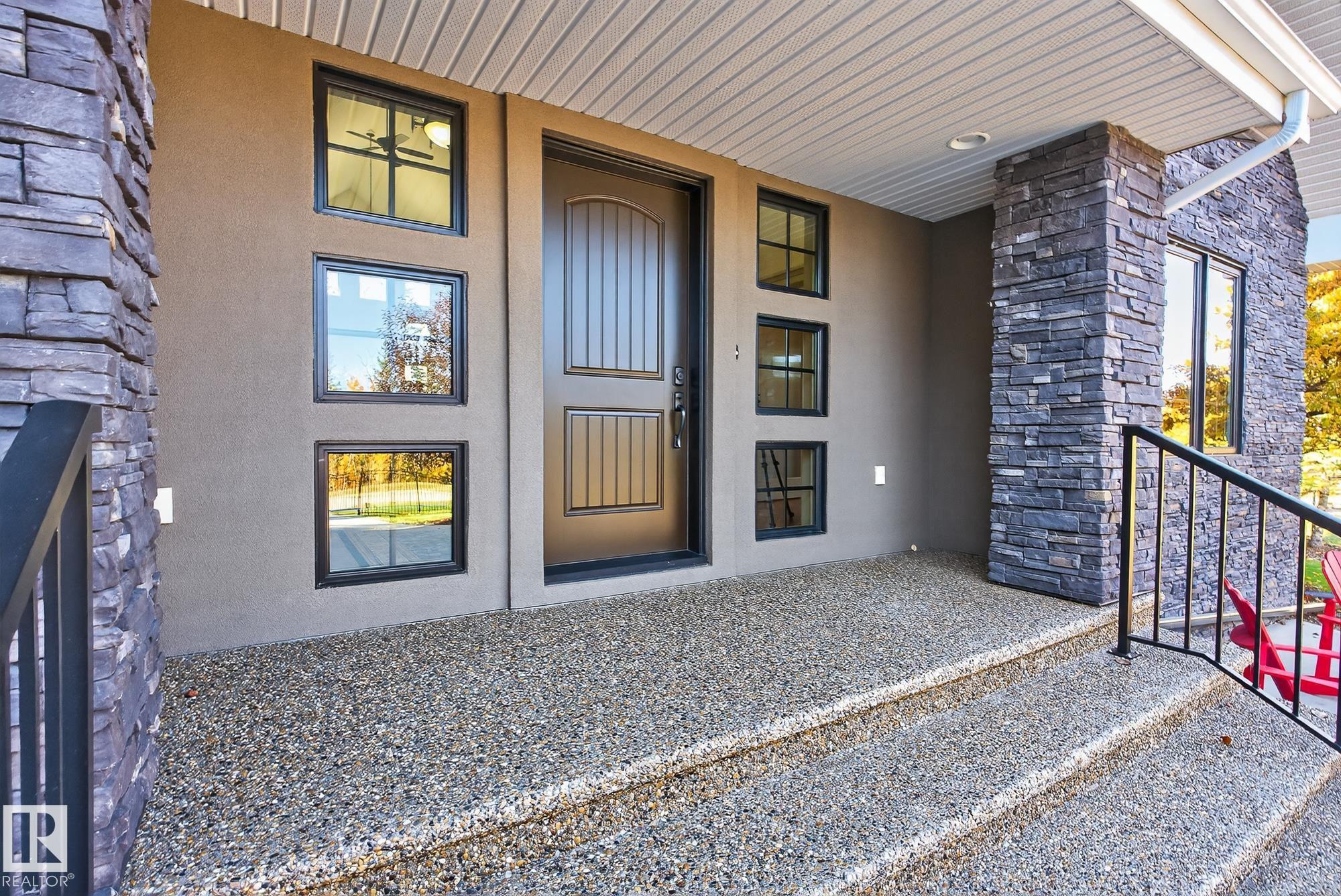 Exceptional custom-built bungalow in prestigious Atim Creek Springs, 20 mins west of Edmonton and 5 mins north of Spruce Grove features a fully landscaped, fenced yard with electric gate offering privacy among mature spruce trees, perennial beds, and underground irrigation. Over 4,600 sq ft of refined living space and oversized triple garage. This home impresses with a grand foyer, soaring 20' vaulted ceilings, and a striking barrel-vaulted ceiling. Formal dining room with coffered ceilings, a private office with French doors, and surround sound throughout. The chef's kitchen features a 6-burner gas stove, newer appliances, and breakfast nook opening to a west-facing deck with swim spa--ideal for entertaining. The primary suite offers a spa-inspired ensuite with steam shower and jetted tub. Fully finished basement includes 9' ceilings, in-floor heat, two colossal bedrooms, one with walk-in closet, a 4-piece bath, media room, gym, sitting room with stone fireplace, and generous storage. New paint and carpet