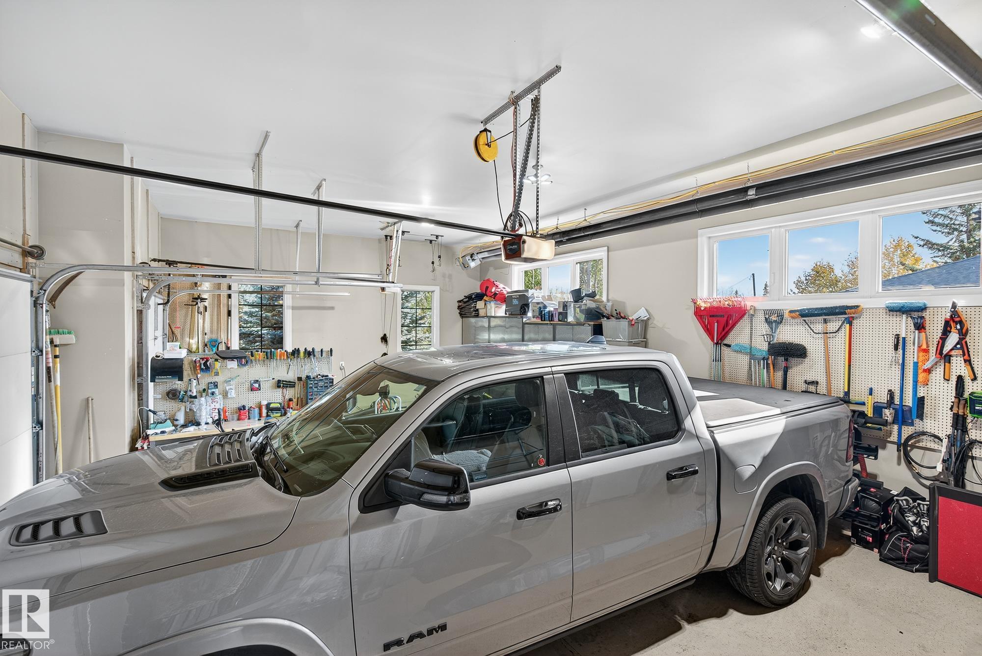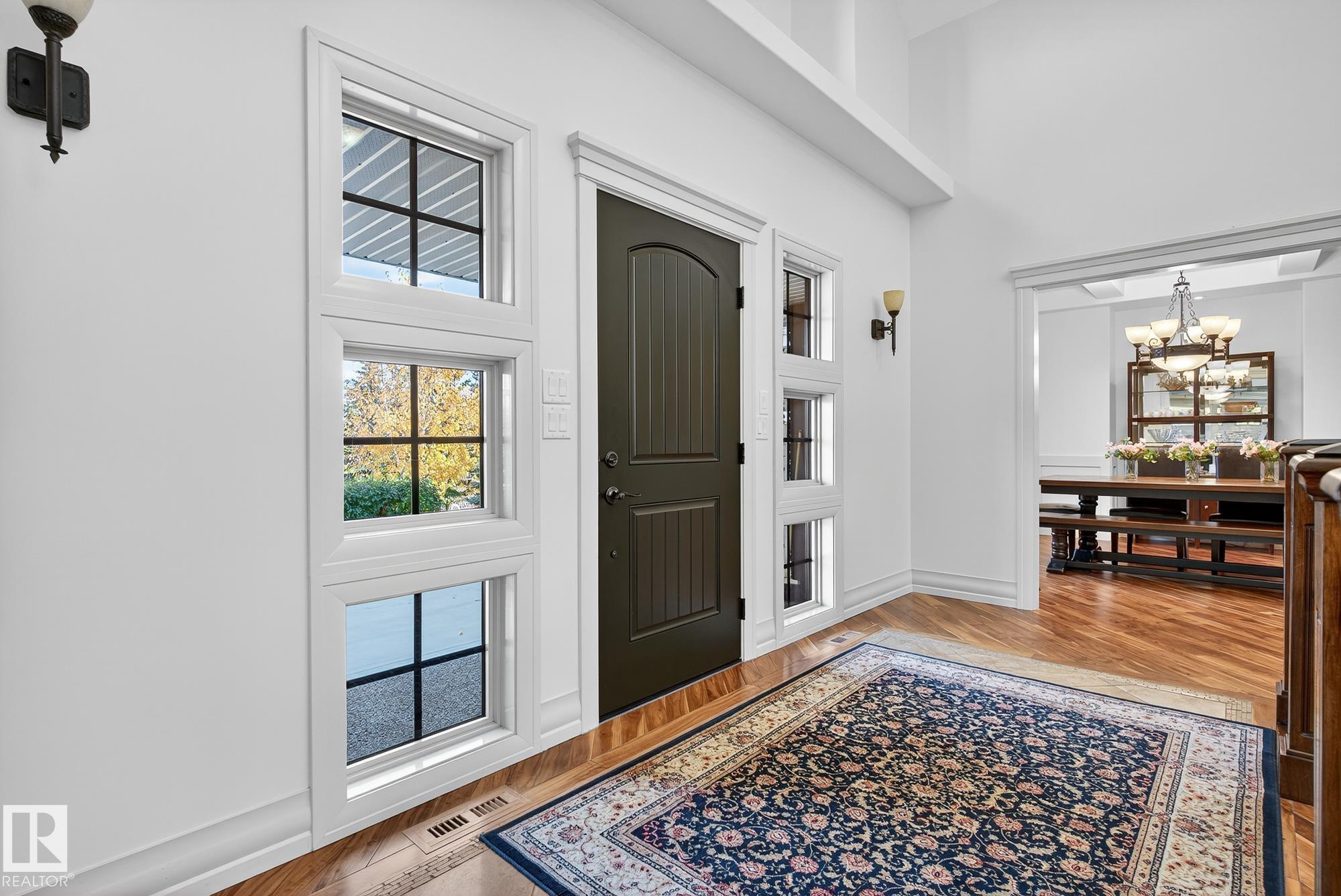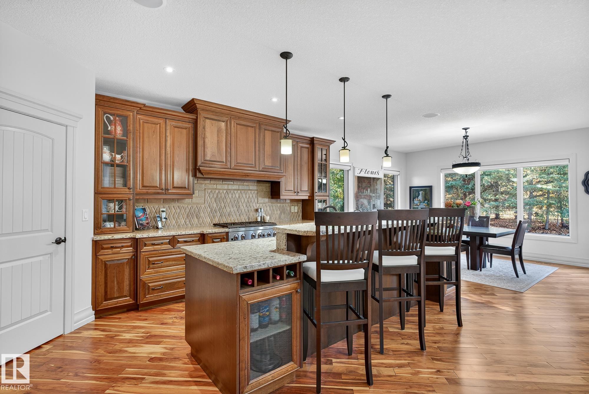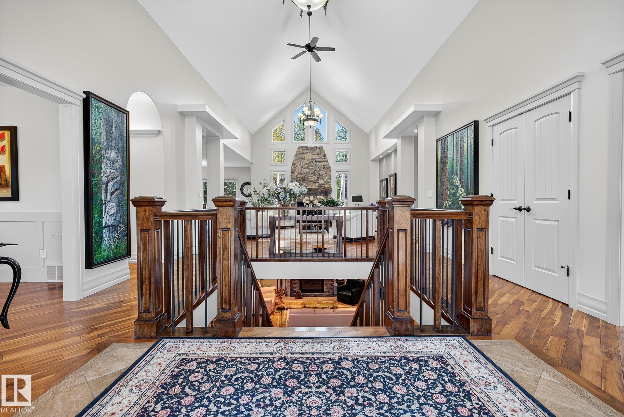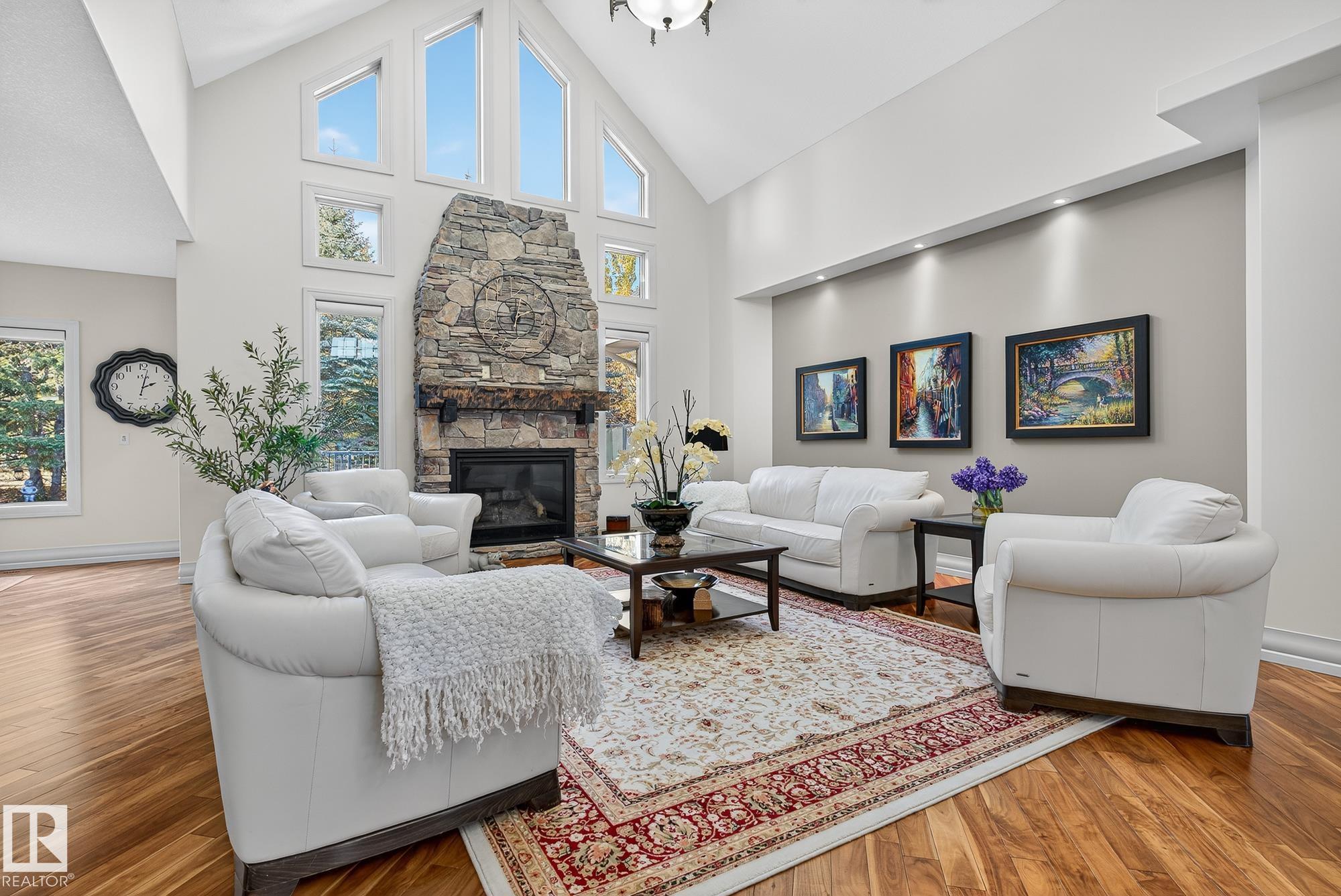 Exceptional custom-built bungalow in prestigious Atim Creek Springs, 20 mins west of Edmonton and 5 mins north of Spruce Grove features a fully landscaped, fenced yard with electric gate offering privacy among mature spruce trees, perennial beds, and underground irrigation. Over 4,600 sq ft of refined living space and oversized triple garage. This home impresses with a grand foyer, soaring 20' vaulted ceilings, and a striking barrel-vaulted ceiling. Formal dining room with coffered ceilings, a private office with French doors, and surround sound throughout. The chef's kitchen features a 6-burner gas stove, newer appliances, and breakfast nook opening to a west-facing deck with swim spa--ideal for entertaining. The primary suite offers a spa-inspired ensuite with steam shower and jetted tub. Fully finished basement includes 9' ceilings, in-floor heat, two colossal bedrooms, one with walk-in closet, a 4-piece bath, media room, gym, sitting room with stone fireplace, and generous storage. New paint and carpet