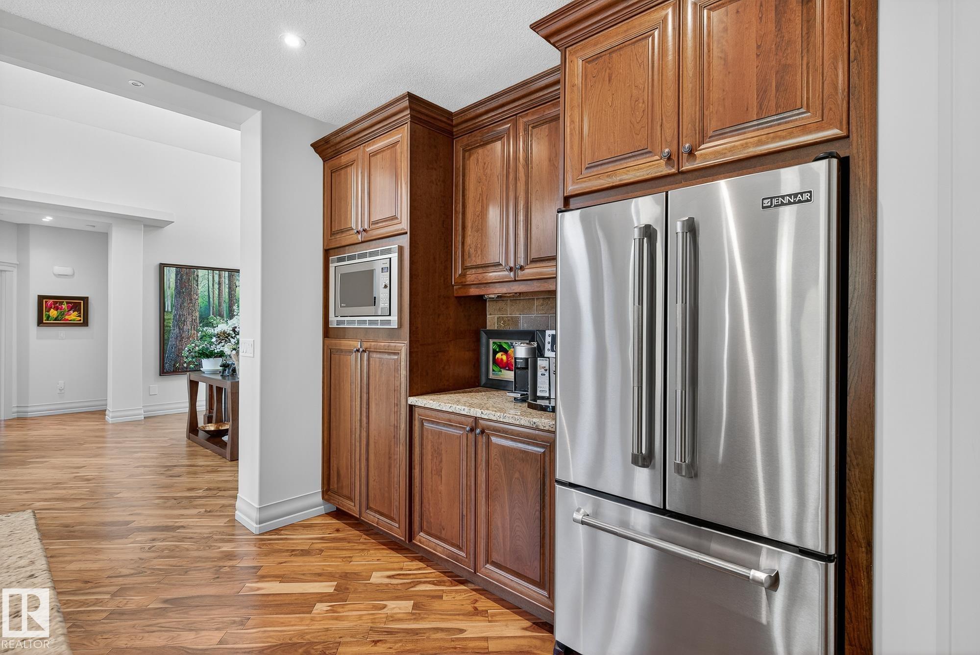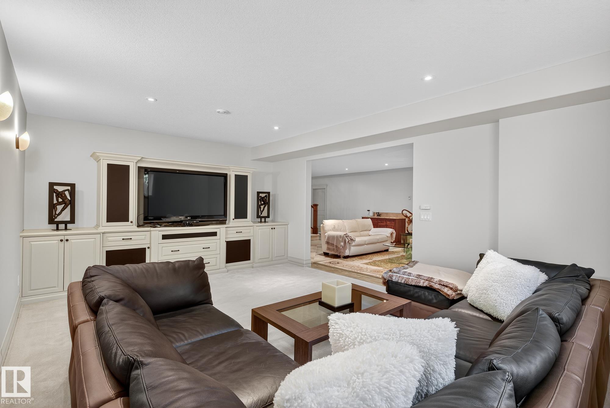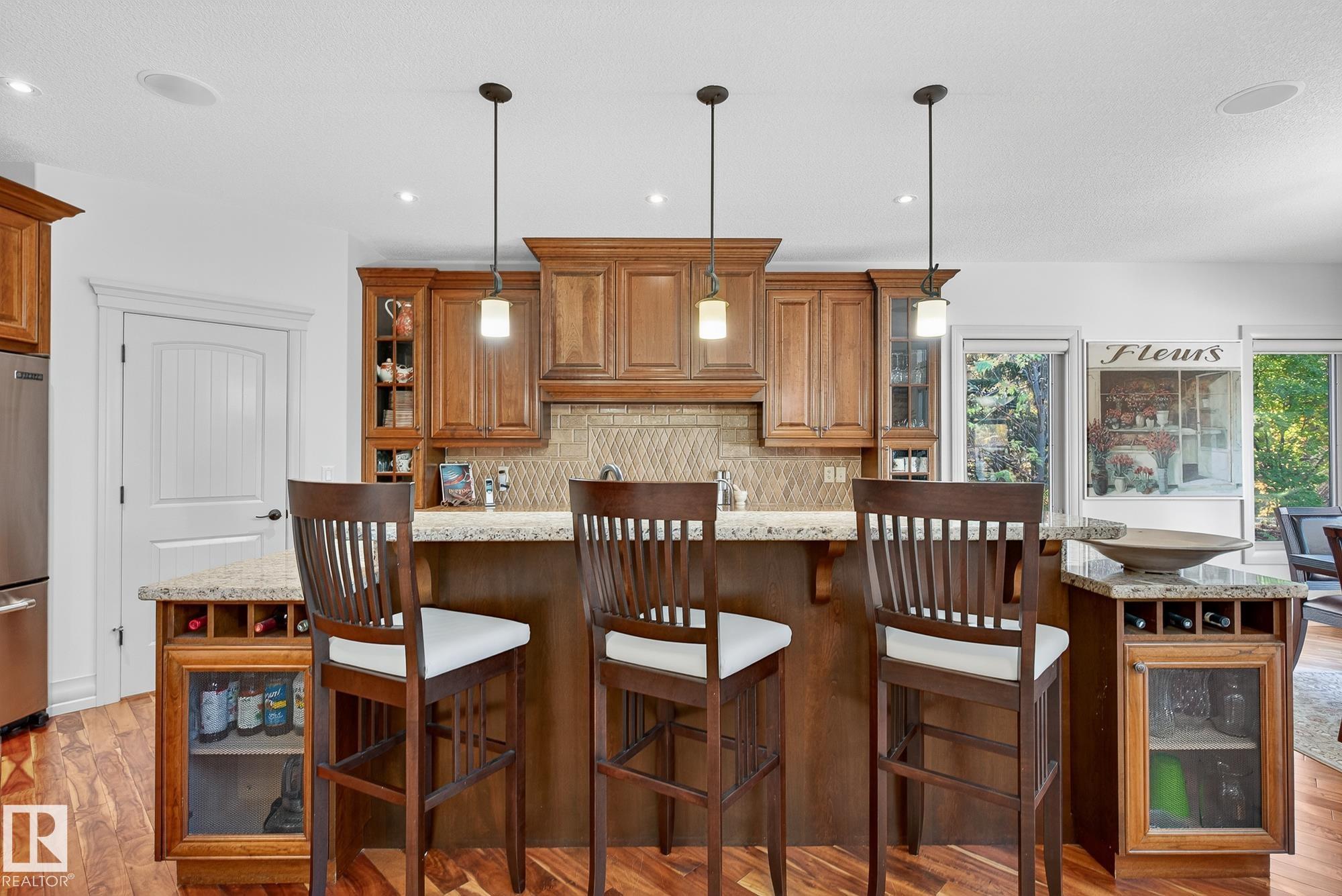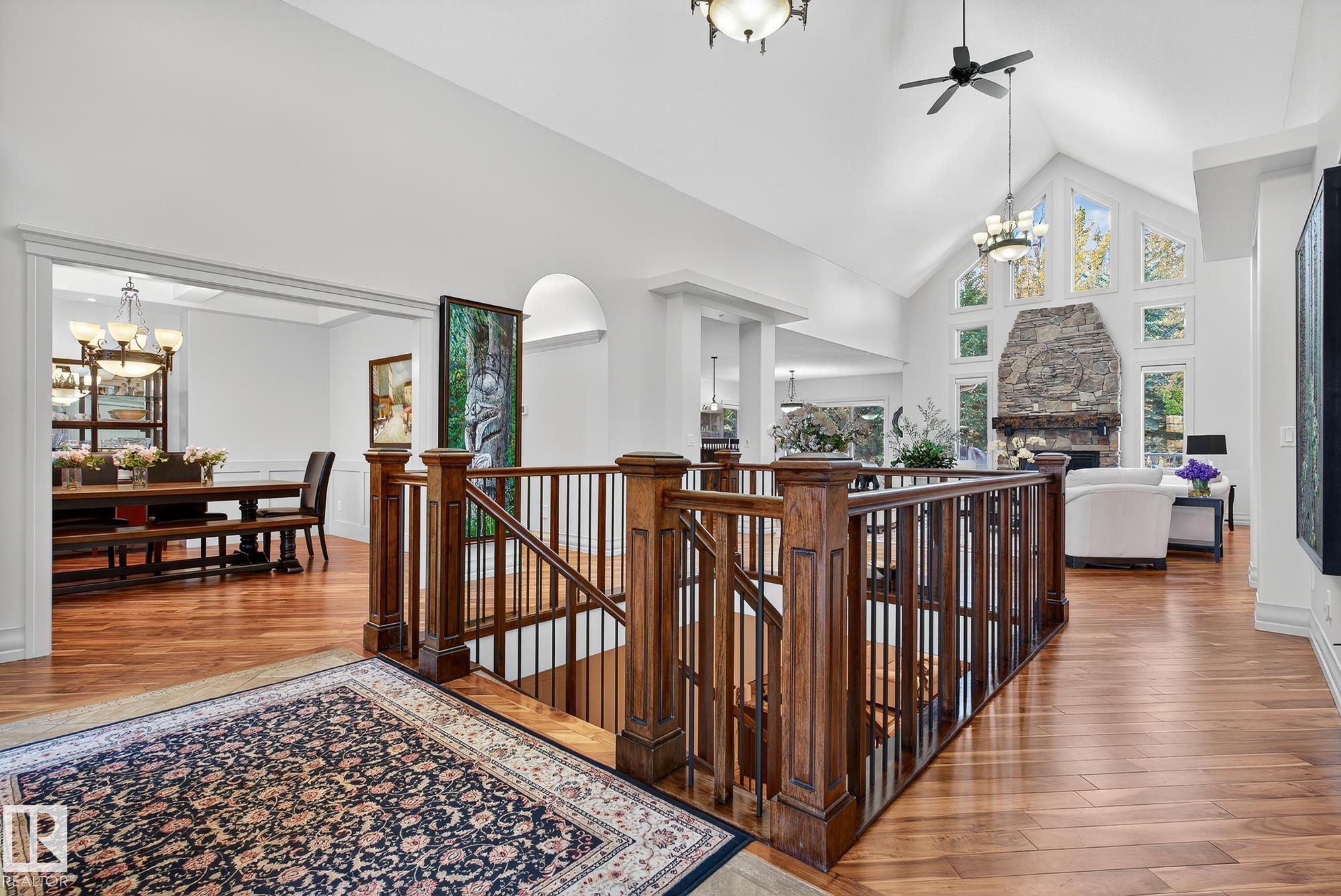 Exceptional custom-built bungalow in prestigious Atim Creek Springs, 20 mins west of Edmonton and 5 mins north of Spruce Grove features a fully landscaped, fenced yard with electric gate offering privacy among mature spruce trees, perennial beds, and underground irrigation. Over 4,600 sq ft of refined living space and oversized triple garage. This home impresses with a grand foyer, soaring 20' vaulted ceilings, and a striking barrel-vaulted ceiling. Formal dining room with coffered ceilings, a private office with French doors, and surround sound throughout. The chef's kitchen features a 6-burner gas stove, newer appliances, and breakfast nook opening to a west-facing deck with swim spa--ideal for entertaining. The primary suite offers a spa-inspired ensuite with steam shower and jetted tub. Fully finished basement includes 9' ceilings, in-floor heat, two colossal bedrooms, one with walk-in closet, a 4-piece bath, media room, gym, sitting room with stone fireplace, and generous storage. New paint and carpet