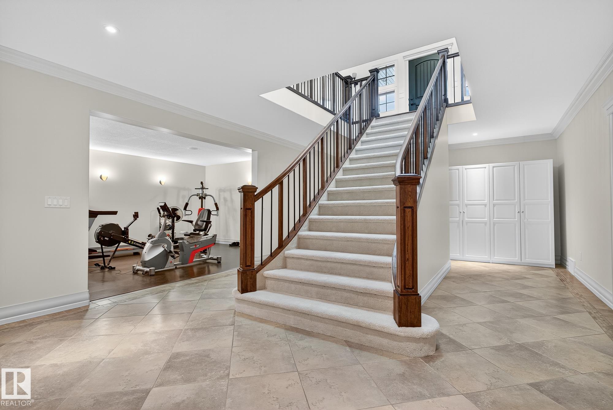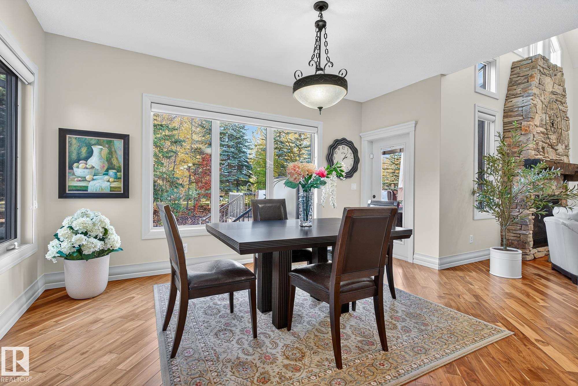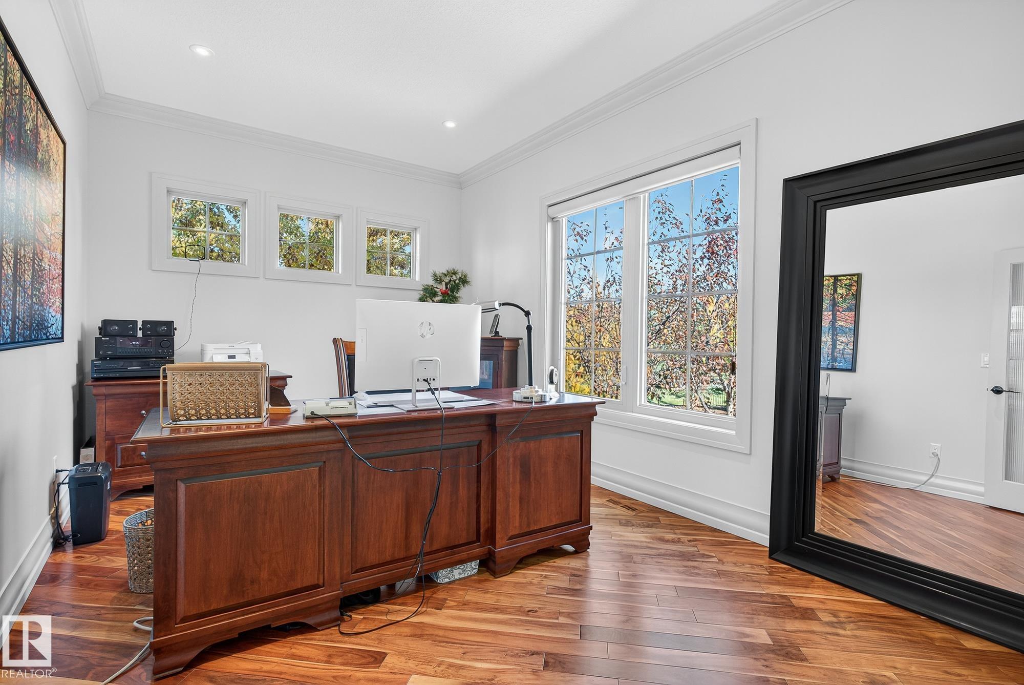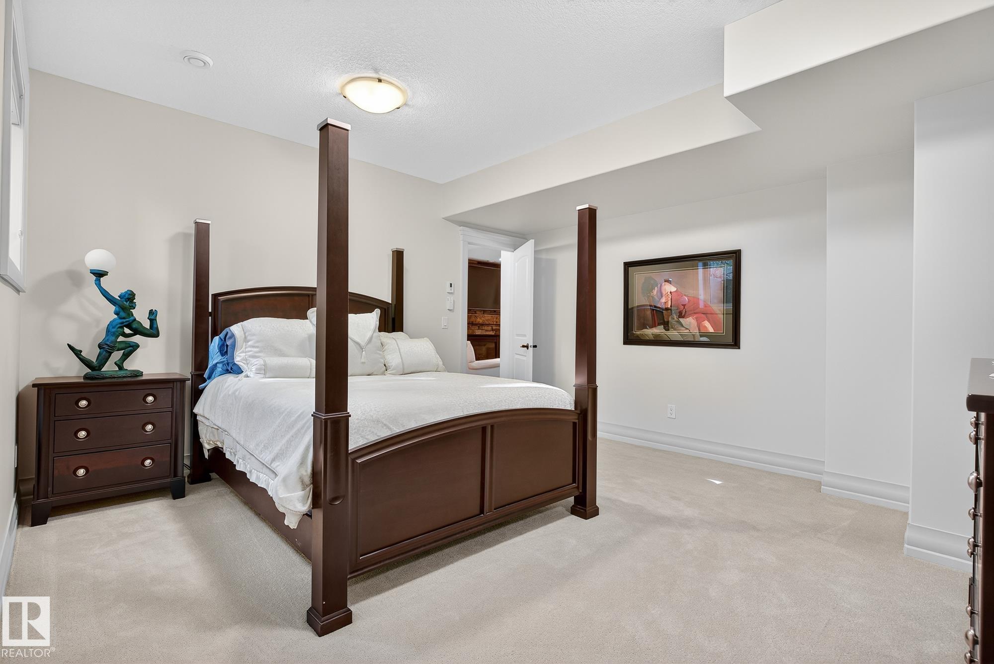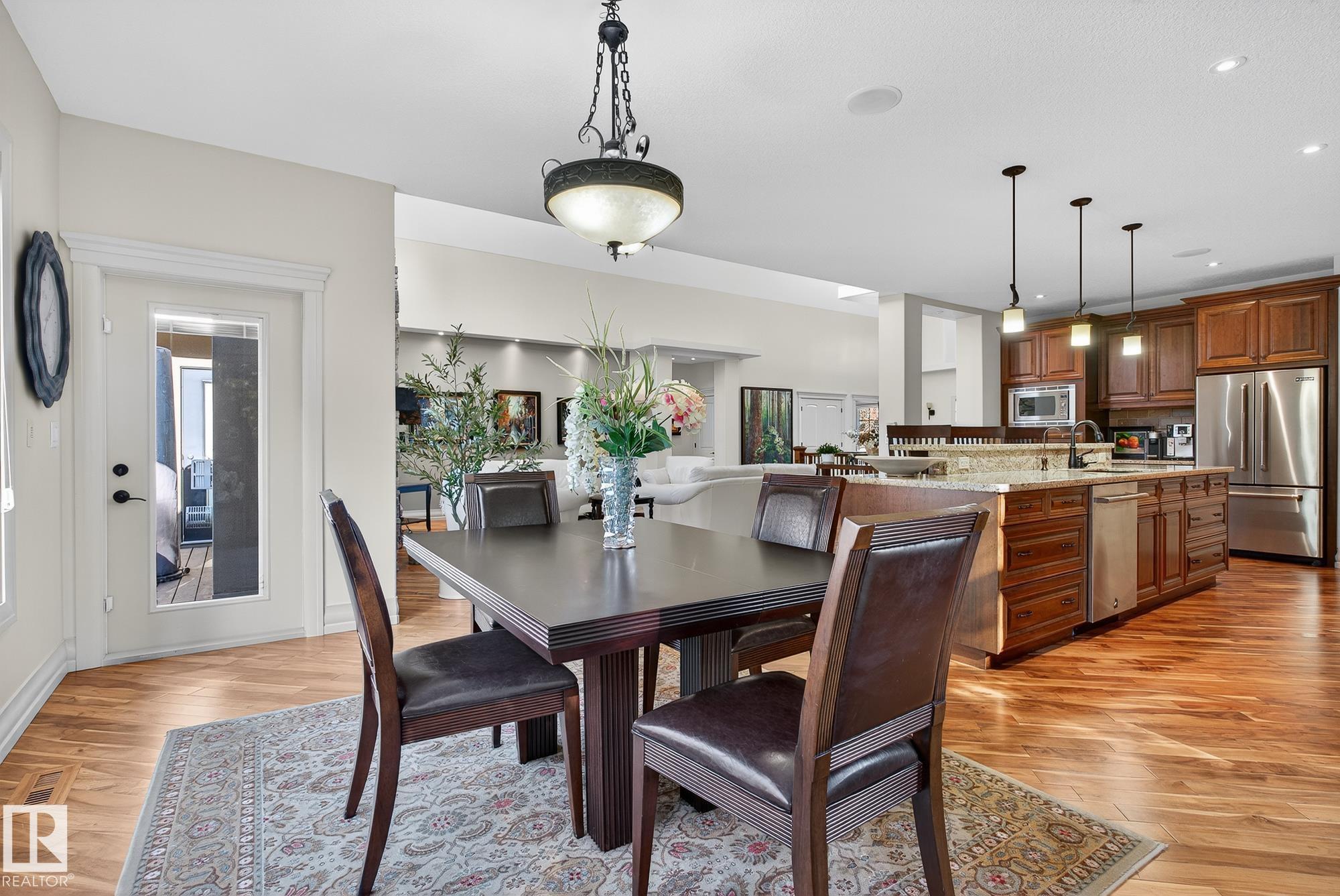 Exceptional custom-built bungalow in prestigious Atim Creek Springs, 20 mins west of Edmonton and 5 mins north of Spruce Grove features a fully landscaped, fenced yard with electric gate offering privacy among mature spruce trees, perennial beds, and underground irrigation. Over 4,600 sq ft of refined living space and oversized triple garage. This home impresses with a grand foyer, soaring 20' vaulted ceilings, and a striking barrel-vaulted ceiling. Formal dining room with coffered ceilings, a private office with French doors, and surround sound throughout. The chef's kitchen features a 6-burner gas stove, newer appliances, and breakfast nook opening to a west-facing deck with swim spa--ideal for entertaining. The primary suite offers a spa-inspired ensuite with steam shower and jetted tub. Fully finished basement includes 9' ceilings, in-floor heat, two colossal bedrooms, one with walk-in closet, a 4-piece bath, media room, gym, sitting room with stone fireplace, and generous storage. New paint and carpet