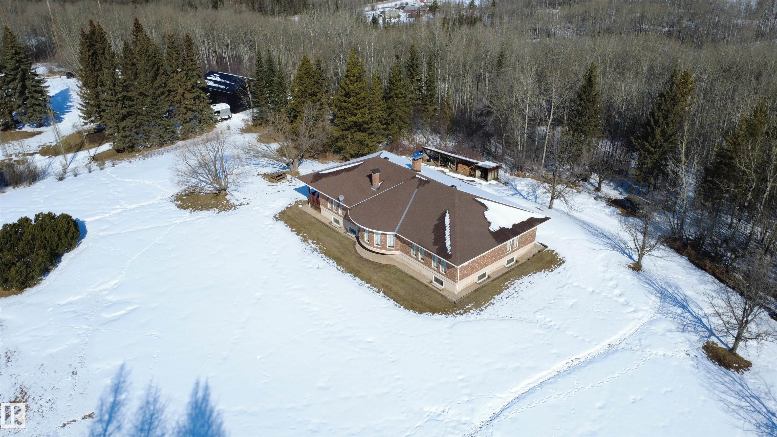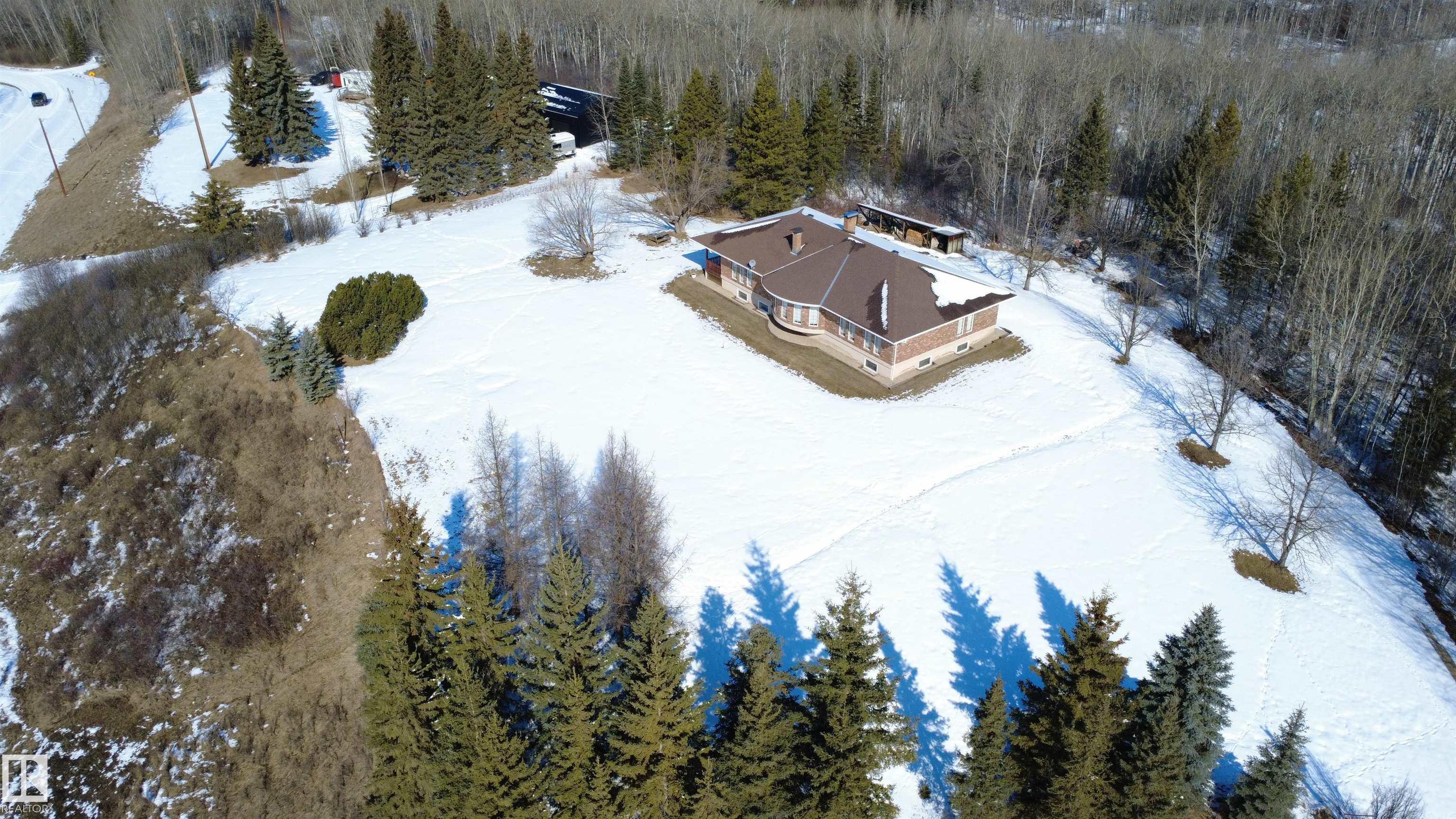 Discover the perfect blend of space, privacy, and convenience with this expansive countryside bungalow set on 3.08 beautifully acres in Chateau Heights. Surrounded by a natural perimeter of mature trees, this private retreat offers breathtaking sunrises, sunsets, and all-day sunshine--allowing you to fully enjoy all four seasons in a peaceful, welcoming setting. Located just 4 minutes to the Yellowhead and 15 minutes to Stony Plain, you'll love the accessibility, with fully paved roads right to the subdivision. The home features 2,609 sq ft of finished space on the main floor, plus 1,704 sq ft in the partly finished basement. Inside offers 3 bedrooms up and 1 down, a formal dining room, and a bright, open layout with large windows that flood the home with natural light. The spacious living room boasts hardwood floors on the main floor and a cozy wood-burning fireplace, while in-floor heating adds year-round comfort. Ample storage throughout completes this exceptional property.