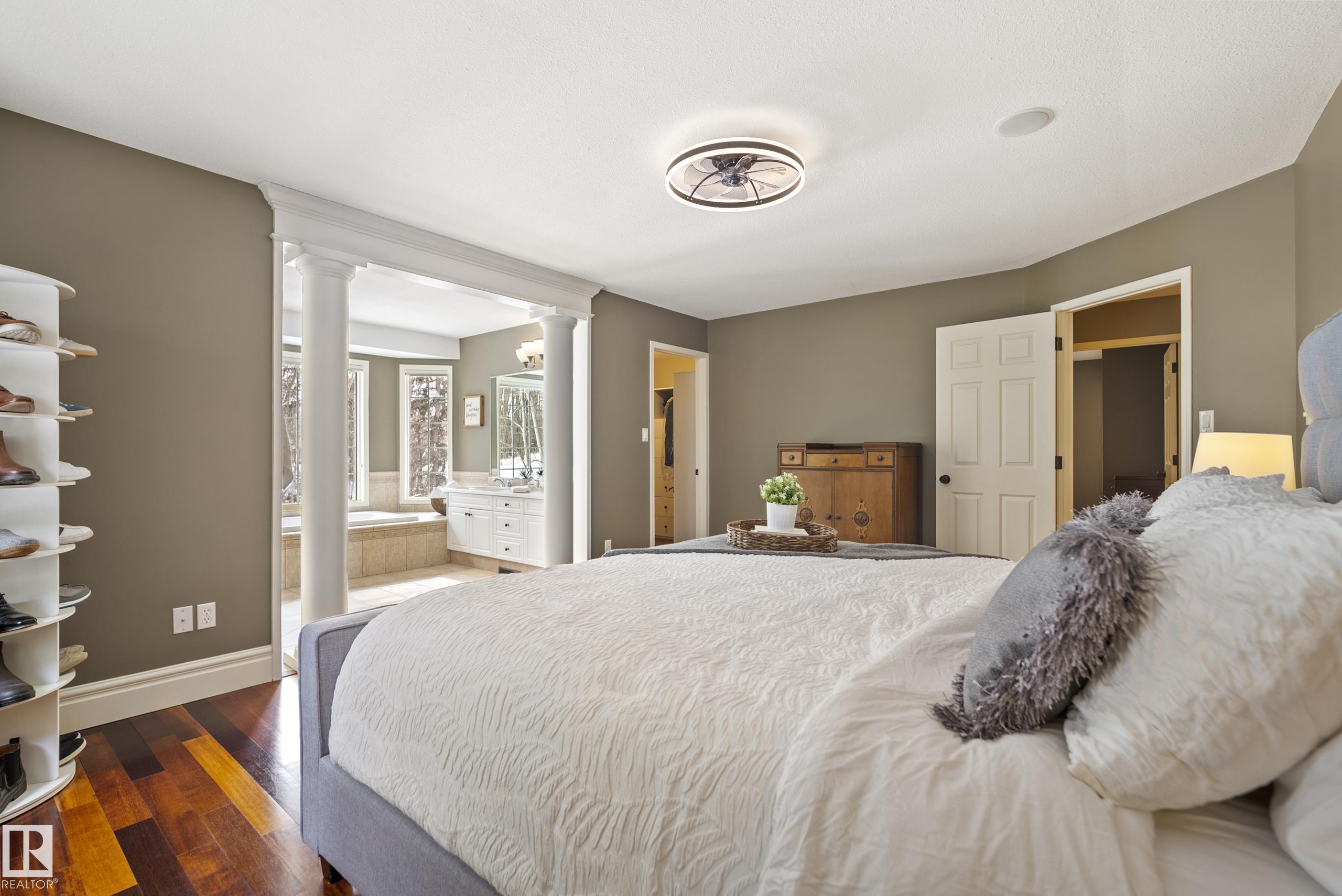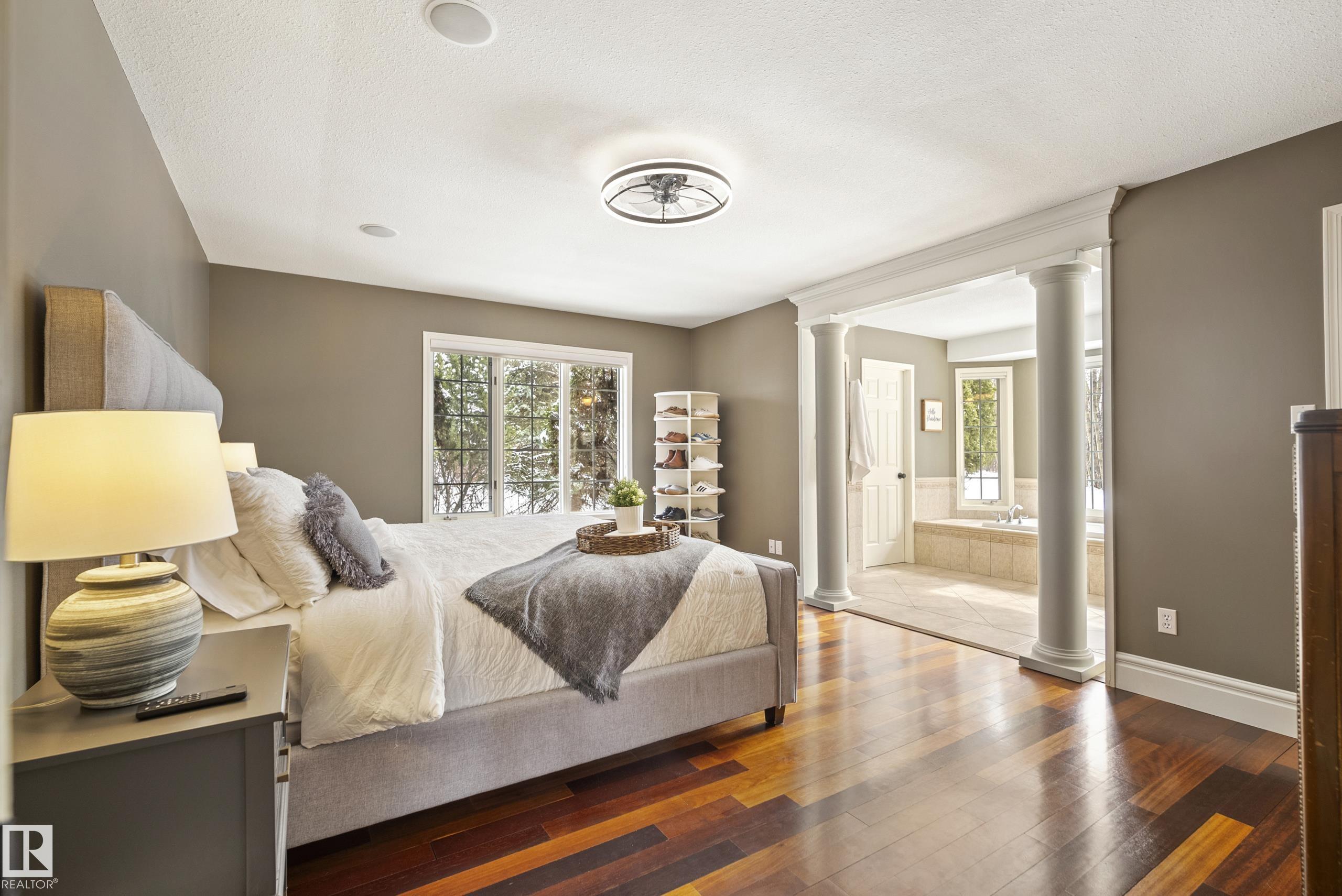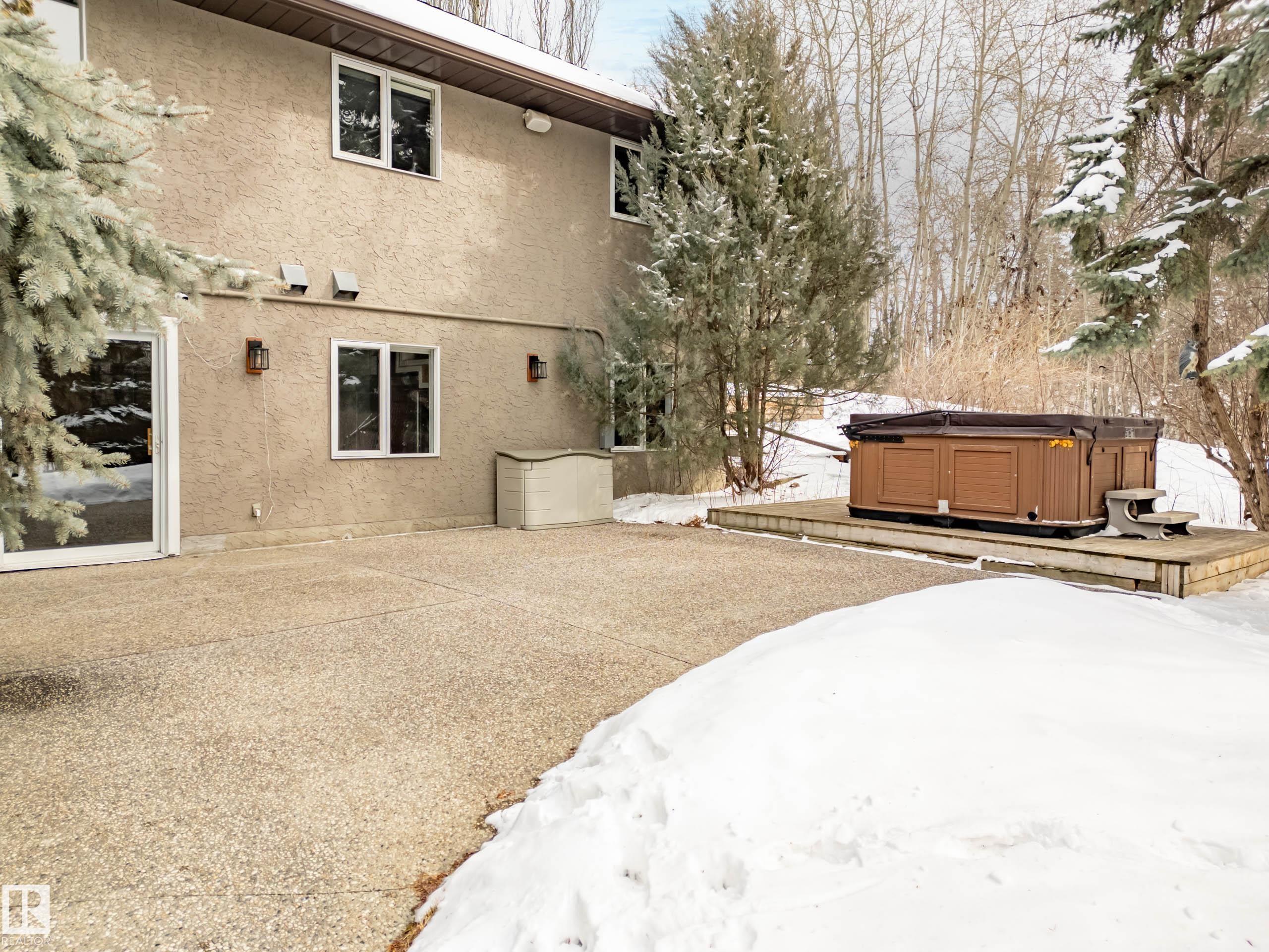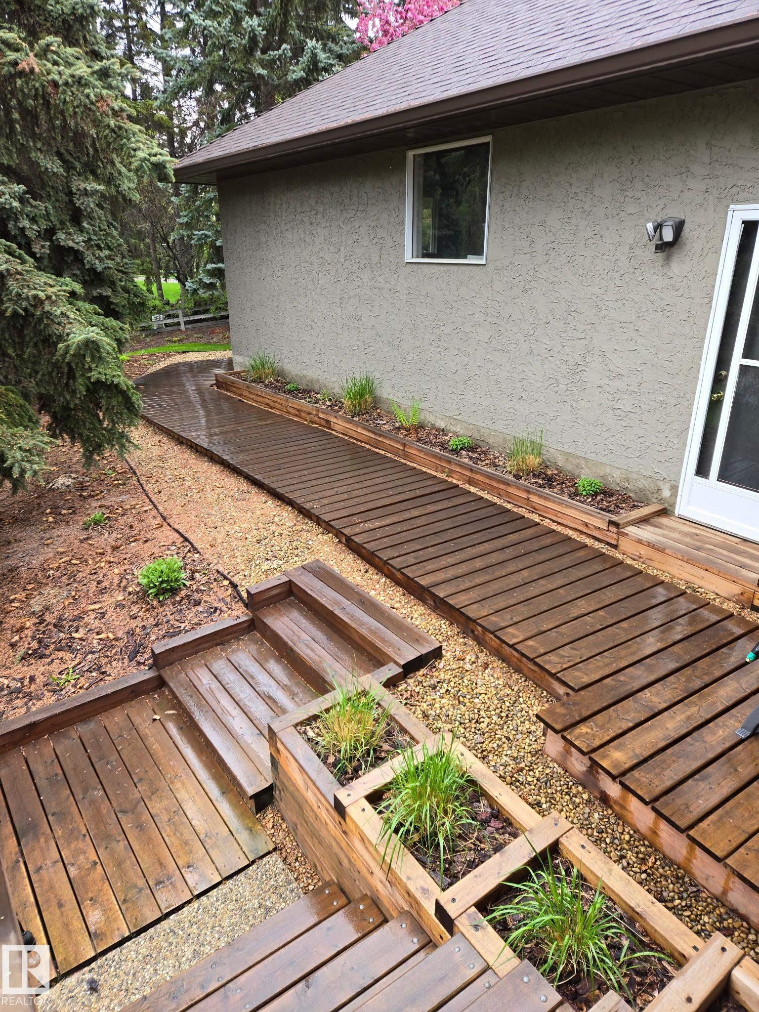 Acreage Living just 2 mins to the City of Edmonton! Fully treed & private 1.5 acre lot, this stunning 2400+ sq.ft WALKOUT bungalow offers the perfect blend of space, privacy & convenience. Pride of ownership shines! This 5 bed 5 bath home. Main floor features an open concept layout w/ a spacious living area, vaulted ceilings, chef inspired kitchen w/ large island, plus a cozy family room w/ fireplace. The primary retreat offers a luxurious 5 pc ensuite & walk-in closet. Walkout basement is flooded w/ natural light w/ a massive rec space, wet bar, fireplace, gym & games area, 2 additional bedrooms & 2 full baths. Enjoy the outdoors & privacy from the wrap around decks overlooking the beautifully treed lot, exposed aggregate patio & hot tub. Heated triple garage 35x23 w/ plenty of space for vehicles & toys, plus ample room for RV parking &/or shop, plus large 14x20 powered shed. Upgrades include furnaces, AC, shingles, oversized eaves, downspouts complete with gutter guard & much more. RARE OPPORTUNITY! 10+
