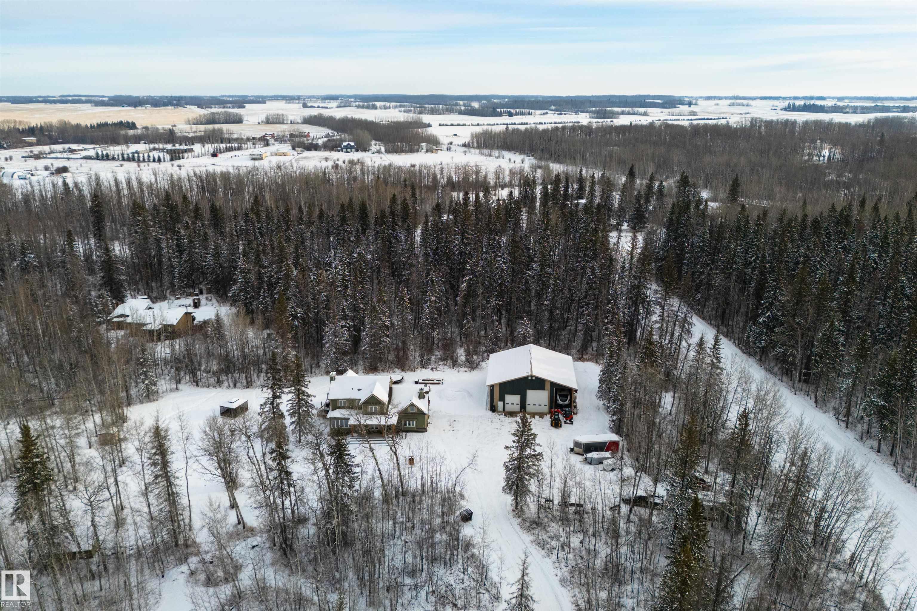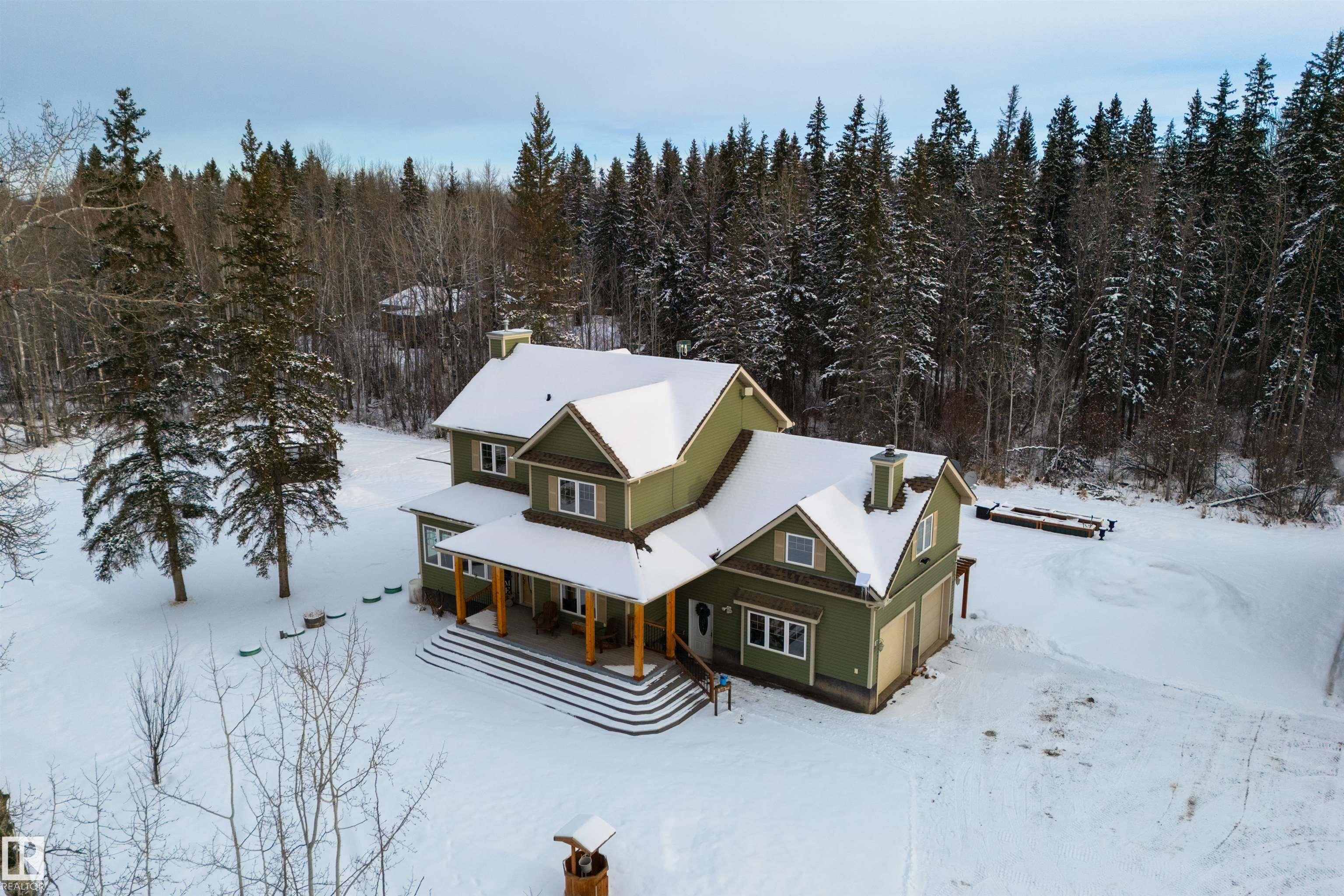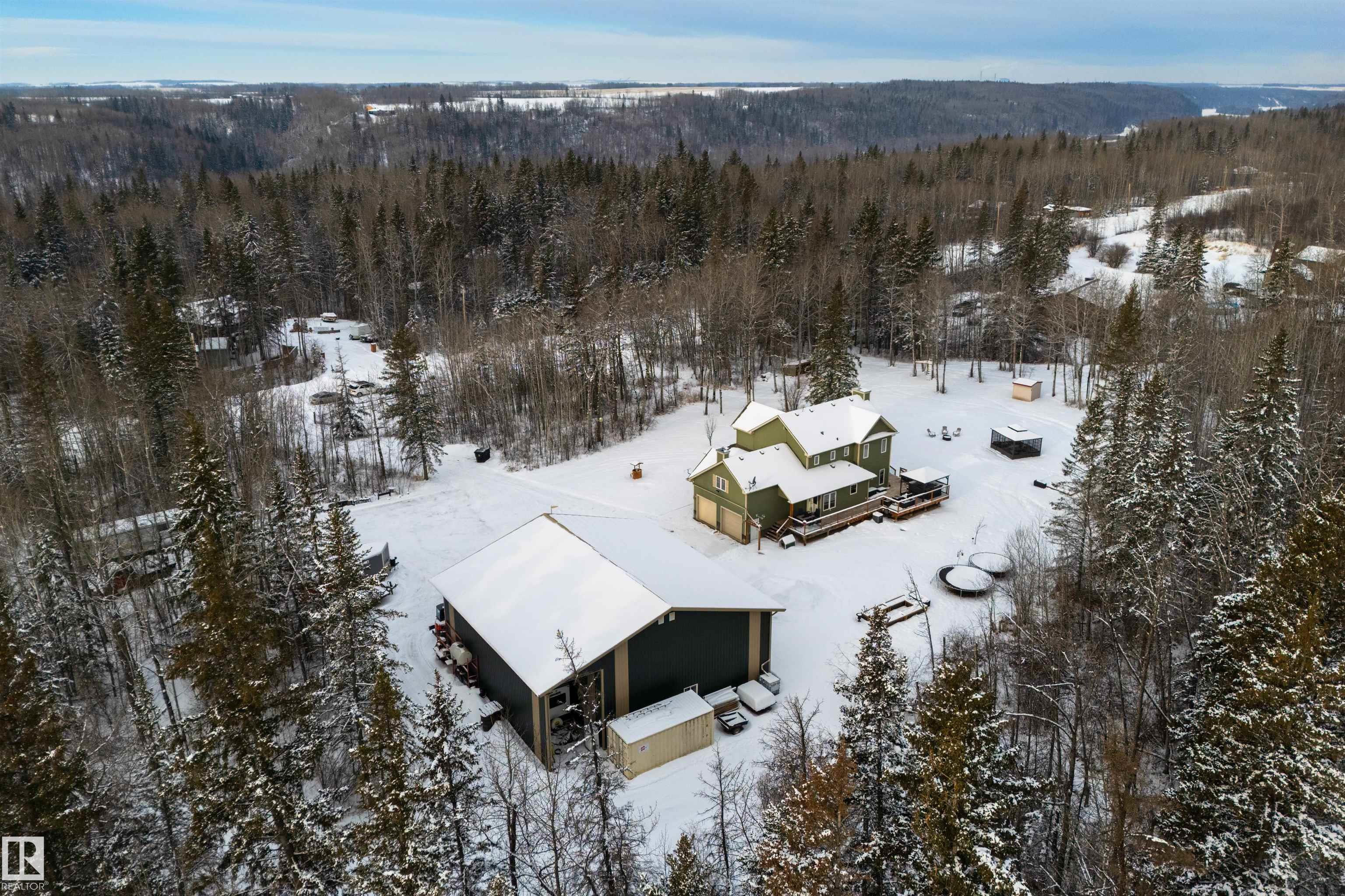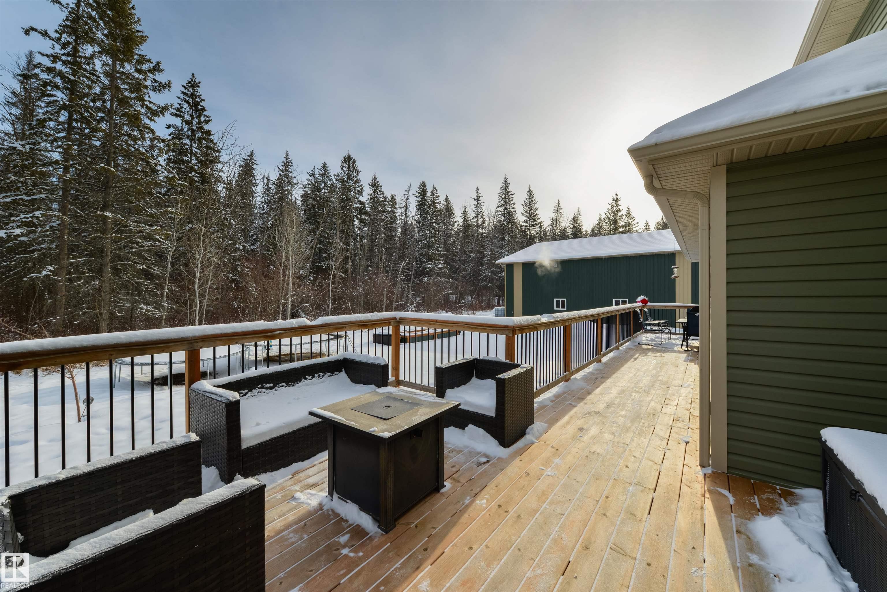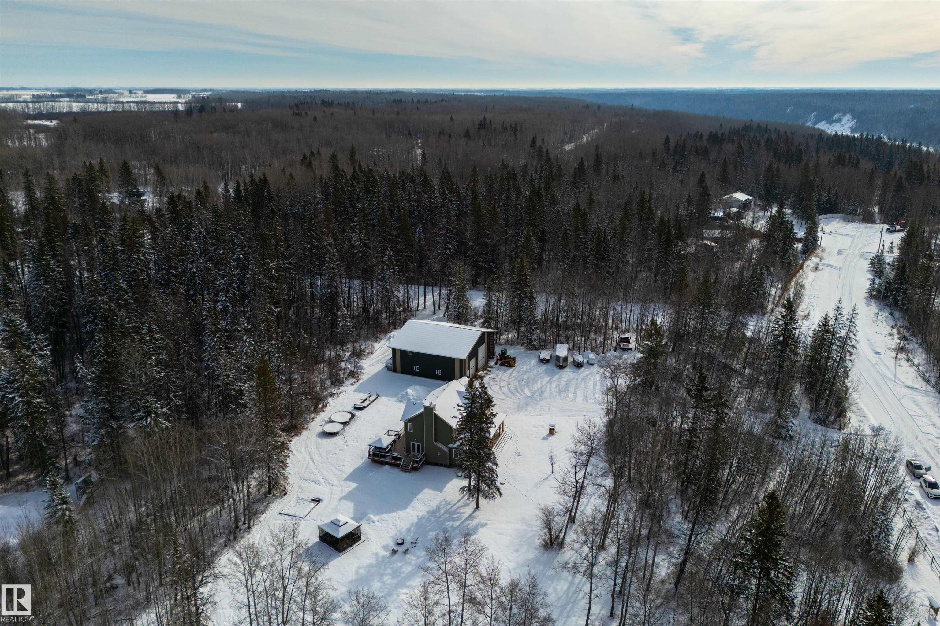 Imagine your kids launching off a 100' zipline while you soak in the hot tub -- the North Saskatchewan River just a short walk away. Set on 3.46 acres approximately 25 minutes SW of Spruce Grove, this beautifully treed property delivers a stunning backdrop & the acreage lifestyle you've been longing. A wrap-around deck covers half the home, permanent outdoor lighting illuminates the exterior, and there's room to breathe in every direction. Inside, every detail feels intentional - A/C, a gas fireplace, hardwood flooring, office/den, granite countertops in the kitchen, 9' ceilings on the top two floors, main floor laundry, wood stove in the bonus room, a finished basement, and 4 total bedrooms including a king-sized owner's suite with walk-through closet & 5pc ensuite. Then there's the shop -- 52' x 56', 18' ceilings, two oversized overhead doors, radiant heat, and a mezzanine. Properties like this are rare, and the buyers that find them? They don't let go.