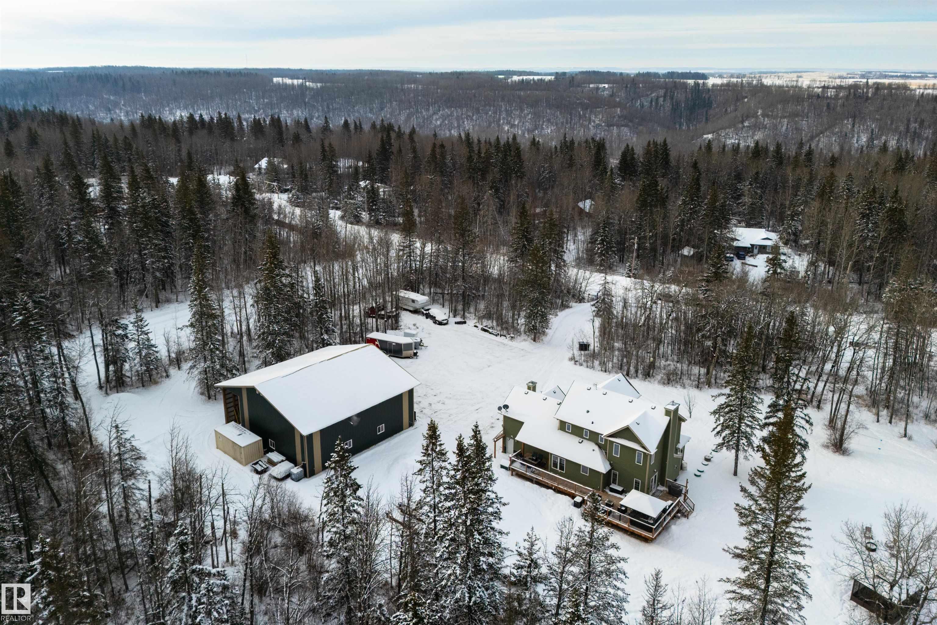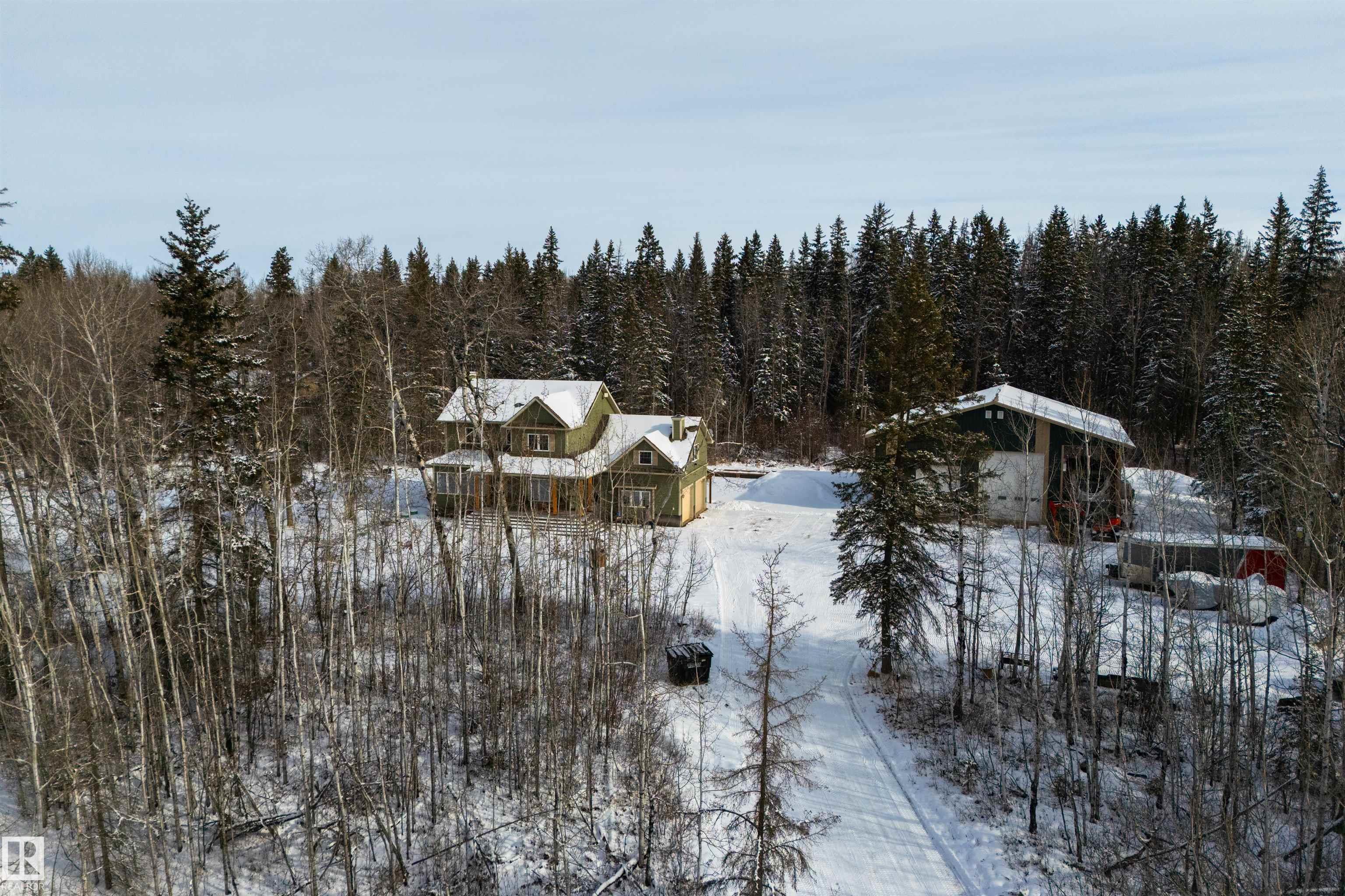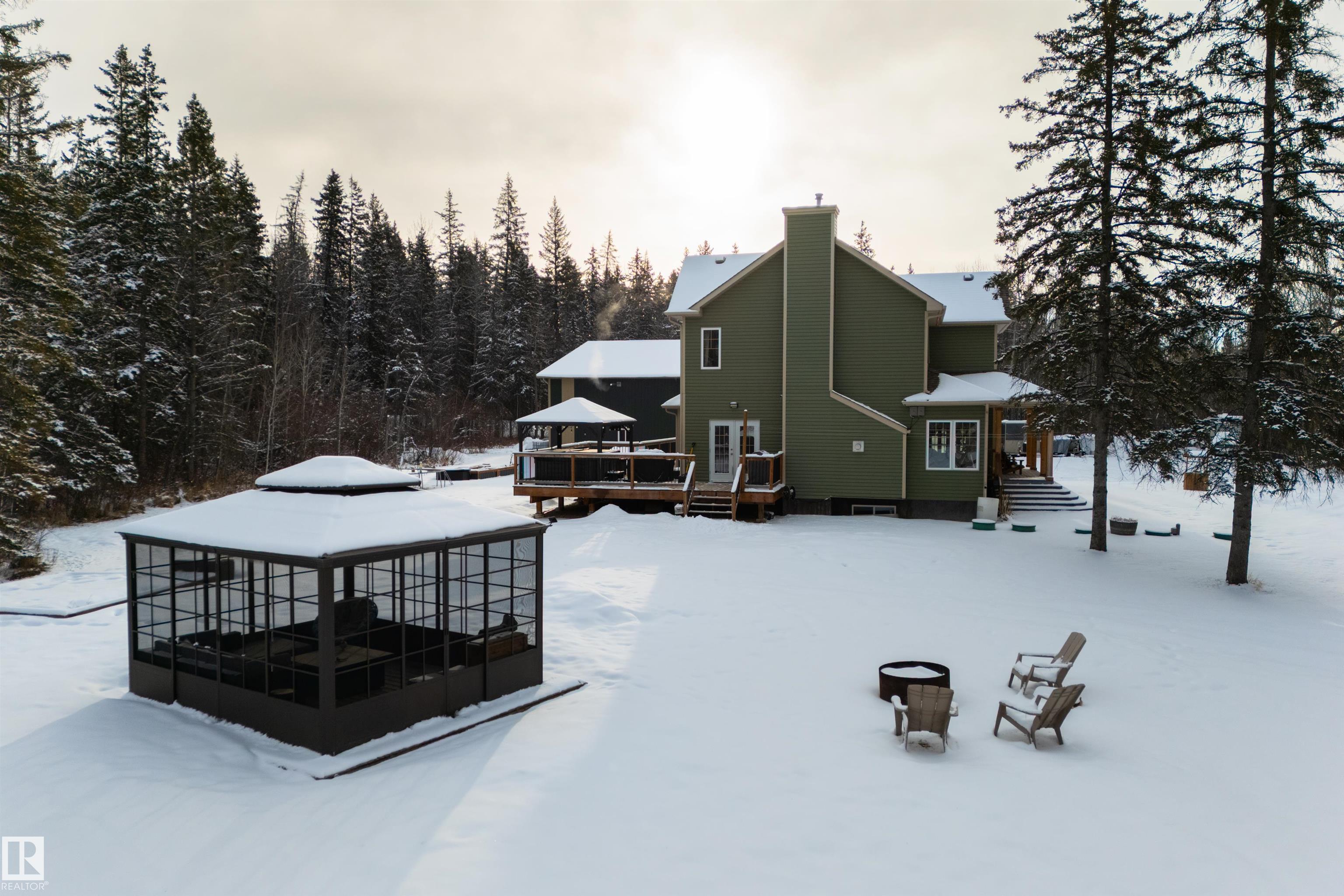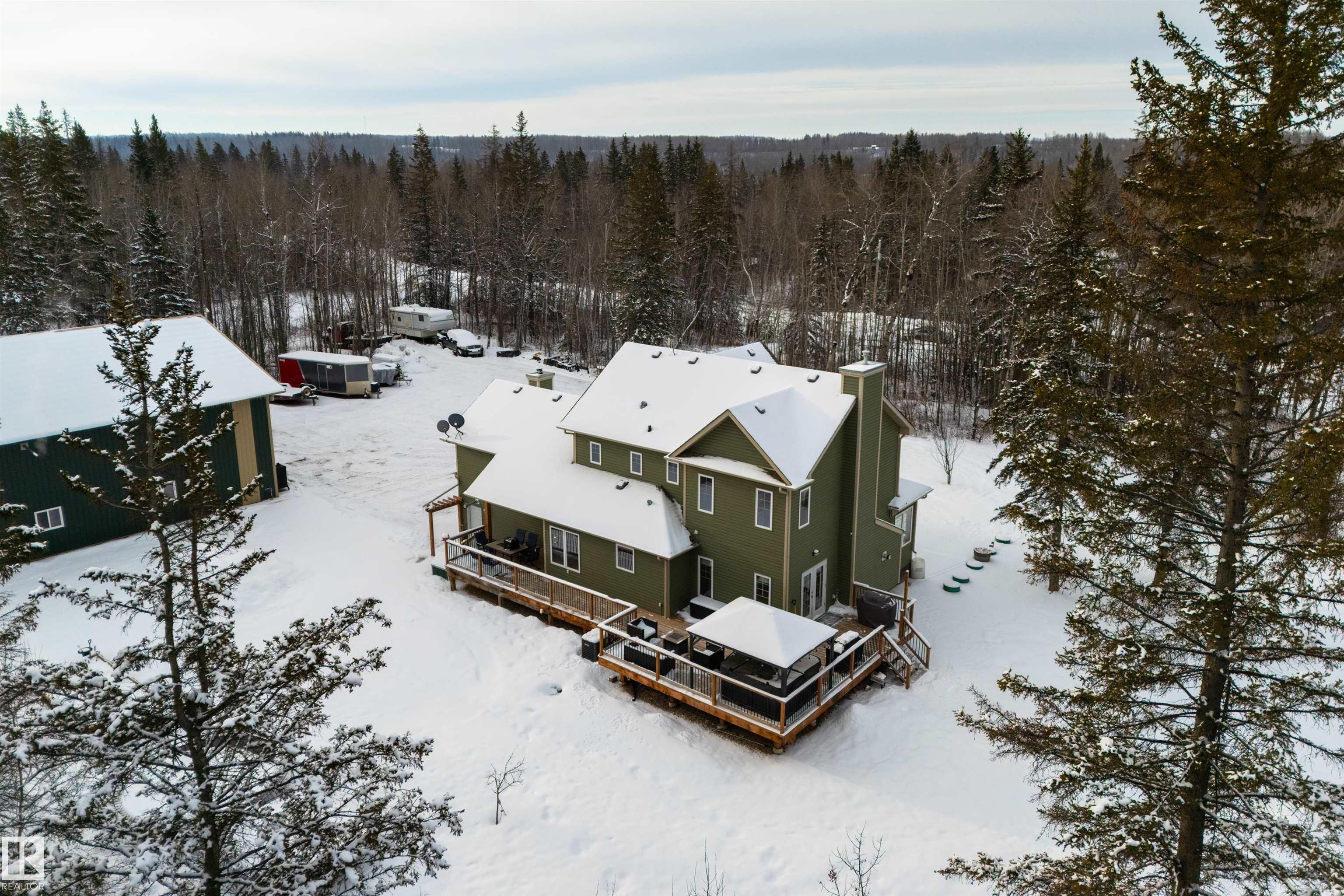 Imagine your kids launching off a 100' zipline while you soak in the hot tub -- the North Saskatchewan River just a short walk away. Set on 3.46 acres approximately 25 minutes SW of Spruce Grove, this beautifully treed property delivers a stunning backdrop & the acreage lifestyle you've been longing. A wrap-around deck covers half the home, permanent outdoor lighting illuminates the exterior, and there's room to breathe in every direction. Inside, every detail feels intentional - A/C, a gas fireplace, hardwood flooring, office/den, granite countertops in the kitchen, 9' ceilings on the top two floors, main floor laundry, wood stove in the bonus room, a finished basement, and 4 total bedrooms including a king-sized owner's suite with walk-through closet & 5pc ensuite. Then there's the shop -- 52' x 56', 18' ceilings, two oversized overhead doors, radiant heat, and a mezzanine. Properties like this are rare, and the buyers that find them? They don't let go.