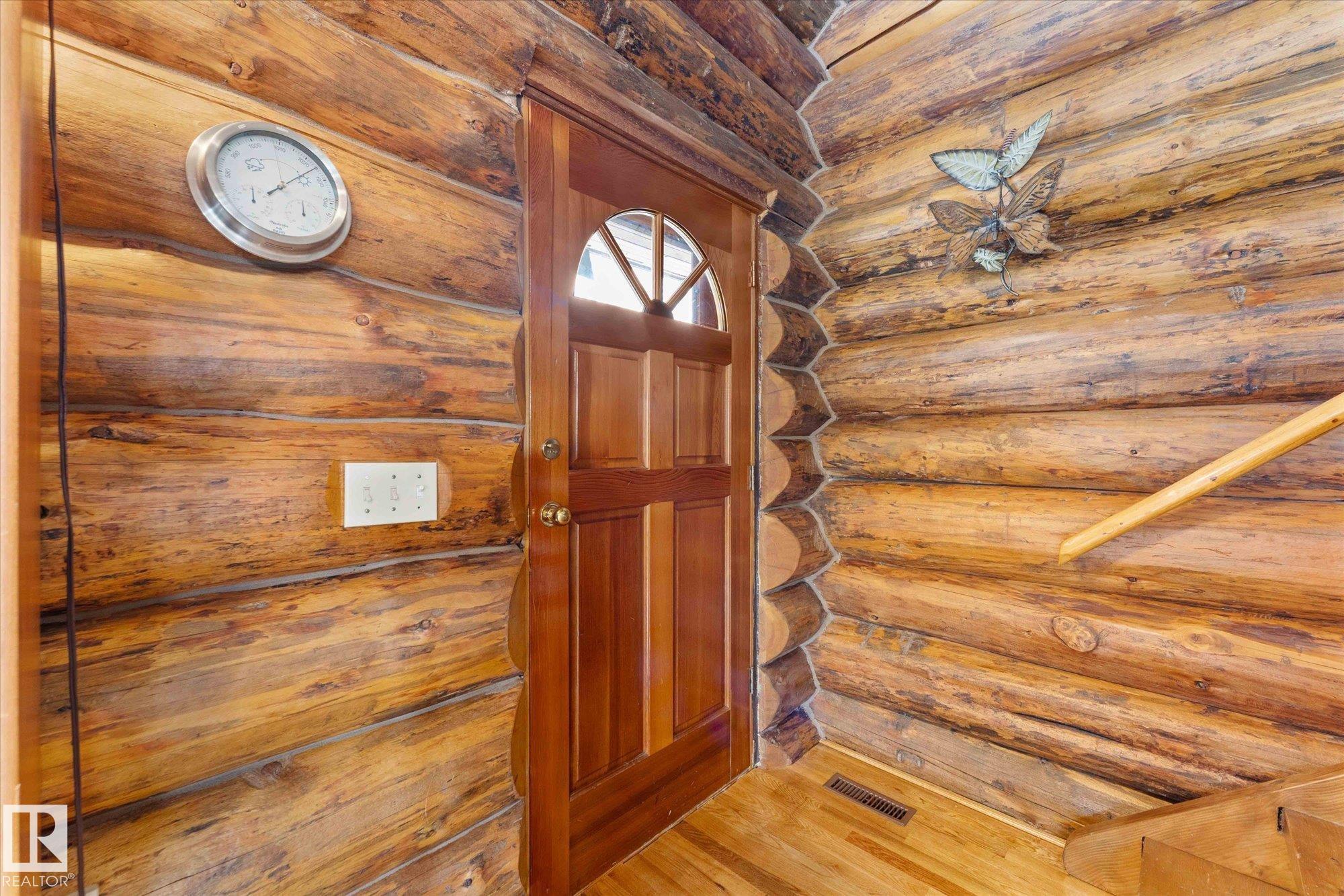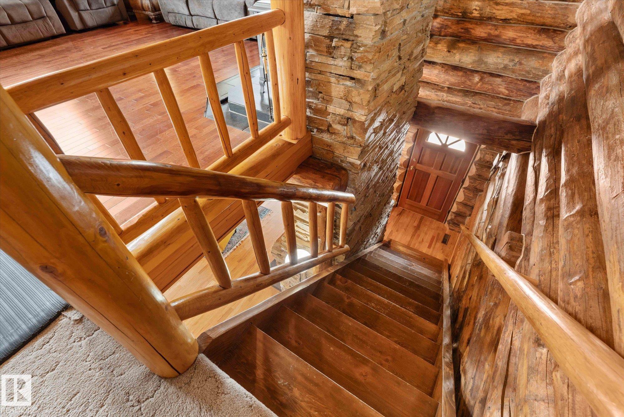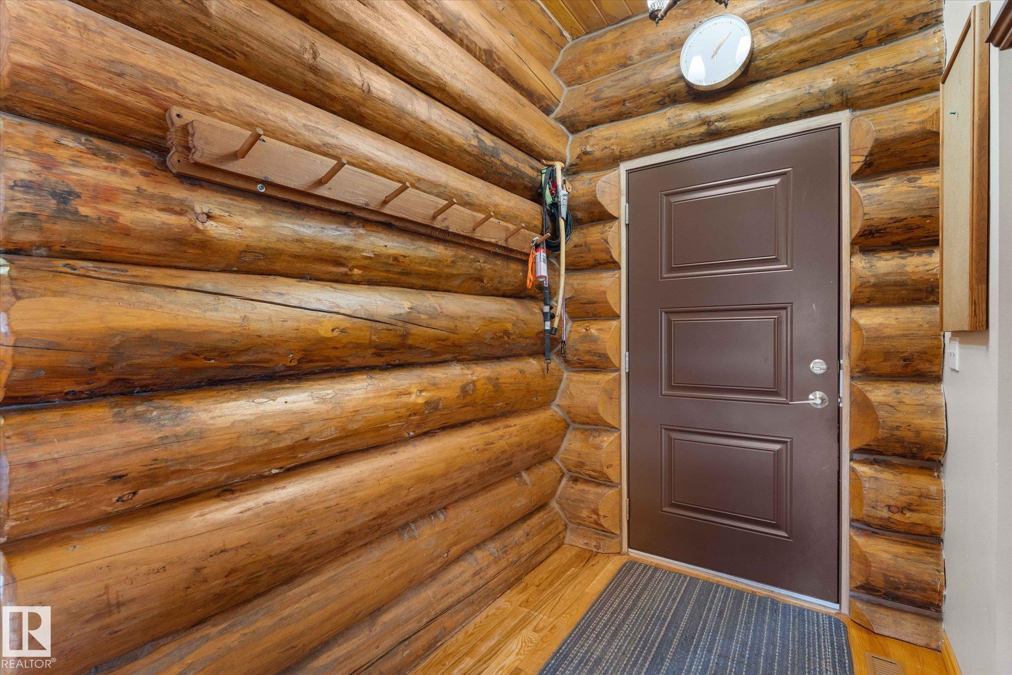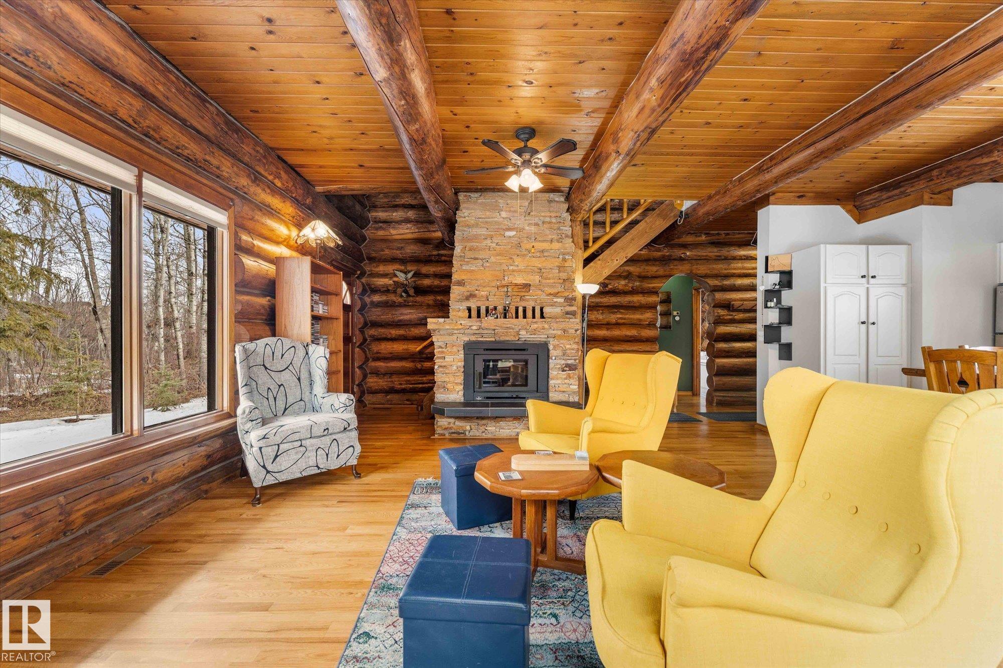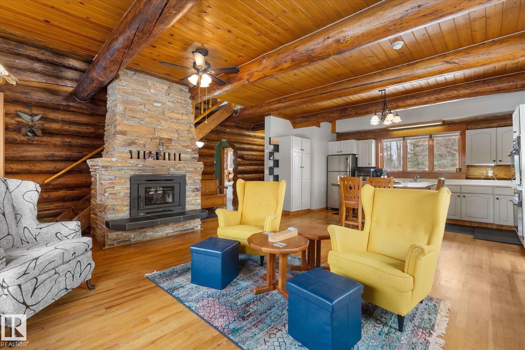 Crafted to Endure. Designed to Be Remembered. A fully restored authentic log home near Wabamun Lake, where natural materials and meticulous craftsmanship define the experience. At the center are two dramatic hand-laid stacked stone fireplaces--crafted stone-by-stone, one on each floor, to create natural depth, texture, and presence. It anchors the space and reflects a level of artisan construction rarely achieved today. Authentic log construction and rich natural materials create a timeless ambiance. Professional restoration, including updated sealants and chinking, enhances durability while preserving the integrity of the home. Warm, functional living spaces support both quiet mornings and gatherings. A large heated garage/shop, mature private setting, and covered outdoor areas extend the experience year-round. A level of craftsmanship rarely seen in today's construction--this is a home that supports the kind of moments people hold onto, built to be appreciated today and carried forward for years to come.