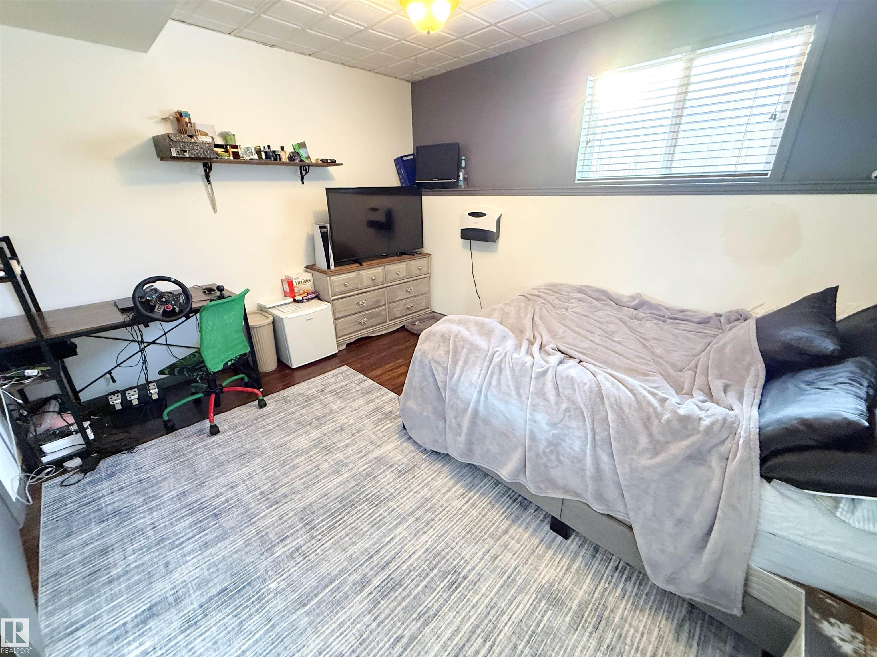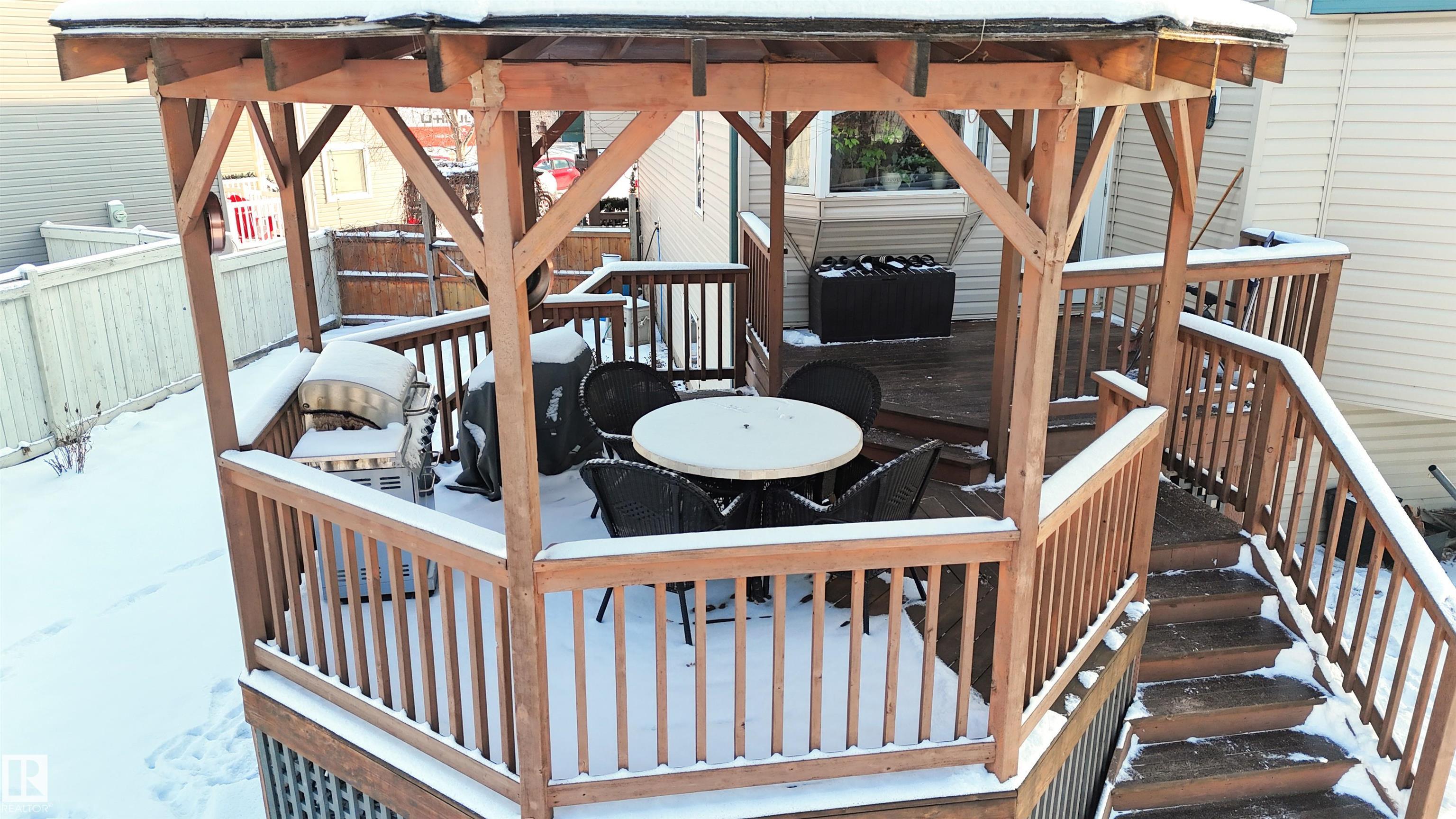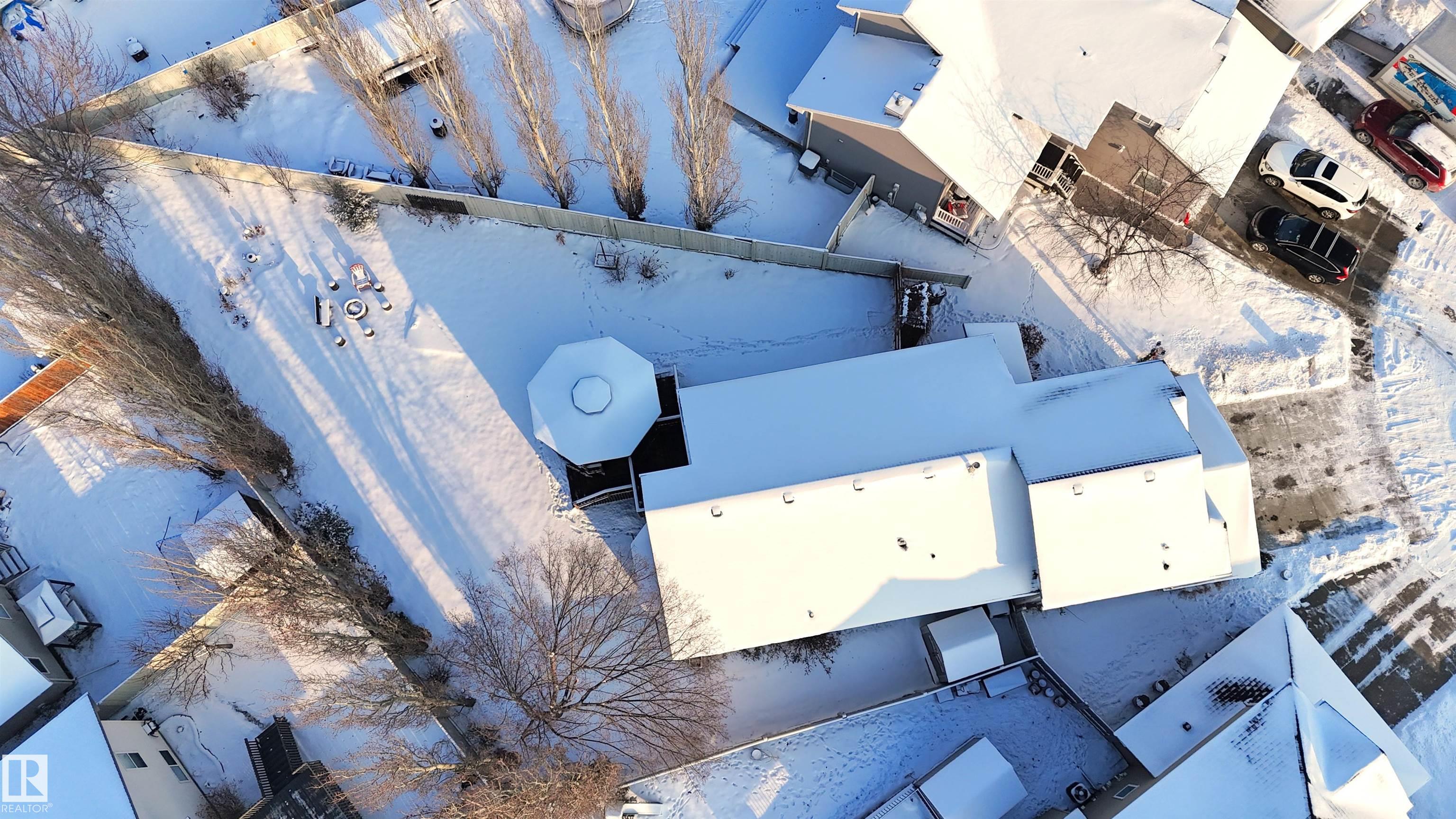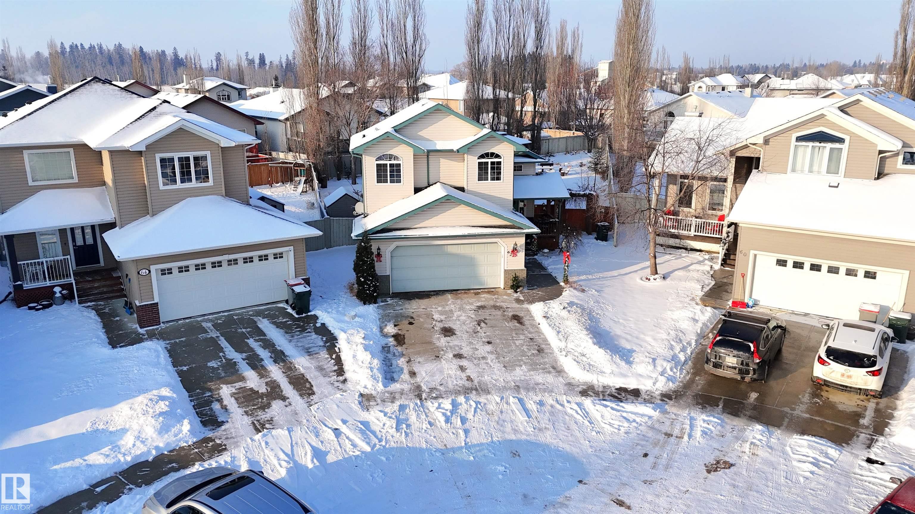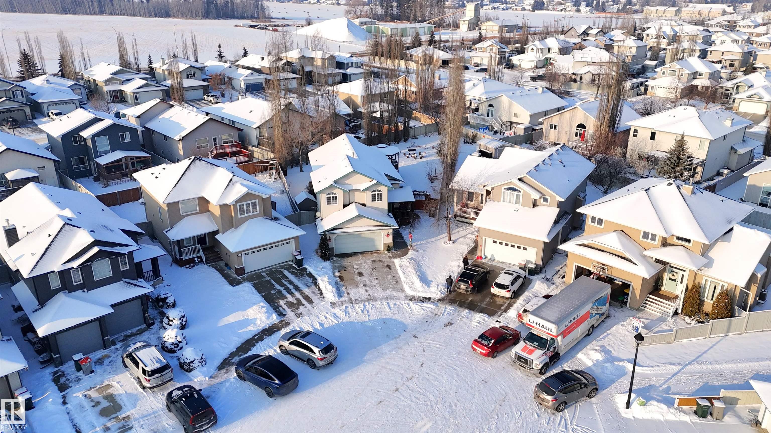 Bi-level with attached double garage (22Wx26L, heated & insulated) on a HUGE PIE LOT at the end of a quiet cul-de-sac in Willow Park. This 1,526 sq ft (plus full basement) home features central AC, vaulted ceiling, open concept layout and a bonus upper-level suite. On the main: 2 bedrooms, 4-piece bathroom, living room with cozy built-in bench reading nook, dining area with deck access and a gourmet kitchen with two-tier eat-up island, all new appliances, corner pantry and built-in desk/buffet. The owner's suite is a private upper-level sanctuary featuring walk-in closet & 3-piece ensuite. In the finished basement: large family/rec room with adjacent sitting area, 4-piece bathroom, 4th bedroom and laundry room. Outside: new shingles & siding, permanent Christmas lights, front porch and a beautiful fully fenced back yard with deck, gazebo, fire pit and underground sprinkler system; tree-lined for build-in privacy. Located near nature trails, schools and all the amenities of downtown Stony Plain. Must see!