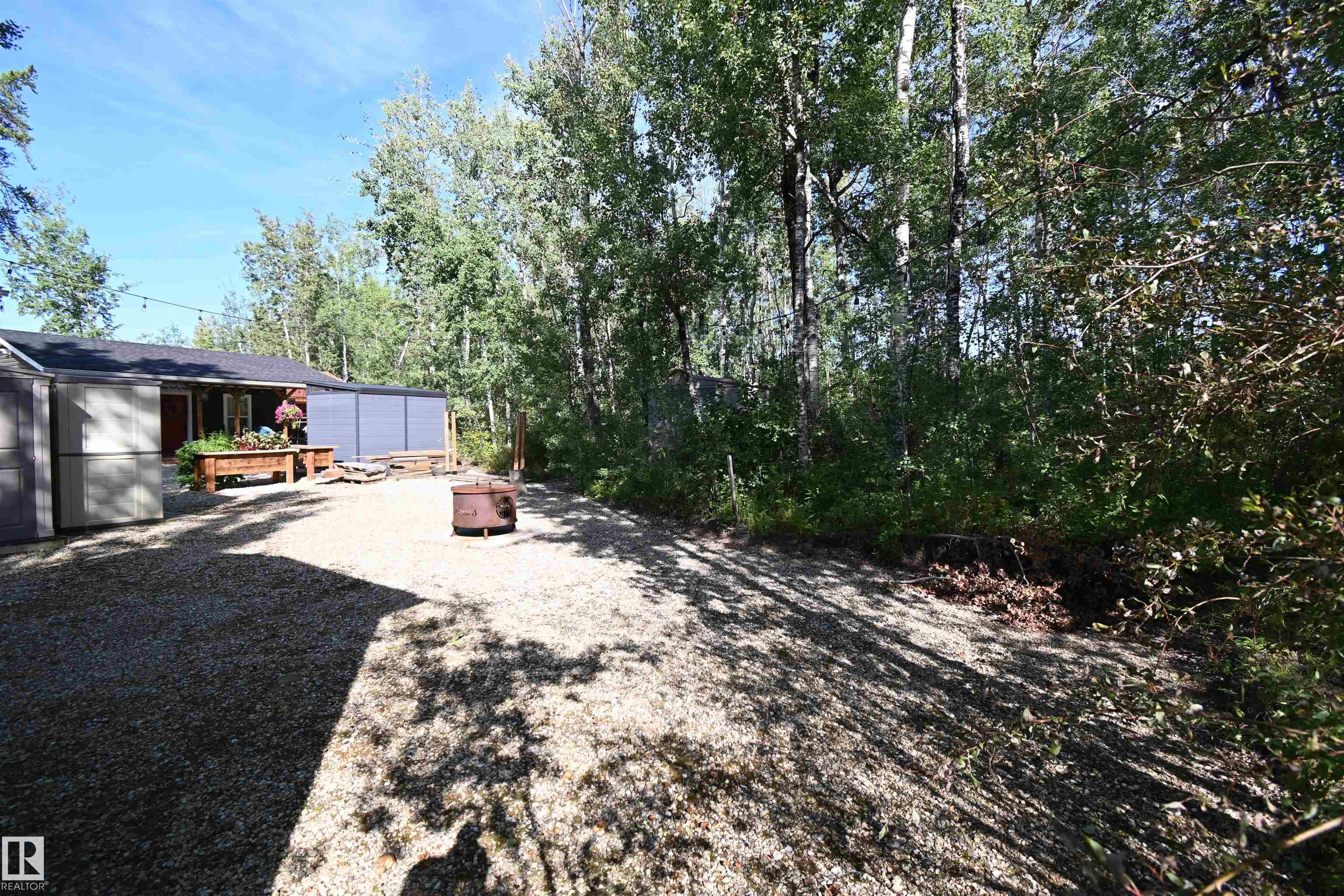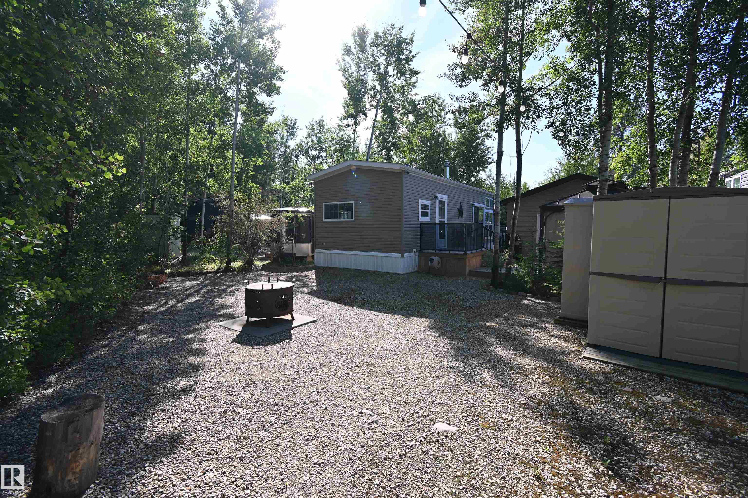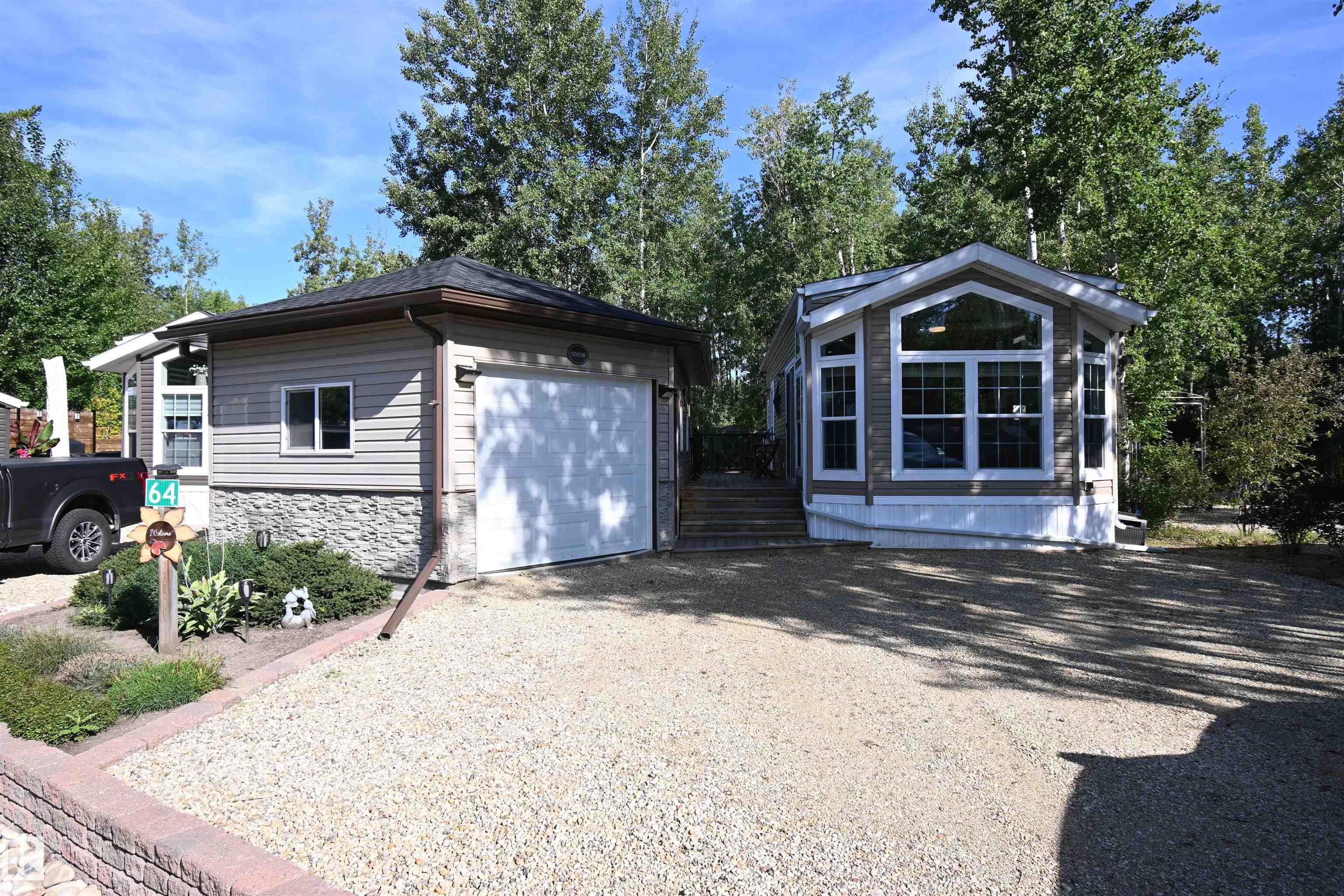 A Weekend Getaway, or a 4-Seasons Peaceful Lifestyle!! This 2-bed park model backs the trees in the Pineridge Golf Course & RV Resort. A bright, sunny kitchen offers an island and tons of cabinets, and huge windows give the living room a beautiful view. Custom cabinets provide the primary with extra storage, and the 2nd bed has bunk beds and a large wardrobe. ALL OF THE FURNITURE IS INCLUDED! The 3-pc bath has a large walk-in shower. Two rooms in the double garage create an opportunity for future bedrooms, a summer kitchen, or to store your toys. A large deck, a gazebo, a fire pit and central air ensure you enjoy every minute. There is so much to do in this gated community! Enjoy the clubhouse, pickleball and basketball courts, playground and trails, Wi-Fi, 50 amp power, full service septic, shower/washroom and laundry facilities, and the 12 hole Pineridge Golf Course. Just a short walk to Wabamun lake, and Seba Beach is minutes away. Trade in your RV for a year-round paradise! 45 min West of Edmonton