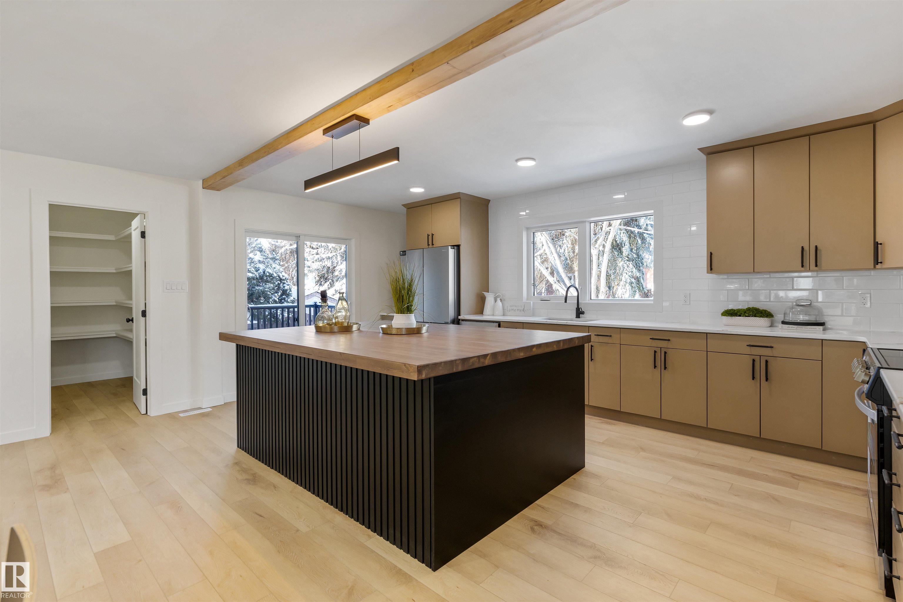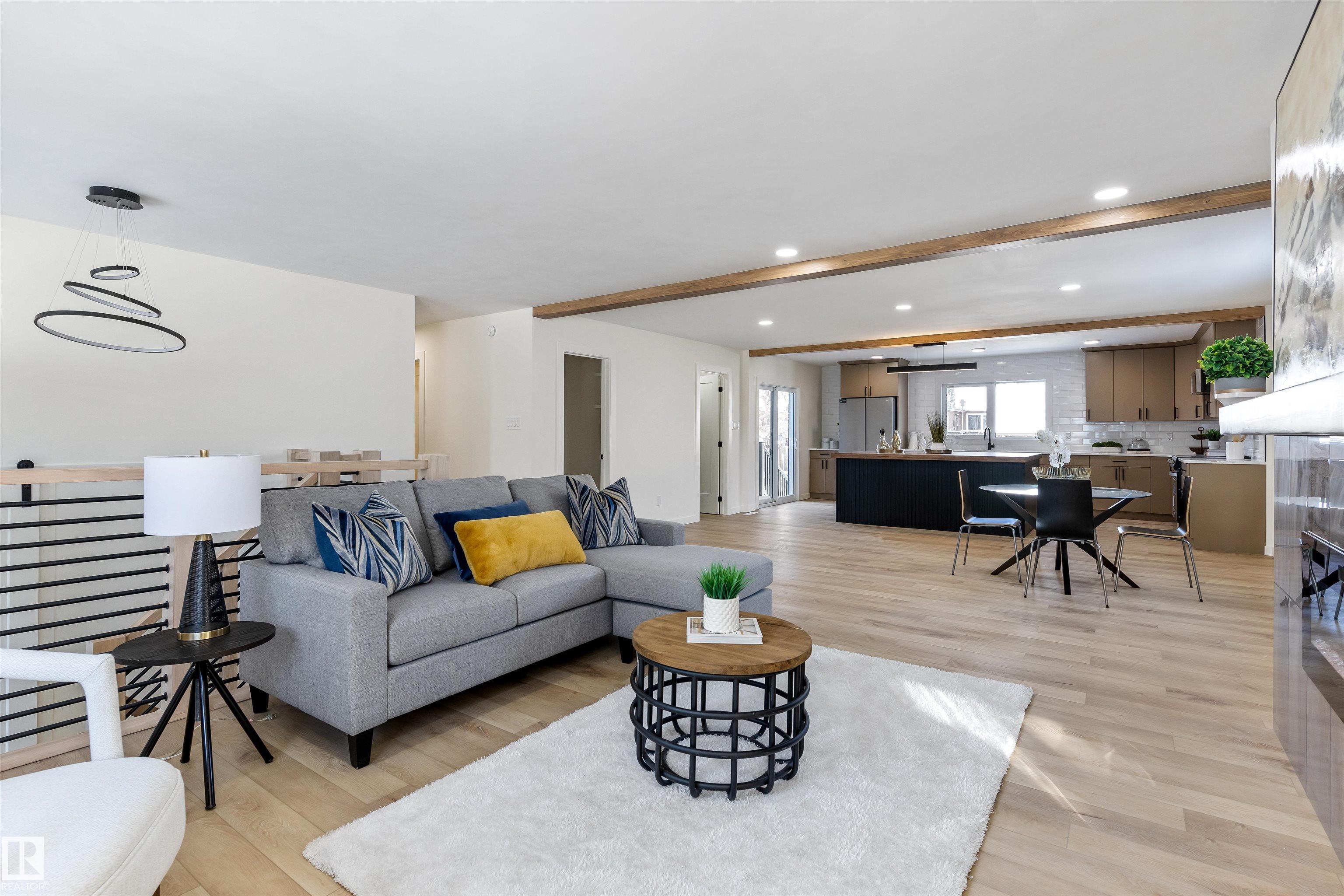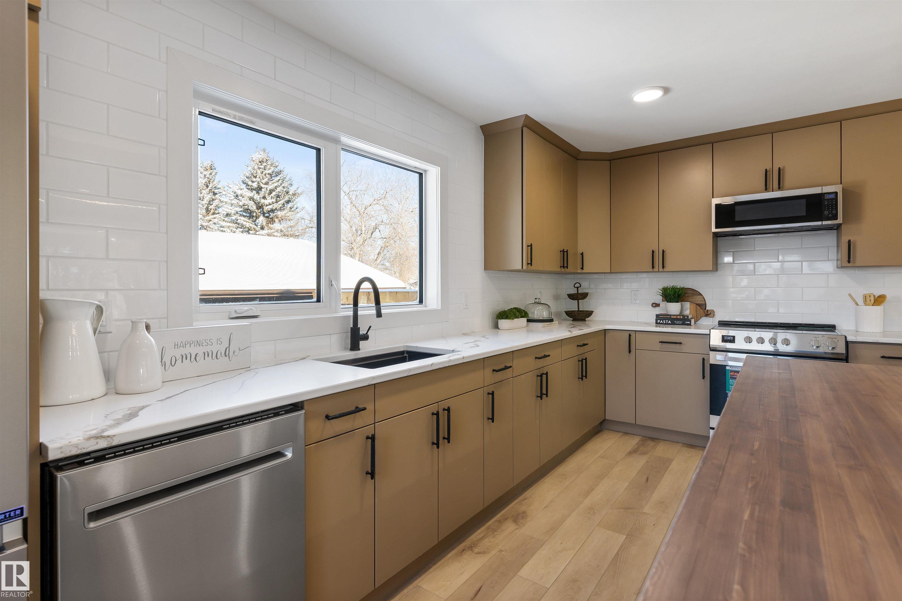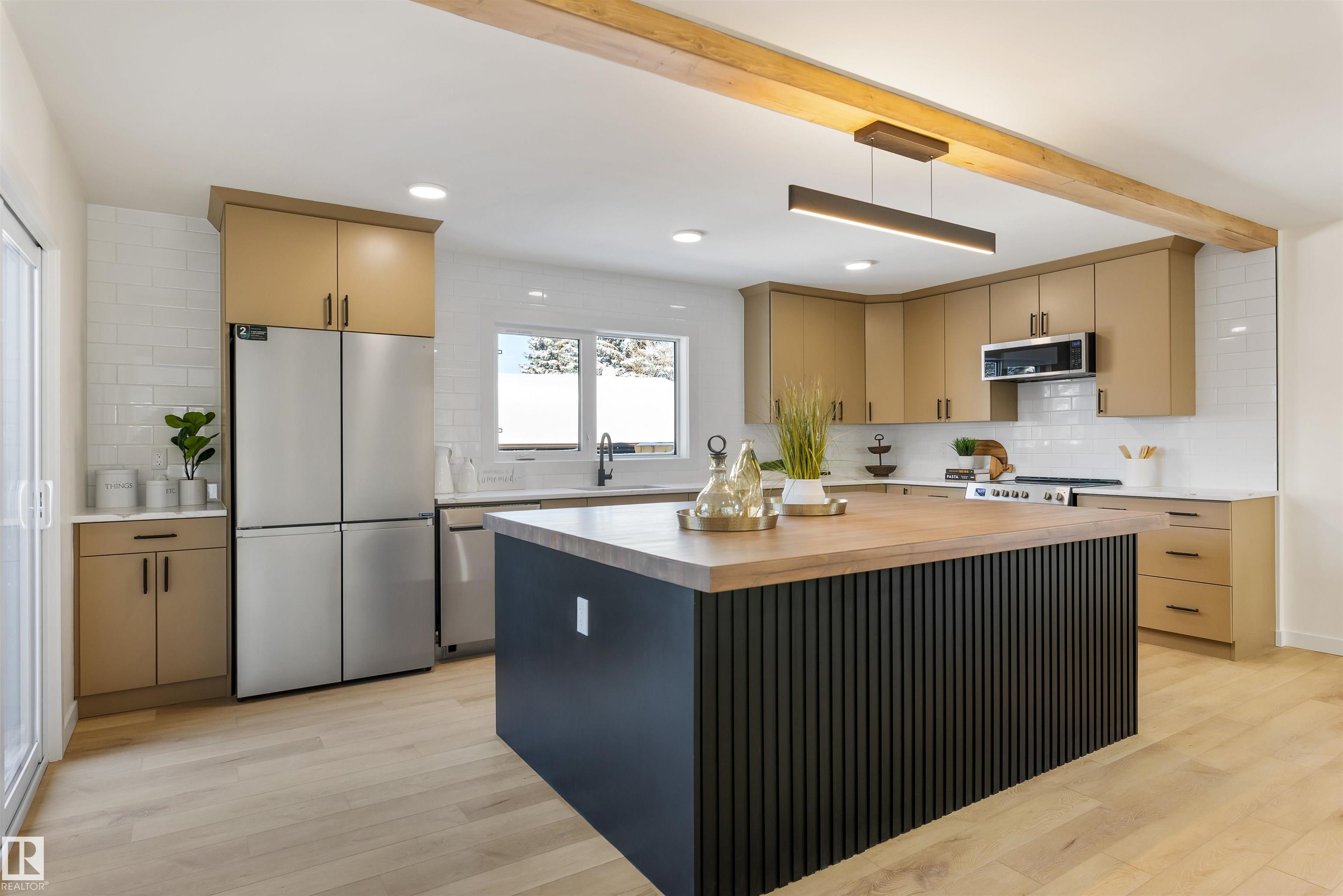 Completely RENOVATED from top to bottom, this beautifully updated bilevel offers over 1400 sqft of thoughtfully designed living space plus a FULLY FINISHED basement. The heart of the home is the custom kitchen featuring quartz countertops, a walk-in pantry, built-in coffee station and an extra large island with a hand carved wooden countertop, all flowing seamlessly into the open concept dining and living area with a gorgeous fireplace and an abundance of natural light through oversized windows. The main floor includes two bedrooms and two full baths, highlighted by a luxurious primary suite with a spa-inspired ensuite and walk-in closet. Downstairs you'll find a spacious rec room with bar area, two additional bedrooms, full bath and laundry. New vinyl plank flooring, upgraded electrical, new deck and an oversized double detached garage complete this move-in ready home--just unpack and enjoy.
