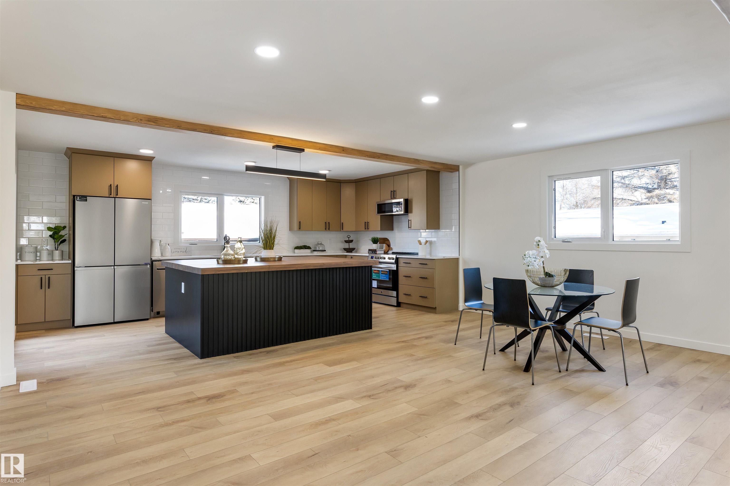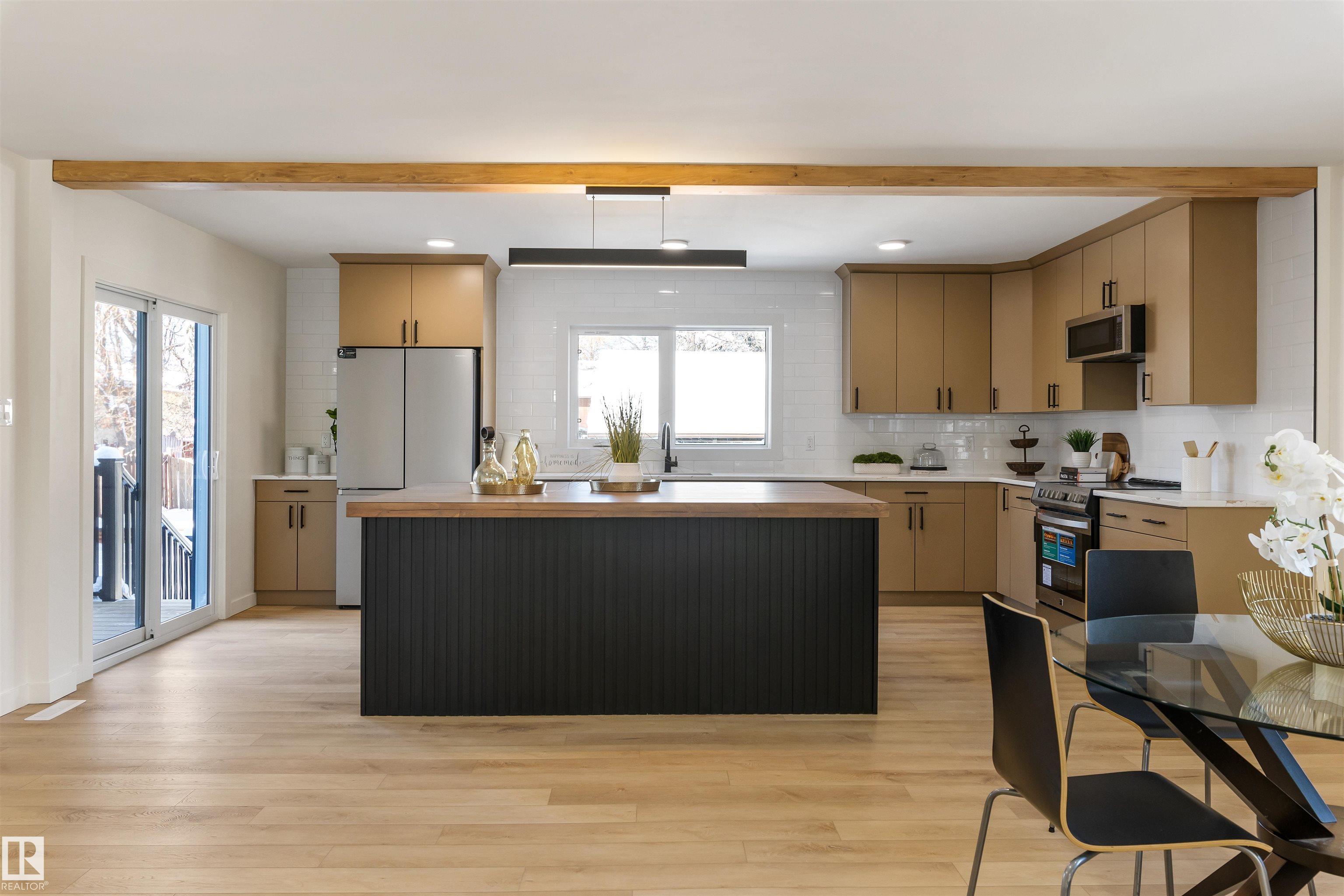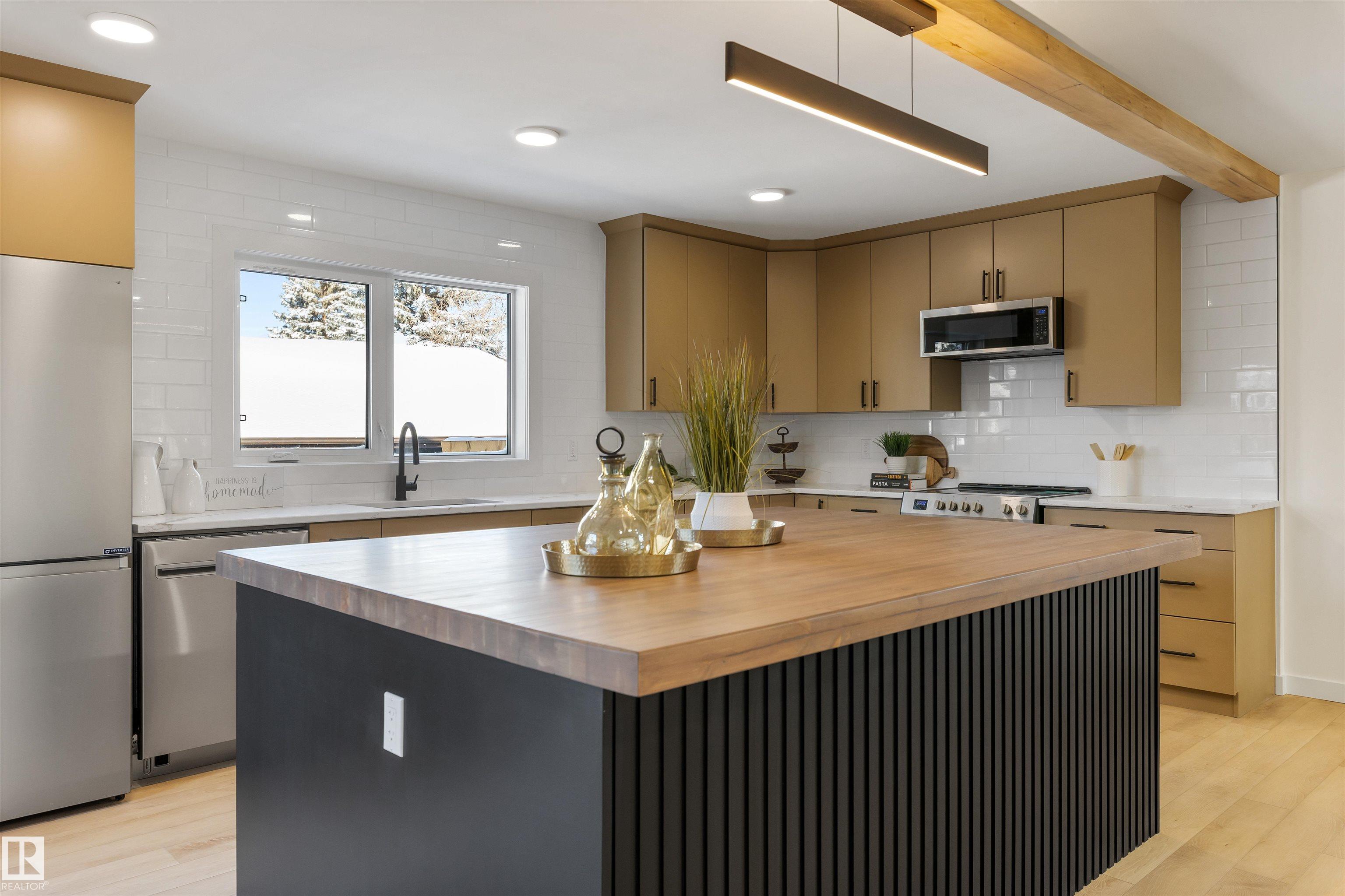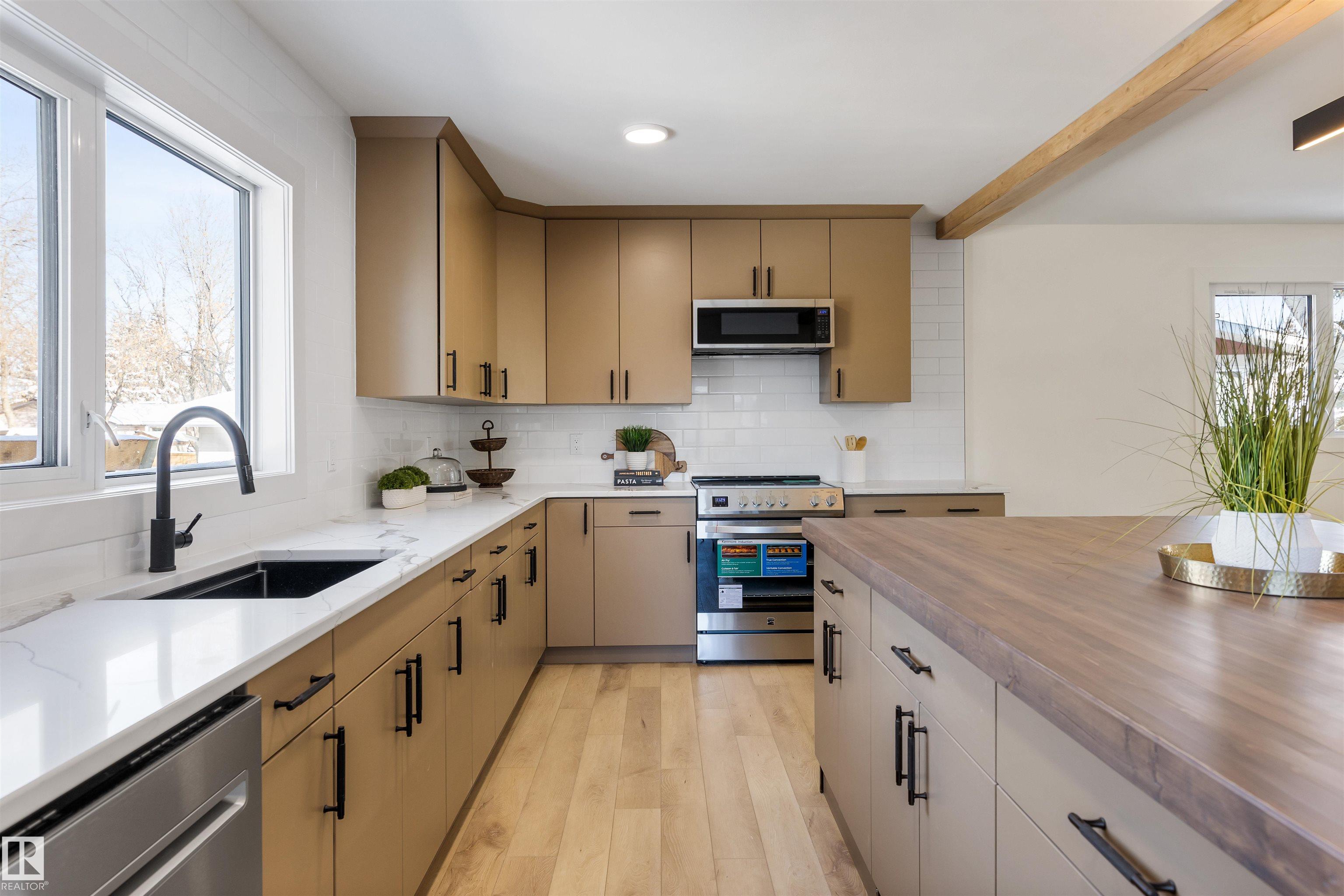 Completely RENOVATED from top to bottom, this beautifully updated bilevel offers over 1400 sqft of thoughtfully designed living space plus a FULLY FINISHED basement. The heart of the home is the custom kitchen featuring quartz countertops, a walk-in pantry, built-in coffee station and an extra large island with a hand carved wooden countertop, all flowing seamlessly into the open concept dining and living area with a gorgeous fireplace and an abundance of natural light through oversized windows. The main floor includes two bedrooms and two full baths, highlighted by a luxurious primary suite with a spa-inspired ensuite and walk-in closet. Downstairs you'll find a spacious rec room with bar area, two additional bedrooms, full bath and laundry. New vinyl plank flooring, upgraded electrical, new deck and an oversized double detached garage complete this move-in ready home--just unpack and enjoy.