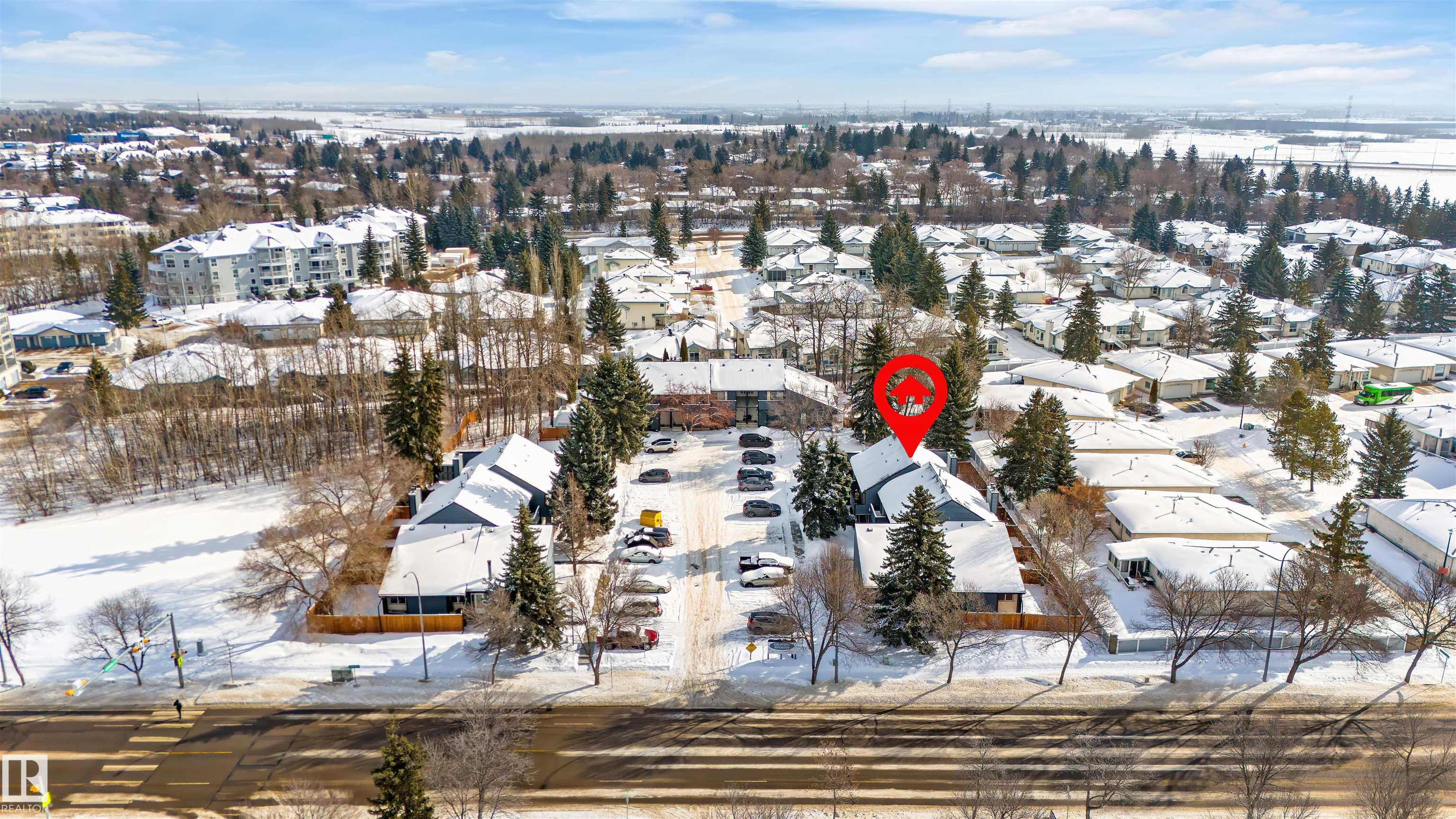 Imagine starting your mornings on a private balcony and ending your evenings by a cozy wood-burning fireplace. Welcome to life in Grandin. This well-maintained townhome features a stylish kitchen with two-tone cabinetry, a double oven, and a newer stainless steel fridge. The spacious living room, centered around a cozy wood-burning fireplace, flows seamlessly to patio doors leading to a fully fenced yard with perennial gardens for effortless, year-after-year landscaping. Upstairs offers three comfortable bedrooms, including a primary retreat with its own private balcony. The bathroom delivers a spa-inspired feel with a luxurious rain shower. The basement adds storage, laundry, and a versatile flex space. Enjoy two powered stalls right out front. Located in a well-managed complex just steps from parks, walking trails, Grosvenor Pool, the St. Albert Farmers' Market, and everyday amenities. Quick access to the Henday and 170 Street makes commuting easy. Condo fees are set to reduce to $428/month in Jan 2027