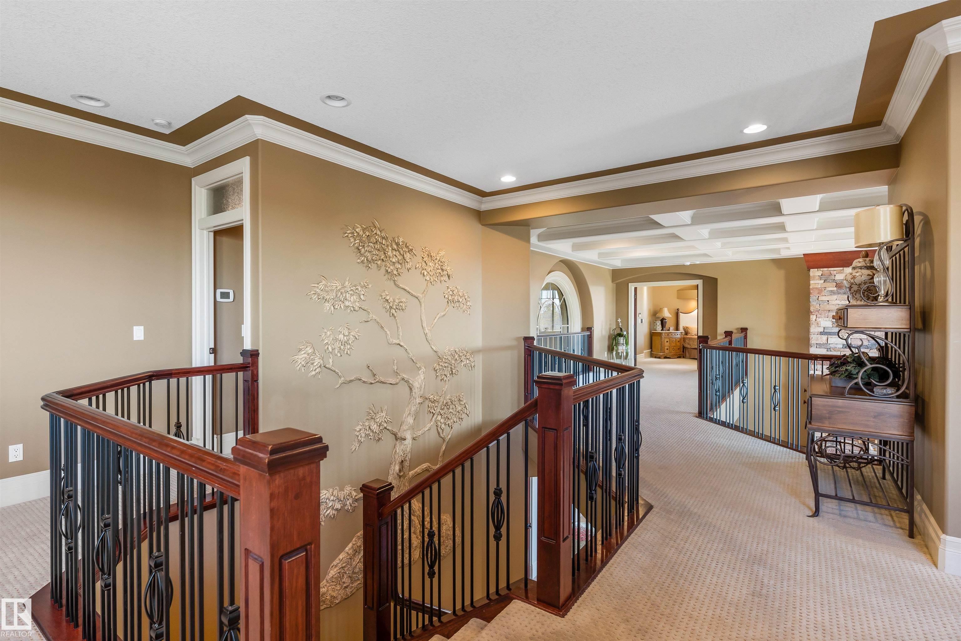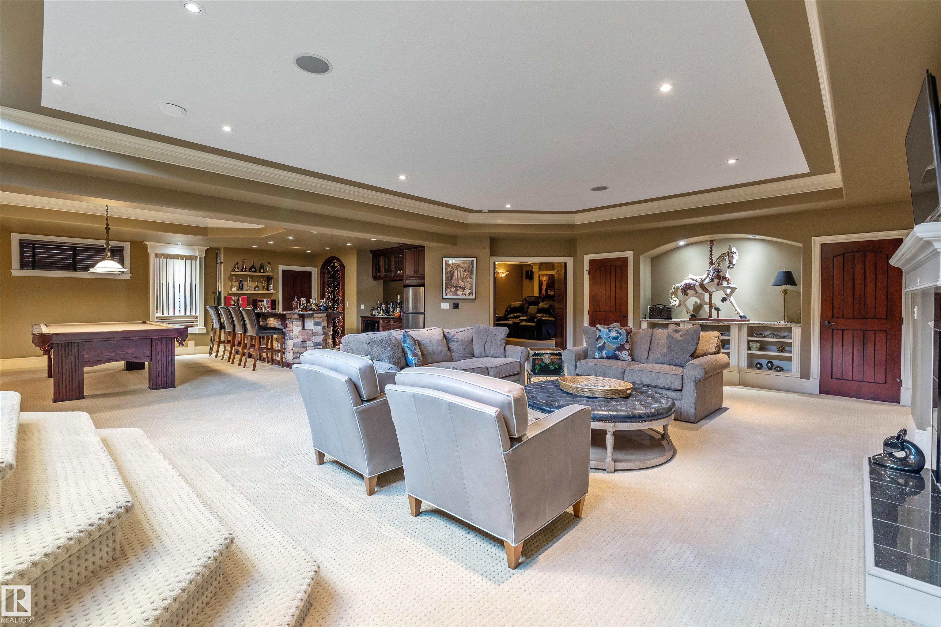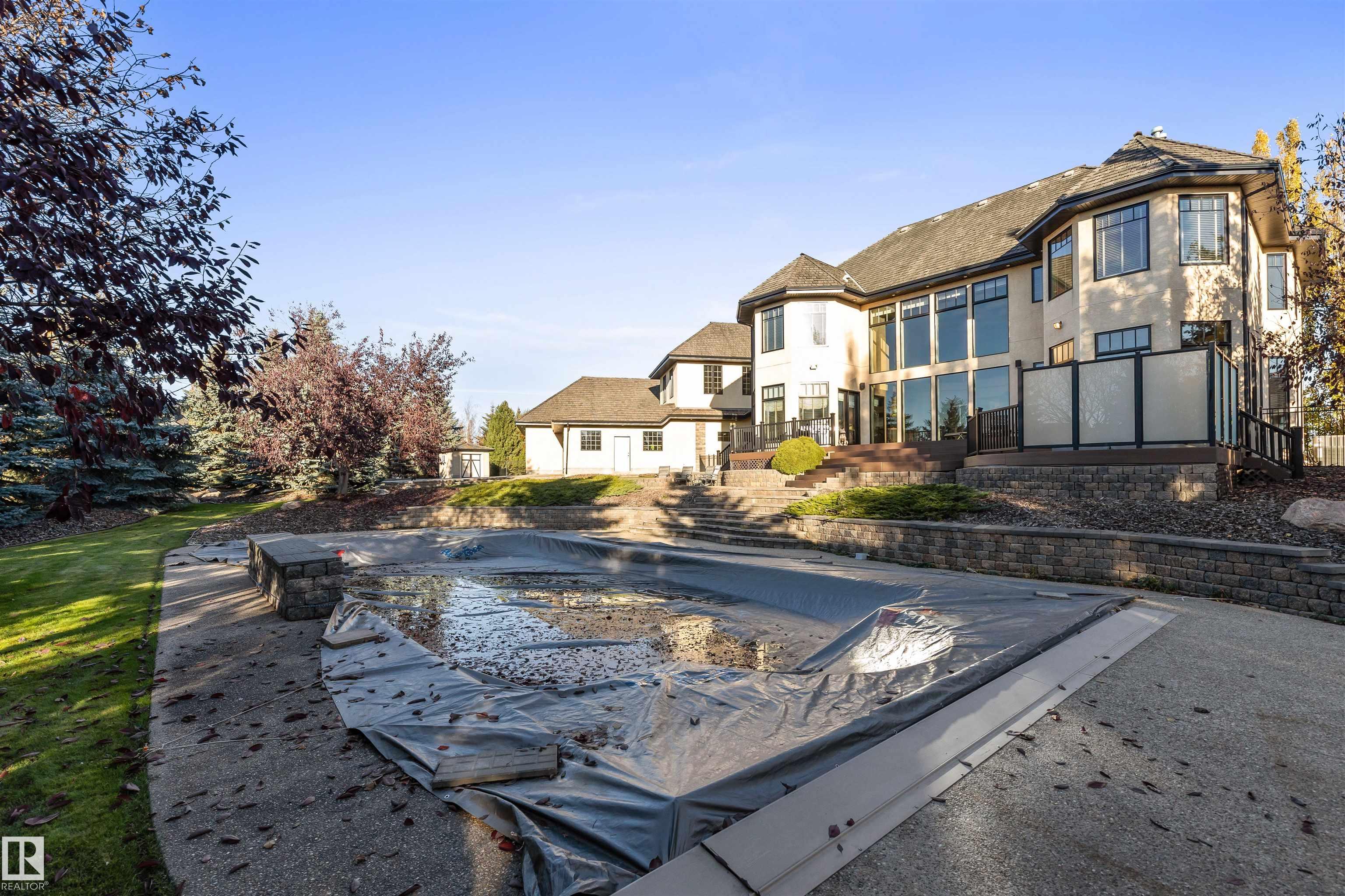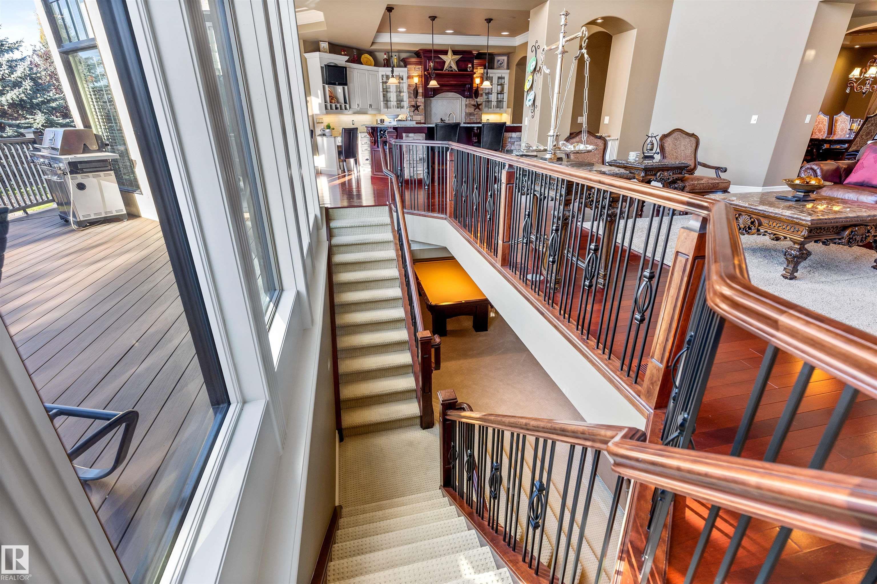 Luxury in prestigious Riverstone Pointe! This 6173 sqft 2 storey awaits a new owner. The living room is stunning w/ a 2 storey stone gas f/p, coffered ceiling, HARDWOOD flooring & windows overlooking the yard. The kitchen has cabinetry w/ crown molding, under cabinet lighting, granite counters, tile backsplash & an eating bar island. The dining room is spacious- perfect for hosting. The office has large windows & a 2 sided f/p leading into the LIBRARY. Completing the main floor is a sun room, 2pce bath & 3pce bath. The 2nd floor has a family room w/ built in shelving, 4 bedrooms (2 w/ their own ensuite), a 6pce jack & jill bathroom & a laundry room. The basement feat. a spacious rec room w/ gas f/p & built ins on either side, wet bar w/ eating bar island & WINE ROOM. The theatre room is just off the wet bar. A gym, 5th bedroom & 3pce bath complete the basement. Enjoy summer in the beautiful yard w/ a deck, hot tub, stone patio, SWIMMING POOL & firepit. A HEATED attached 10 CAR GARAGE completes this home!