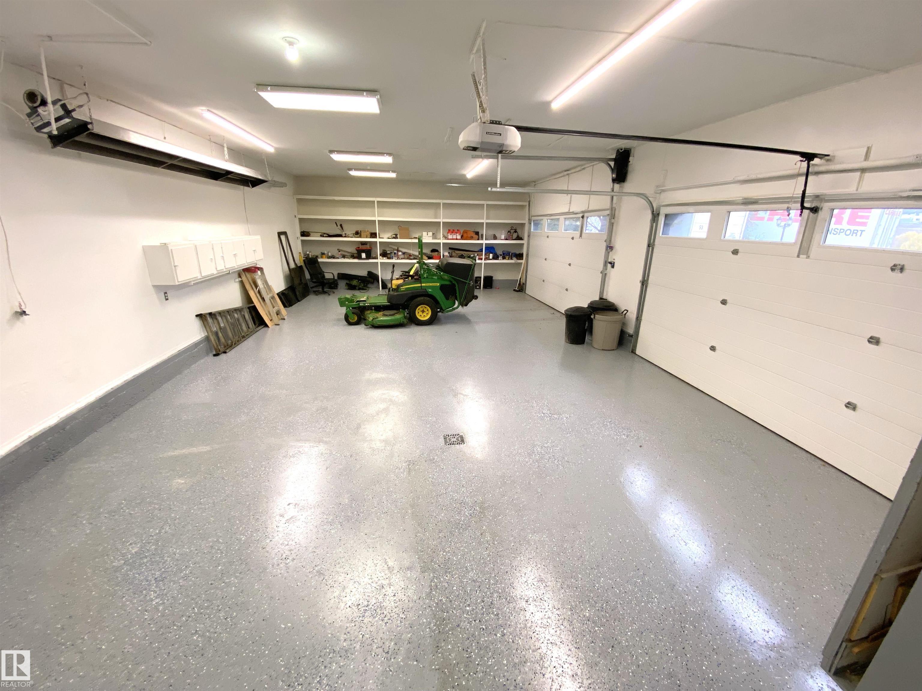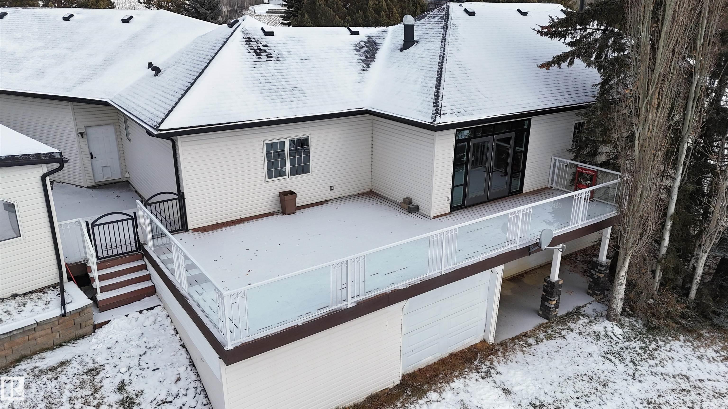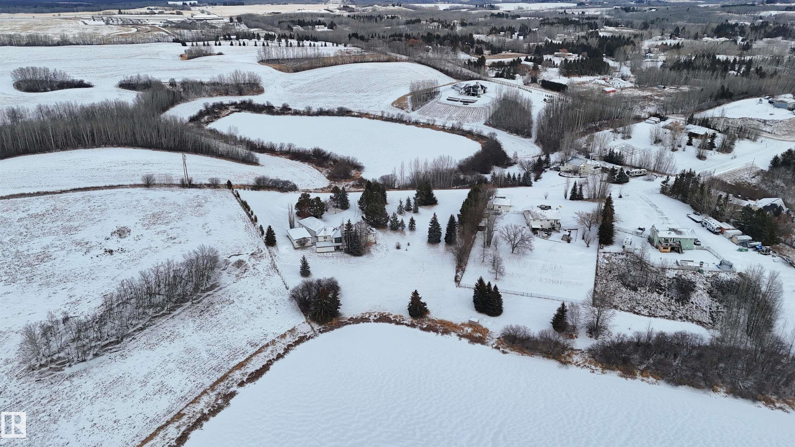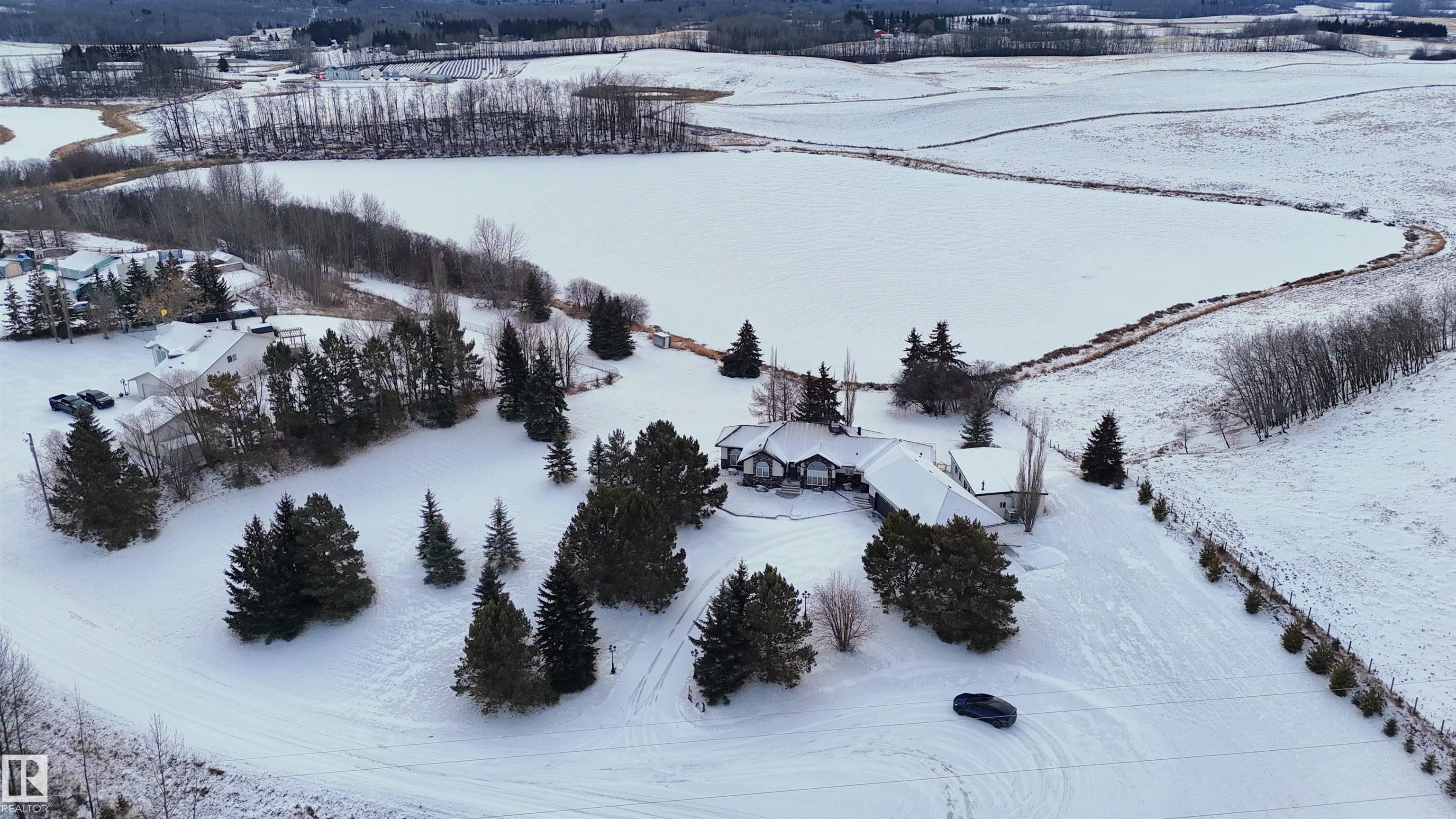 Custom WALKOUT Bungalow w/ Attached QUAD Garage (44Wx25L, heated, 220V, water/sink) on 1.43 acres in a quiet cul-de-sac on a PRIVATE POND in Marrakesh Properties subdivision, a short 10 min drive west of Stony Plain. This beautiful 2,256 sq ft (plus full basement) home features central AC, hardwood & tile flooring, vaulted ceilings and the perfect spaces for you home business. On the main: living room w/ gas fireplace, dining room w/ built-in buffet (sink & beverage fridge), gourmet kitchen w/ eat-up centre island, main floor laundry, 2.5 bathrooms & 4 bedrooms including the owner's suite w/ 5-pc ensuite & walk-in closet. Walkout basement: 2 additional bedrooms, office, 4-pc bath, storage rooms and a massive family/rec room w/ 2nd gas fireplace, wet bar & sound system. Outside: WATERFRONT VIEWS from the patio & composite deck; 2 sheds, paved driveway and a 48'x24' WORKSHOP w/ heat & central AC. Easy access to Yellowhead & 16A. Perfect location to run a business from your PRIVATE WATERFRONT HOME near town.