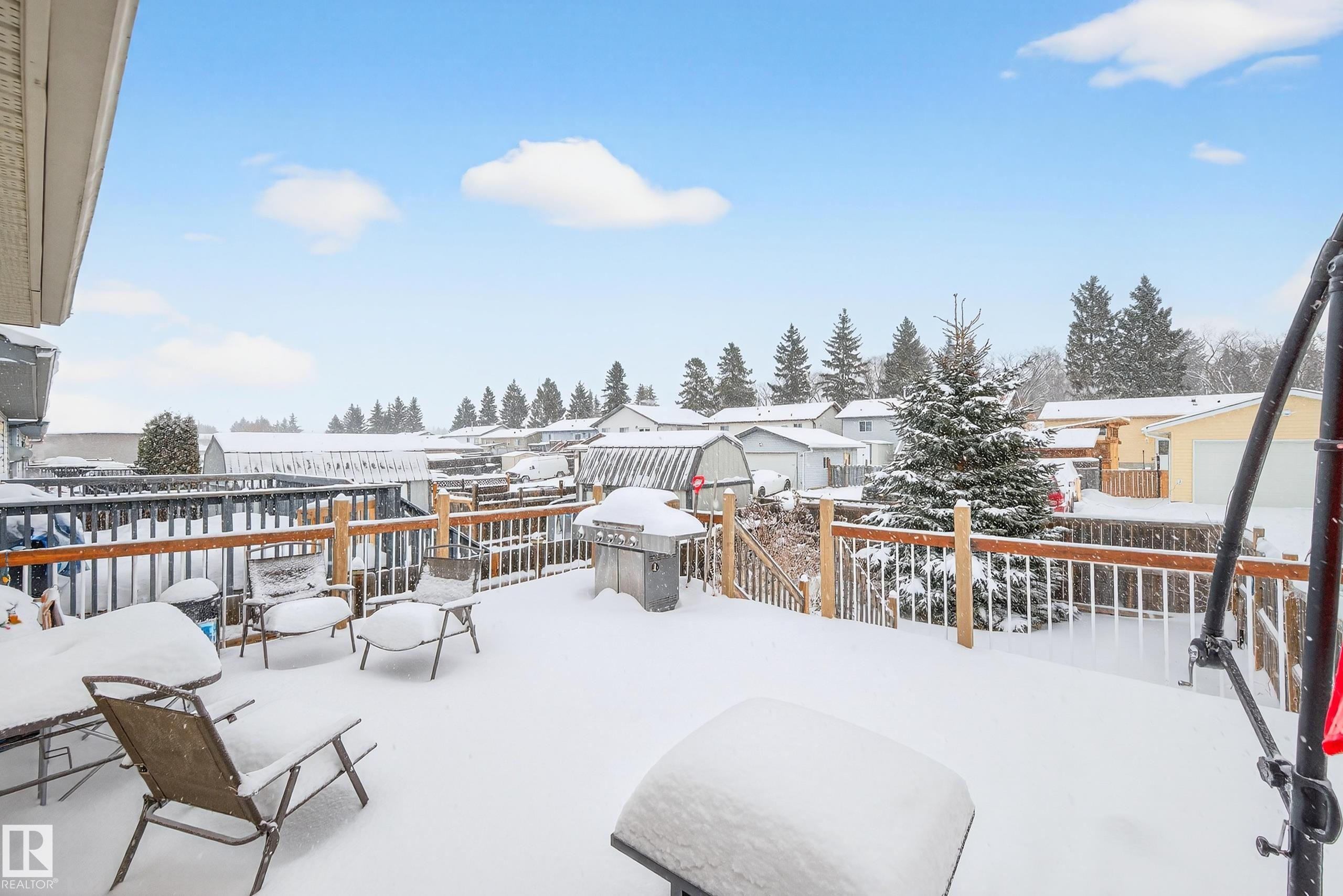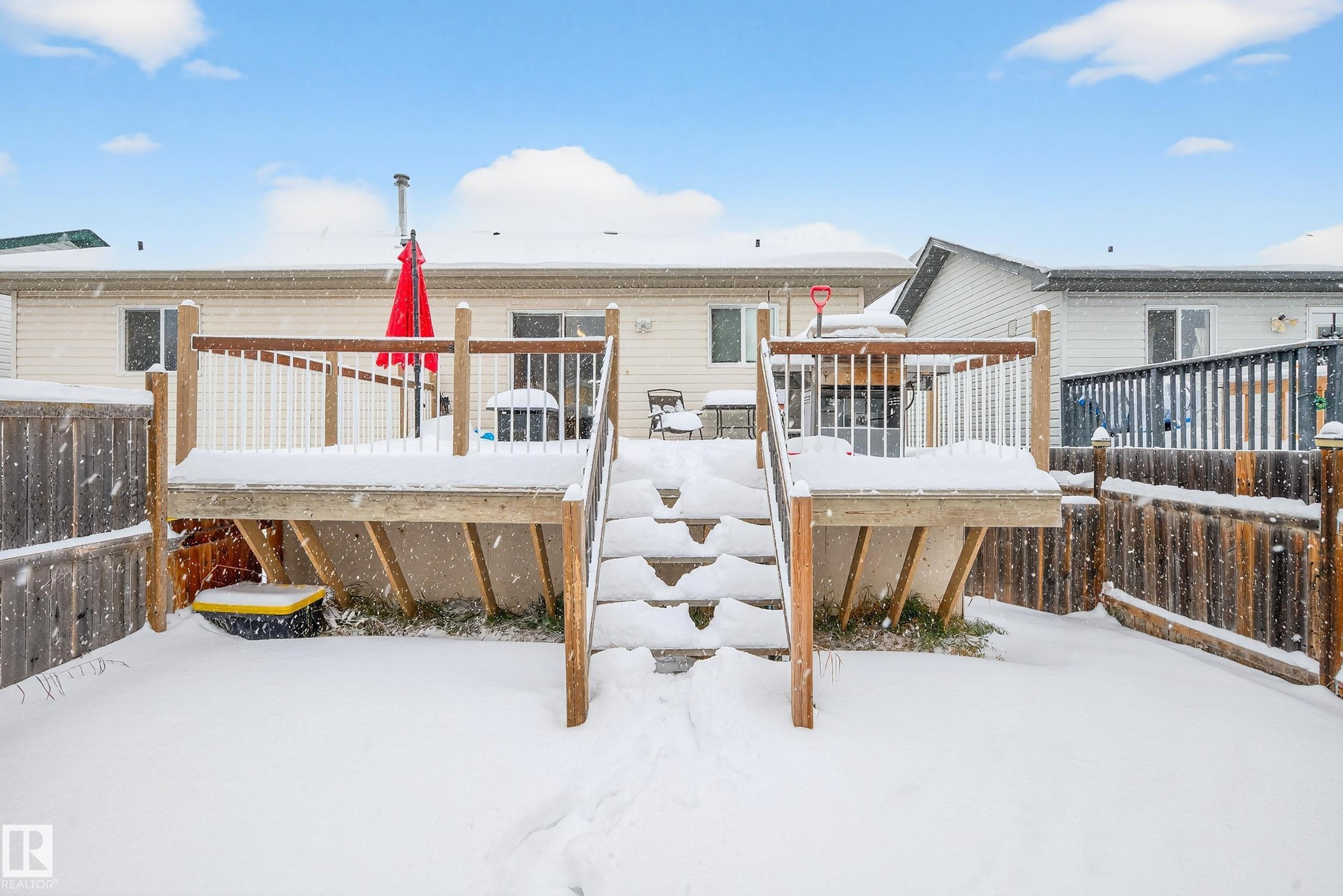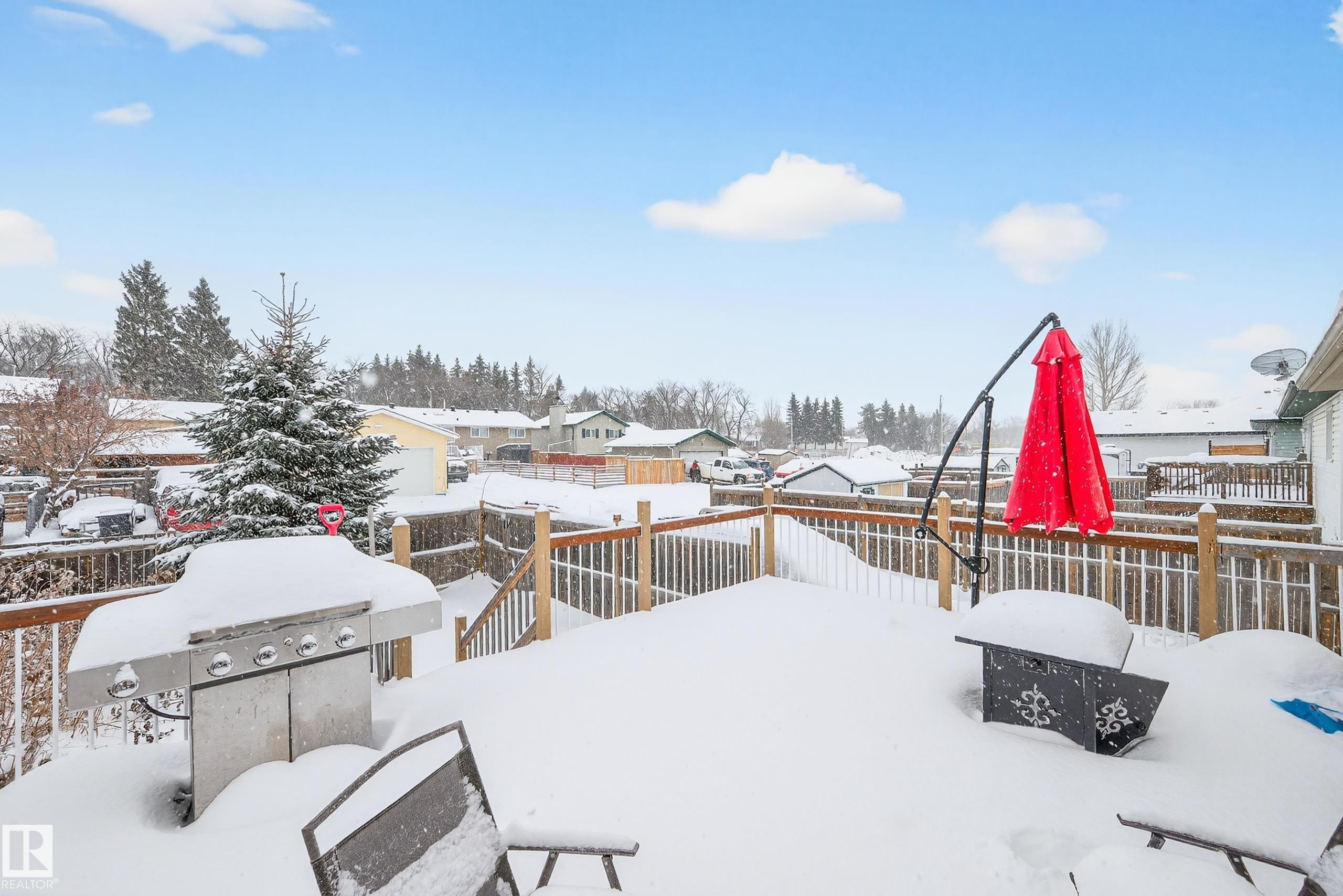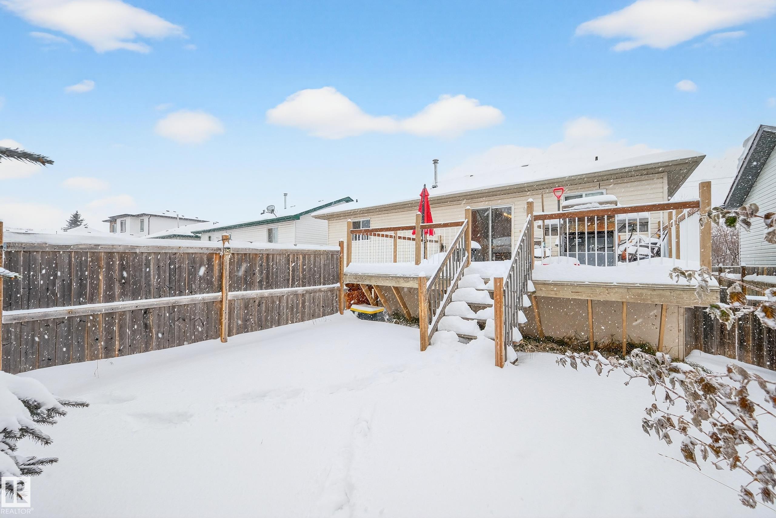 Welcome to this four-bedroom family home in a quiet, private setting backing onto Archie Jenkins Sports Field. The bi-level home features an open floor plan with a partially developed basement. The main floor features a spacious eat-in kitchen with a center island, ample cabinetry, and stainless-steel appliances. Patio doors off the kitchen lead to a large 20 x 15 deck with ample storage below. The bright living room overlooks the fully fenced backyard. Three bedrooms and a four-piece bathroom complete the main level. The lower level is partially developed with oversized windows, a fourth bedroom, a modern three-piece bathroom, a computer nook, and a large family room. Enjoy central AC and a designated alleyway parking pad. Conveniently located just a short 20-minute drive to CFB Edmonton.