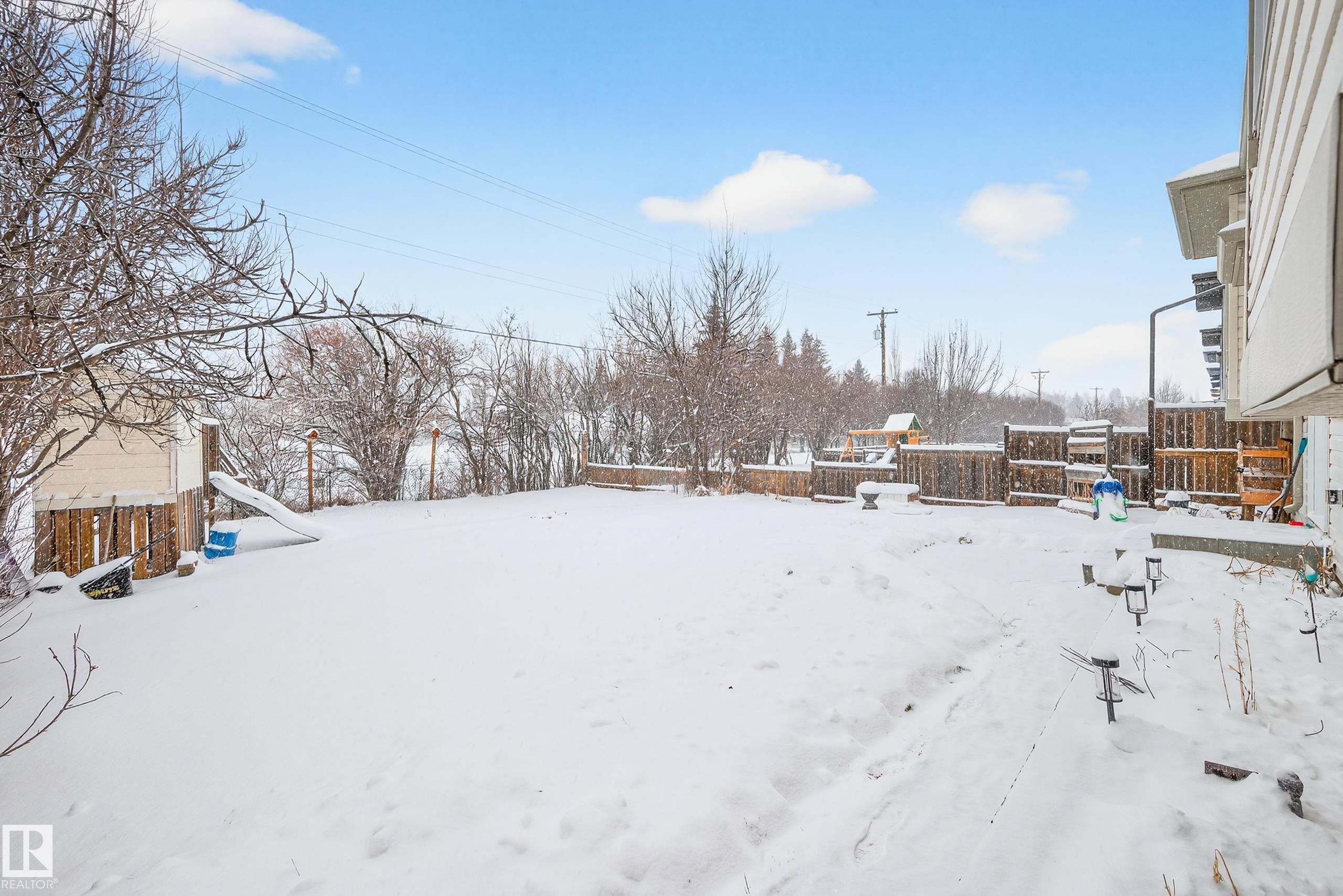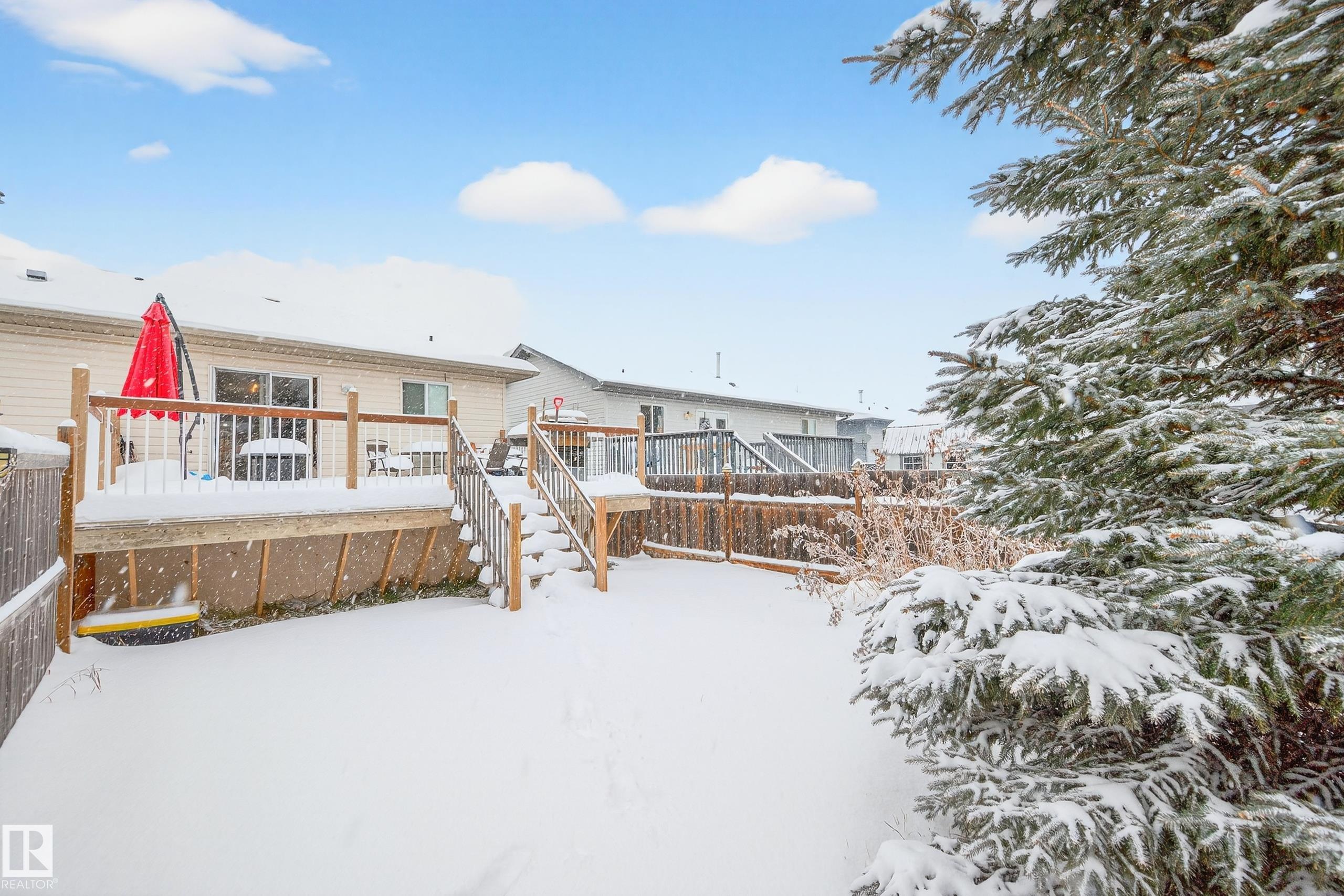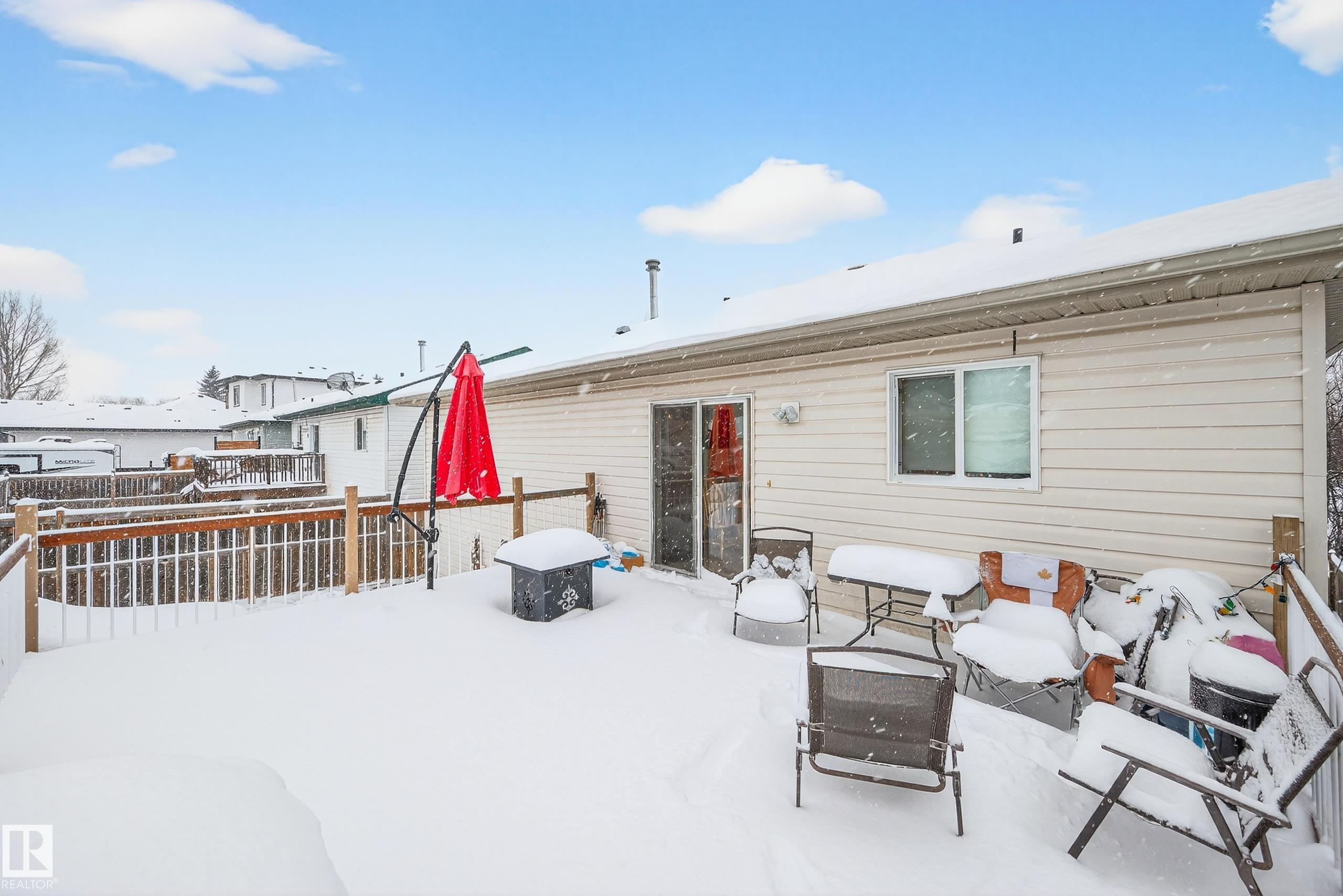 Welcome to this four-bedroom family home in a quiet, private setting backing onto Archie Jenkins Sports Field. The bi-level home features an open floor plan with a partially developed basement. The main floor features a spacious eat-in kitchen with a center island, ample cabinetry, and stainless-steel appliances. Patio doors off the kitchen lead to a large 20 x 15 deck with ample storage below. The bright living room overlooks the fully fenced backyard. Three bedrooms and a four-piece bathroom complete the main level. The lower level is partially developed with oversized windows, a fourth bedroom, a modern three-piece bathroom, a computer nook, and a large family room. Enjoy central AC and a designated alleyway parking pad. Conveniently located just a short 20-minute drive to CFB Edmonton.