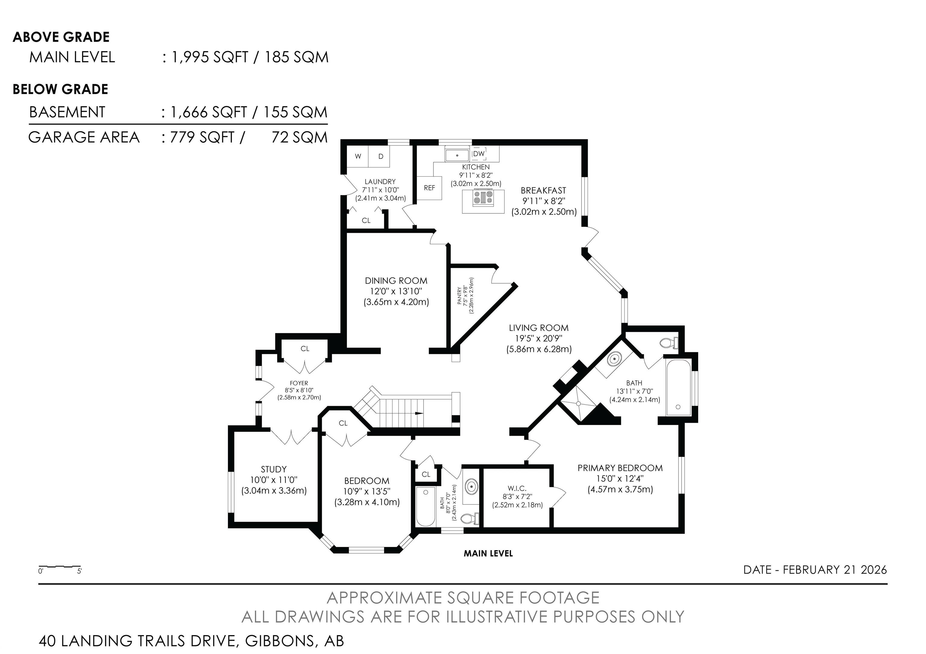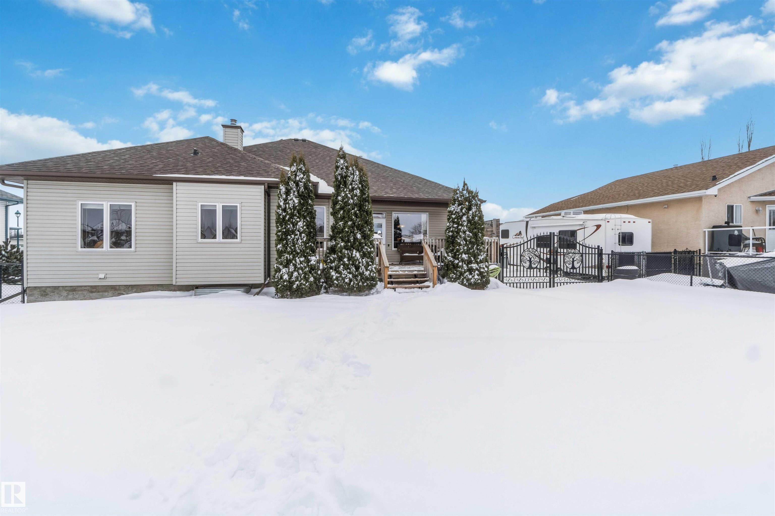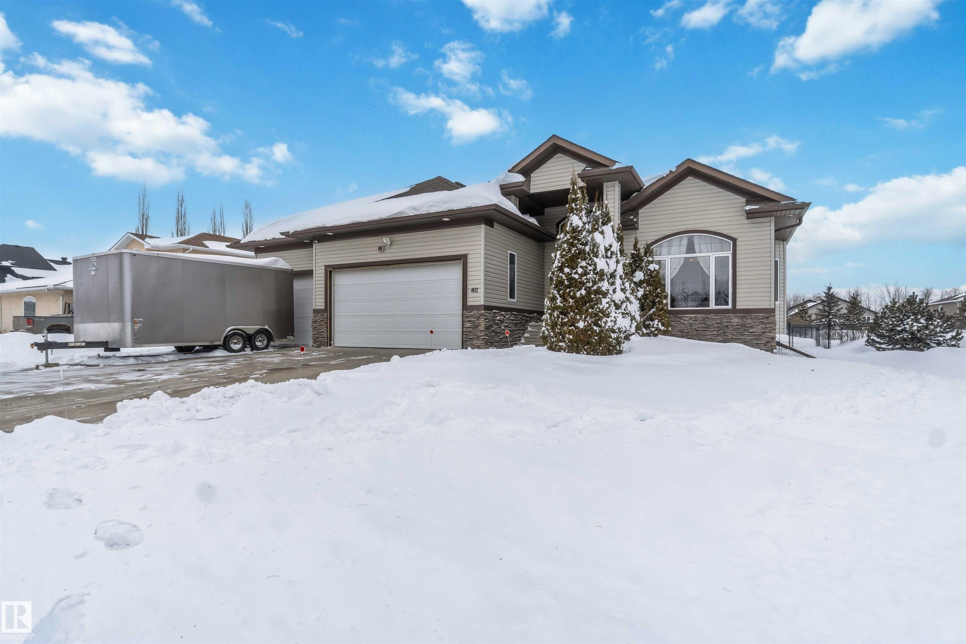 Look No Further! Welcome to 40 Landing Trails Dr in the Town of Gibbons. Stunning Bungalow on a 1/3+ acre lot with a Triple Heated Garage, large front driveway & over 2000sq ft of living space to enjoy! The main floor features 10ft ceilings, grand foyer, front den, living room with a gas FP & lots of natural light. Dining room, kitchen with cherry cabinets, granite countertops, island with an eat-up area, walk-in pantry, dining nook looking out to the private covered deck with natural gas for a bbq. The laundry room has access to the garage. 2 bedrooms, 4pc bathrooms, primary bedroom with a huge walk-in closet, 4pc ensuite & soaker tub. The finished basement boats a rec room, 2 more bedrooms, 3pc bathroom & storage room. 2019 50yr Shingles, 2021 HE Furnace & HE HWT, 2022 Central AC & Radiant Furnace in garage. Garage has 8ft doors, floor drain, hot/cold taps. New iron gates allows access to the huge fenced yard, storage shed, raised garden beds & fire pit area. Impressive Pride of Ownership Throughout!!