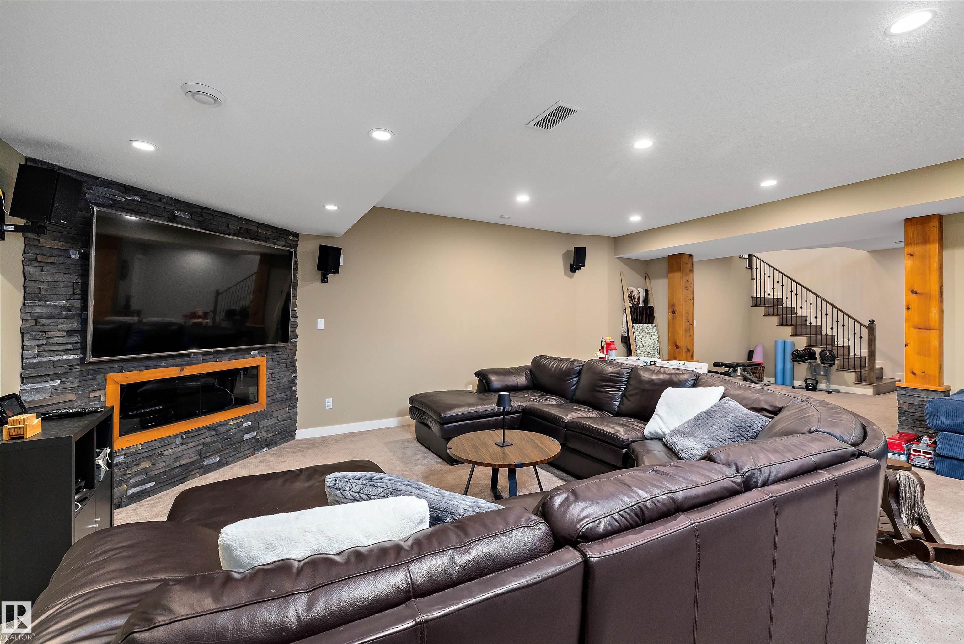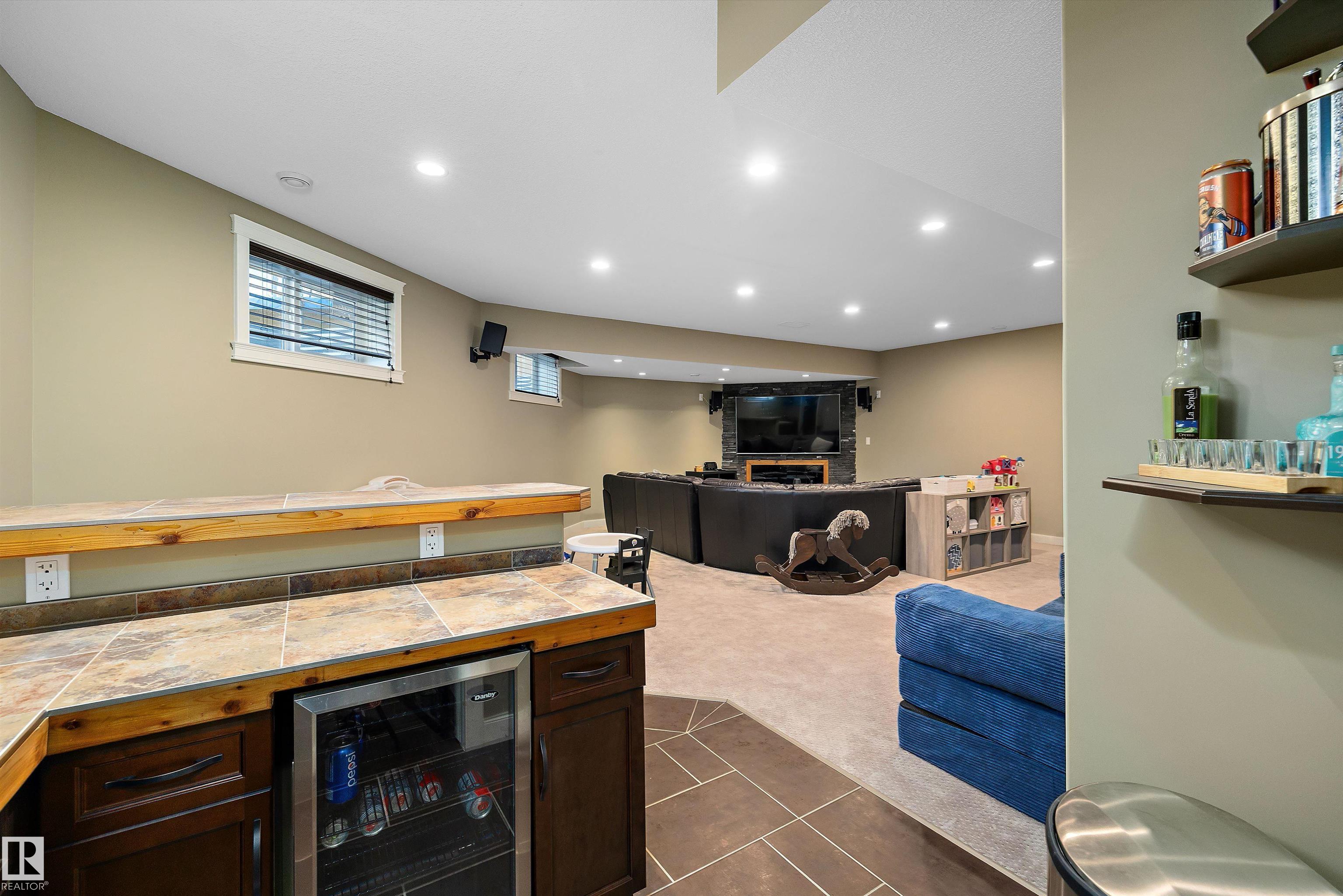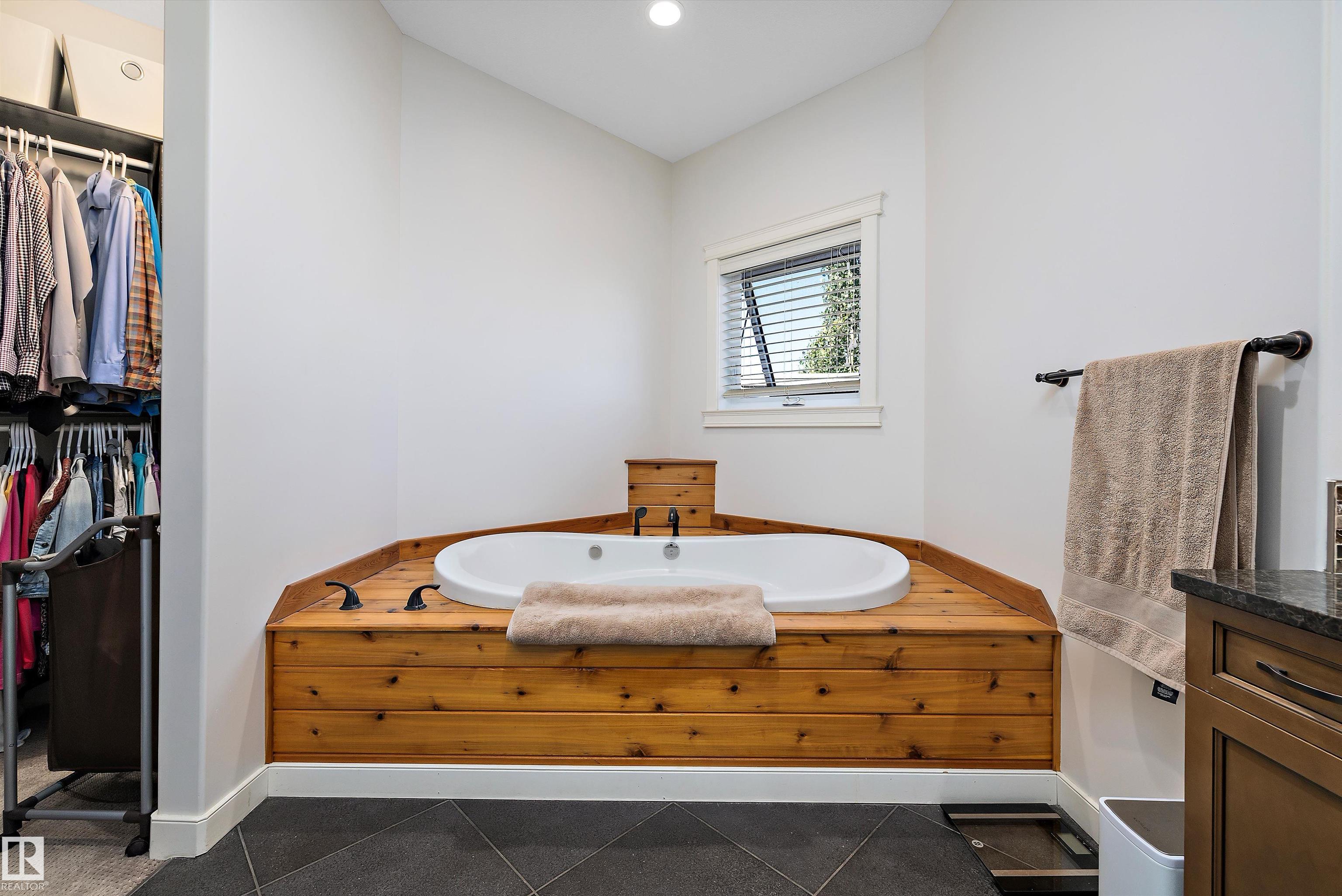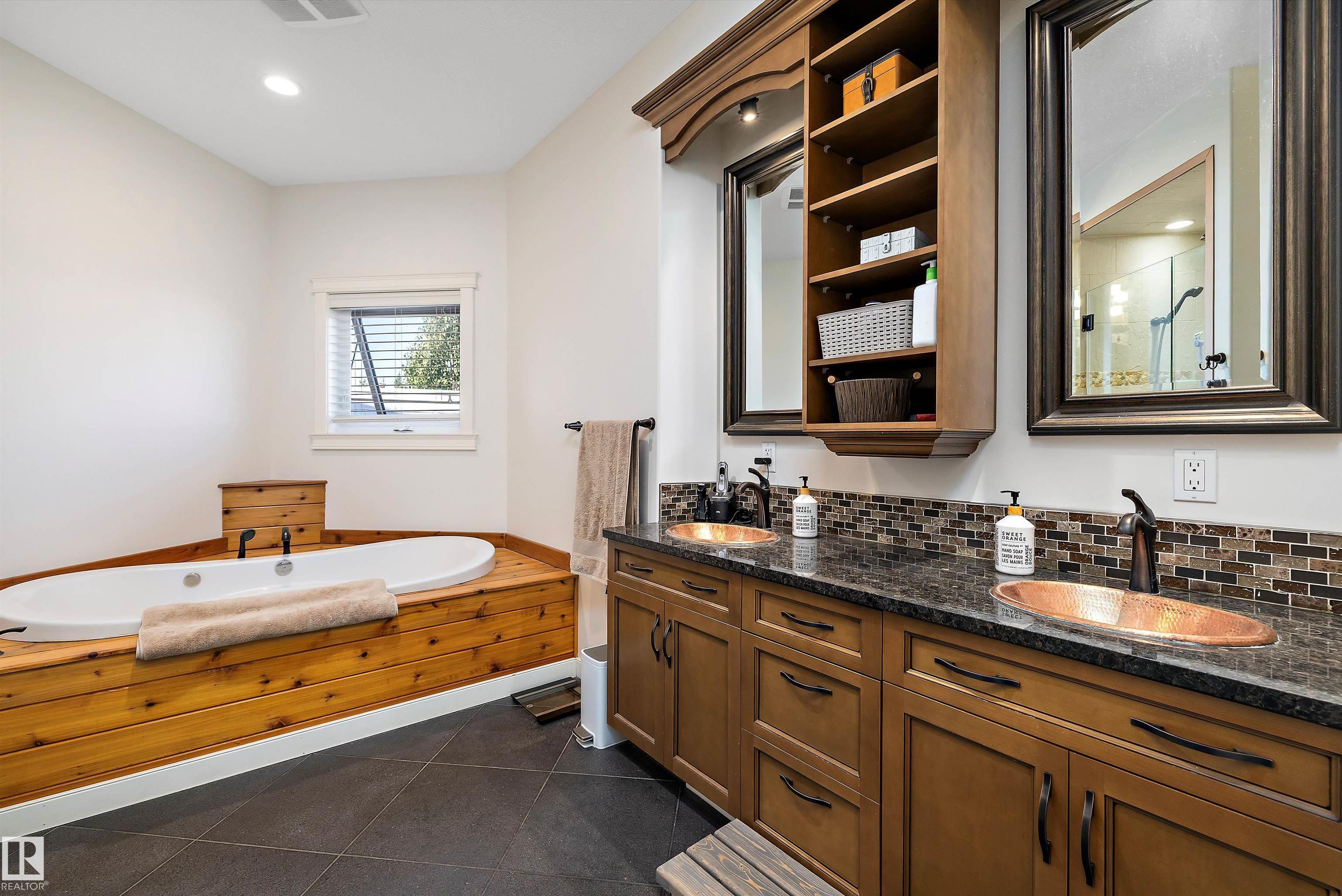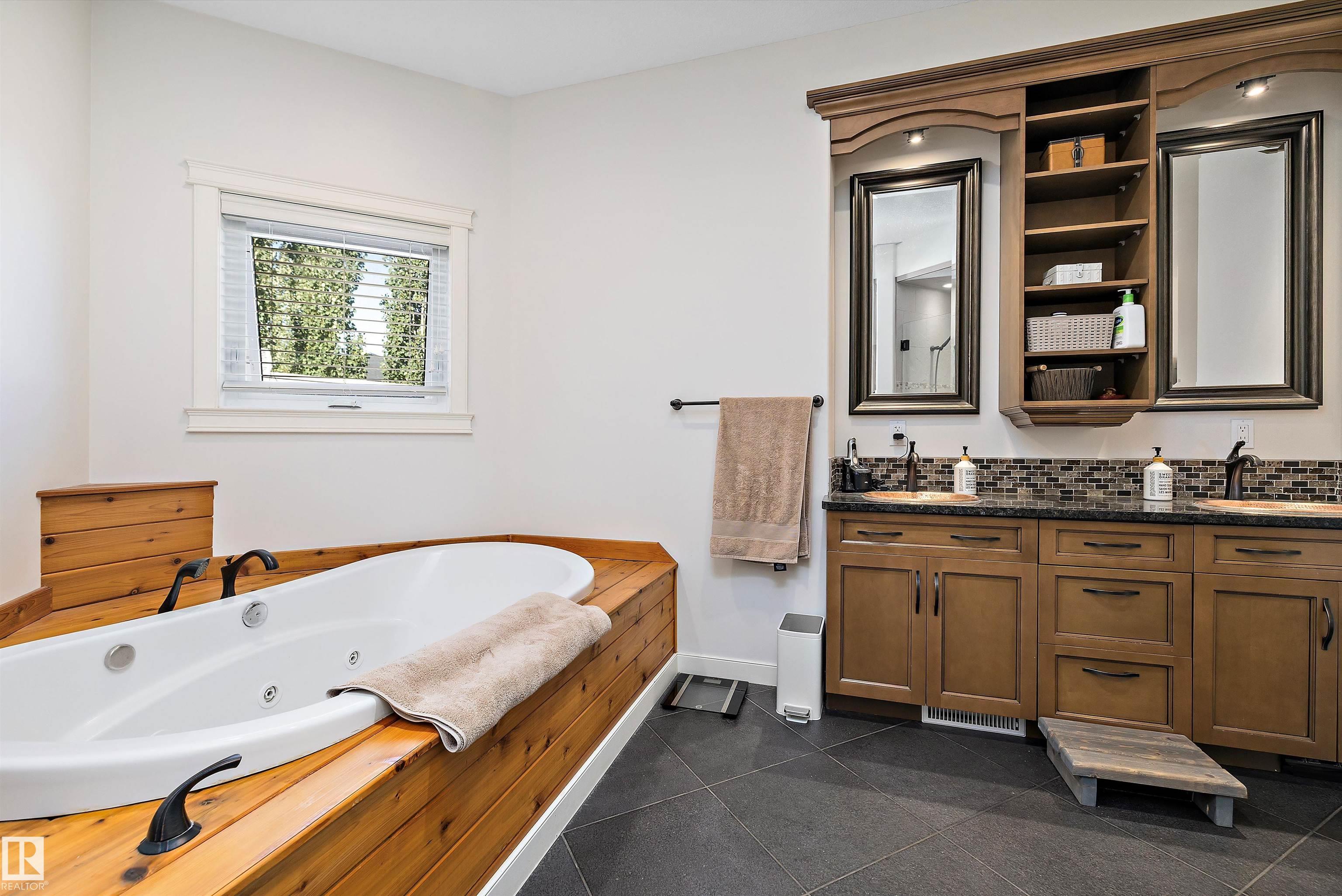 Enjoy elegant living in this Executive style Bungalow & appreciate all this custom built 1634sq.ft home has to offer. Situated in a quiet cul-de-sac, this home features, hand-scraped walnut hardwood flooring, porcelain tile, 9ft ceilings, central air, Hunter Douglas blinds & stunning rock-faced gas fireplace. The gourmet kitchen offers, large island w/breakfast bar, walk-through pantry, maple cabinets & granite countertops. Large master bdrm w/walk-in closet & ensuite w/ custom built shower, double vanity w/ hammered copper sinks & cedar surround Jacuzzi tub. A 2nd bdrm, den & full 4pc bath complete the main level. Fully finished basement w/entertainment space & a rock faced featured wall, wet bar & custom built iron door leading to a future wine cellar room, in floor heating, bathroom, 2 large bdrms w/walk-in closets & laundry room. A handy man's paradise w/the oversized garage w./12.5ft ceilings, in-floor heating, & built in workspace. The backyard has a partially covered cedar deck and RV parking.