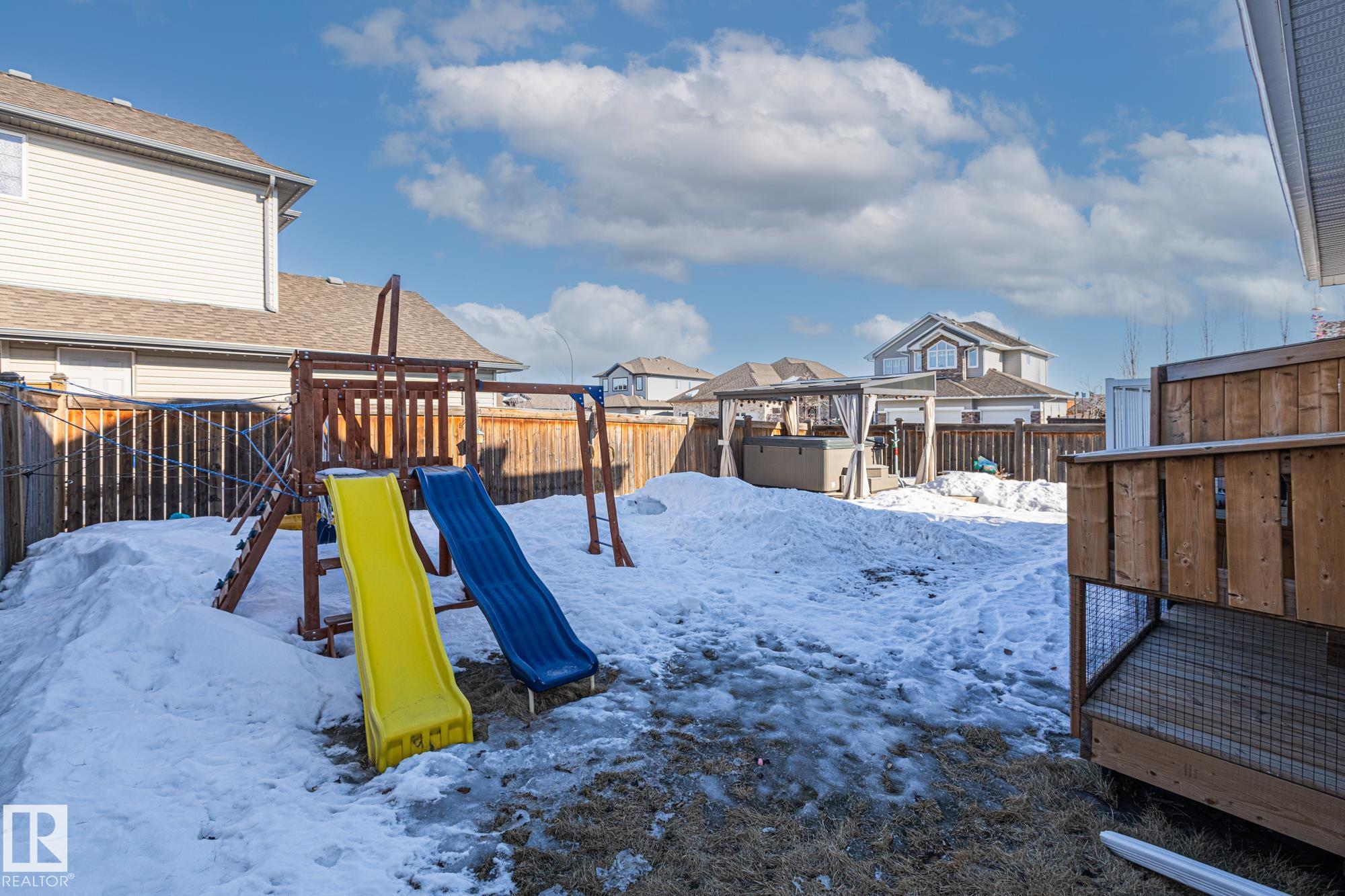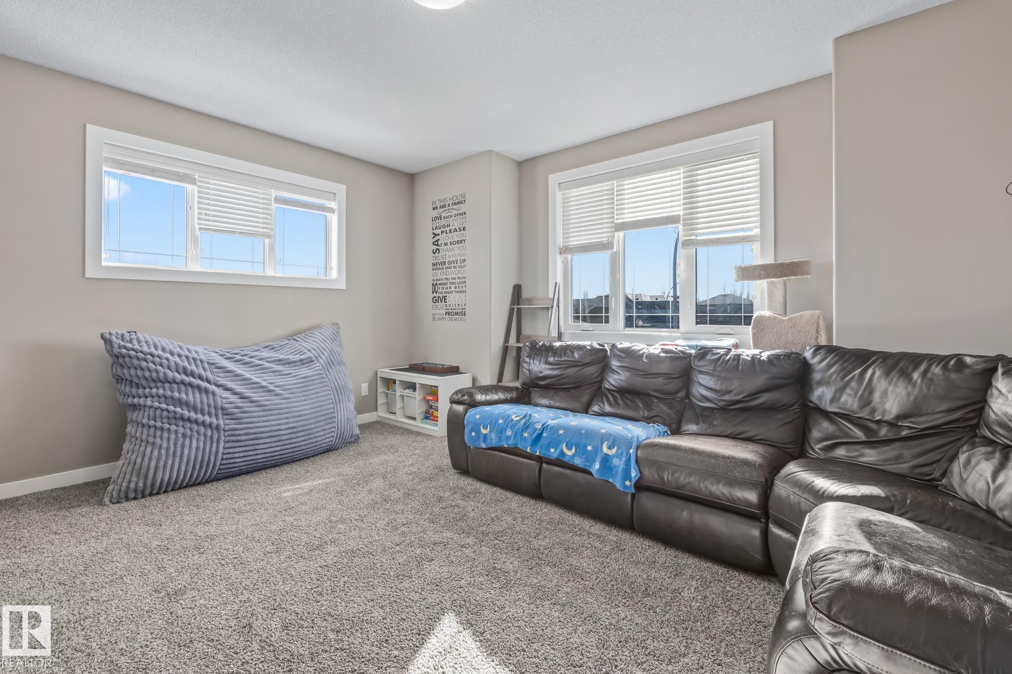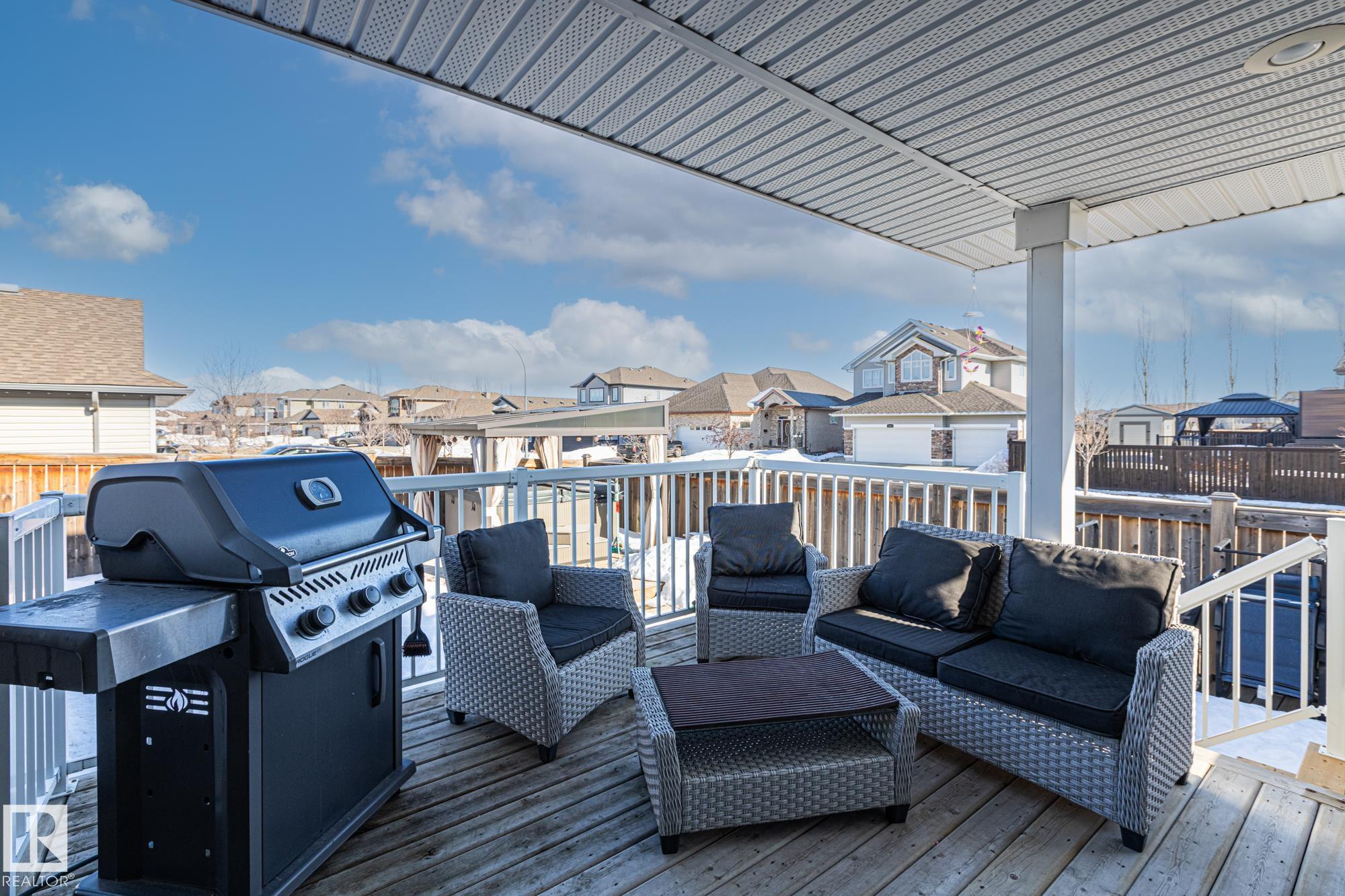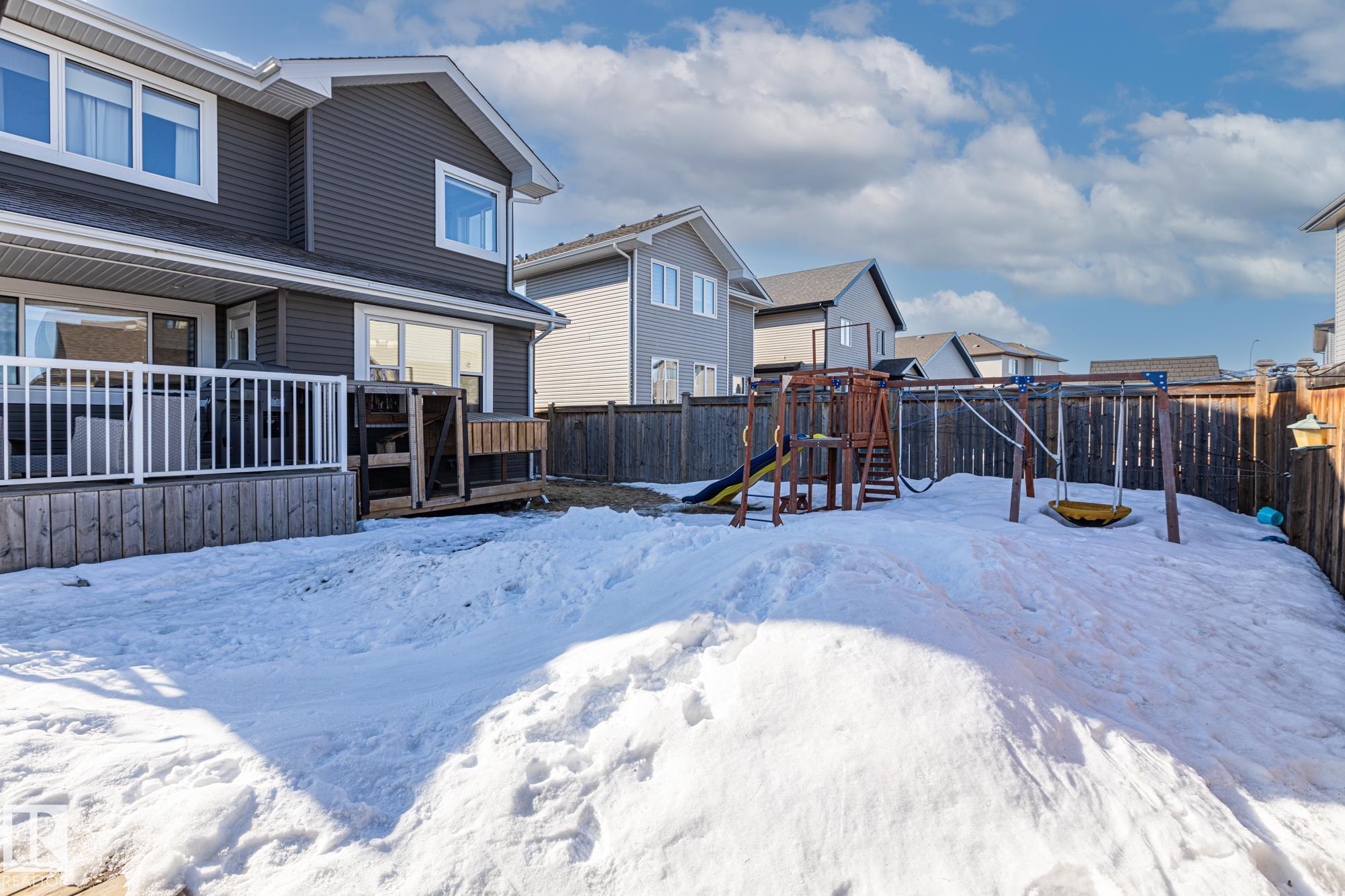 Welcome to this perfect home tucked away on a quiet street in the community of Morinville! Offering 4 beds + den and 4 bath, this well-designed home provides plenty of room for a growing family. The main floor features an open-concept layout with cherry cabinetry, granite, and S/S appliances in the kitchen. The bright living room is warm with a cozy gas fireplace and low-maintenance hardwood flooring. Convenient main floor laundry and a 2pce powder room complete this level. Upstairs, you'll find a huge bonus room, perfect for movie nights with the family. The spacious primary bedroom includes a W/I closet and spa-like ensuite, while two additional bedrooms and a full bathroom provide comfortable space for family. The fully finished basement adds even more versatility with a bedroom, den, rec room, and a beautifully renovated 3pce bath featuring heated floors (2025). Step outside to enjoy the fully fenced backyard and fantastic deck, ideal for relaxing. Upgrades: NEW WINDOWS (2024) and newer dishwasher.