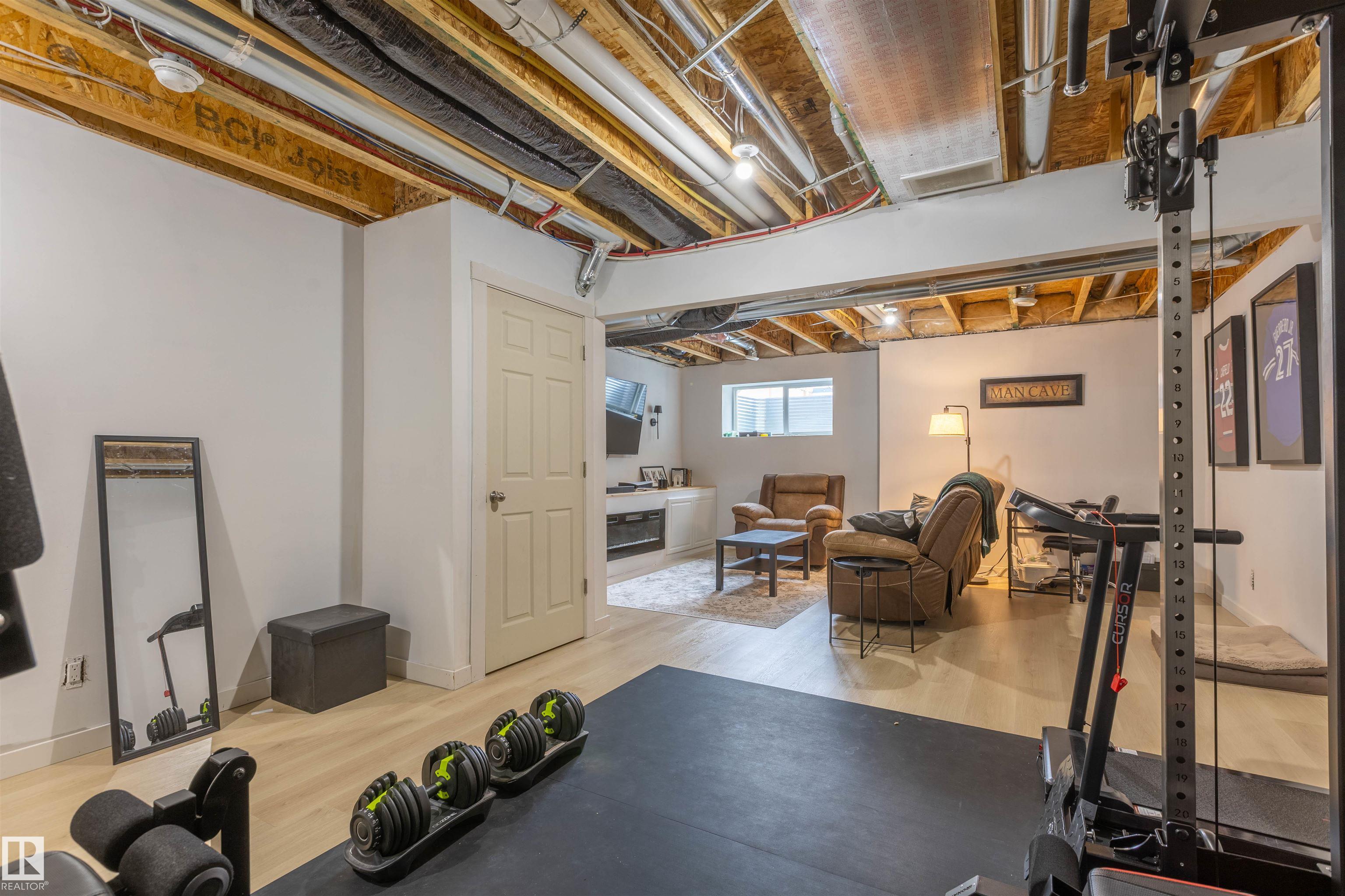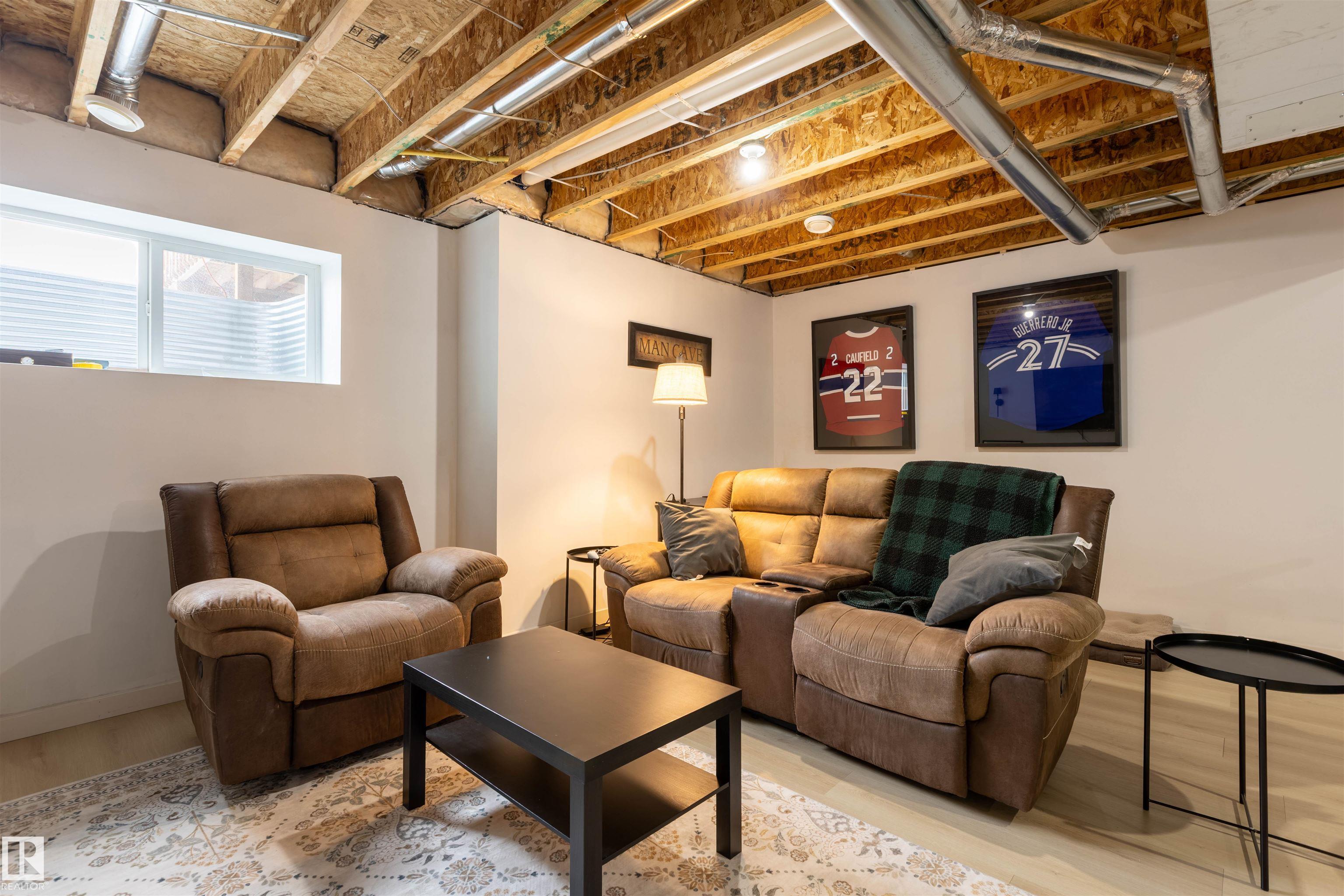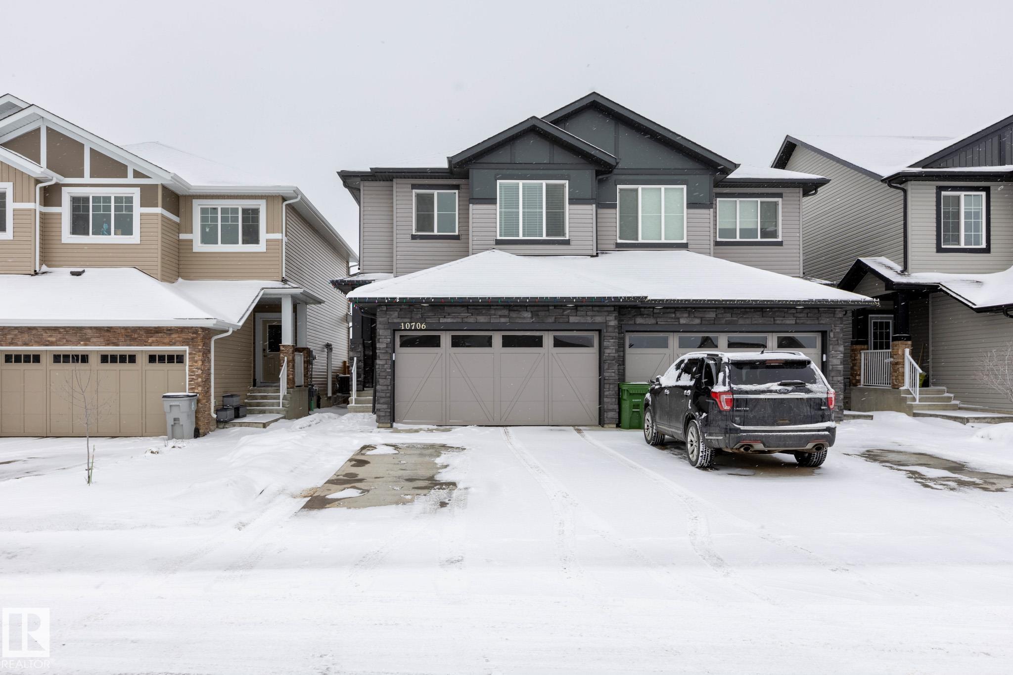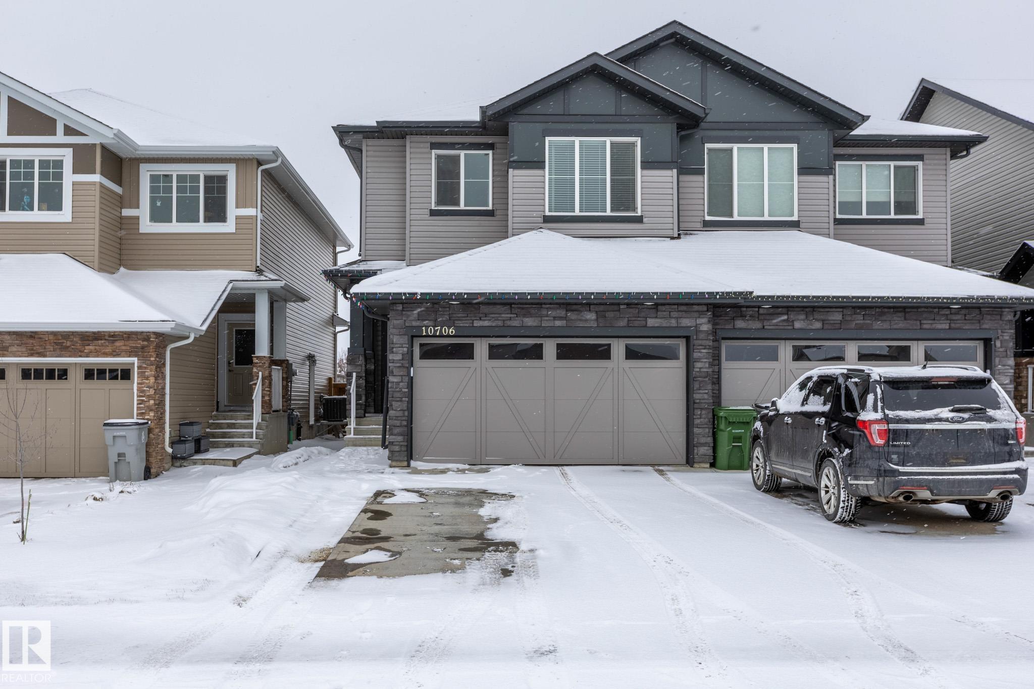 Welcome to this like new half duplex in Morinville, offering small-town living with quick access to city amenities and CFB Edmonton. The open concept main floor features a modern kitchen with quartz countertops, a walk-in pantry, and plenty of workspace, flowing into the dining and living area with an upgraded fireplace and mantel. Step outside to enjoy the natural gas BBQ hookup. Upstairs includes a spacious primary bedroom with a 4 piece ensuite and walk in closet, plus two additional bedrooms and a convenient laundry room with sink and cabinetry. The basement offers a separate side entrance and finished entertainment space. Complete with A/C and a double attached garage.