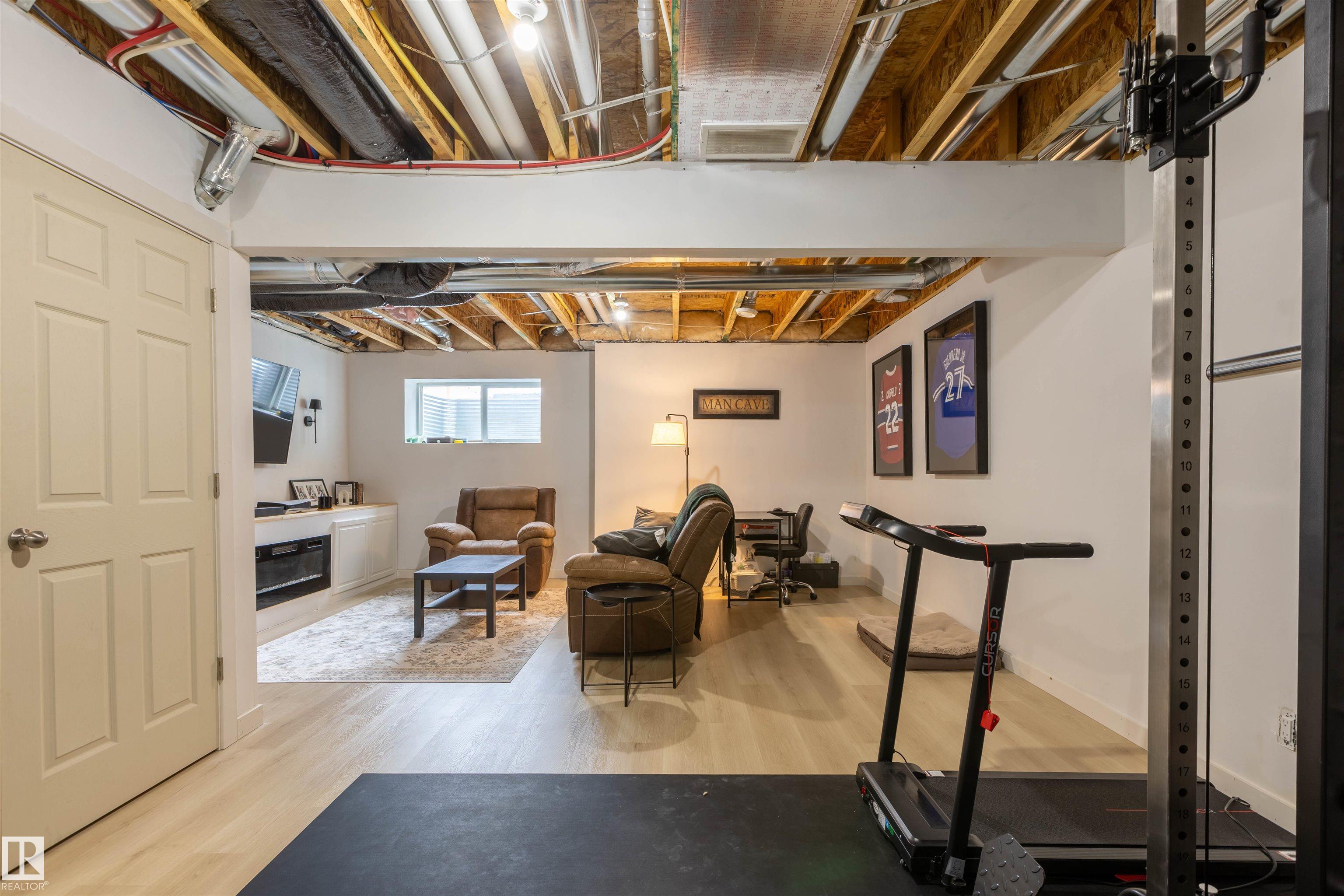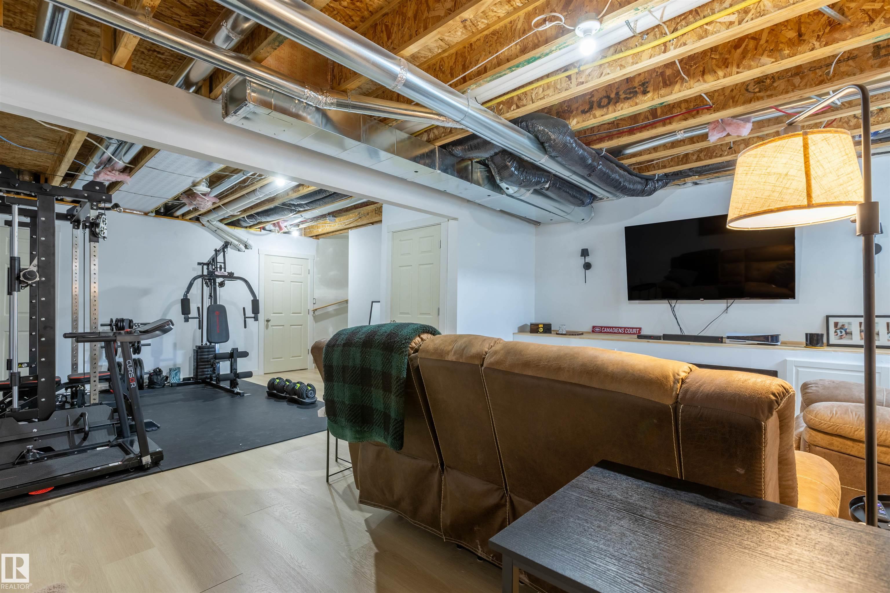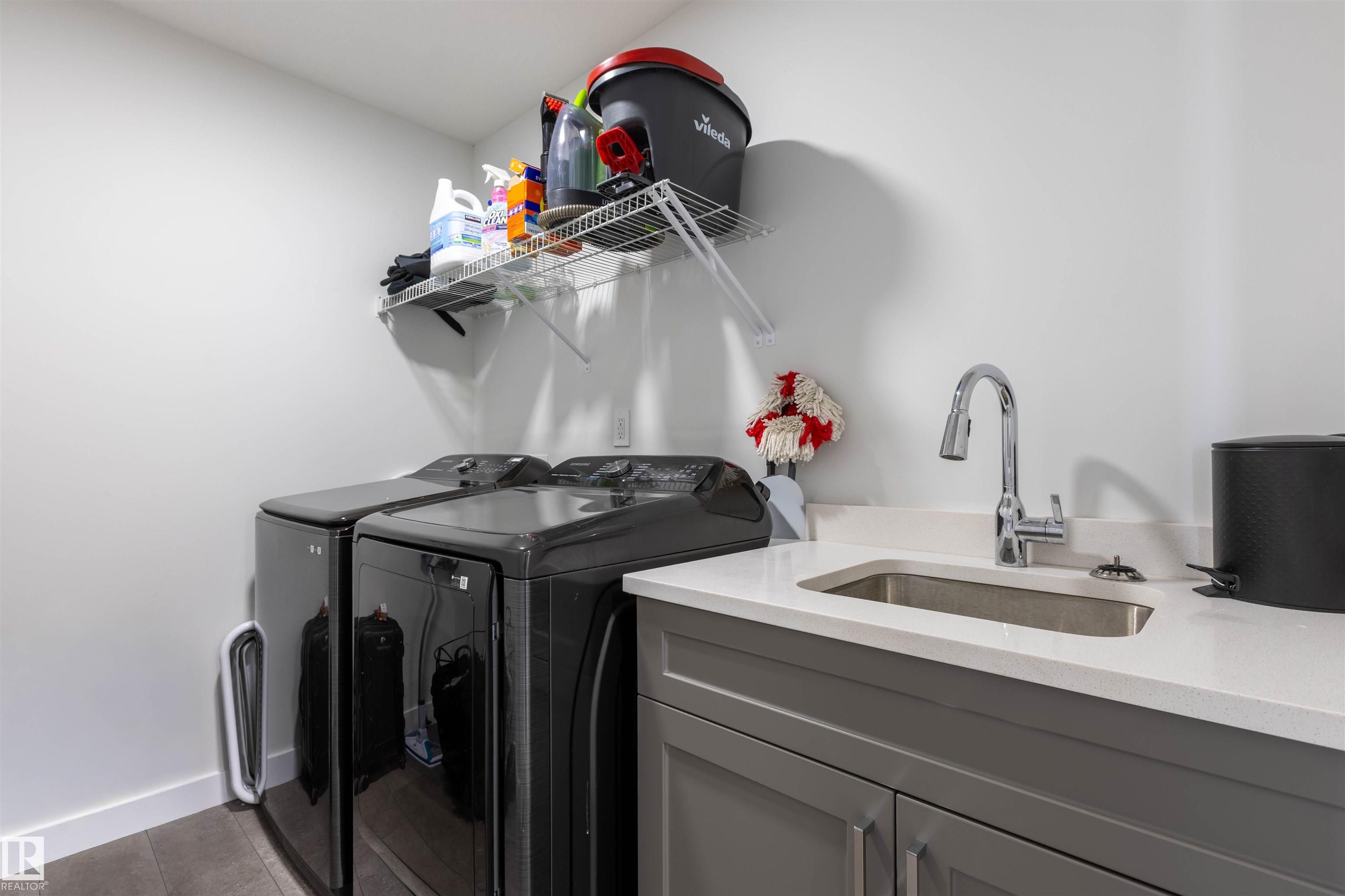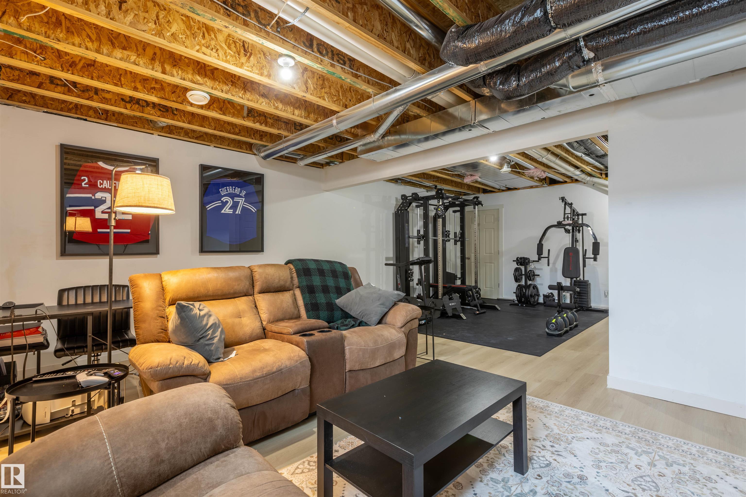 Welcome to this like new half duplex in Morinville, offering small-town living with quick access to city amenities and CFB Edmonton. The open concept main floor features a modern kitchen with quartz countertops, a walk-in pantry, and plenty of workspace, flowing into the dining and living area with an upgraded fireplace and mantel. Step outside to enjoy the natural gas BBQ hookup. Upstairs includes a spacious primary bedroom with a 4 piece ensuite and walk in closet, plus two additional bedrooms and a convenient laundry room with sink and cabinetry. The basement offers a separate side entrance and finished entertainment space. Complete with A/C and a double attached garage.