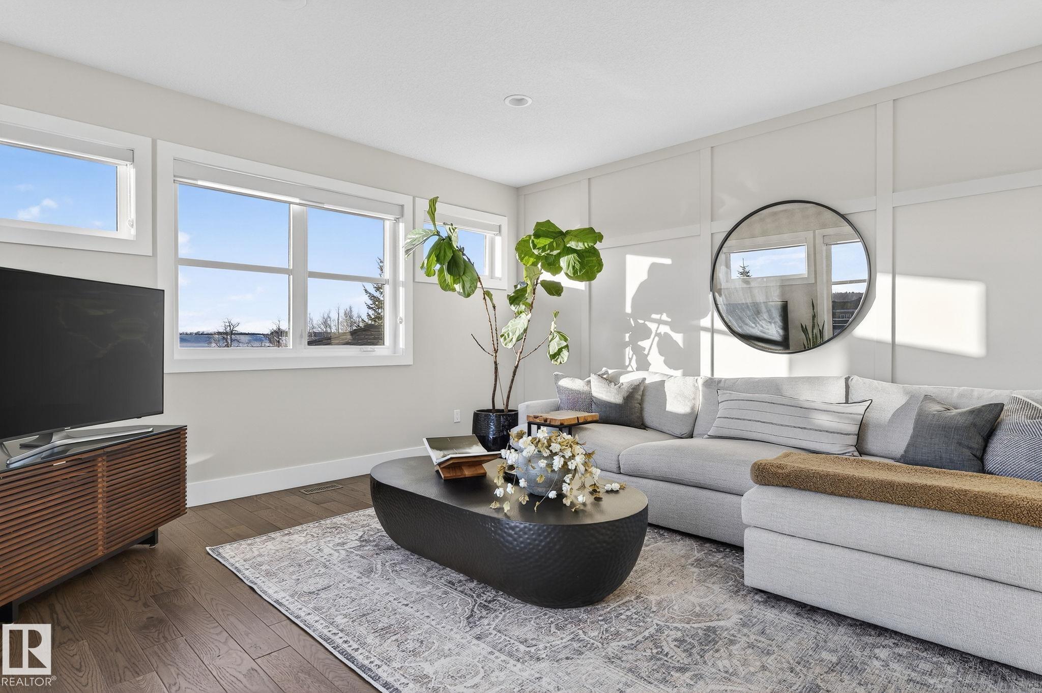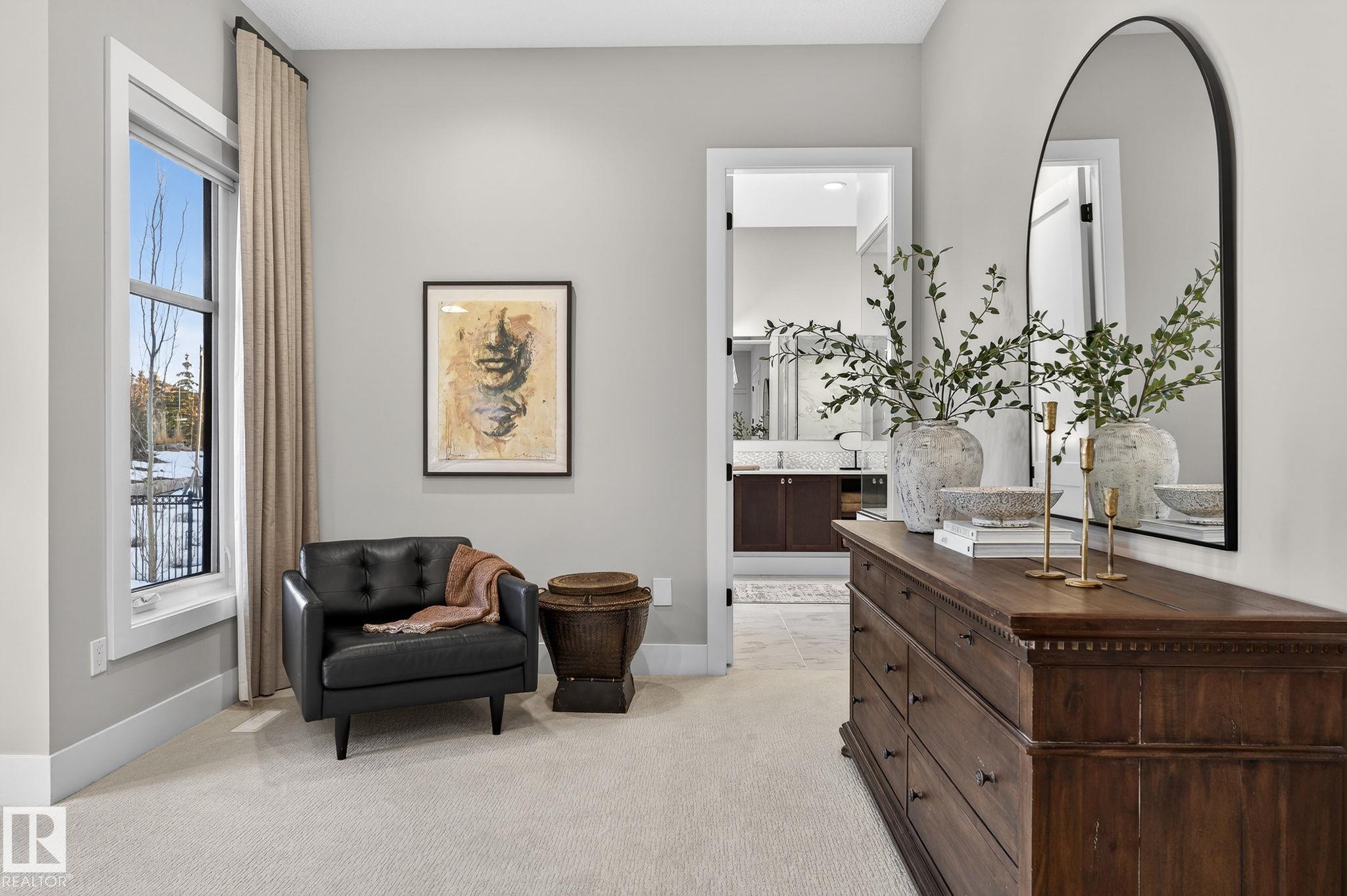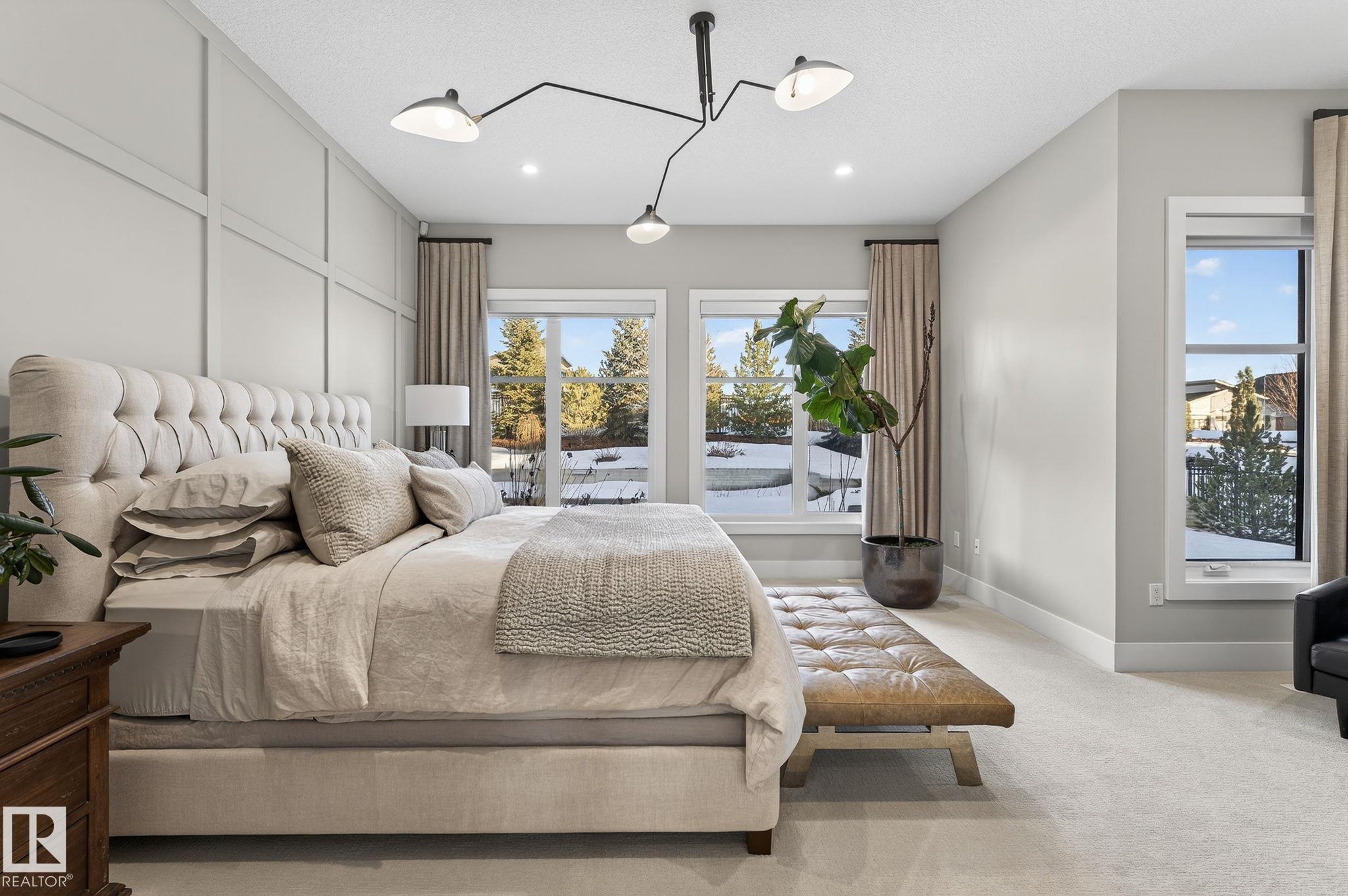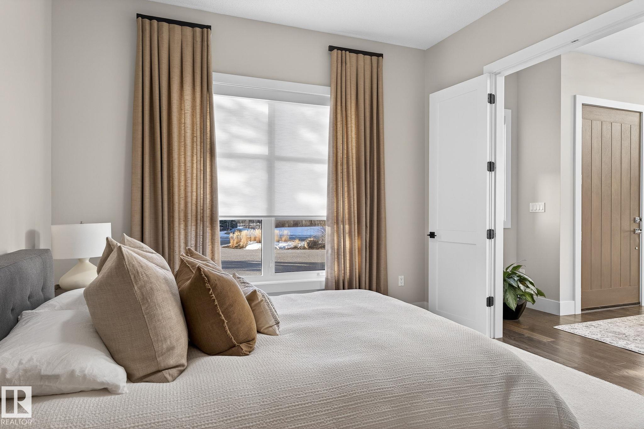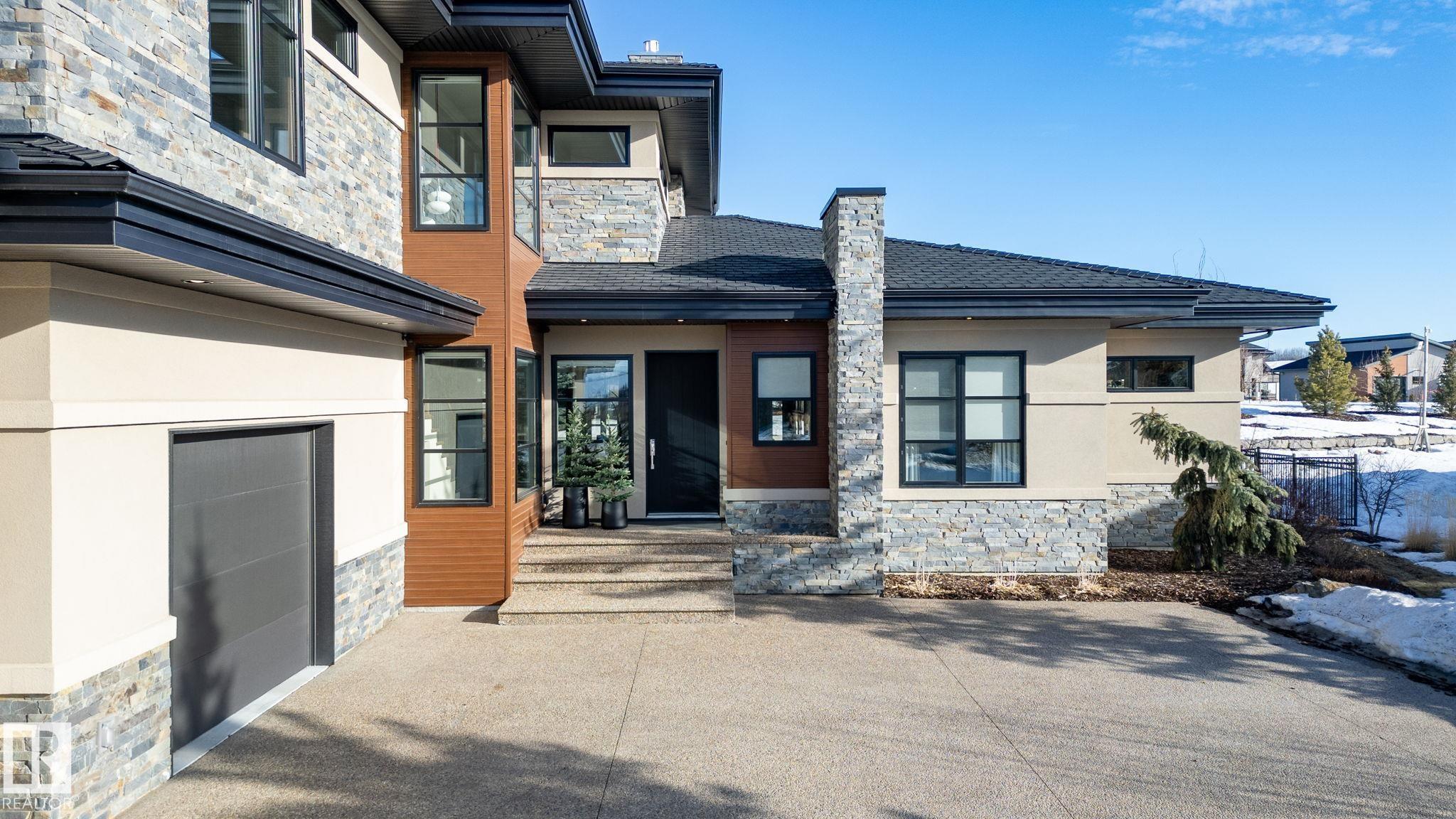 Nestled on a private, sprawling property in Rural Sturgeon County, this luxurious executive bungalow offers over 5,400 sq ft of thoughtfully designed living space, combining elegance with functionality. The open-concept main floor features soaring ceilings, a sun-filled great room with floor-to-ceiling windows, and a striking fireplace. The chef-inspired kitchen boasts quartz counters, professional-grade appliances, custom cabinetry, and a walk-through pantry. The primary retreat includes a spa-like ensuite with a soaker tub, dual vanities, a walk-in shower, and a custom closet. A second bedroom with ensuite, mudroom, and laundry complete the main level. The lower level features two bedrooms, a Jack-and-Jill bath, expansive family room with wet bar, gym, and storage. Outdoors, landscaped grounds, tiered patios, and a triple garage with workshop offer the perfect blend of luxury, privacy, and country living minutes from St. Albert and Edmonton.