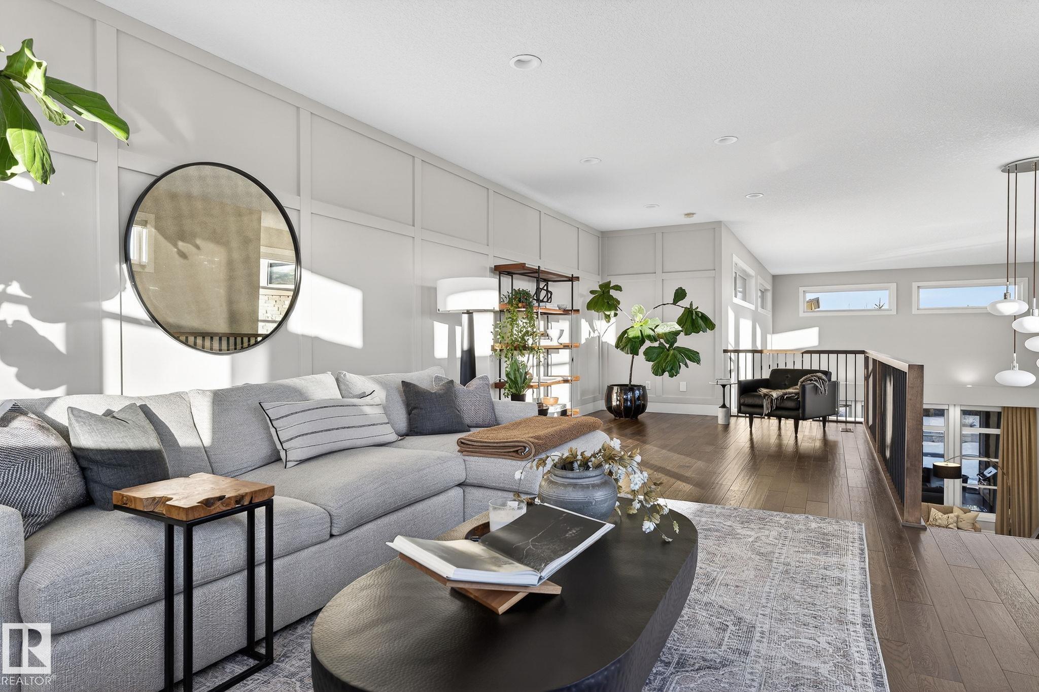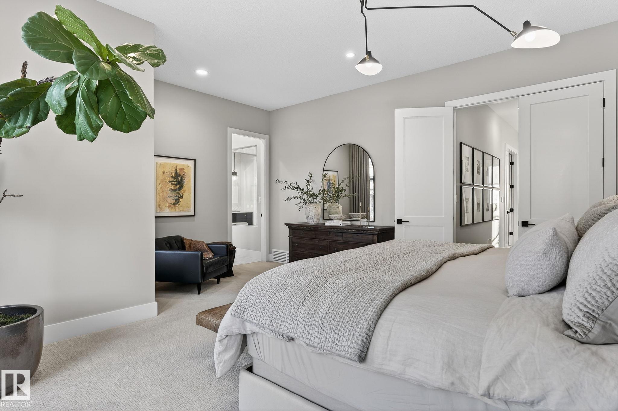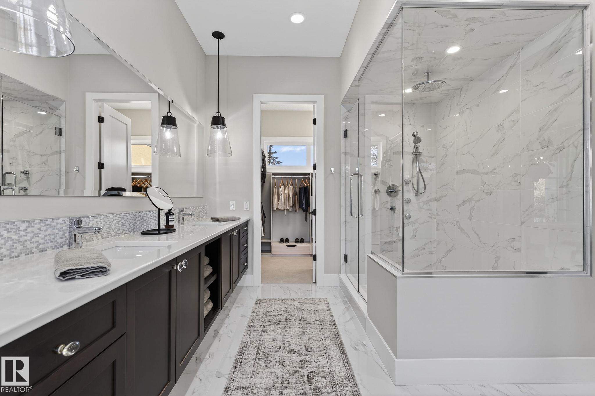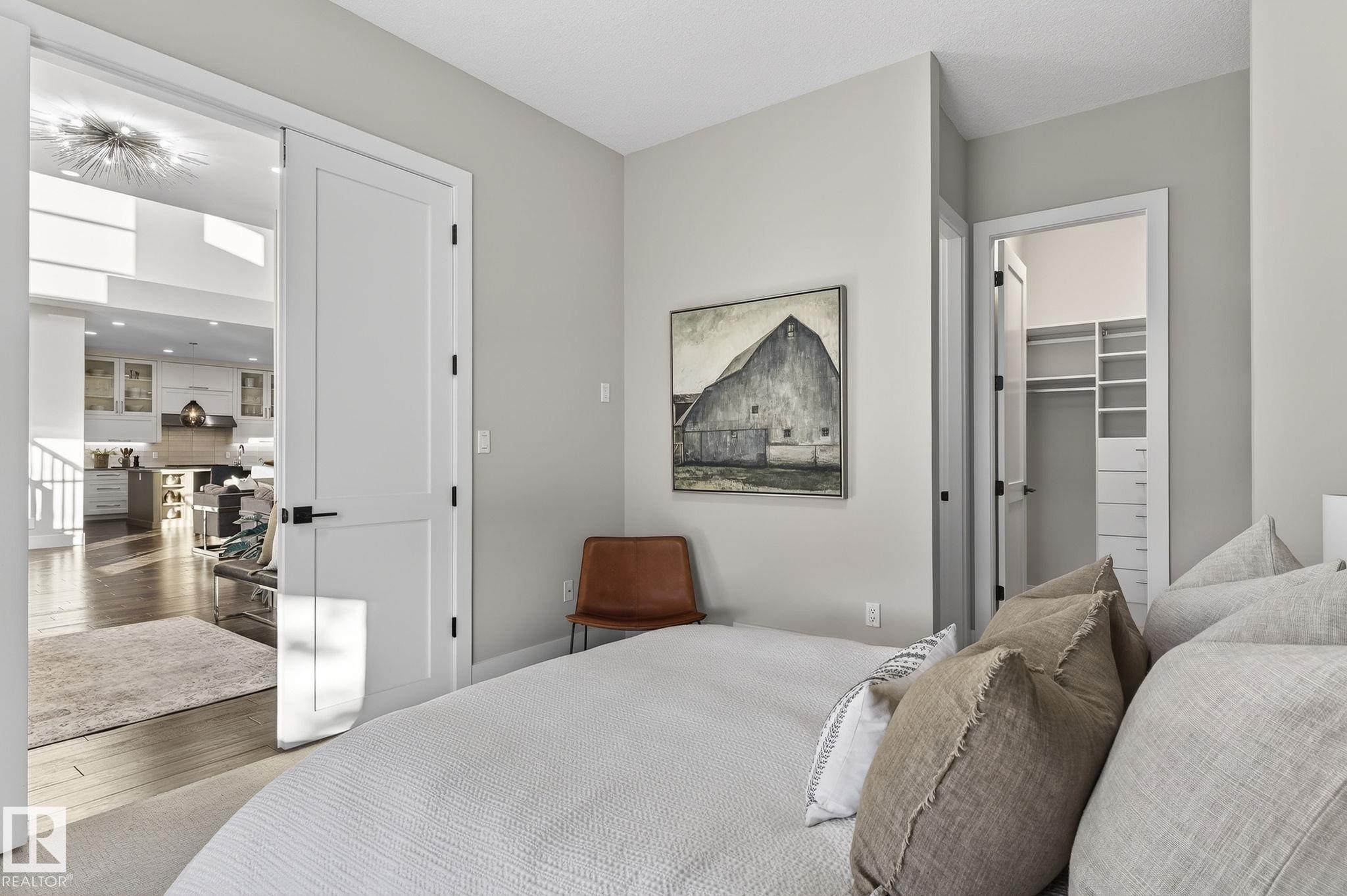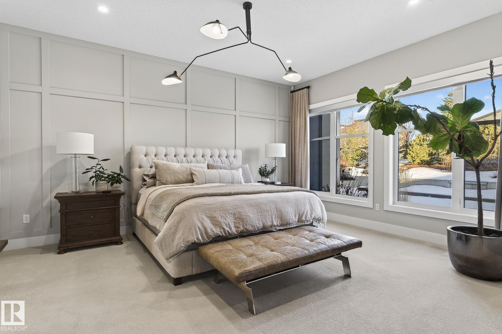 Nestled on a private, sprawling property in Rural Sturgeon County, this luxurious executive bungalow offers over 5,400 sq ft of thoughtfully designed living space, combining elegance with functionality. The open-concept main floor features soaring ceilings, a sun-filled great room with floor-to-ceiling windows, and a striking fireplace. The chef-inspired kitchen boasts quartz counters, professional-grade appliances, custom cabinetry, and a walk-through pantry. The primary retreat includes a spa-like ensuite with a soaker tub, dual vanities, a walk-in shower, and a custom closet. A second bedroom with ensuite, mudroom, and laundry complete the main level. The lower level features two bedrooms, a Jack-and-Jill bath, expansive family room with wet bar, gym, and storage. Outdoors, landscaped grounds, tiered patios, and a triple garage with workshop offer the perfect blend of luxury, privacy, and country living minutes from St. Albert and Edmonton.