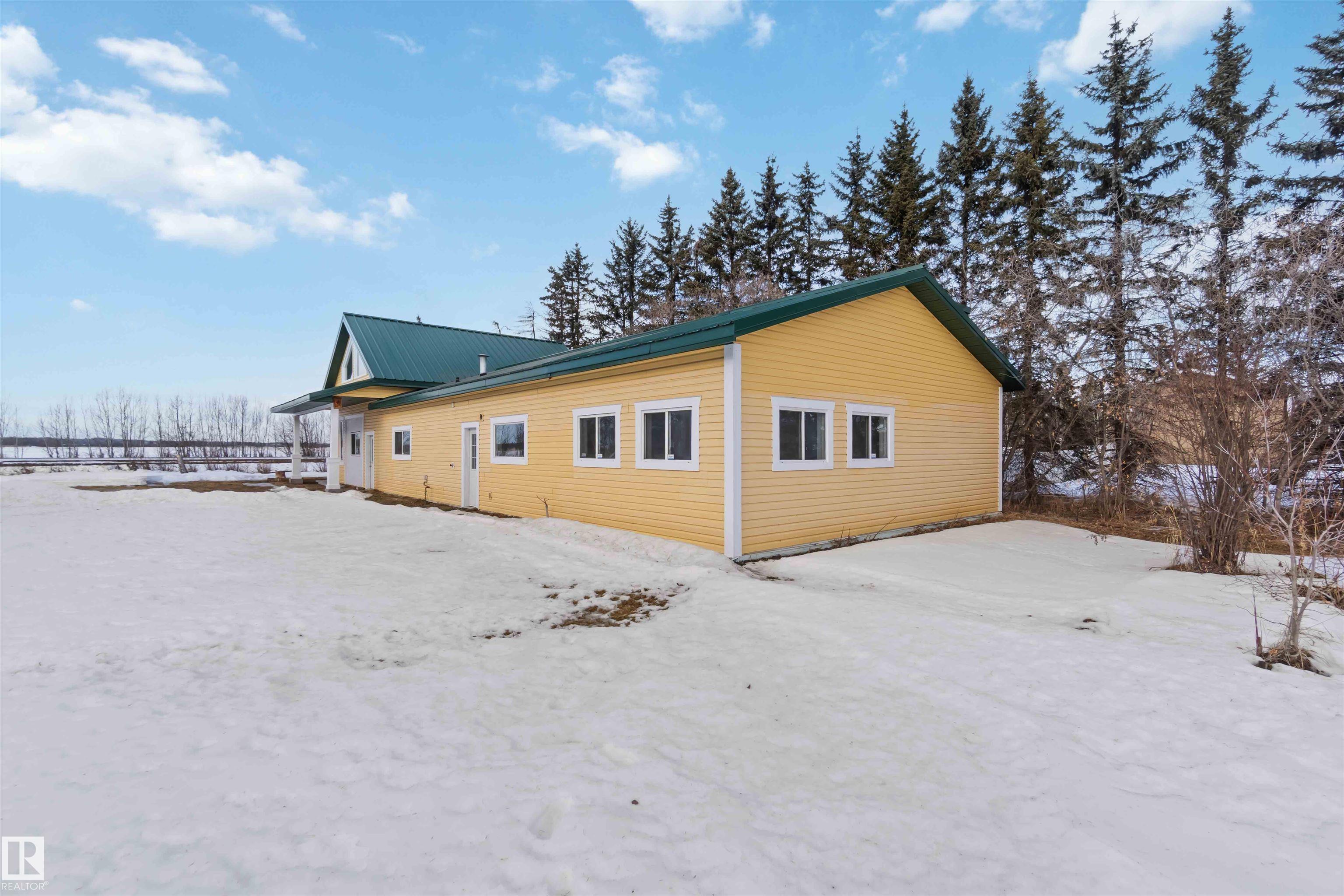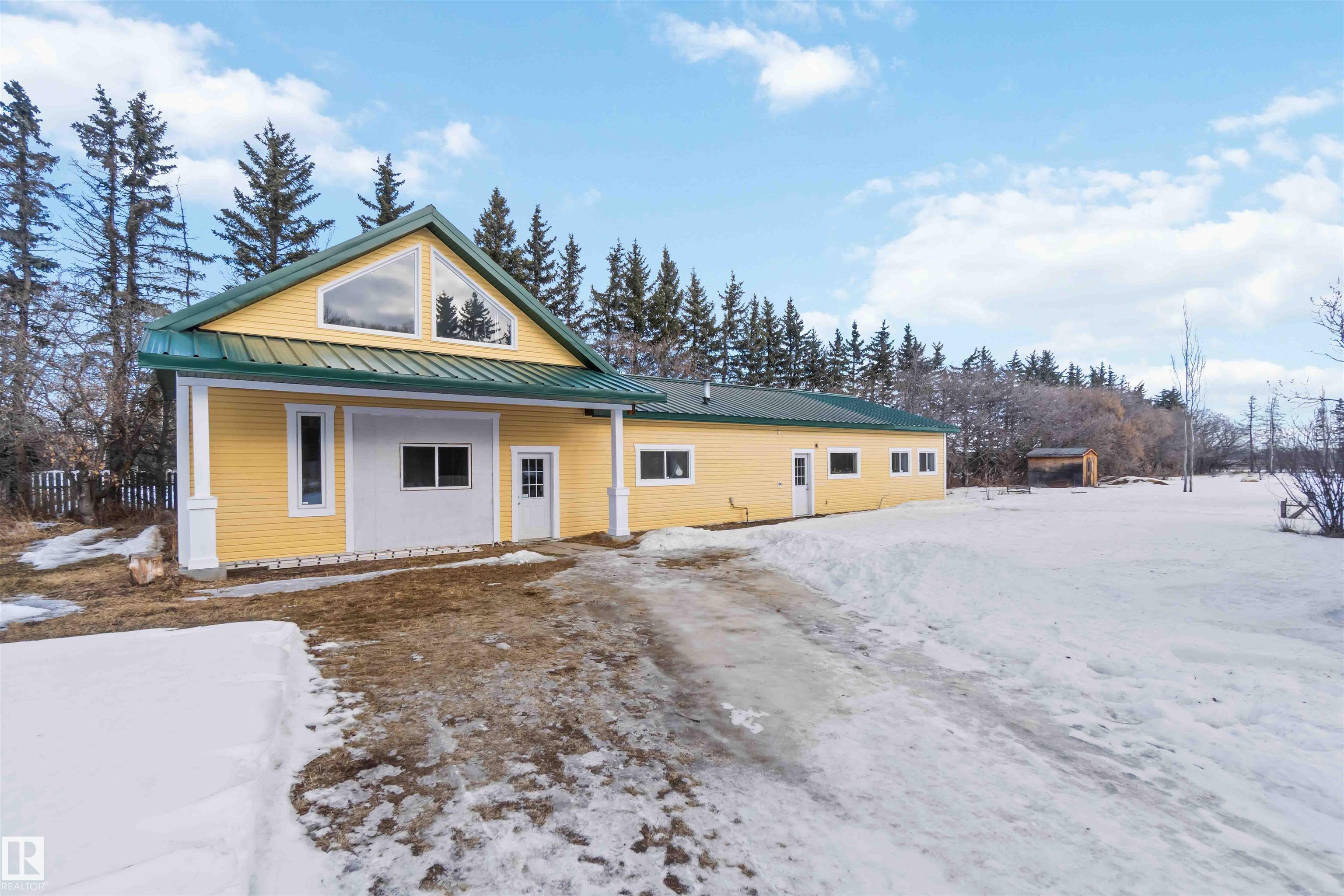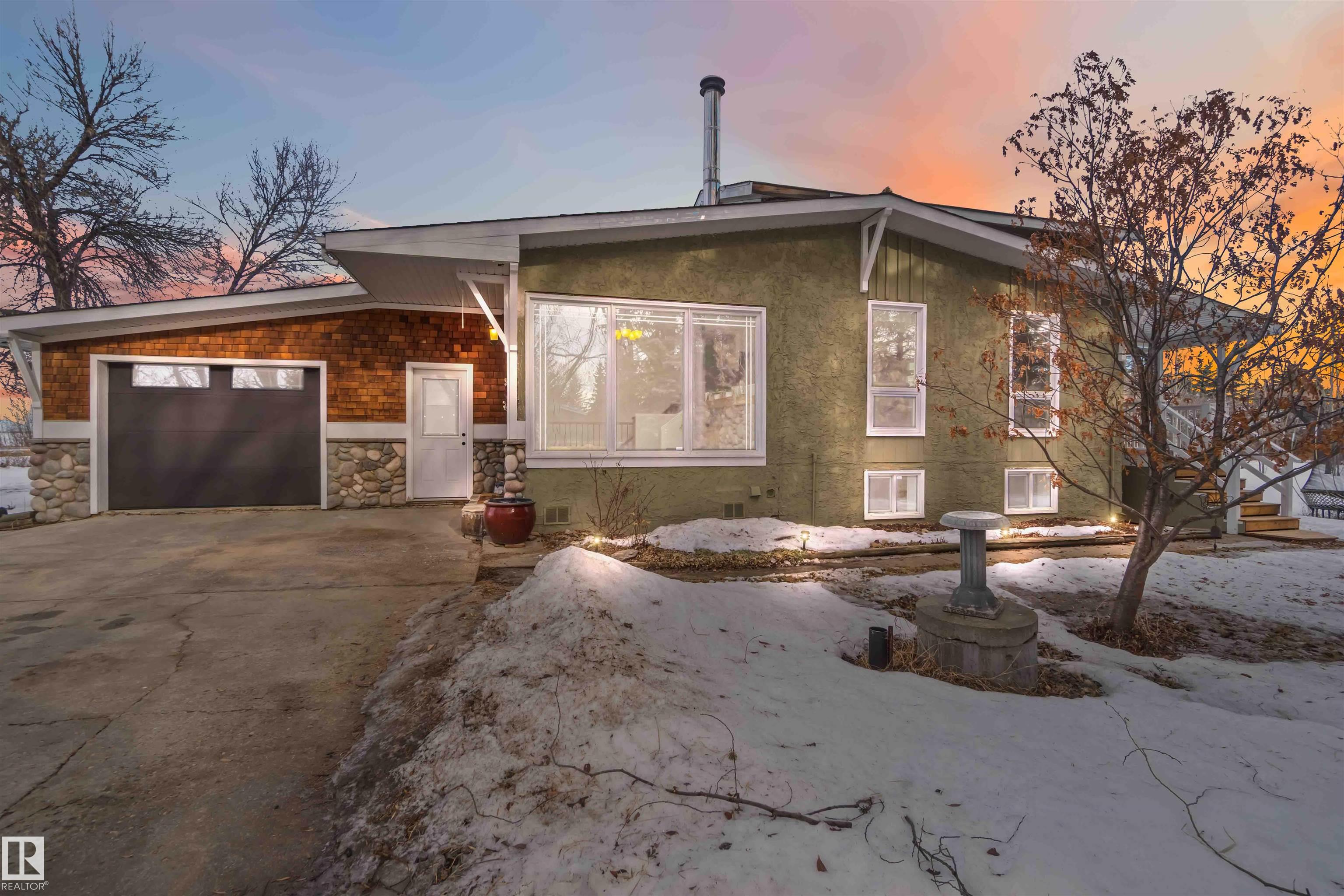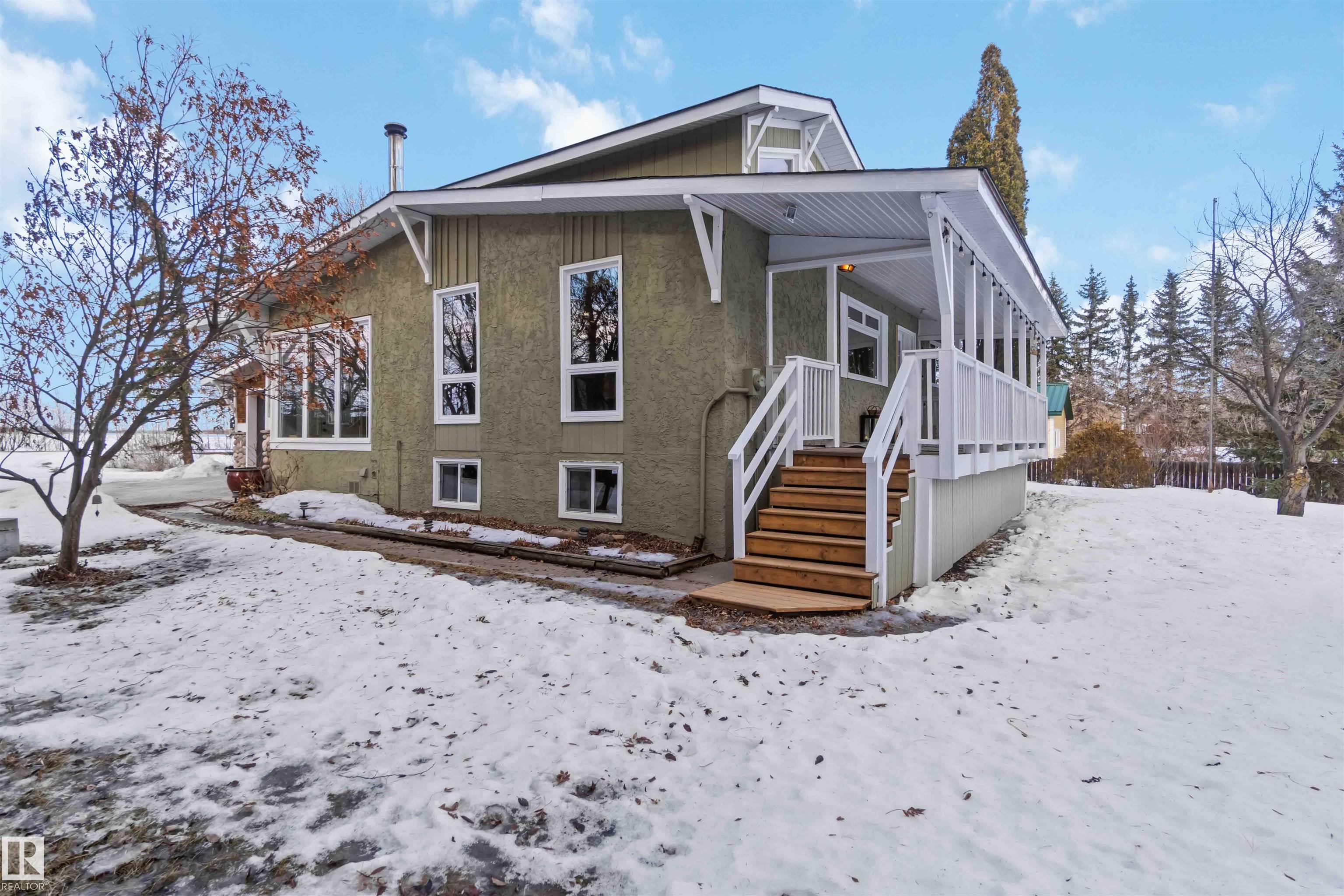 Over 2 acres of beautiful acreage-style living in the hamlet of Villeneuve, just 10 minutes west of St. Albert. This property is serviced with city water and a septic tank connected to the city septic system. A true dream shop measuring 82' x 30' plus loft features in-floor heating and is ideal for woodworking, mechanical projects, or storing all your toys. The main floor of the house offers a functional layout with a cozy wood-burning stove, large kitchen, and two bedrooms, with the option to convert the main-floor laundry back into a third bedroom. A 4-piece main bath and extensive built-in cabinetry add to the home's charm and practicality. The fully developed basement includes two additional bedrooms, a 3-piece bathroom, and a spacious recreation room. Recent upgrades include most windows, the furnace, and the hot water tank.