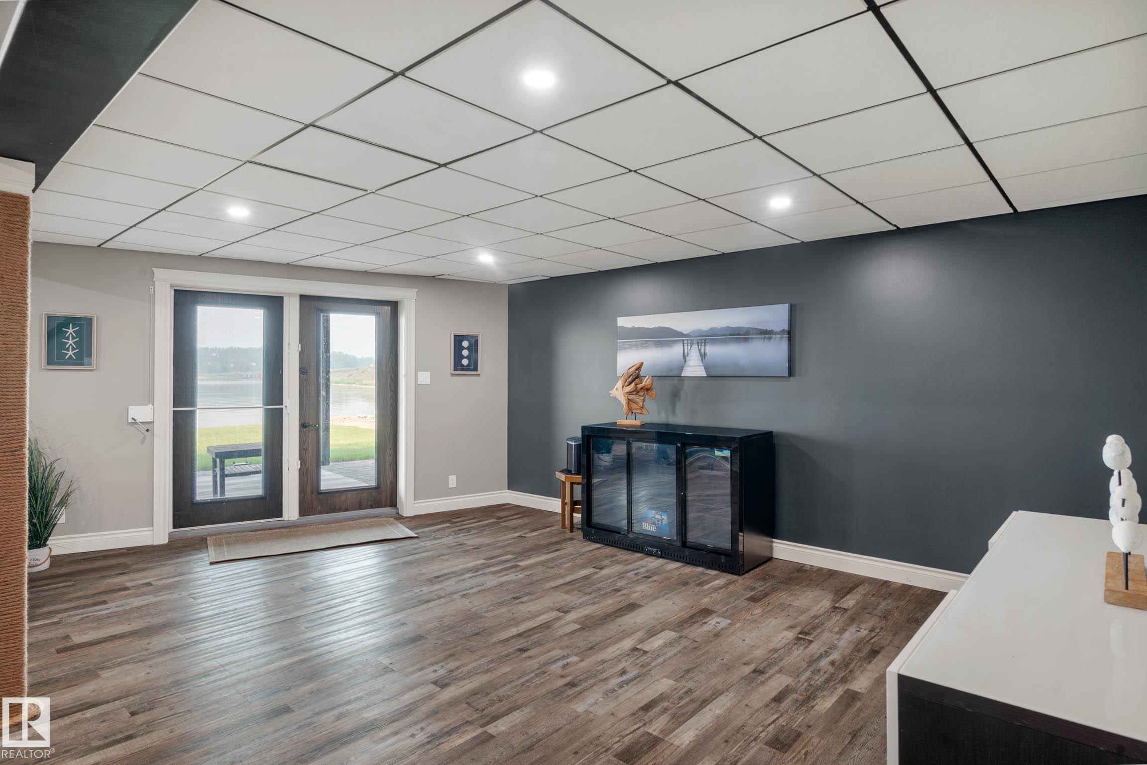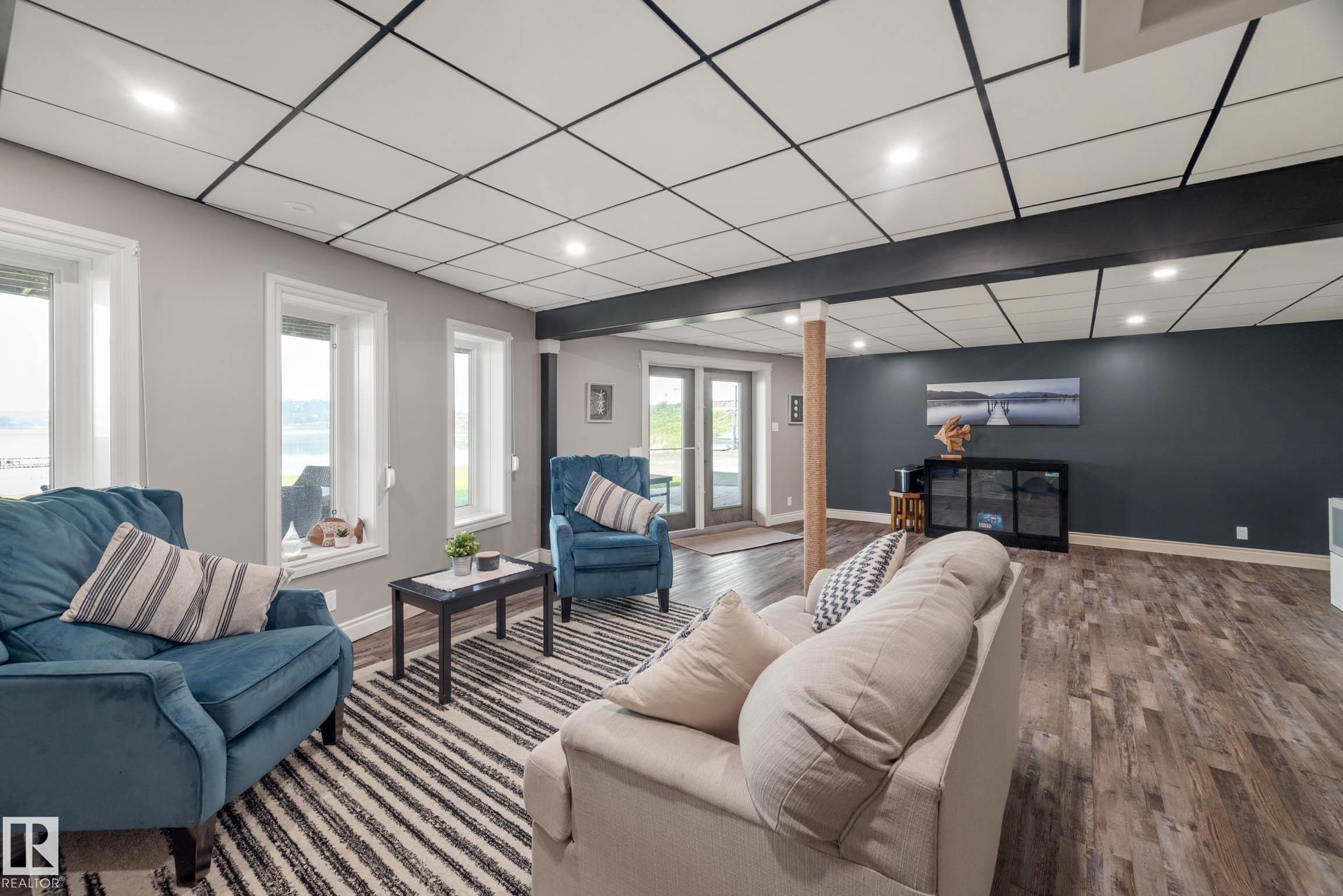 Enjoy this year-round lakefront living with 220 ft of private shoreline and southwest exposure beside a protected bird sanctuary. This rare flat, sun-soaked lot features a stunning A-frame with 1,800 sq ft above grade and over 2,800 sq ft of total space, including a developed walkout basement. The main floor boasts an open-concept kitchen and great room with hardwood floors, gas fireplace, and lake views, plus a bedroom, 3-pc bath, and laundry. The chef's kitchen offers espresso cabinetry, stainless steel appliances, corian counters, pantry, and prep island with eating bar. Upstairs, a loft and serene primary suite with ensuite provide the perfect retreat. The basement adds a large rec room, spacious bedroom, 4-pc bath, and walkout to a stamped concrete patio, private yard, and beach. Freshly painted with central A/C, central vac, shutters, alarm, RV parking, and new secure fence and gate. A perfect year-round retreat!