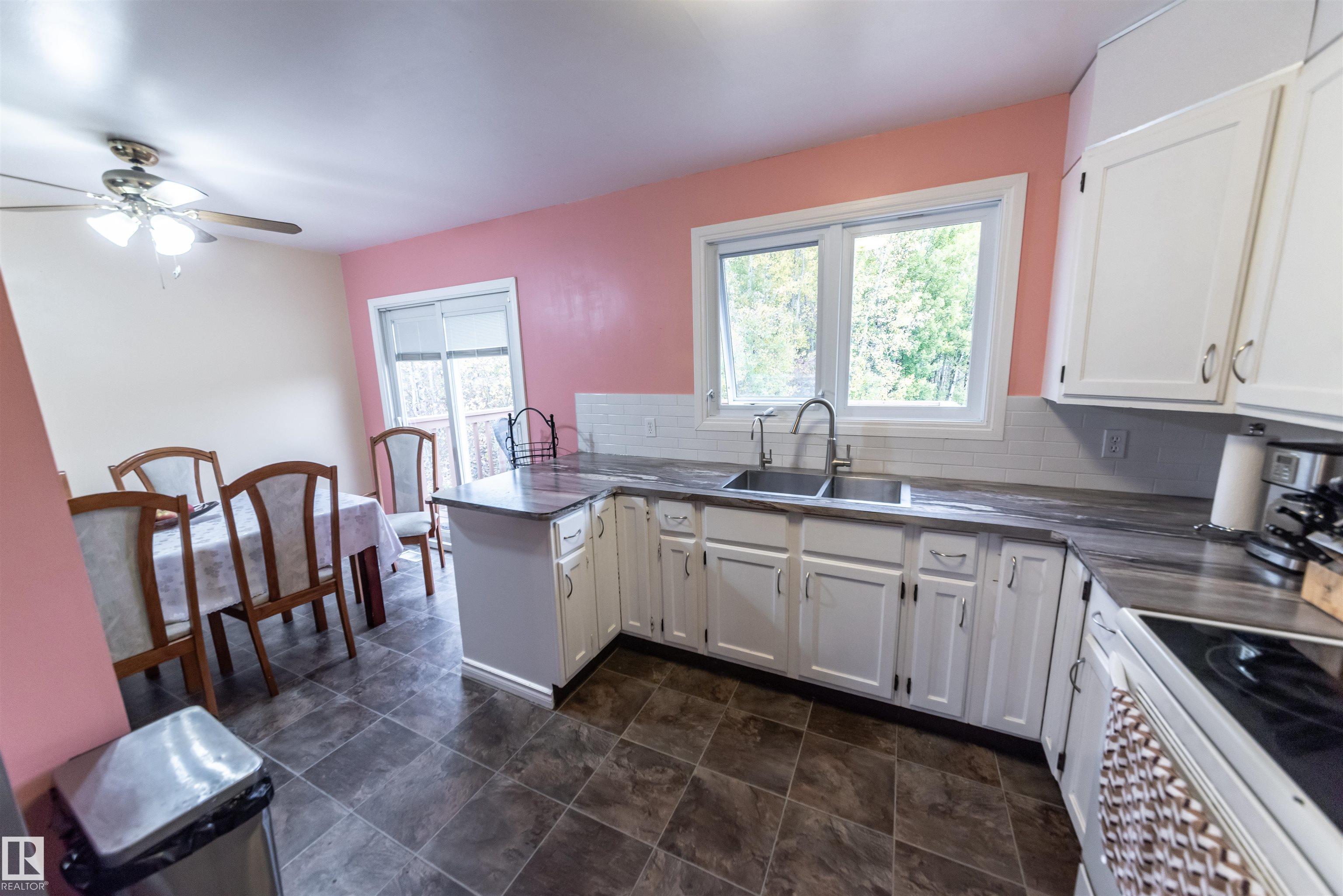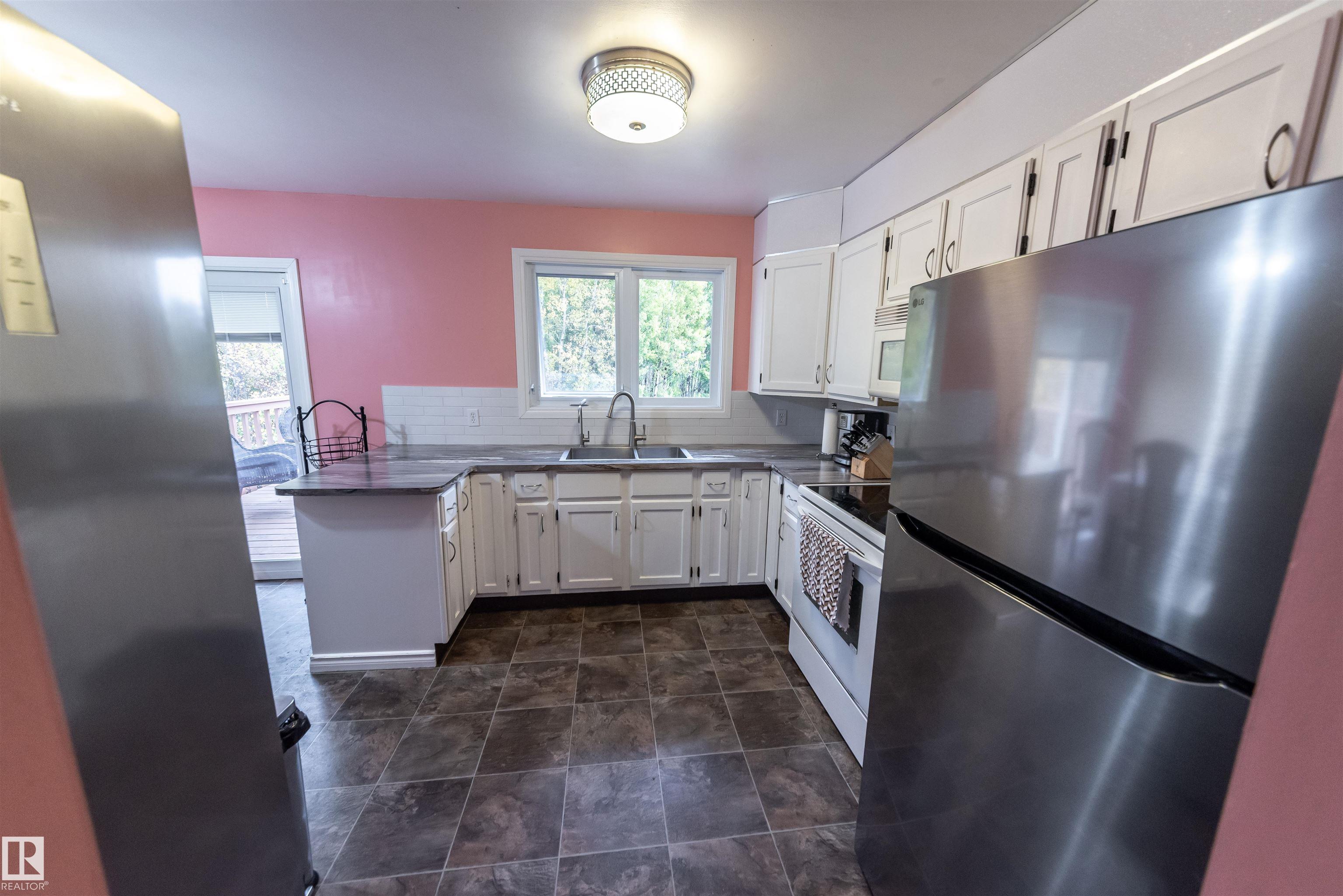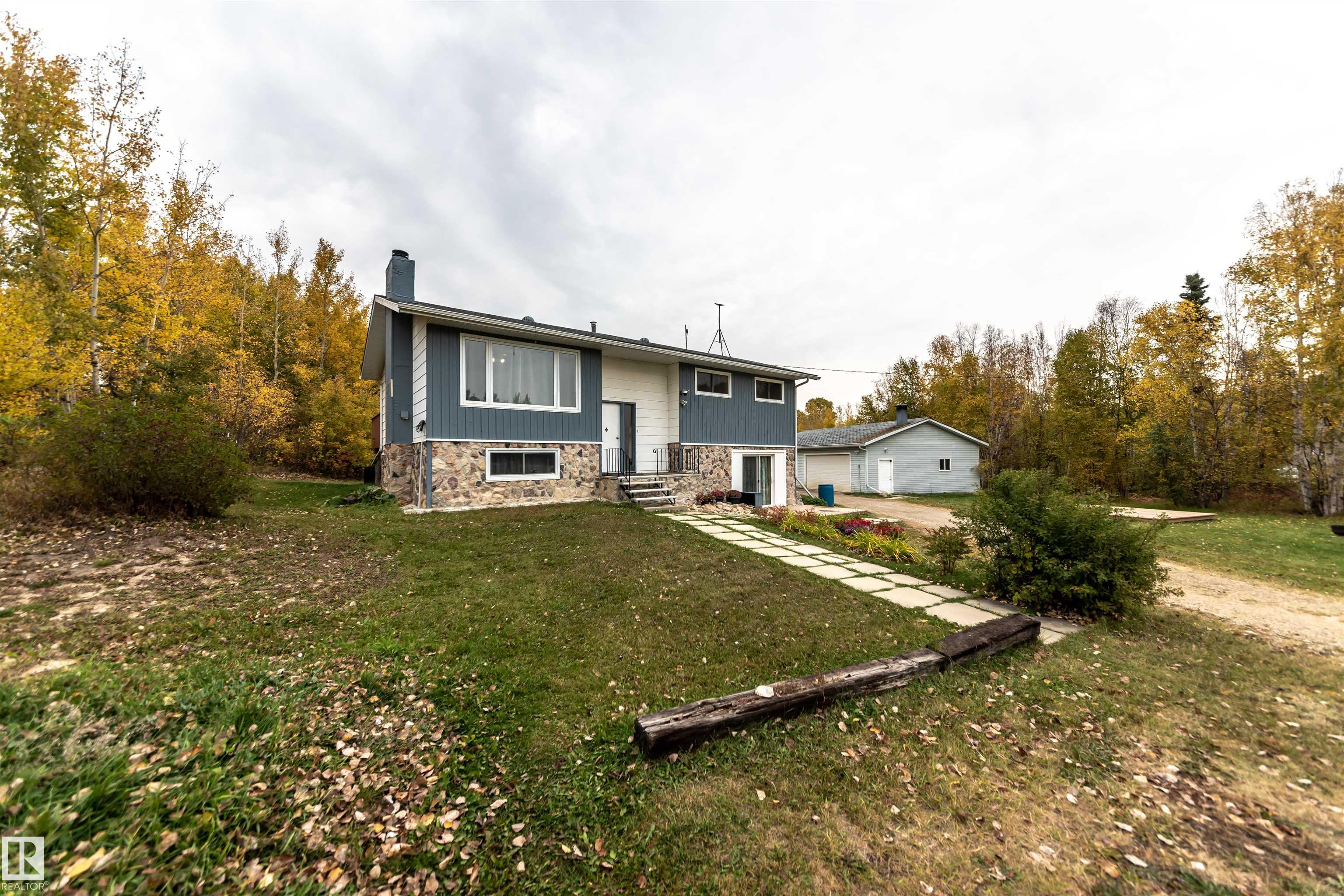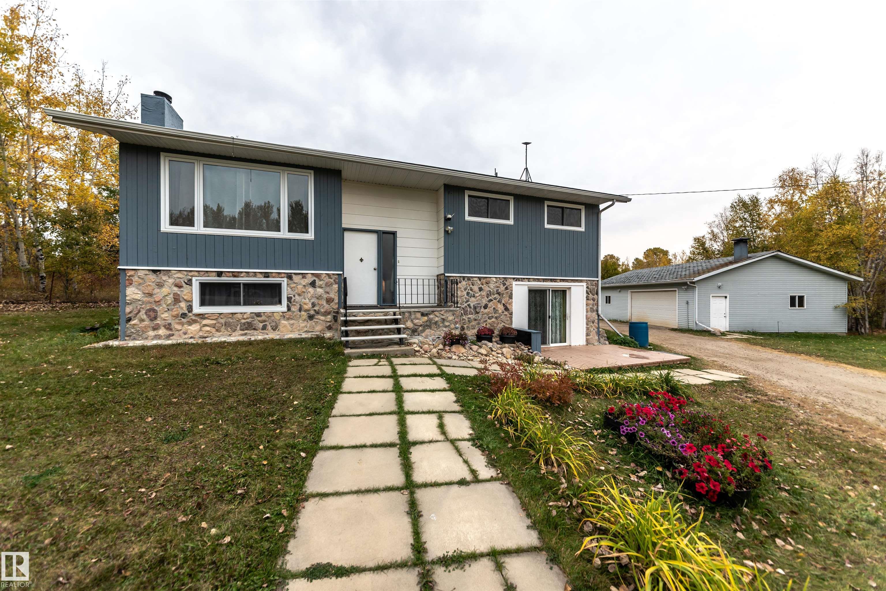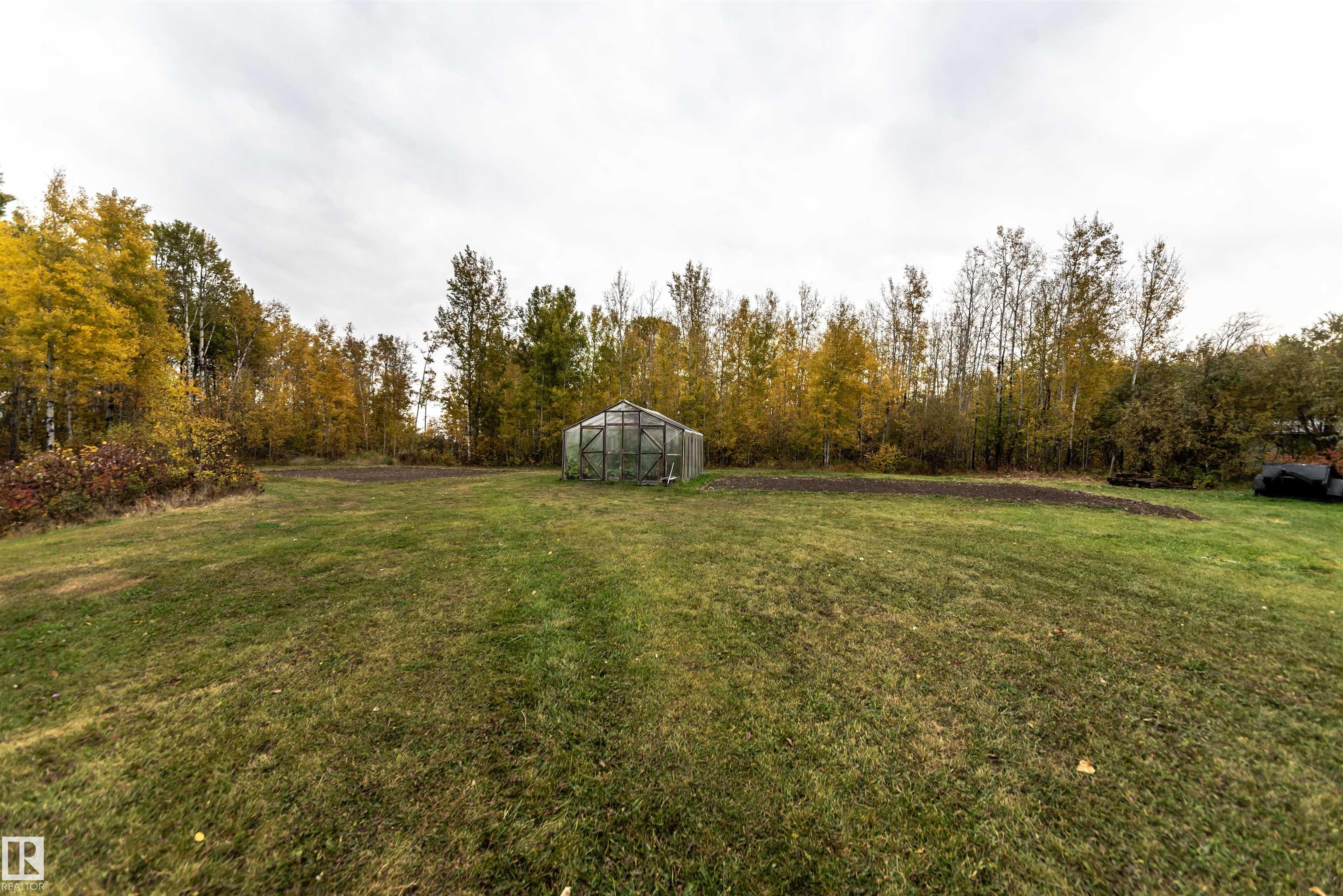 Discover an exceptional acreage offering a 2,148 sq ft bi-level home set on nearly 4 acres of gently rolling, private land. Mature trees surround the property, creating a peaceful setting enhanced by two garden areas, a greenhouse, and a tranquil creek along the rear boundary. Inside, the main level features a welcoming living room with a wood-burning fireplace, a spacious country kitchen, three bedrooms, and 1.5 baths. The fully developed lower level includes a large family room, two oversized bedrooms, a second kitchen, and an additional 1.5 baths--ideal for extended family or guests. A 40' x 28' detached garage, fully insulated, wired, and finished with sheathing, completes the package. Perfectly located between Lac Ste. Anne and Wabamun Lake, this property offers serene country living just 35-40 minutes from Spruce Grove.